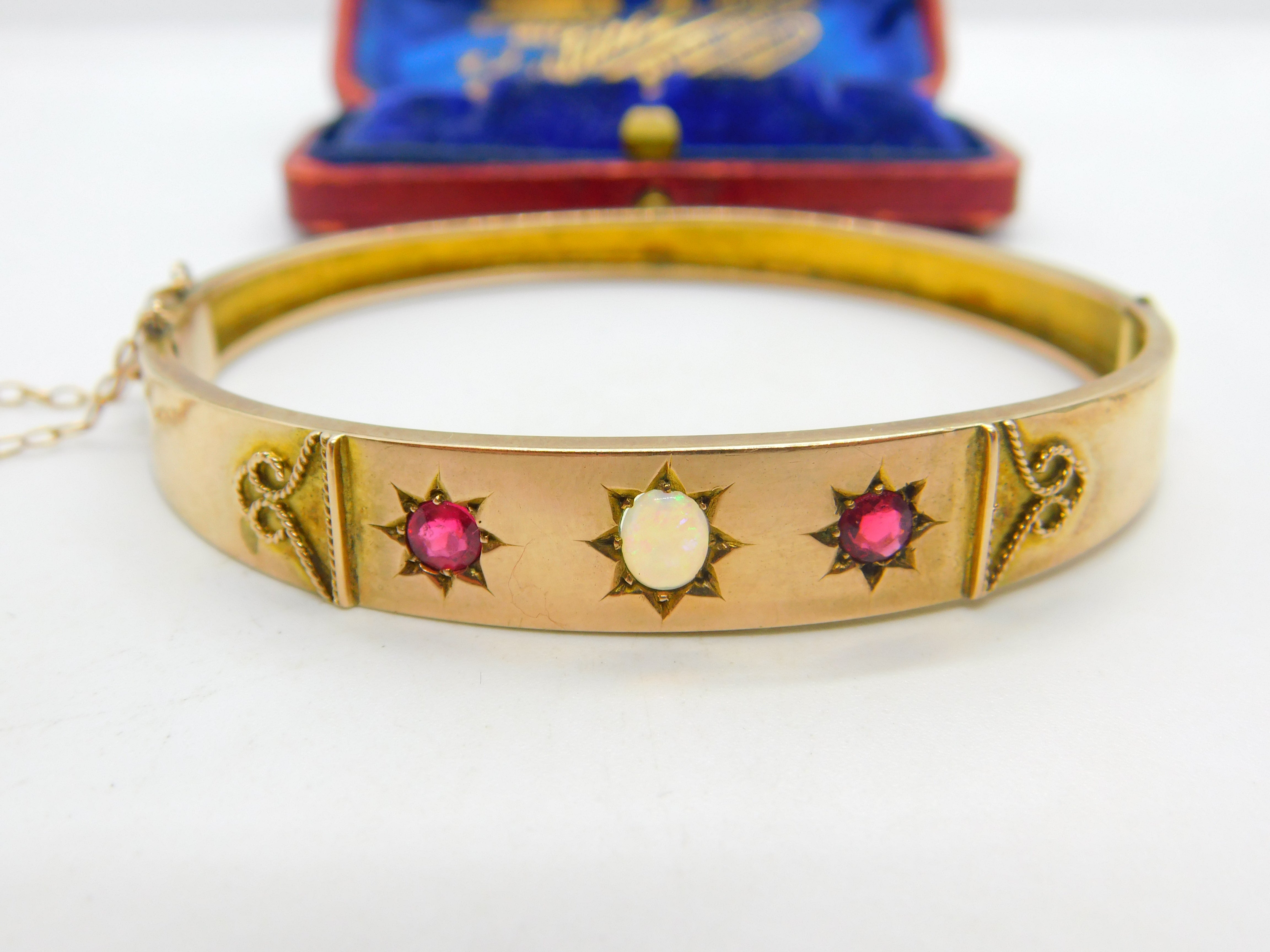 Details: A fantastic and wonderfully designed antique Victorian 9ct rose gold bangle bracelet set with cabochon opal surrounded by garnet stones c1880 - the gold has been XRF tested as there are no marks. This is a wonderful item that would make a perfect gift or addition to any collection. The BOX pictured is for PRESENTATION ONLY and is NOT included in the listings but used to frame the pictures unless specifically stated otherwise.