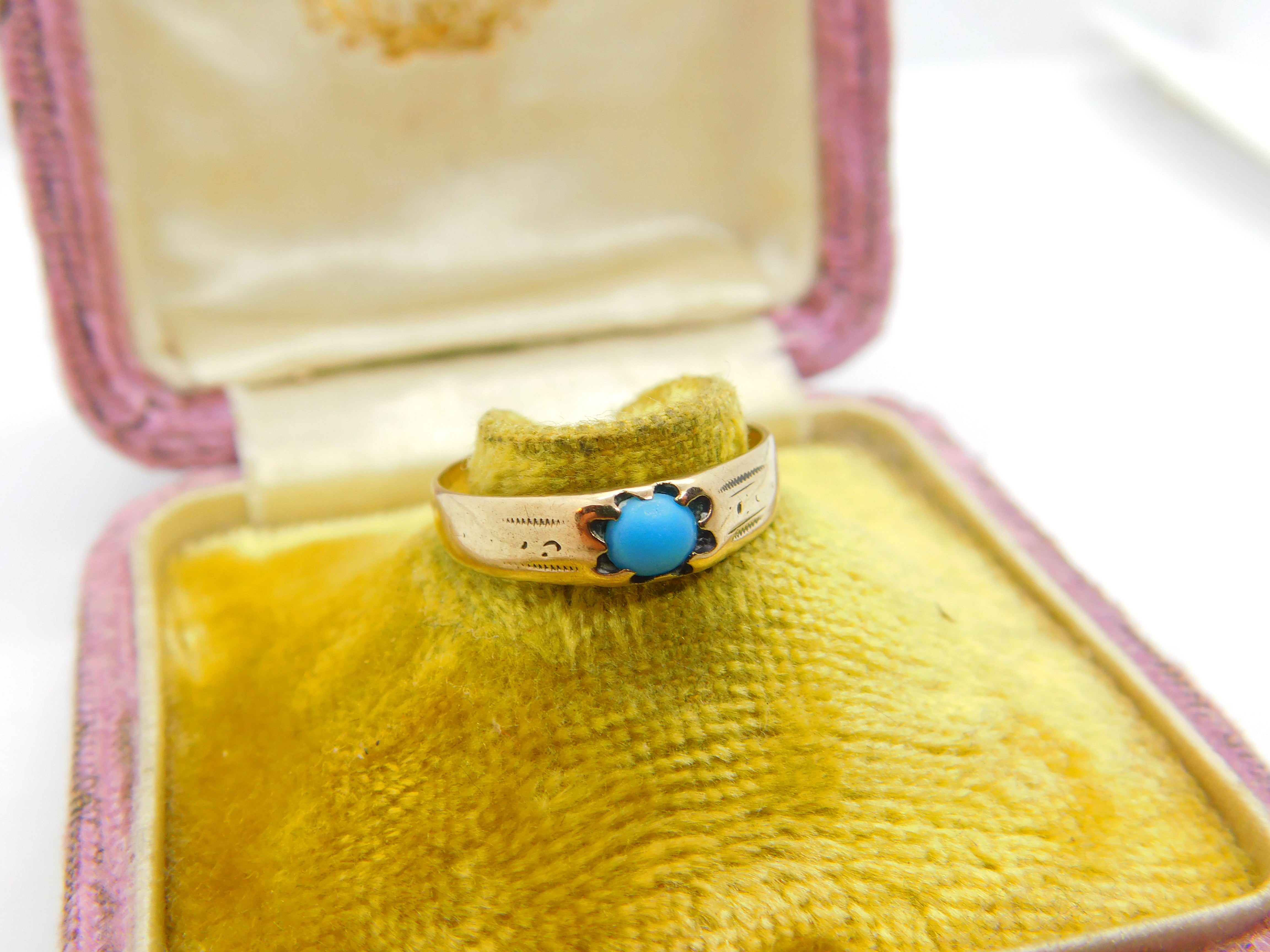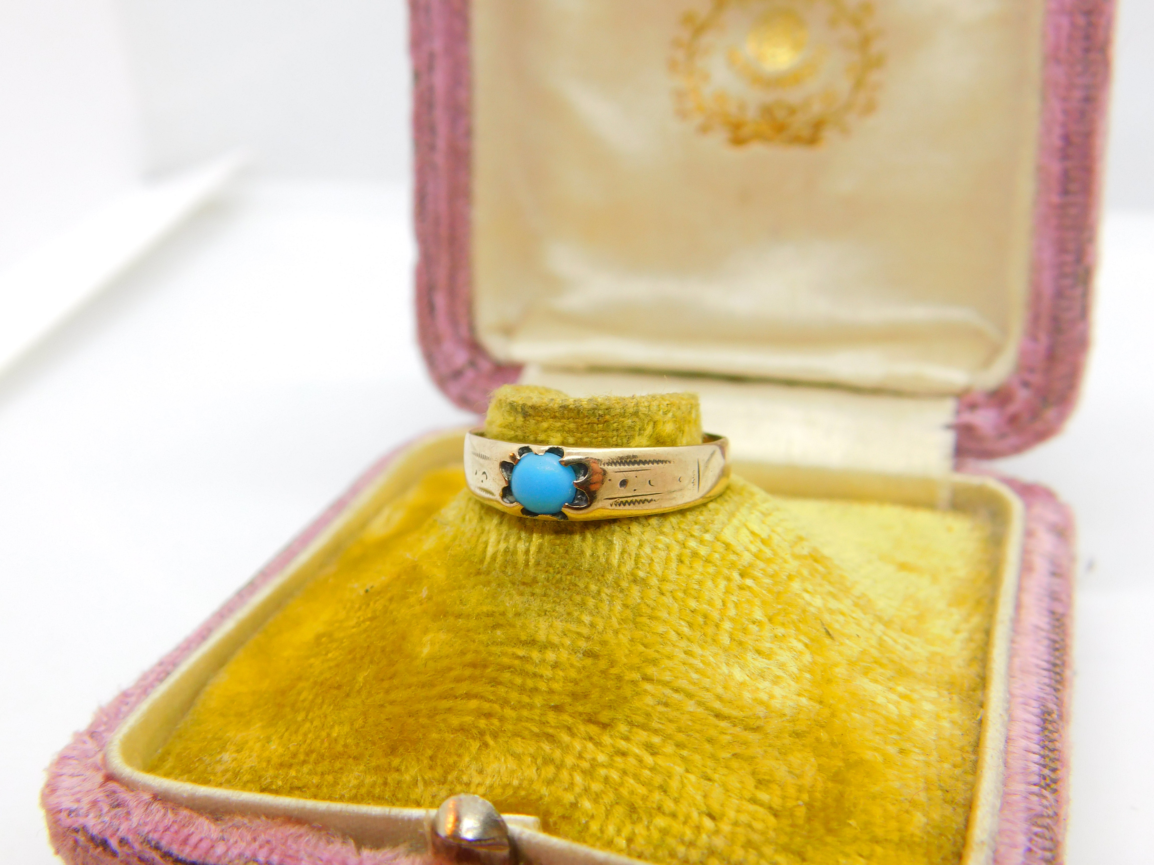 Details: A fantastic and wonderfully designed antique Victorian 9ct rose gold and blue turquoise set band ring with lovely detailing c1880, the gold has been XRF tested. This is a wonderful item that would make a perfect gift or addition to any collection. The BOX pictured is for PRESENTATION ONLY and is NOT included in the listings but used to frame the pictures unless specifically stated otherwise.