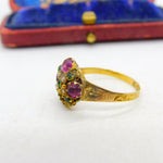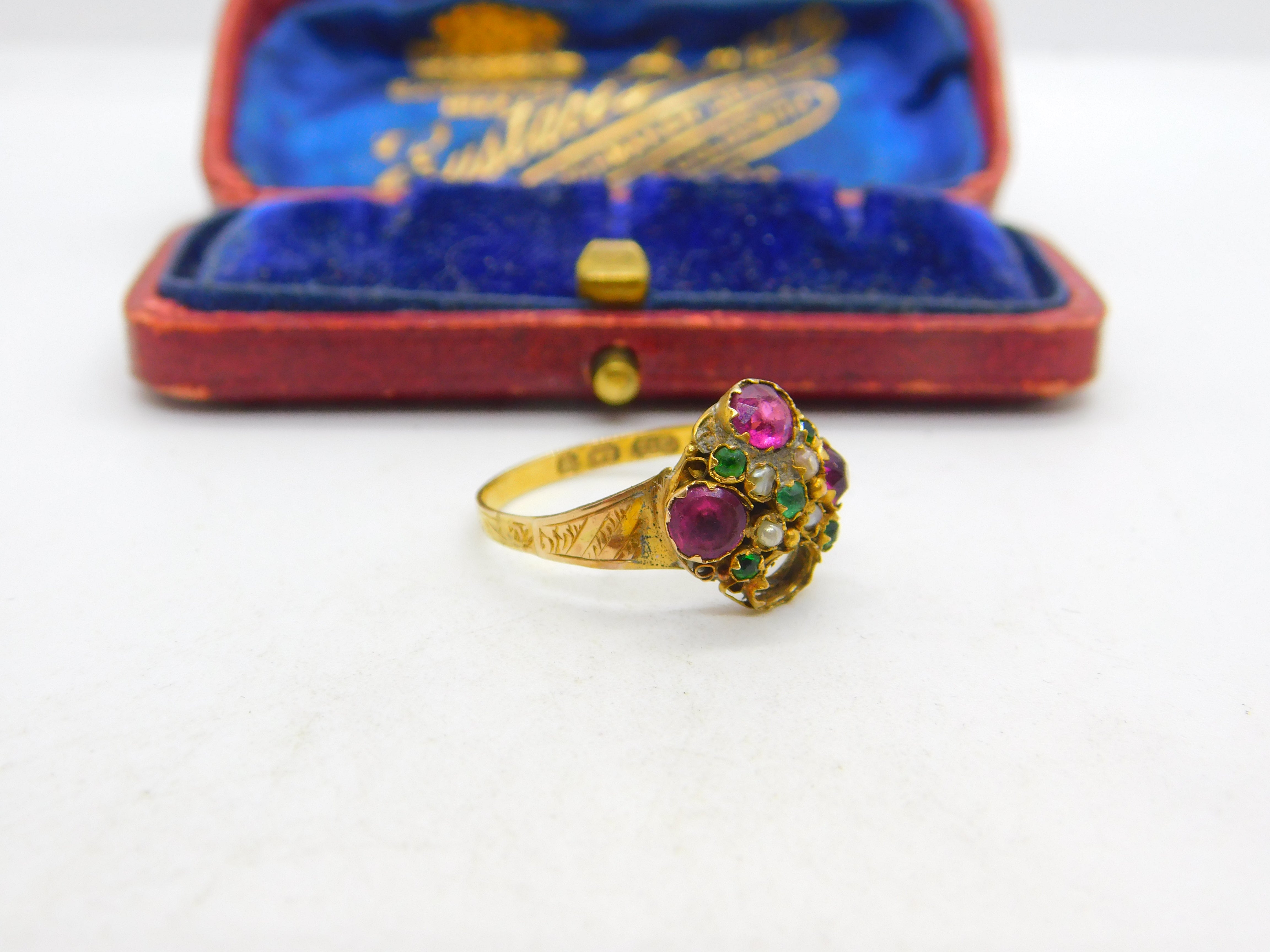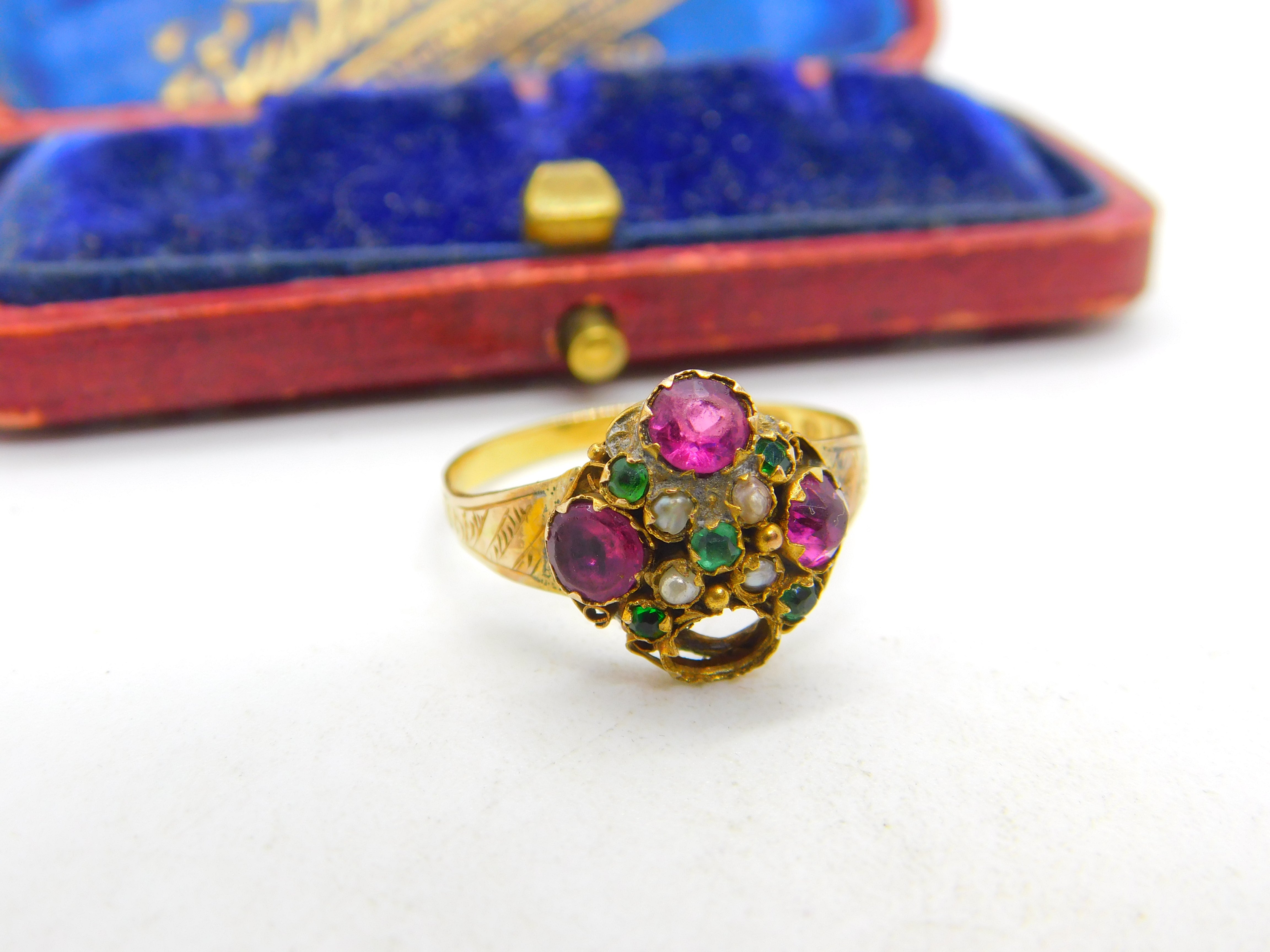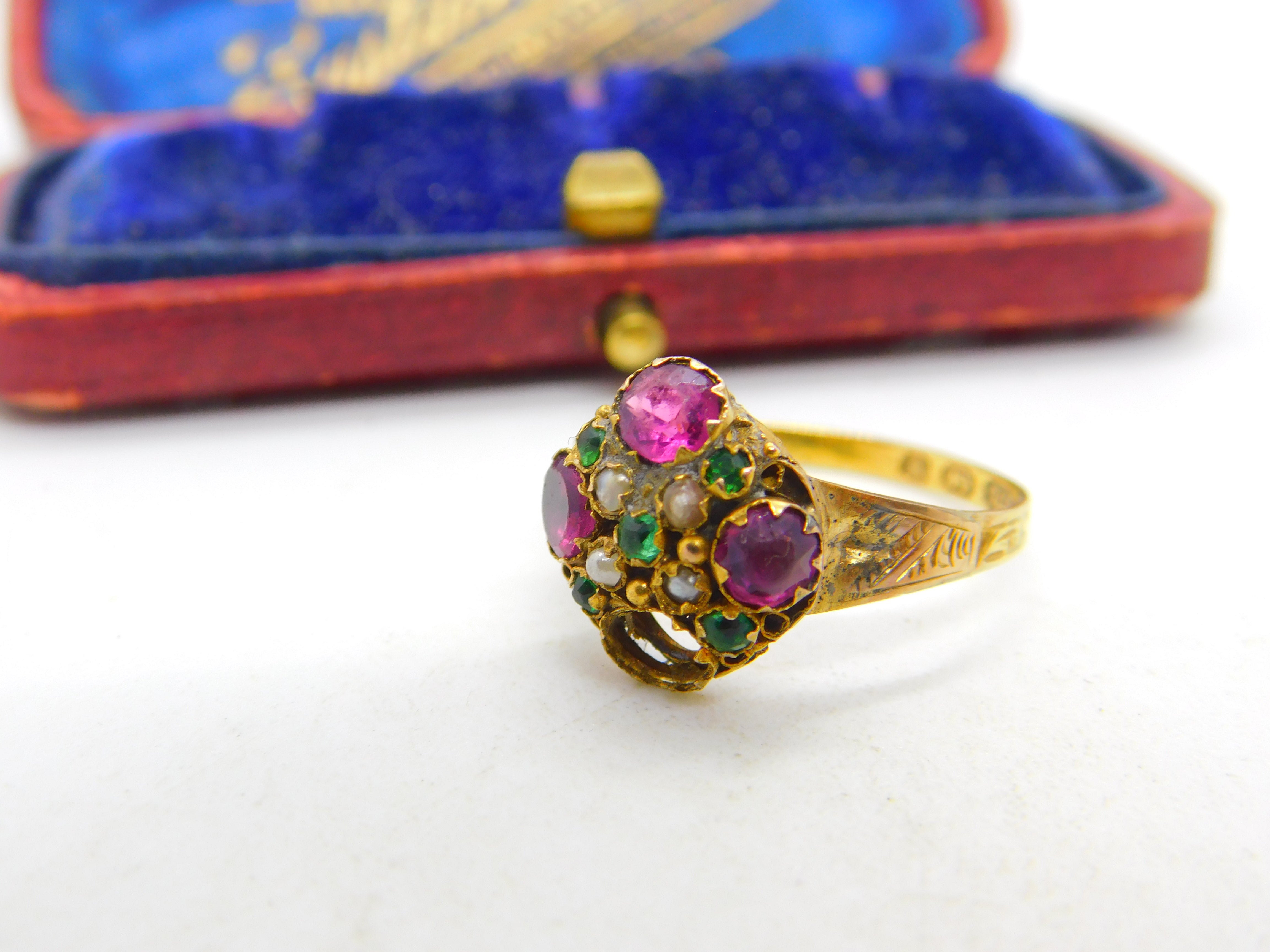 Details: A fantastic and wonderfully designed antique Victorian 9ct yellow gold sweetheart 'acrostic' ring set with amethyst, emerald paste and seed pearl hallmarked Birmingham, 1871 to the interior. Missing one amethyst to the bottom but a stunning example nonetheless. This is a wonderful item that would make a perfect gift or addition to any collection. The BOX pictured is for PRESENTATION ONLY and is NOT included in the listings but used to frame the pictures unless specifically stated otherwise.