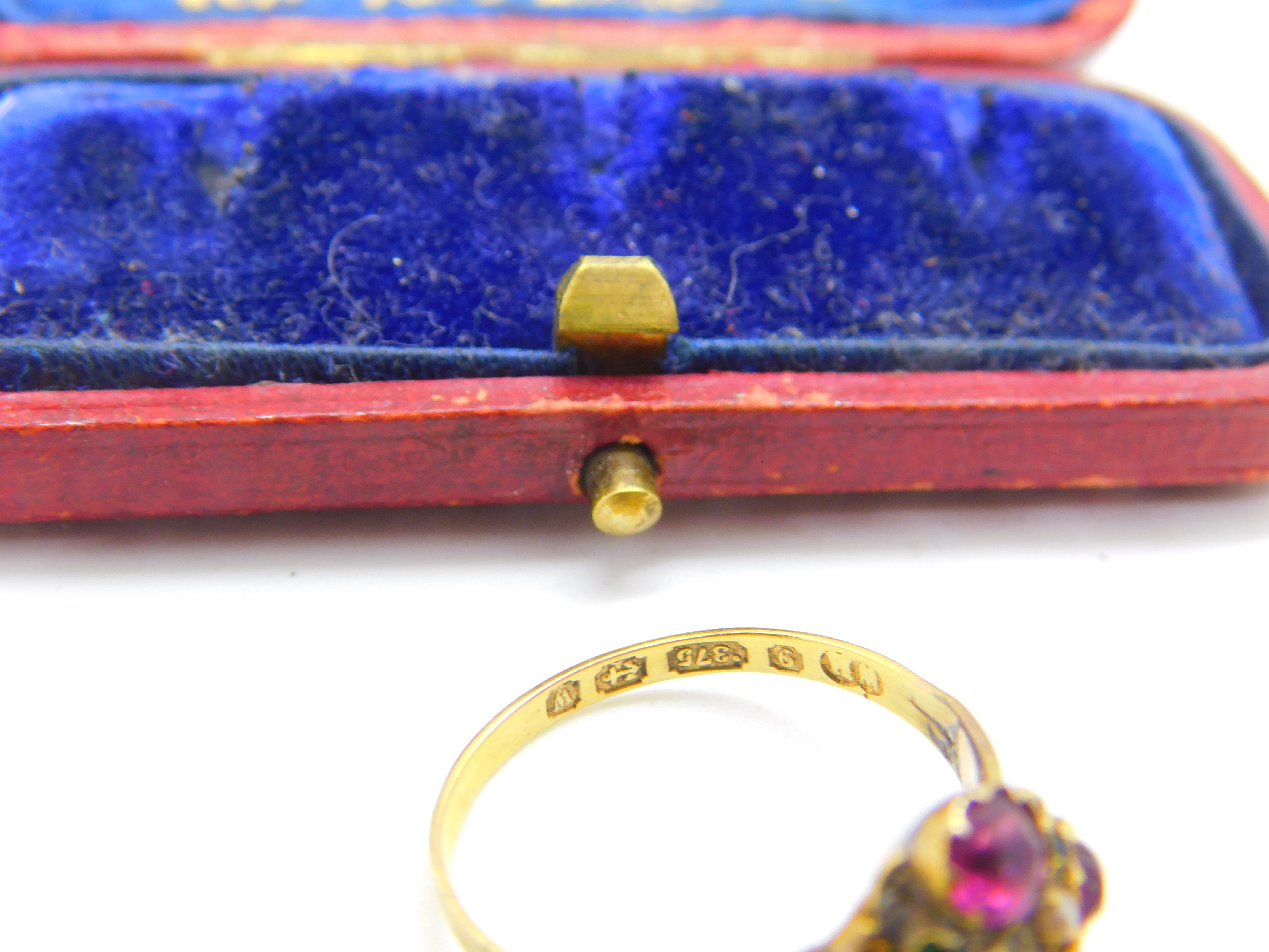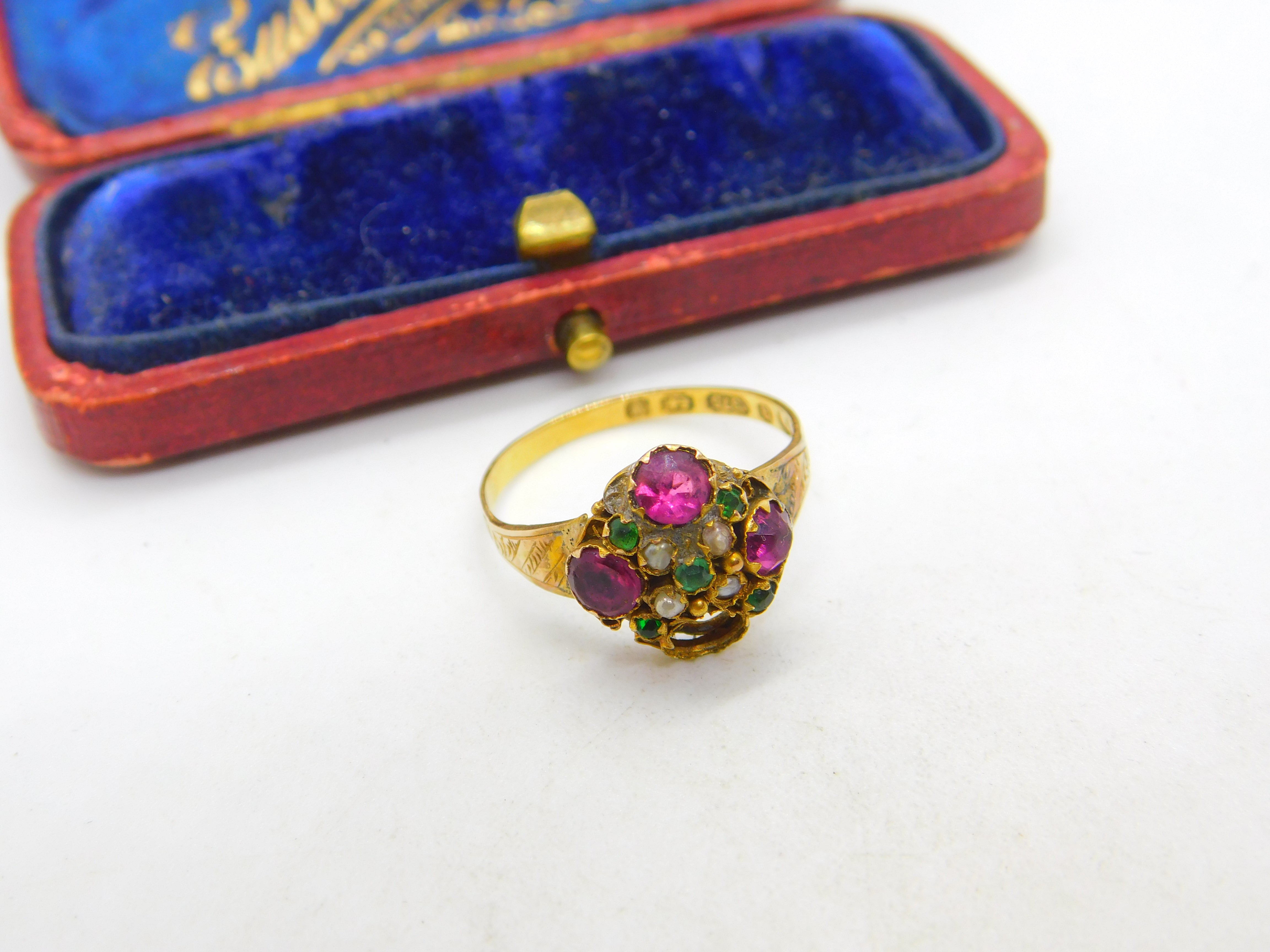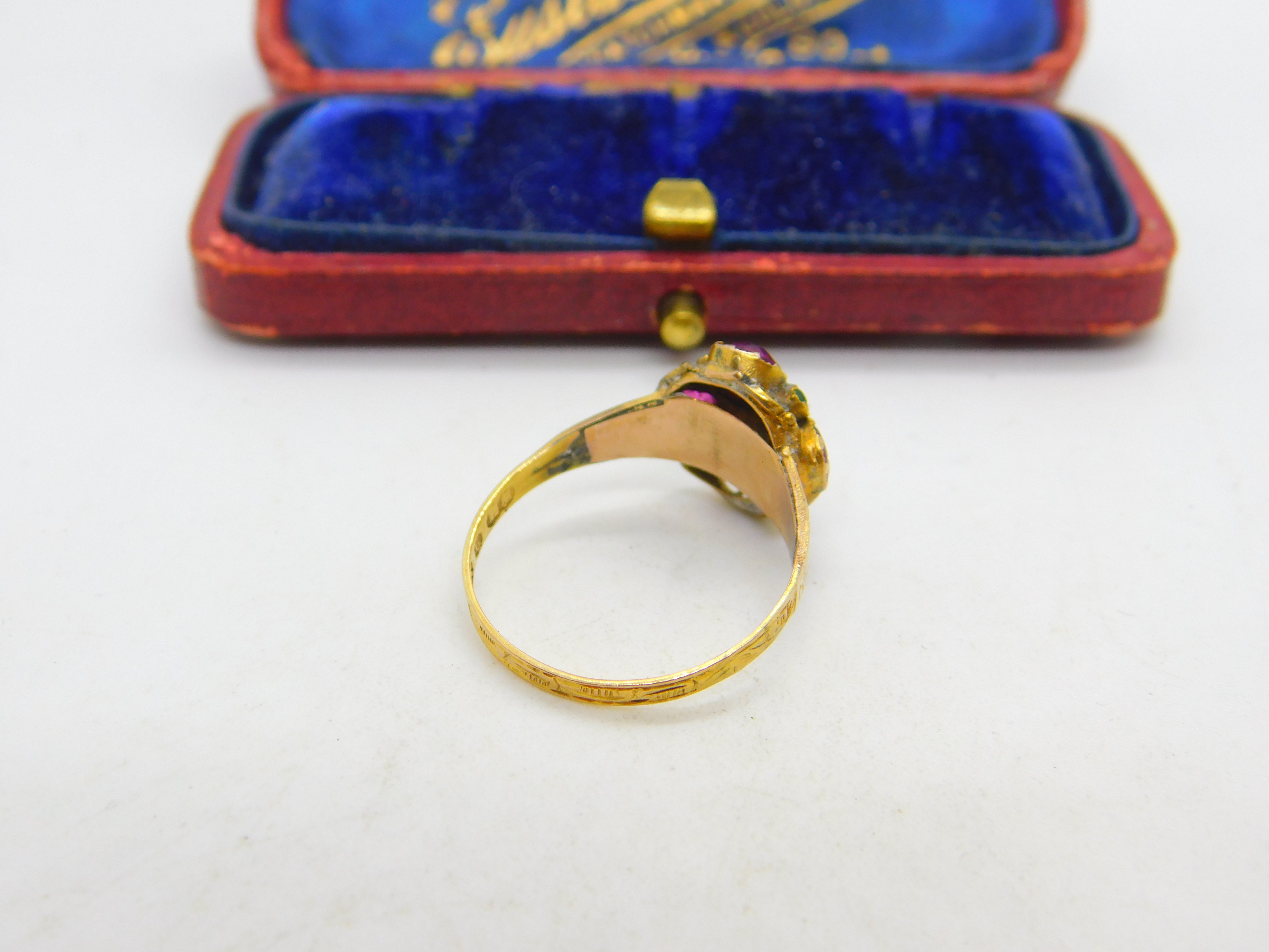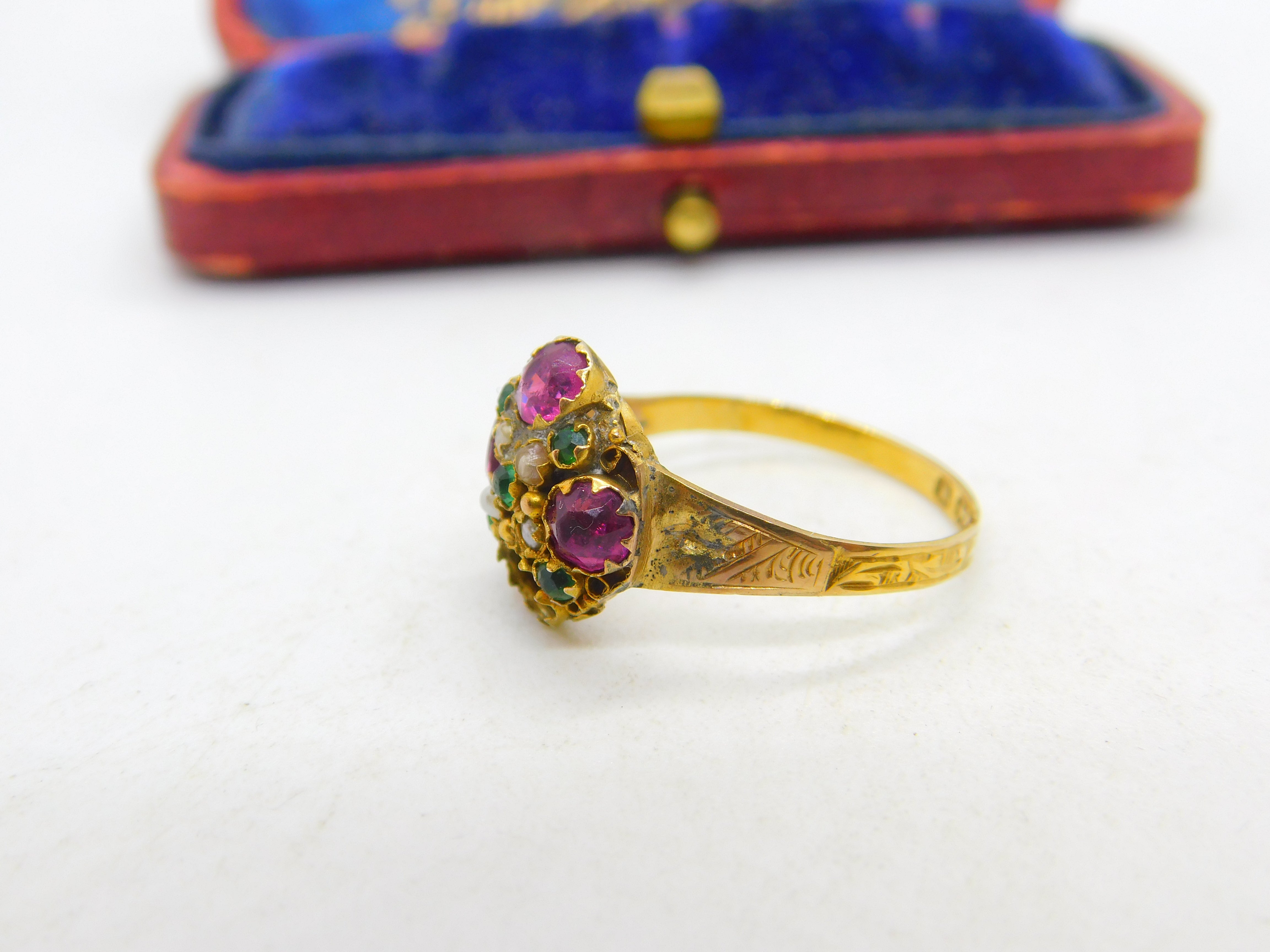 Details: A fantastic and wonderfully designed antique Victorian 9ct yellow gold sweetheart 'acrostic' ring set with amethyst, emerald paste and seed pearl hallmarked Birmingham, 1871 to the interior. Missing one amethyst to the bottom but a stunning example nonetheless. This is a wonderful item that would make a perfect gift or addition to any collection. The BOX pictured is for PRESENTATION ONLY and is NOT included in the listings but used to frame the pictures unless specifically stated otherwise.
