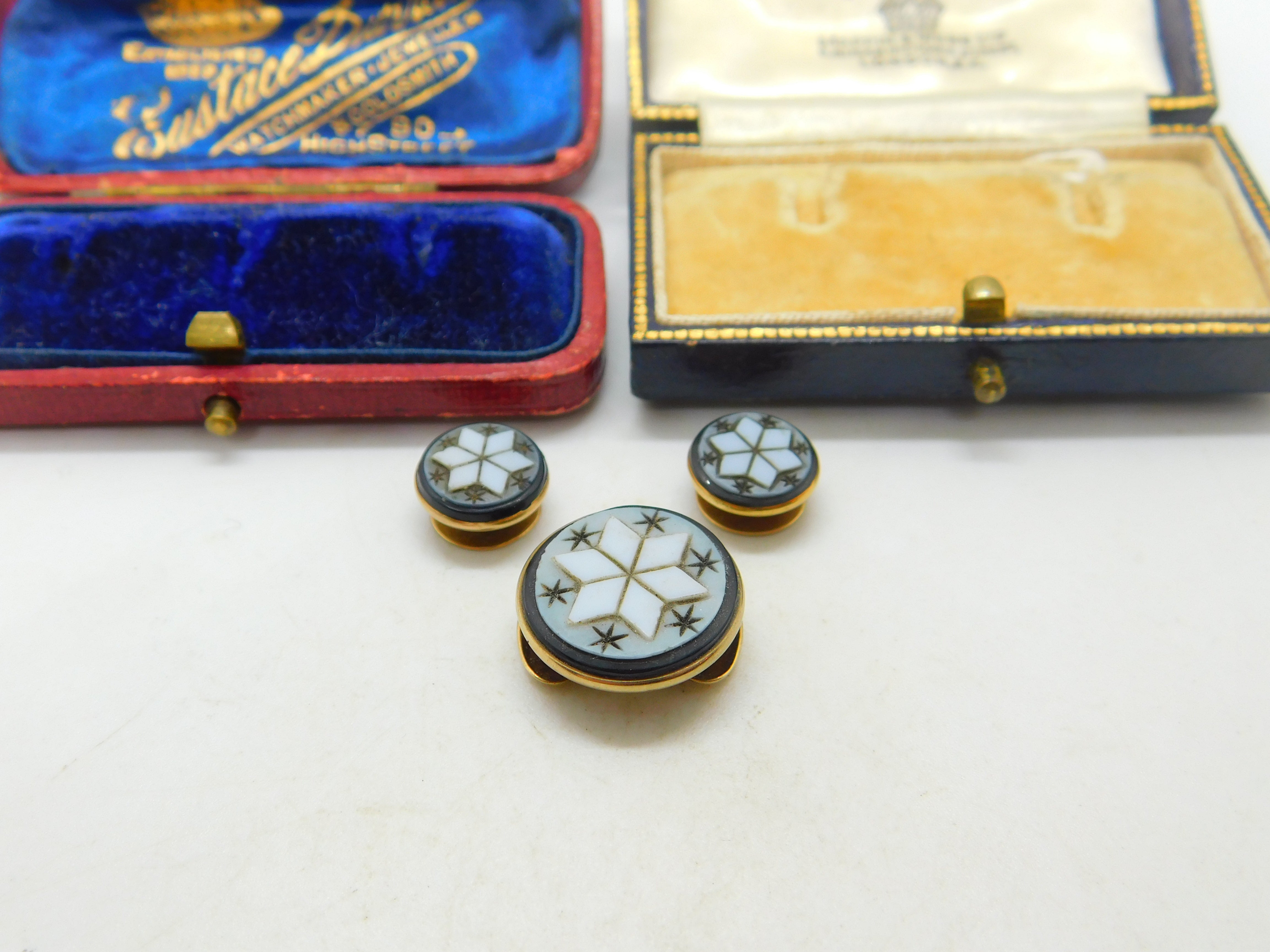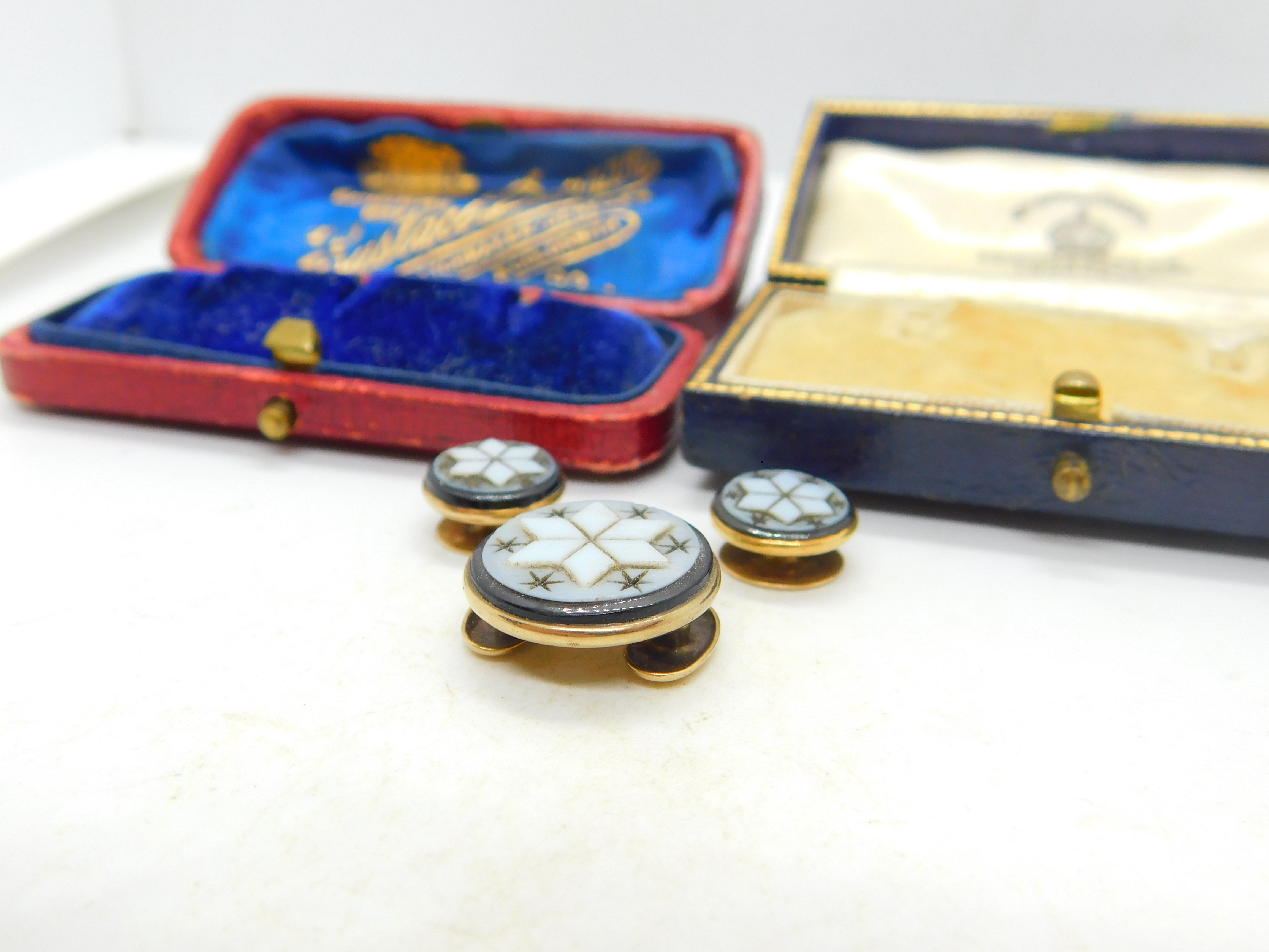 Details: A fantastic and wonderfully designed antique Victorian 9ct gold collar stud and button collection with superb carved sardonyx frontages in star form c1860. The gold has been XRF tested. This is a wonderful item that would make a perfect gift or addition to any collection. The BOX pictured is for PRESENTATION ONLY and is NOT included in the listings but used to frame the pictures unless specifically stated otherwise.