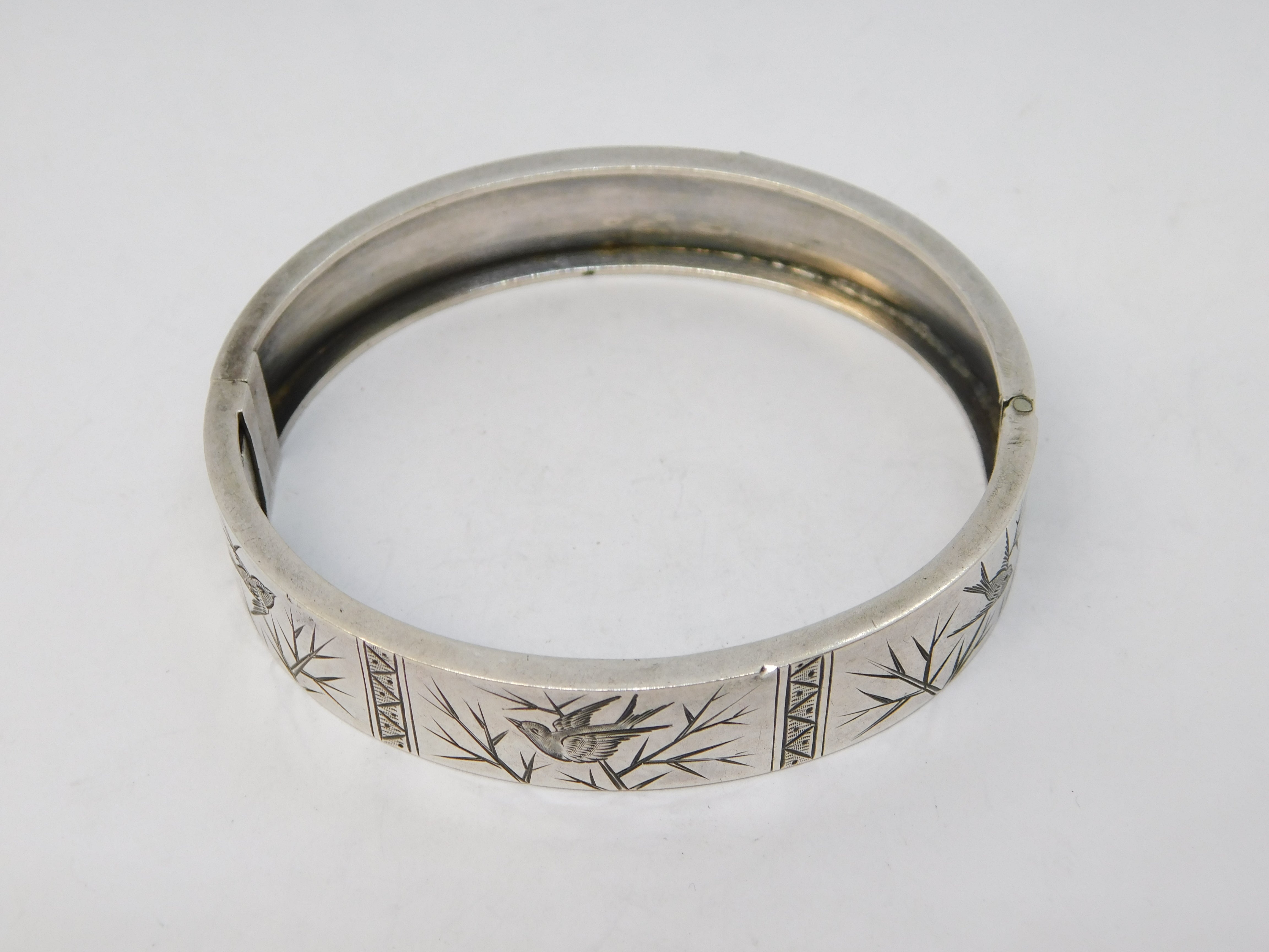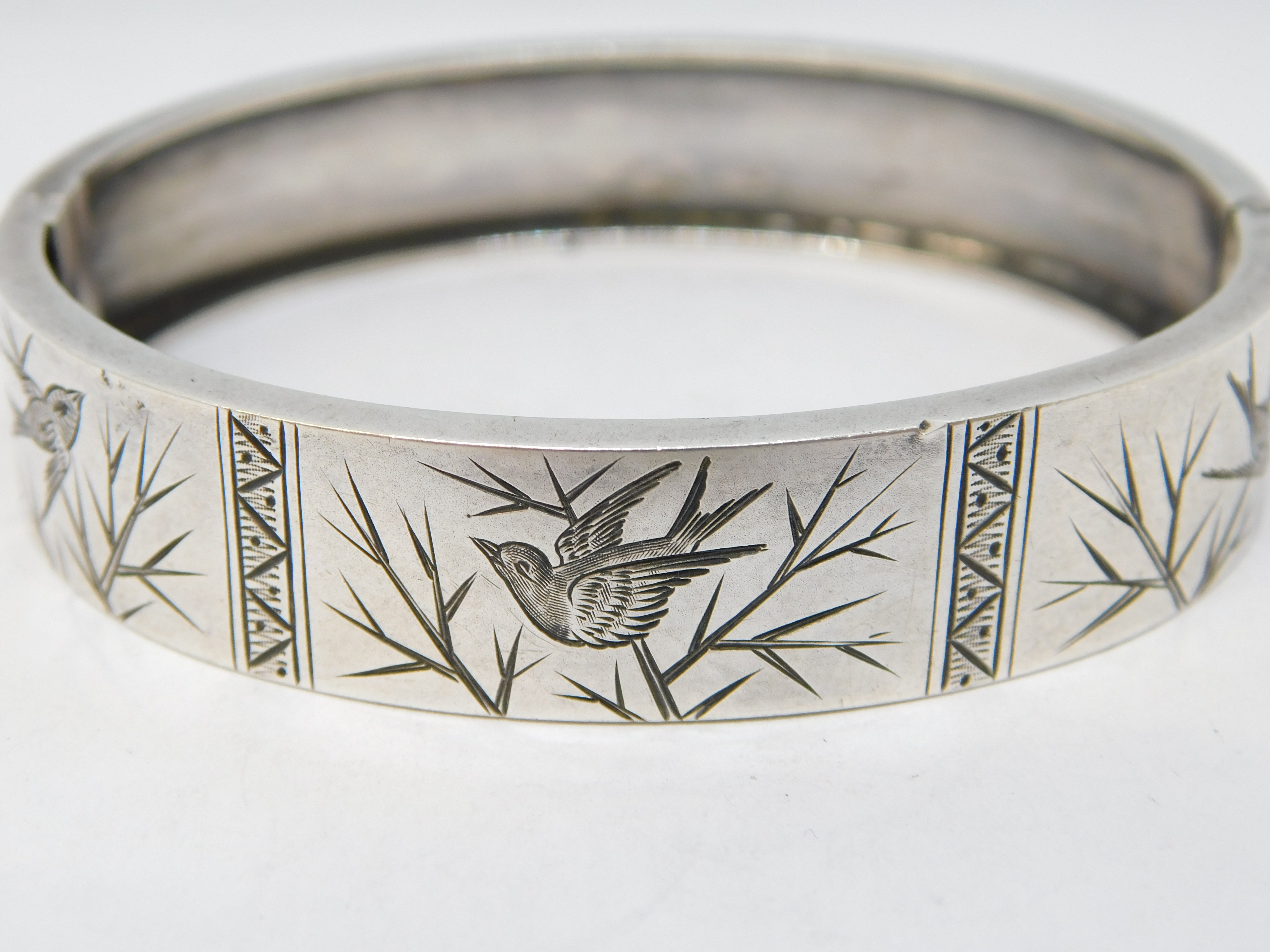 Details: A fantastic and wonderfully designed antique Victorian aesthetic movement sterling silver swallow sweetheart bangle bracelet with lovely detailing c1880, the silver has been XRF tested. This is a wonderful item that would make a perfect gift or addition to any collection. We are more than happy to provide XRF reports for items upon request.