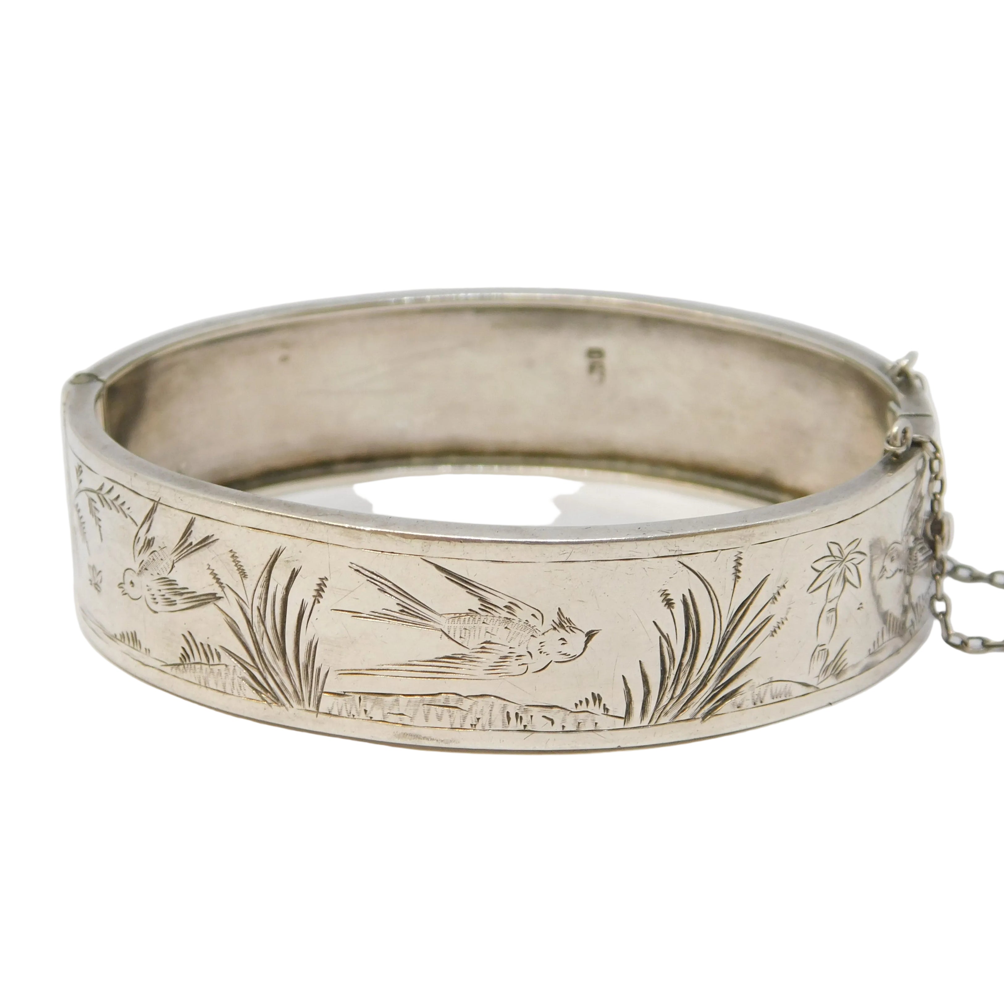 Details: A fantastic and wonderfully designed antique victorian sterling silver aesthetic movement sweetheart bangle bracelet with charming swallow design hallmarked Birmingham 1882 to the interior, lovely condition throughout. This is a wonderful item that would make a perfect gift or addition to any collection. We are more than happy to provide XRF reports for items upon request.