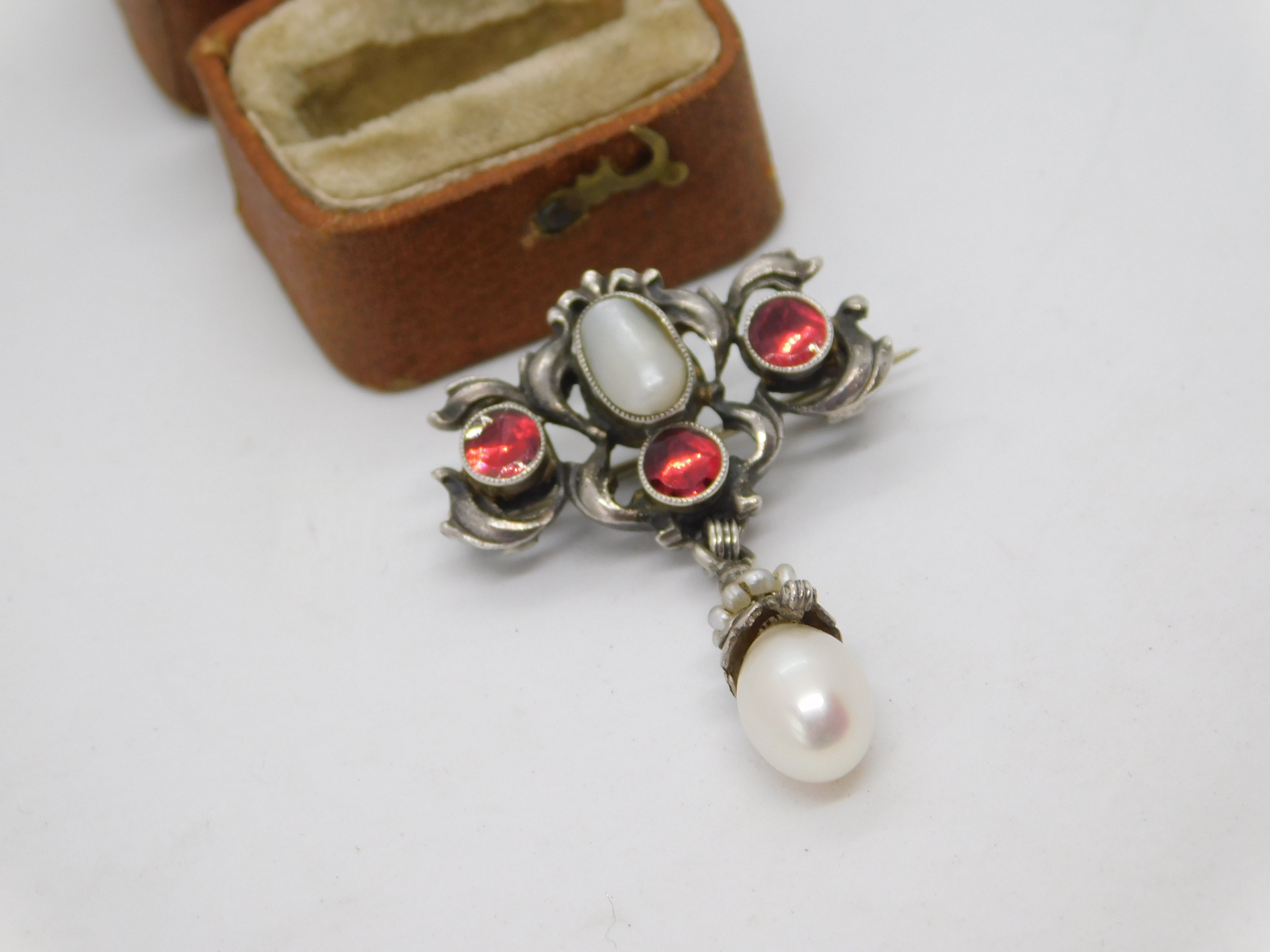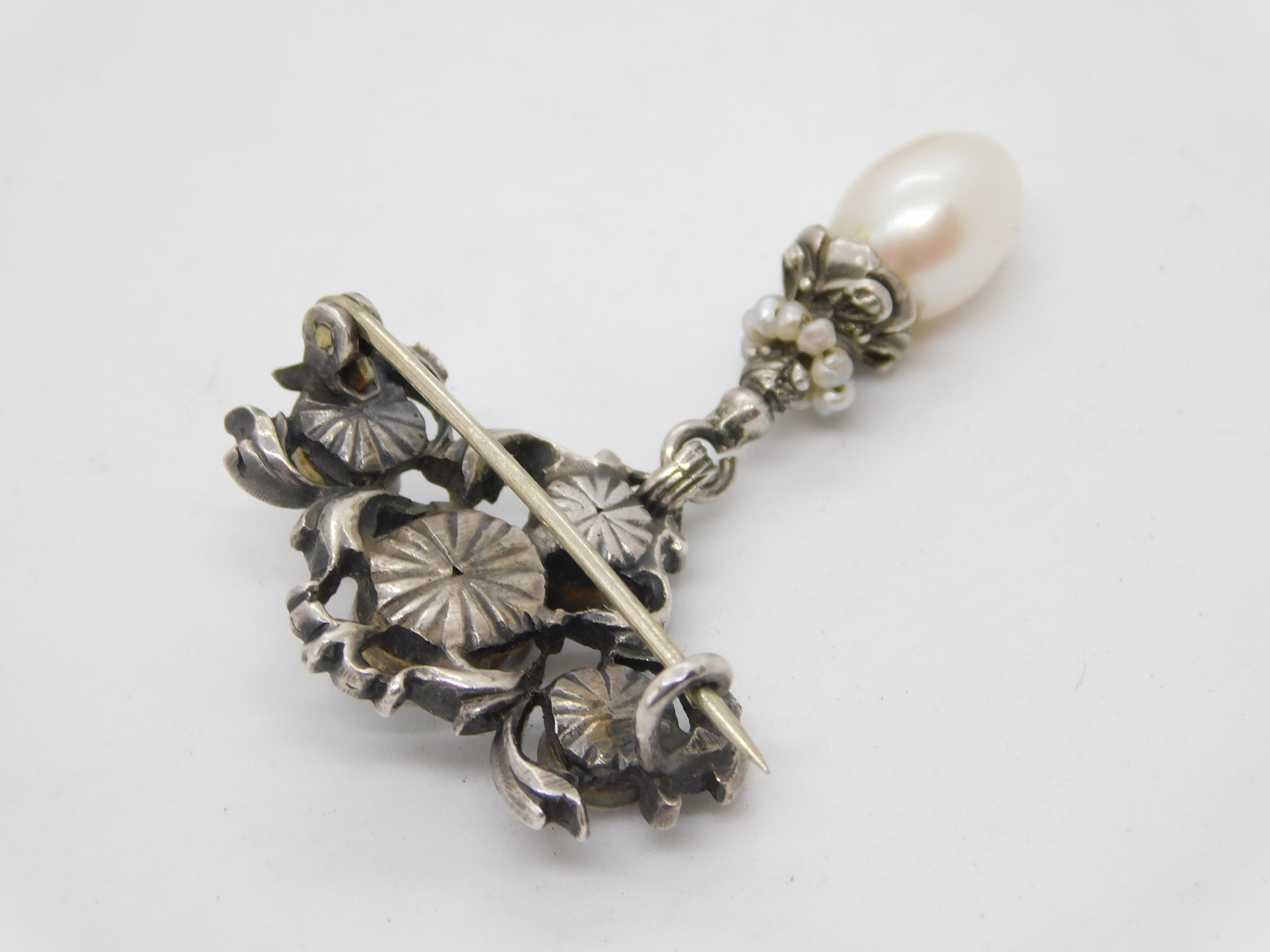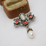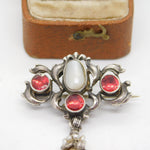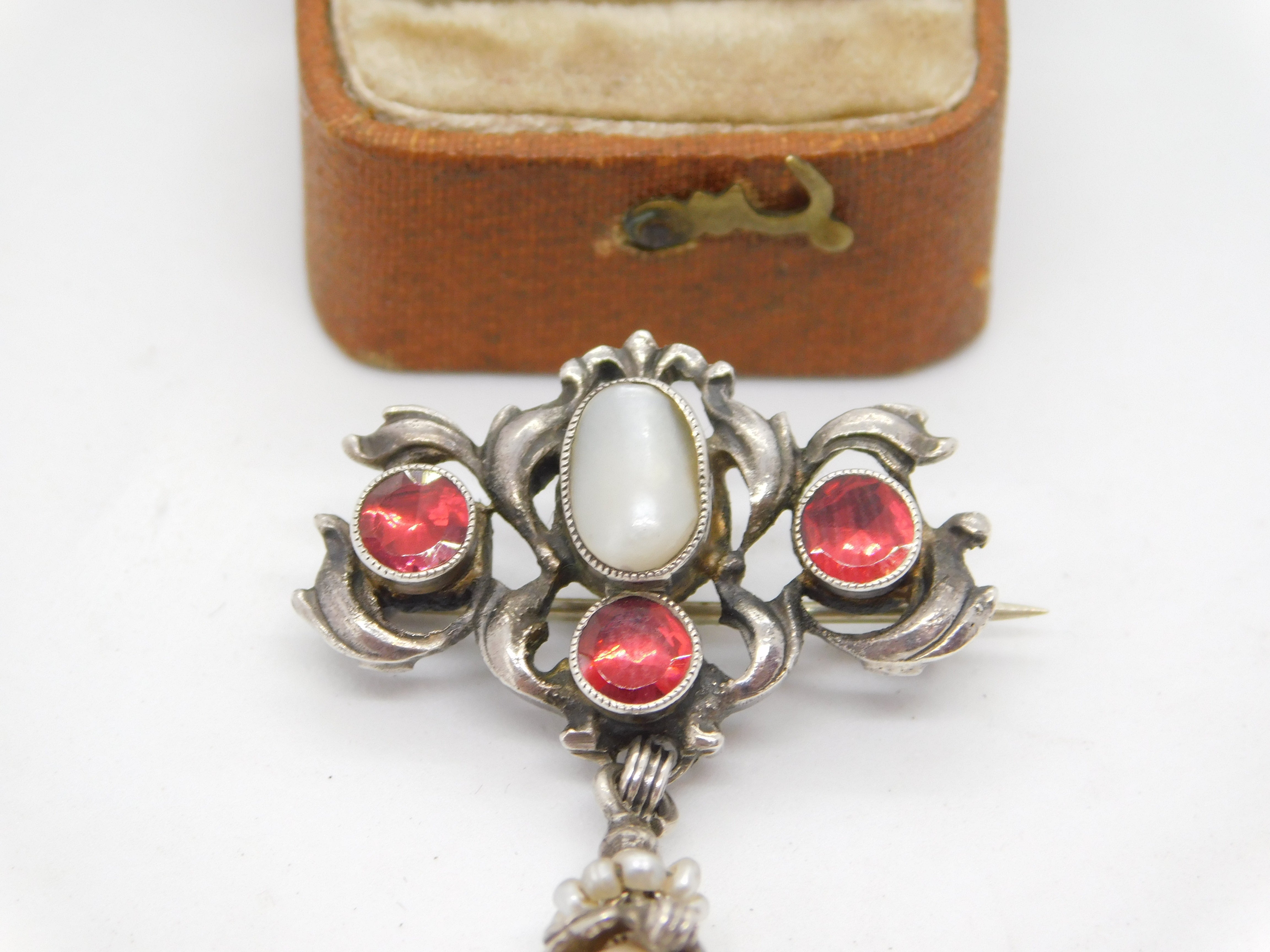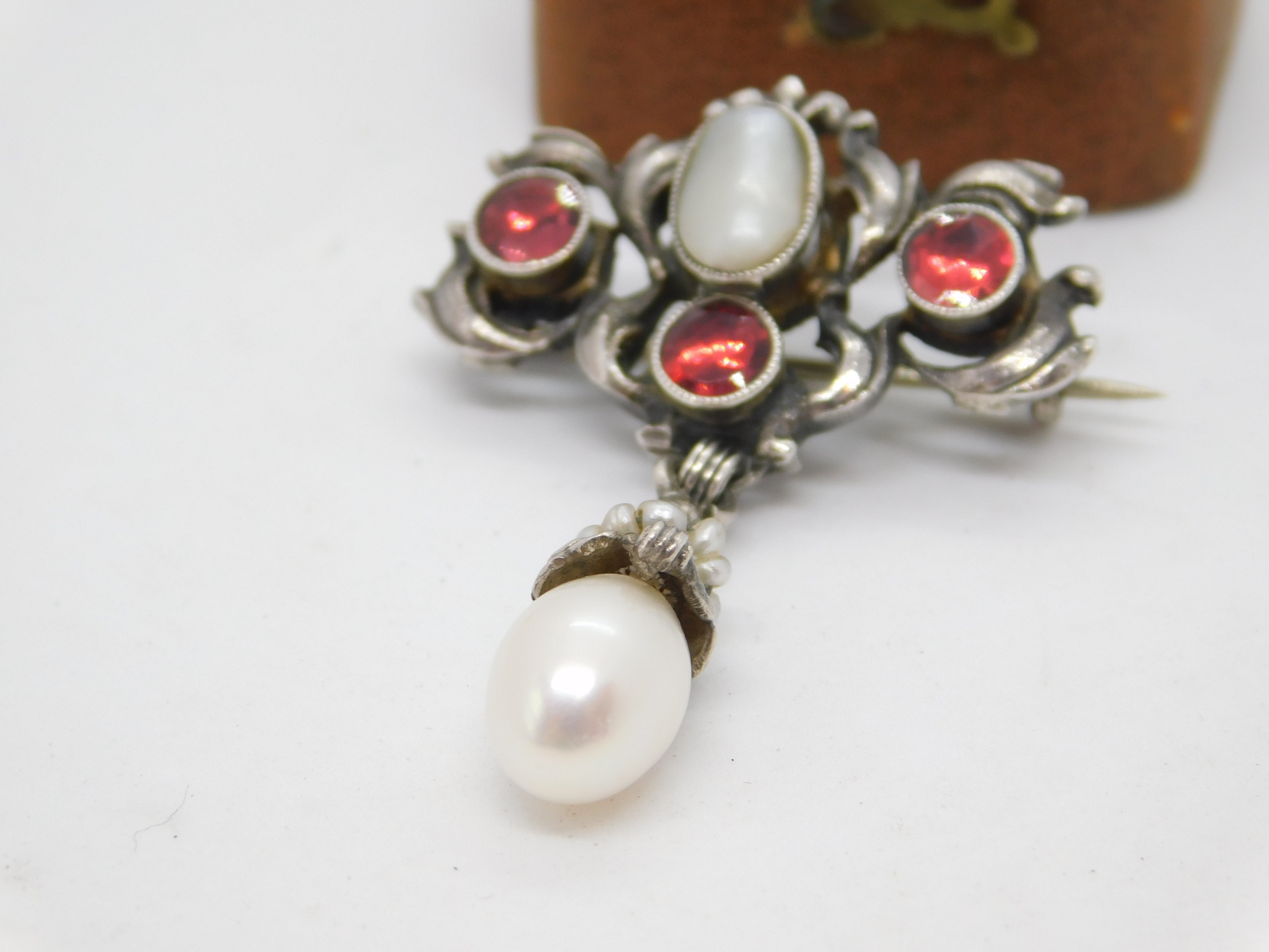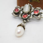 Victorian Austrian Sterling Silver, Pearl & Garnet Floral Drop Brooch c1850