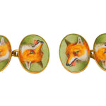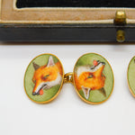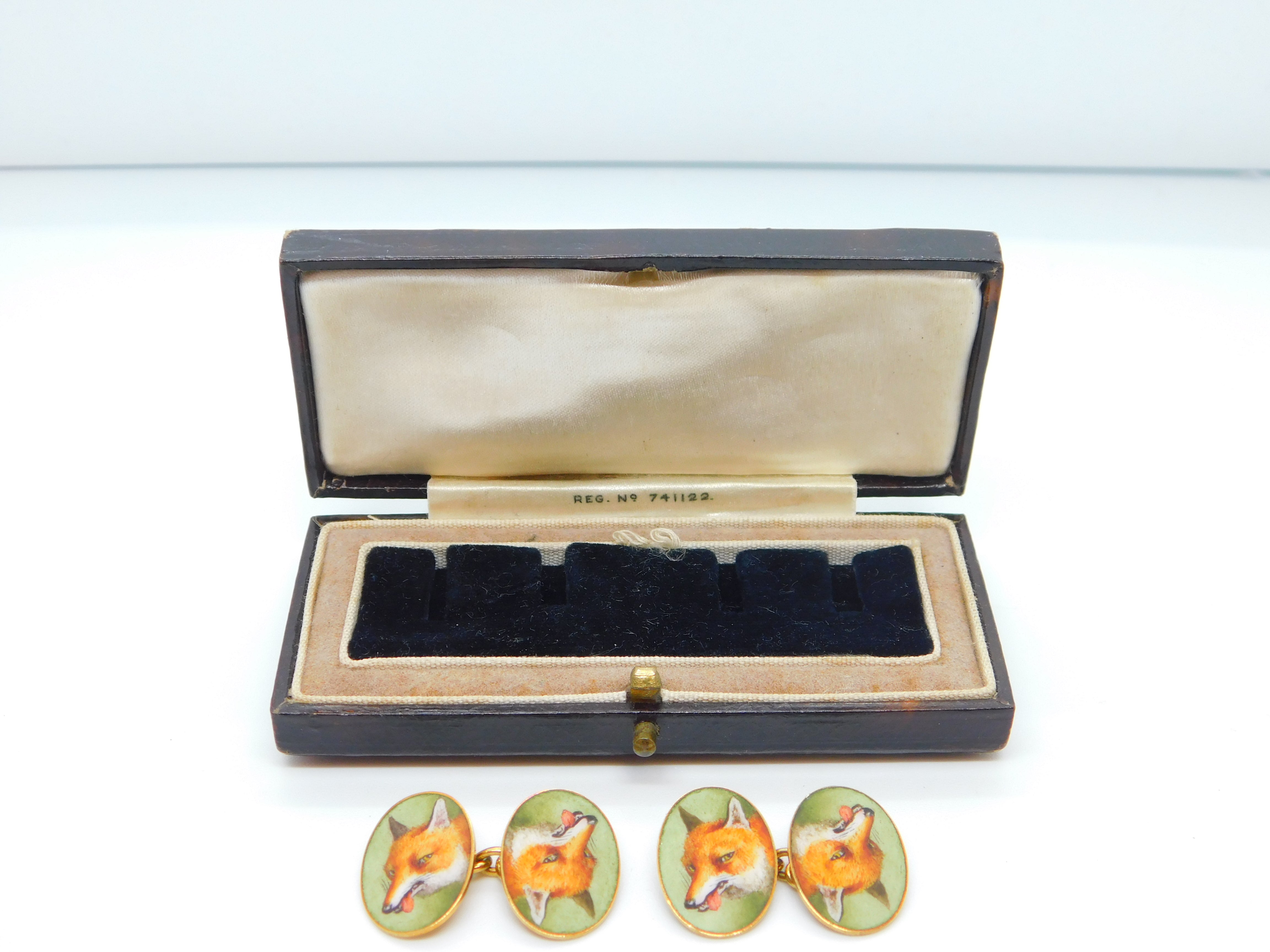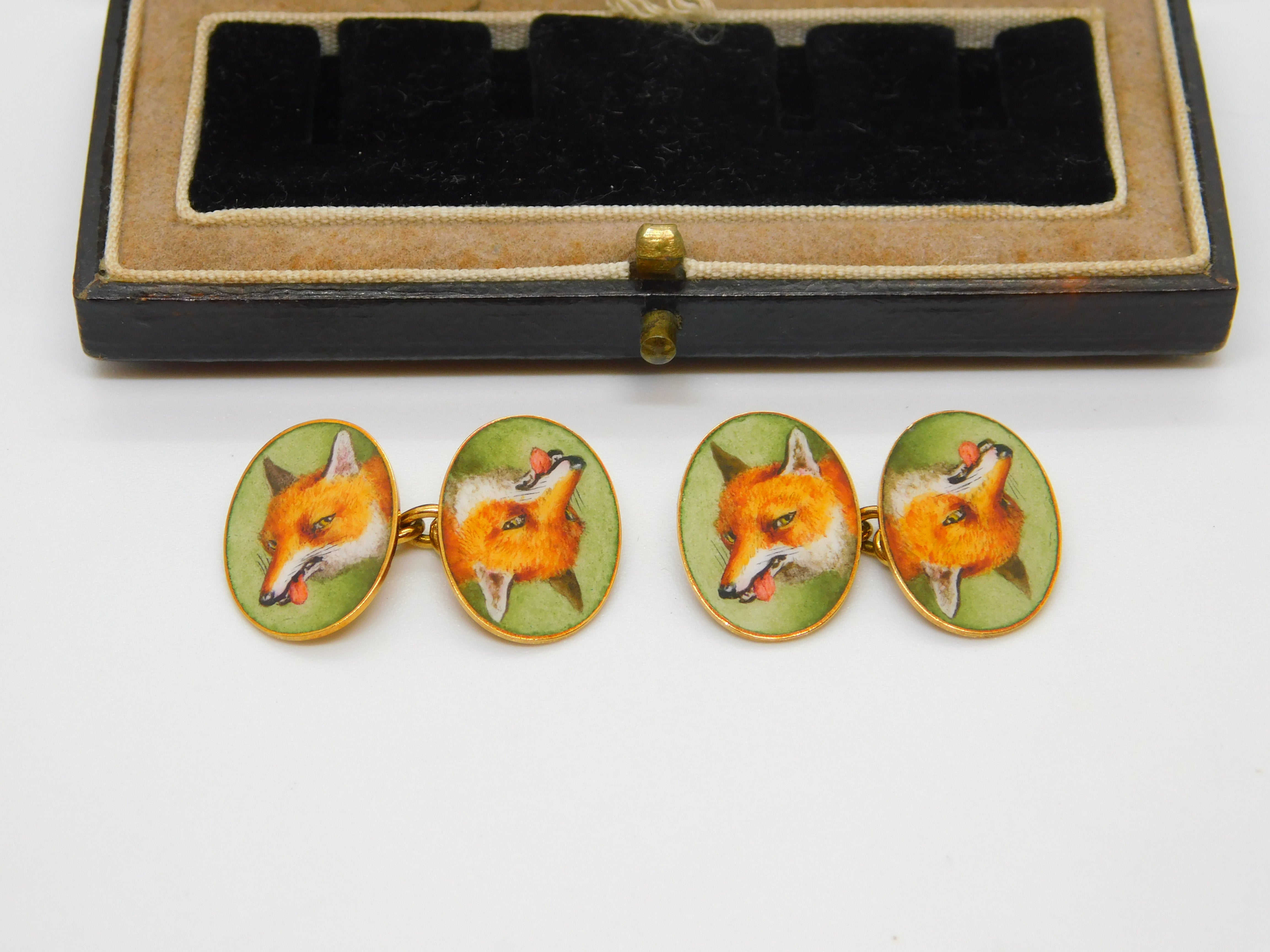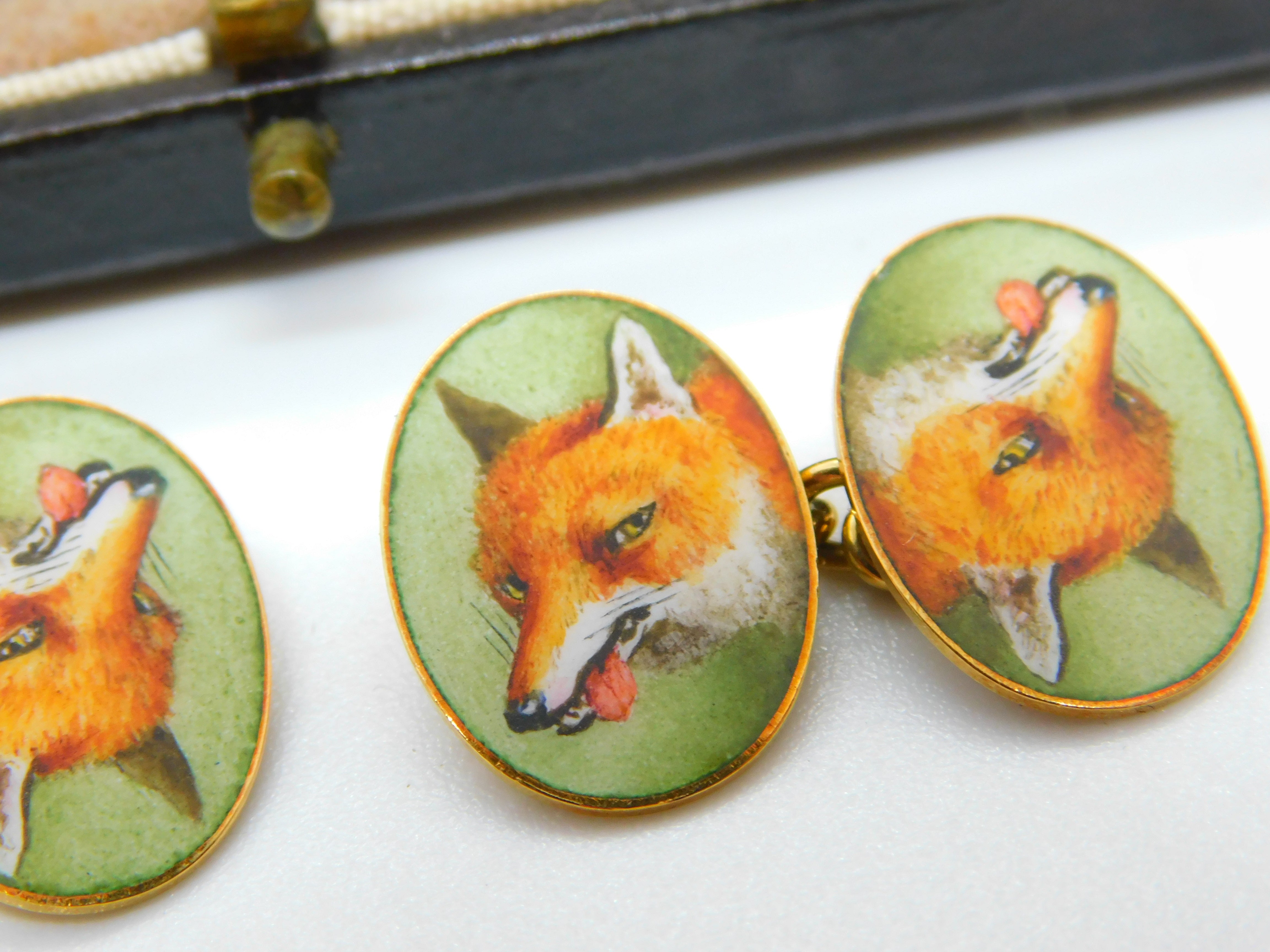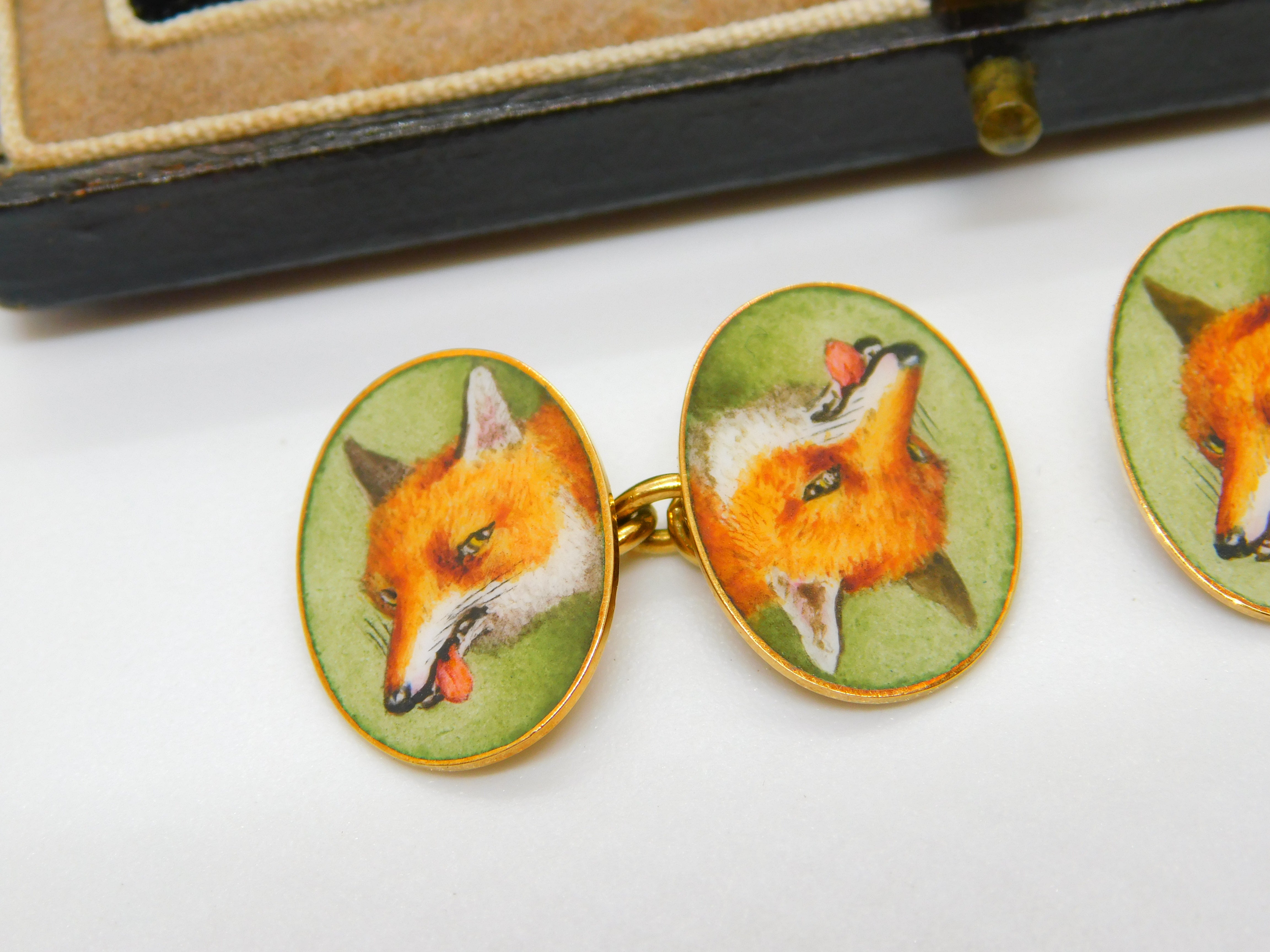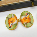 Details: A fantastic and wonderfully designed boxed pair of Victorian 18ct yellow gold and enamel gents cufflinks depicting fox masks with beautiful colour and detail both hallmarked to the reverse c1880. The cufflinks are included within the original box and the enamel is in perfect condition. This is a wonderful item that would make a perfect gift or addition to any collection.