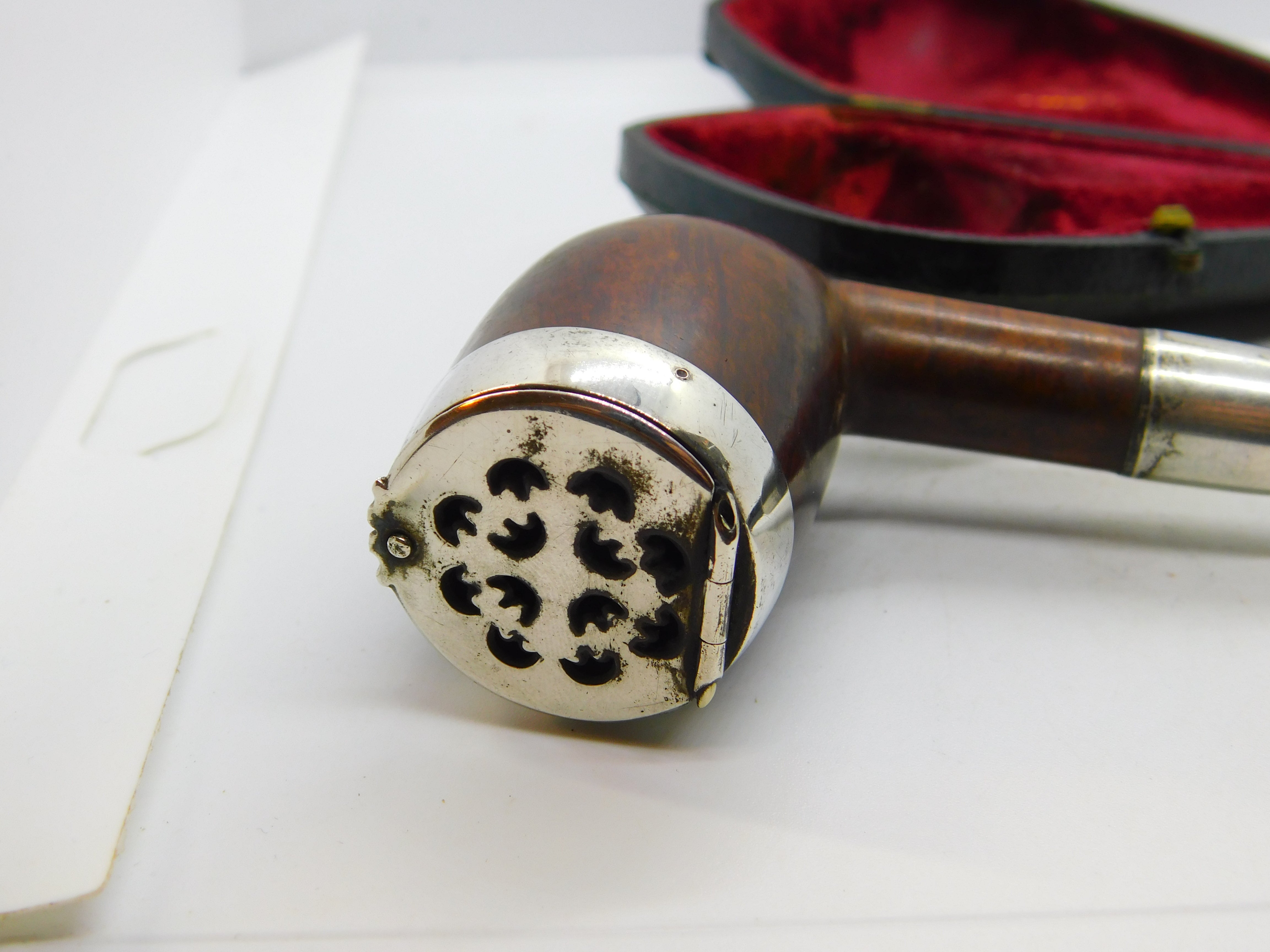 Details: A fantastic and wonderfully designed antique Victorian boxed wooden and sterling silver mounted smoking pipe with lovely detailing hallmarked London, 1890. This is a wonderful item that would make a perfect gift or addition to any collection.