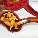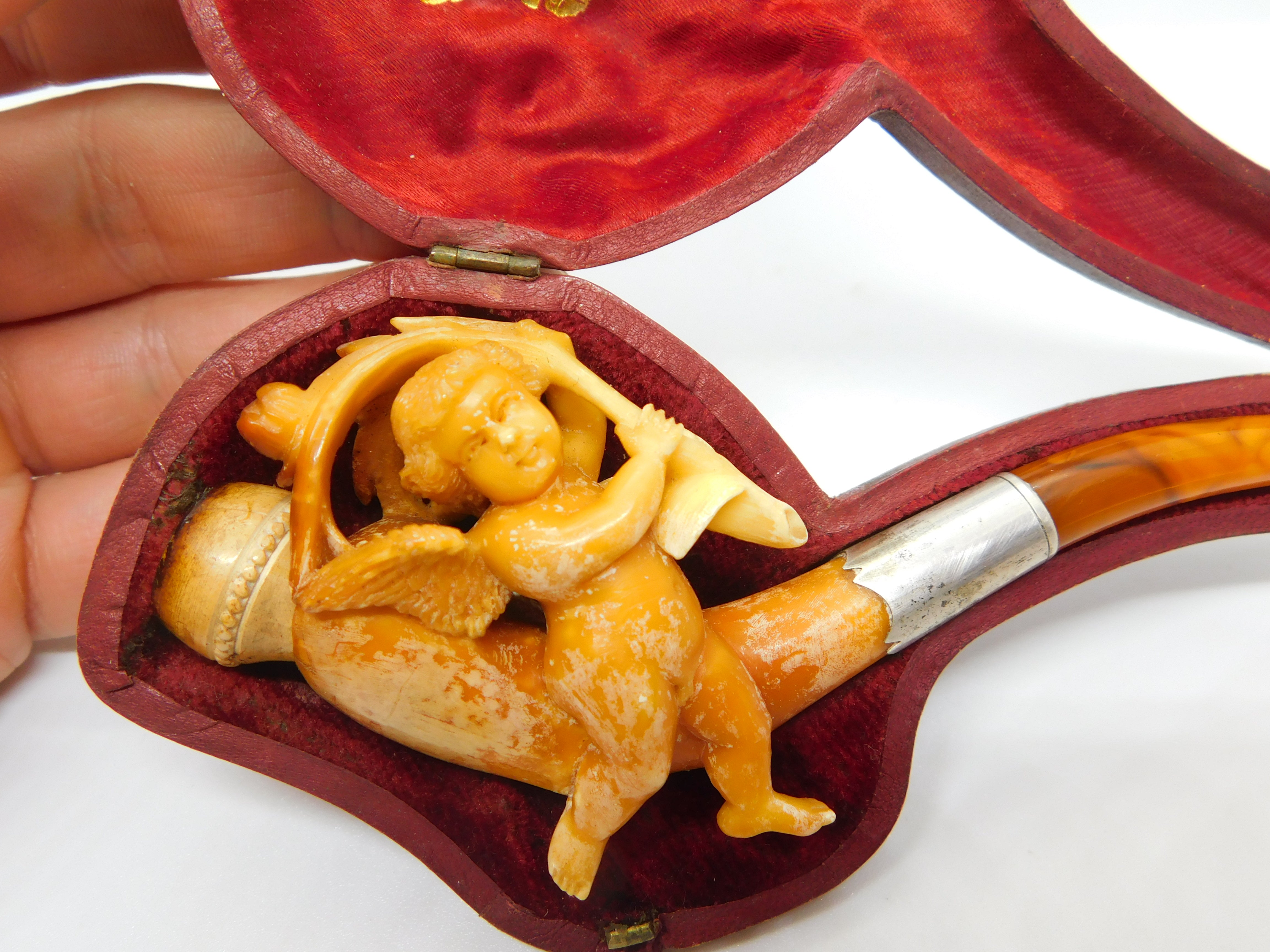 Details: A fantastic and wonderfully designed antique Victorian boxed meerschaum, silver & block amber cherub or cupid form smoking pipe with lovely detailing c1860. This is a wonderful item that would make a perfect gift or addition to any collection.