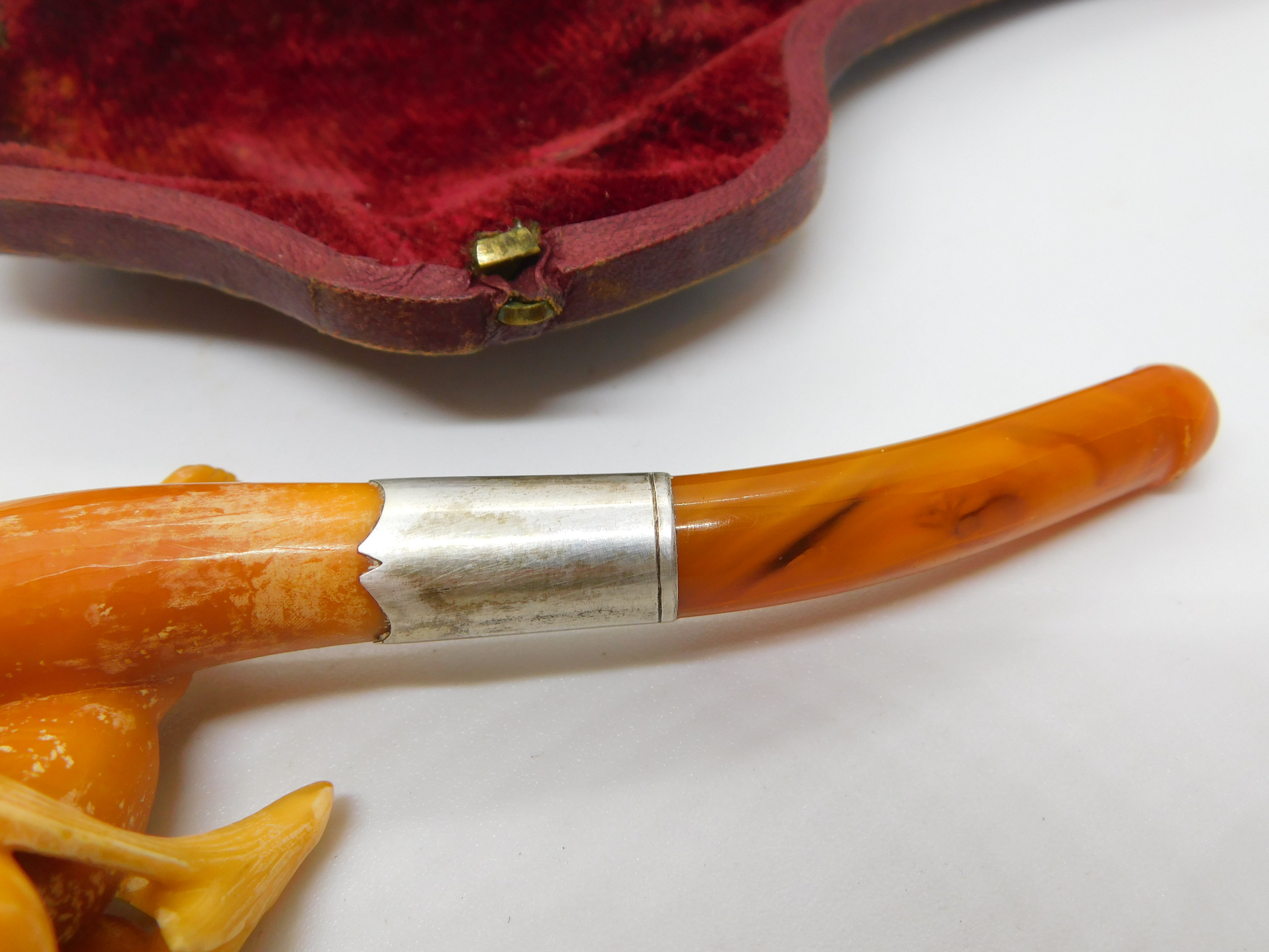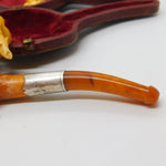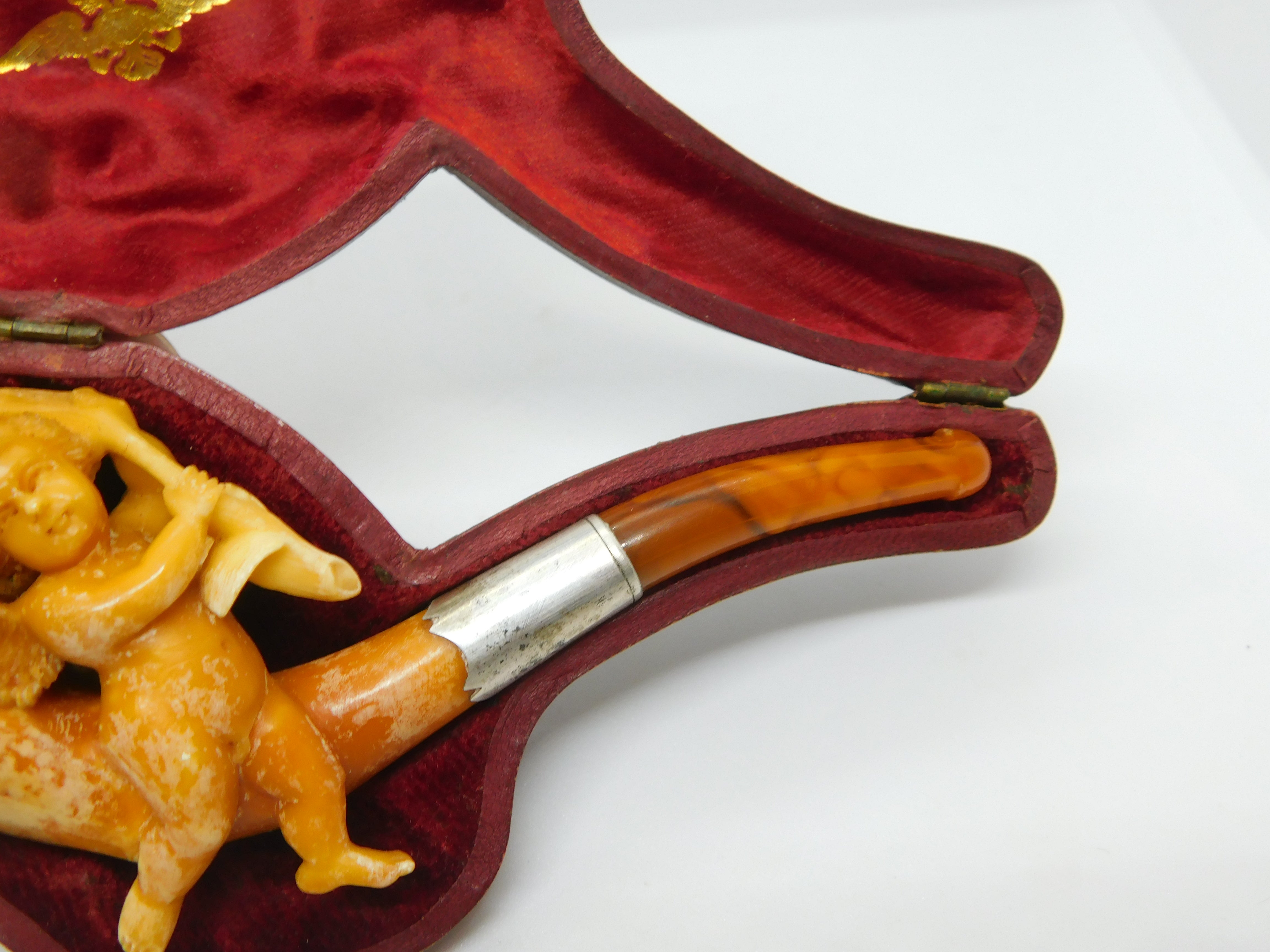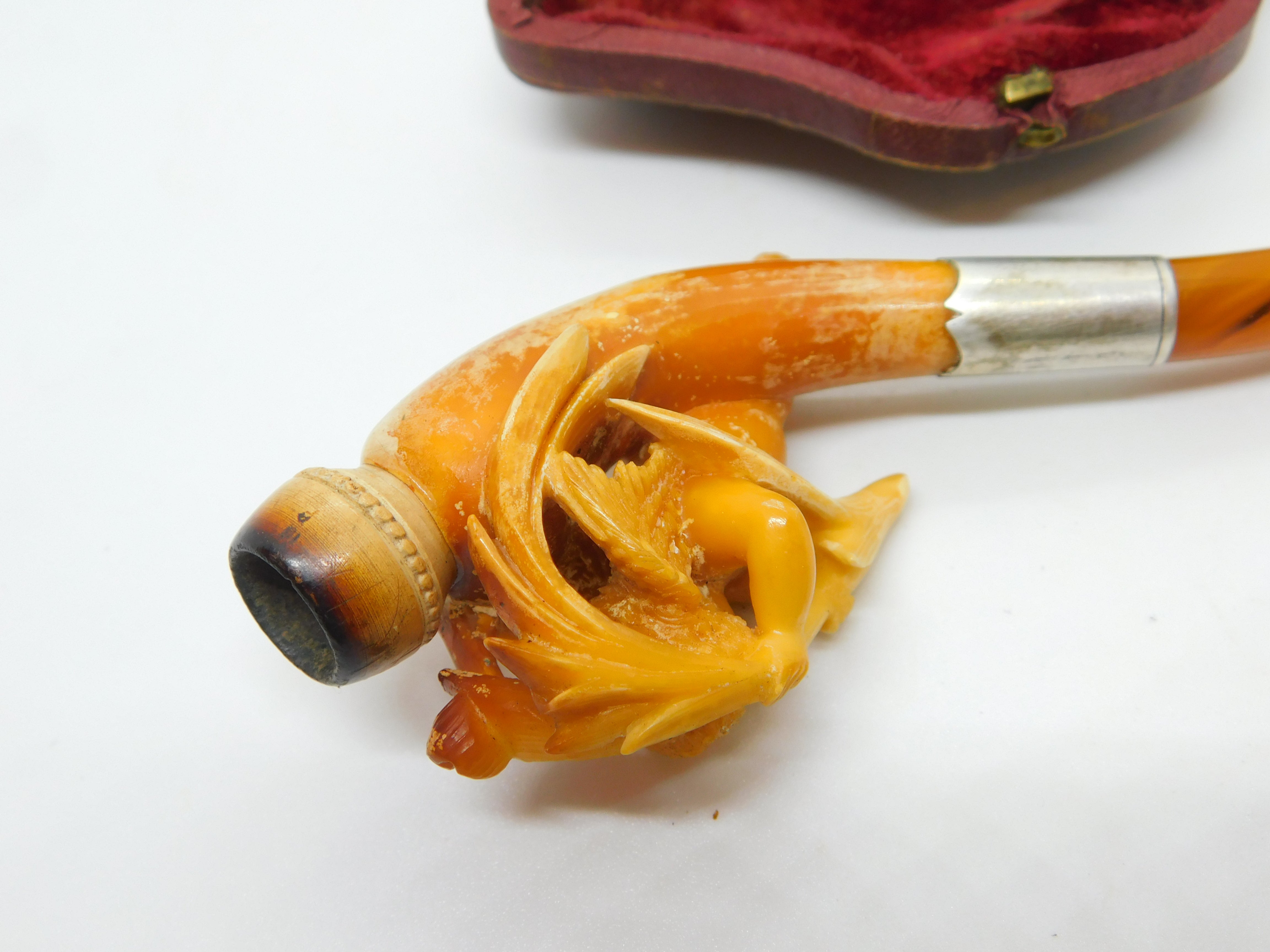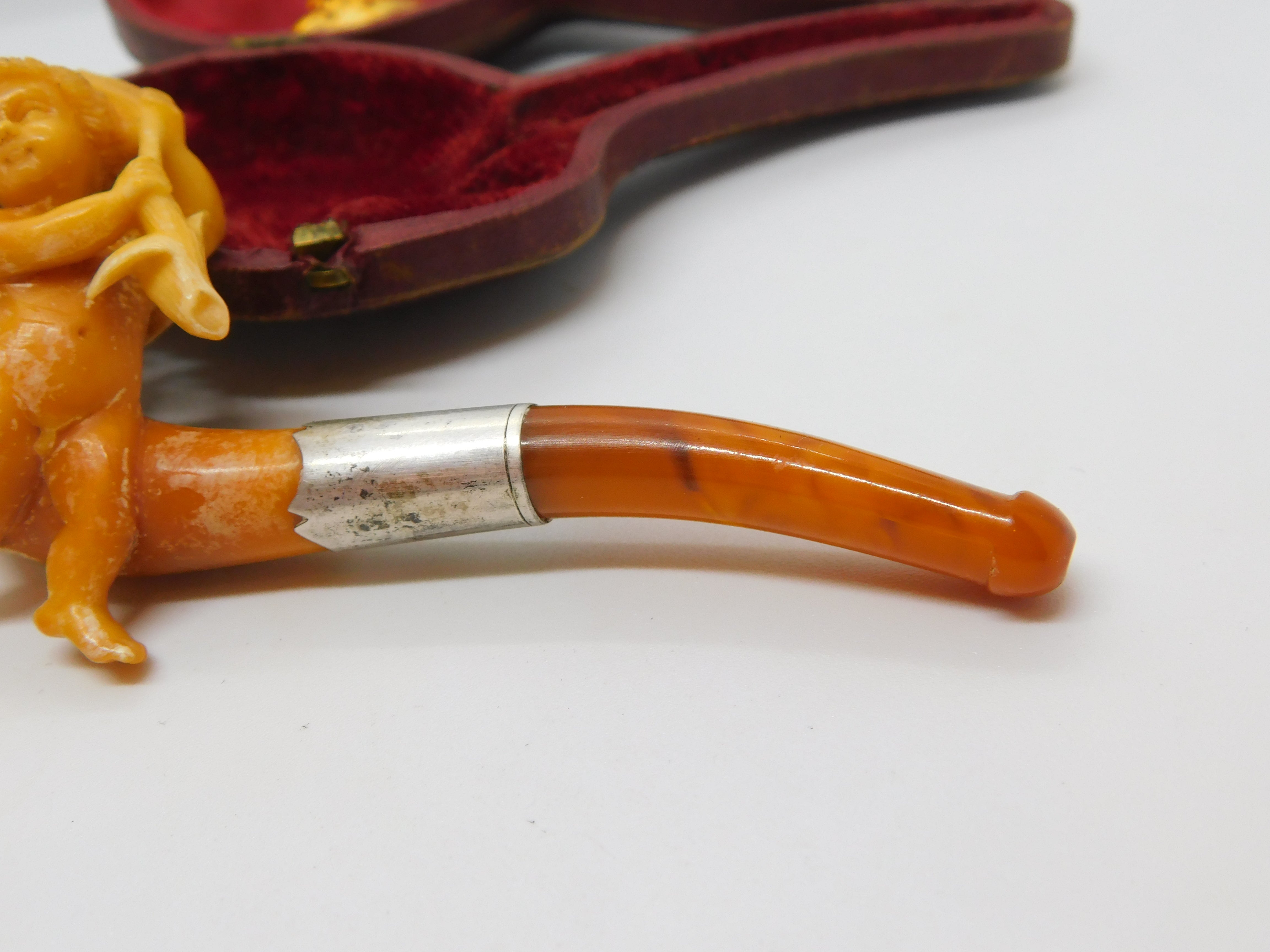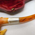 Victorian Cased Meerschaum, Silver & Block Amber Cherub Pipe Antique c1860