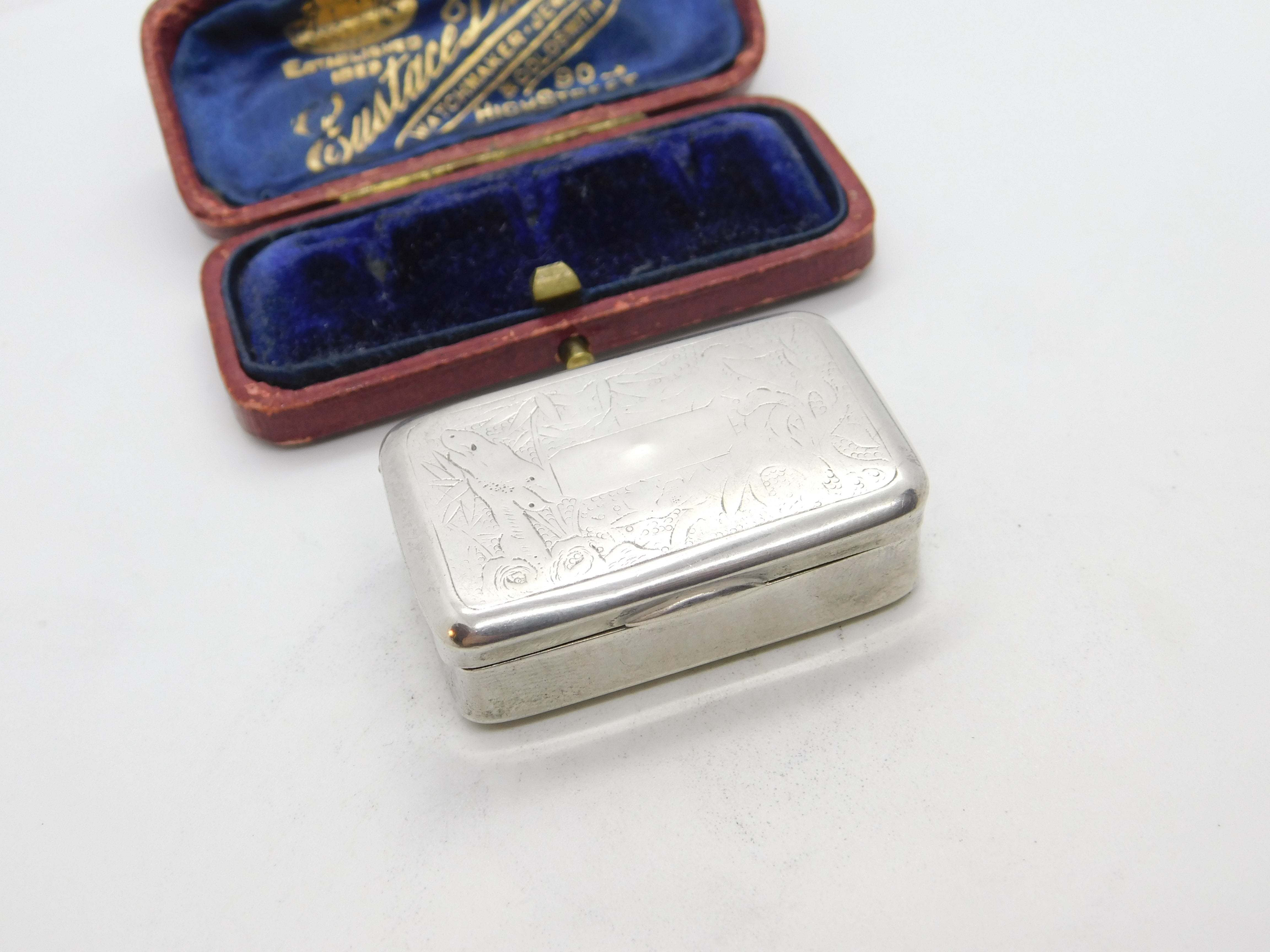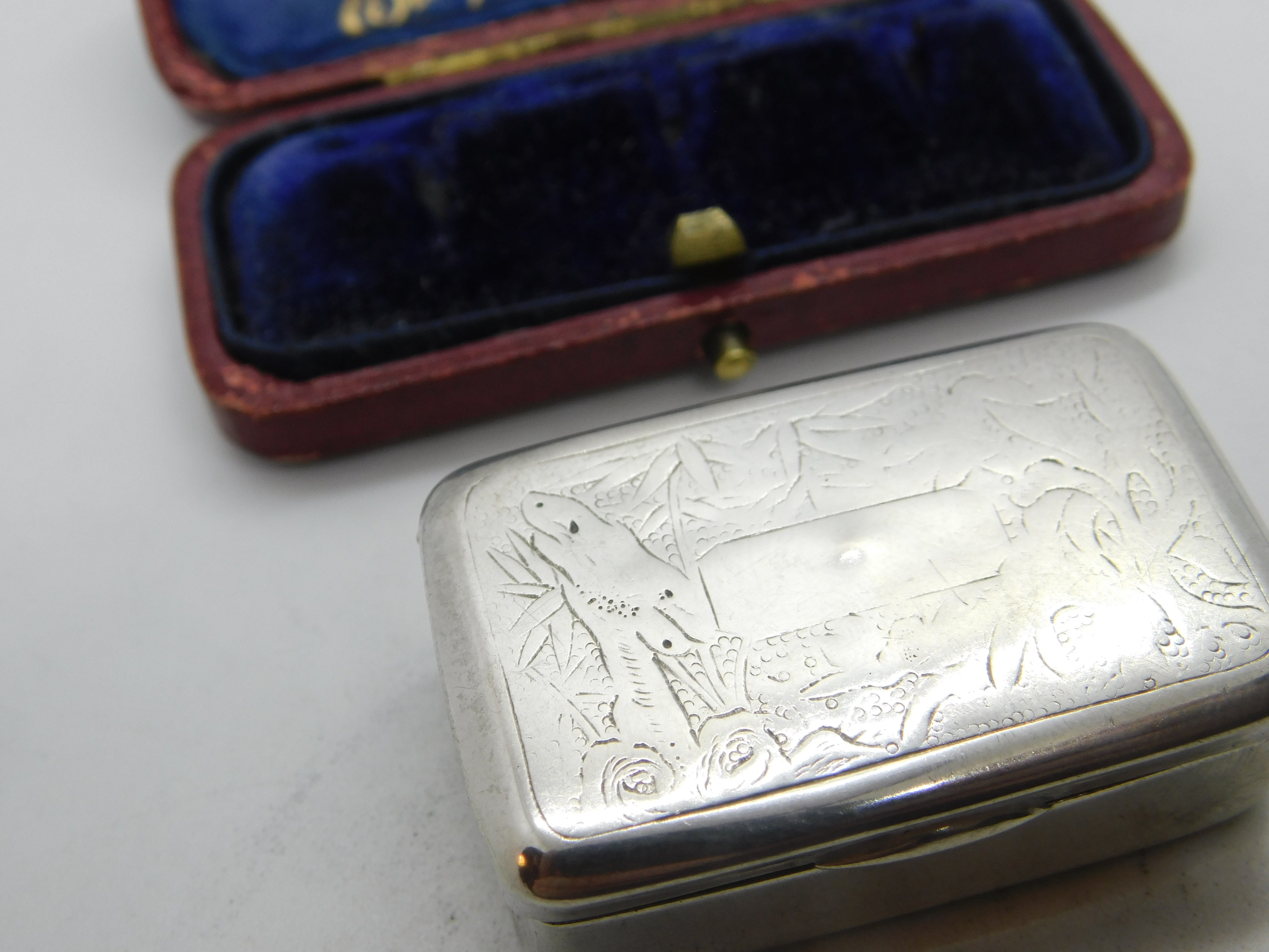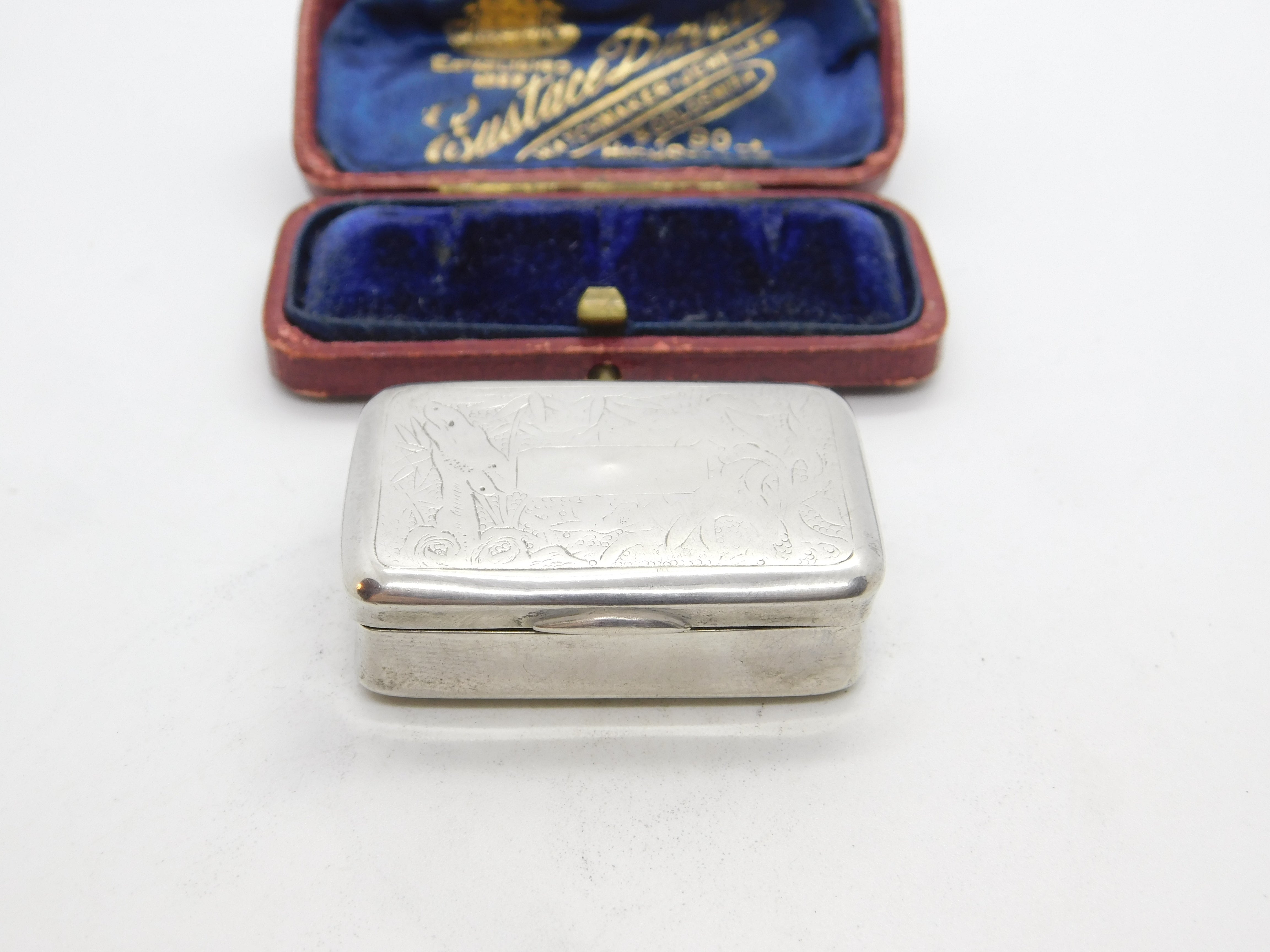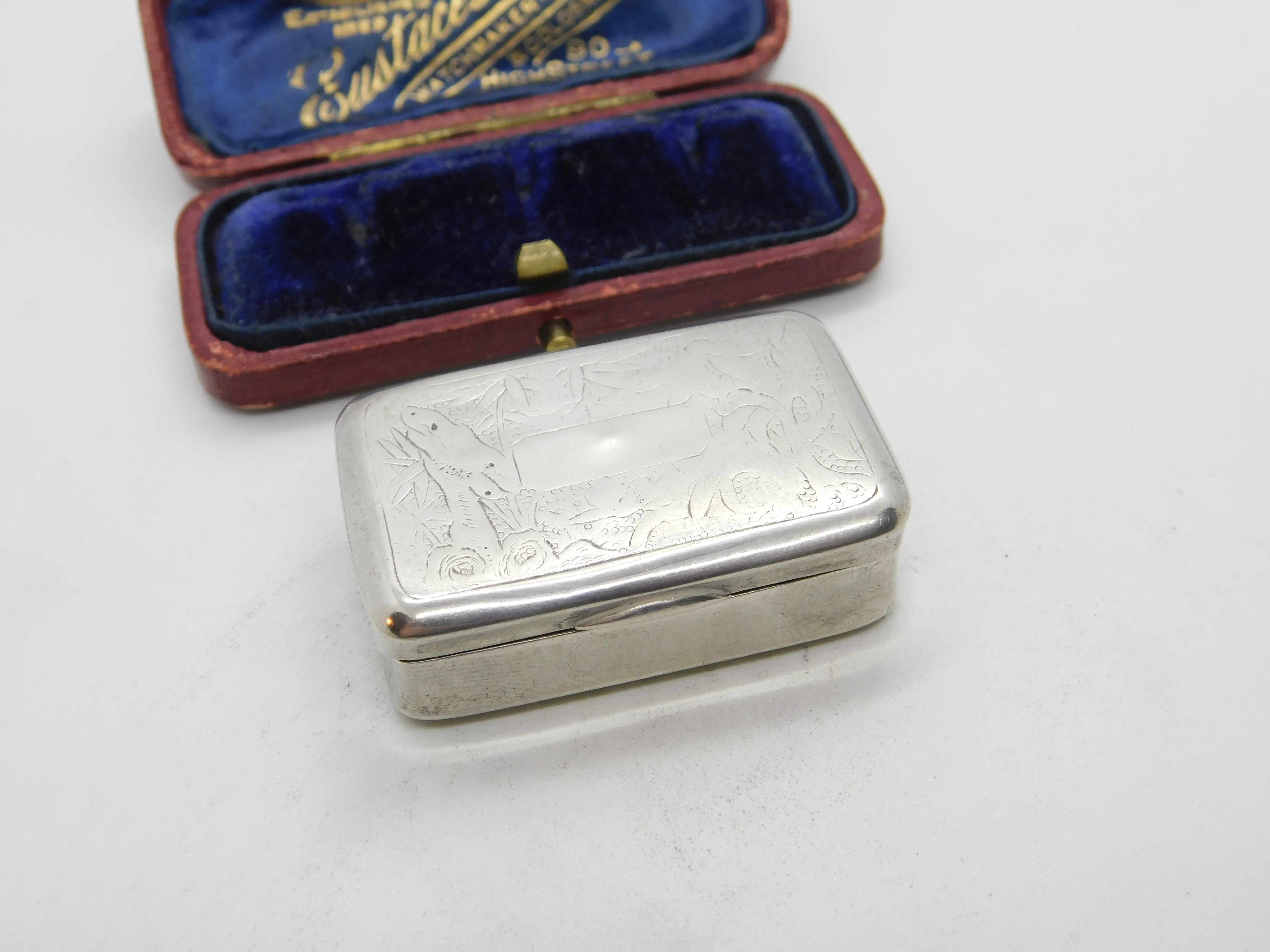 Details: A fantastic and wonderfully designed antique Victorian Chinese sterling silver floral etched snuff box or pill box with lovely detailing hallmarked to the interior possibly made in Nanking c1880. This is a wonderful item that would make a perfect gift or addition to any collection. The BOX pictured is for PRESENTATION ONLY and is NOT included in the listings but used to frame the pictures unless specifically stated otherwise.