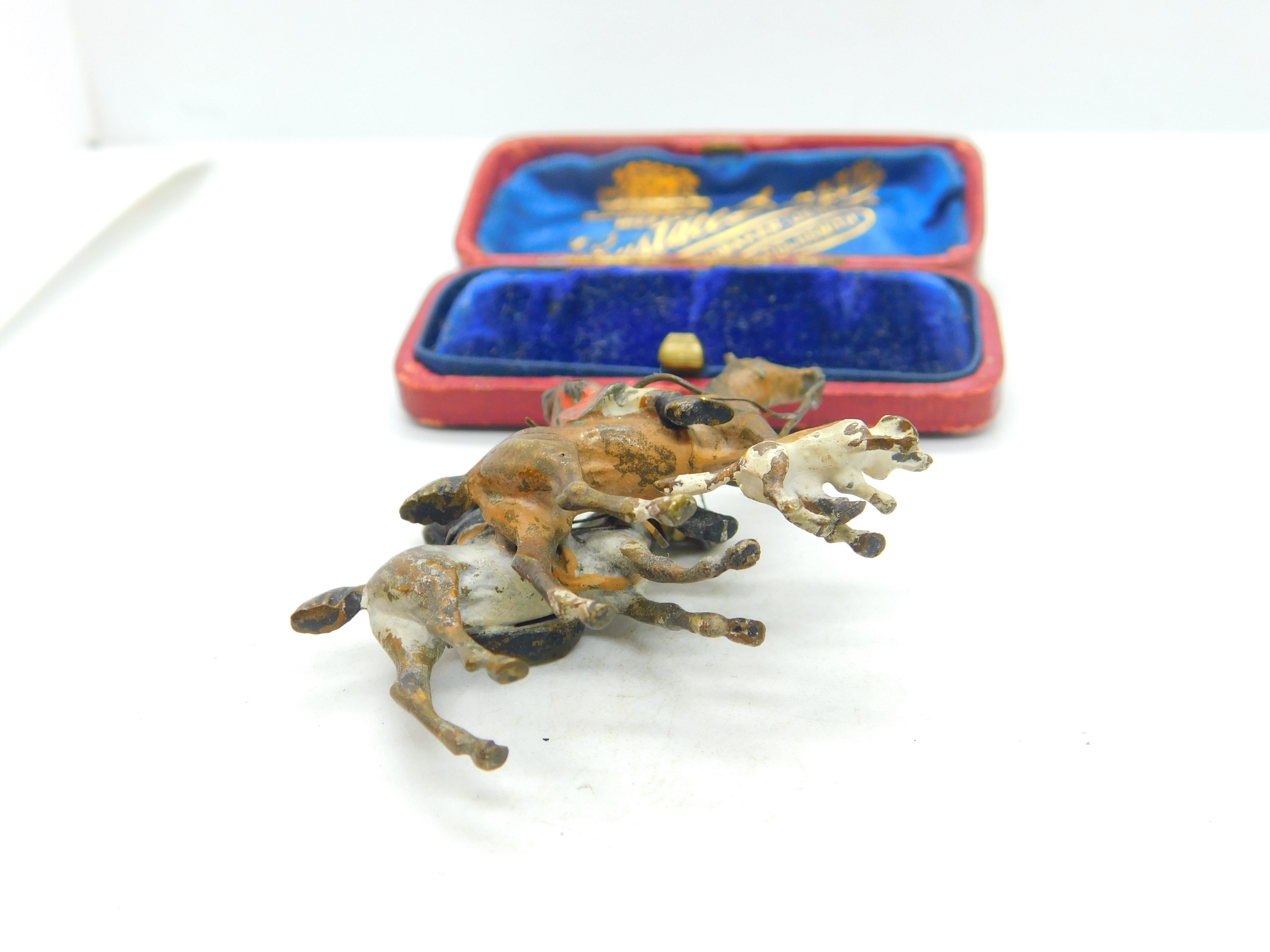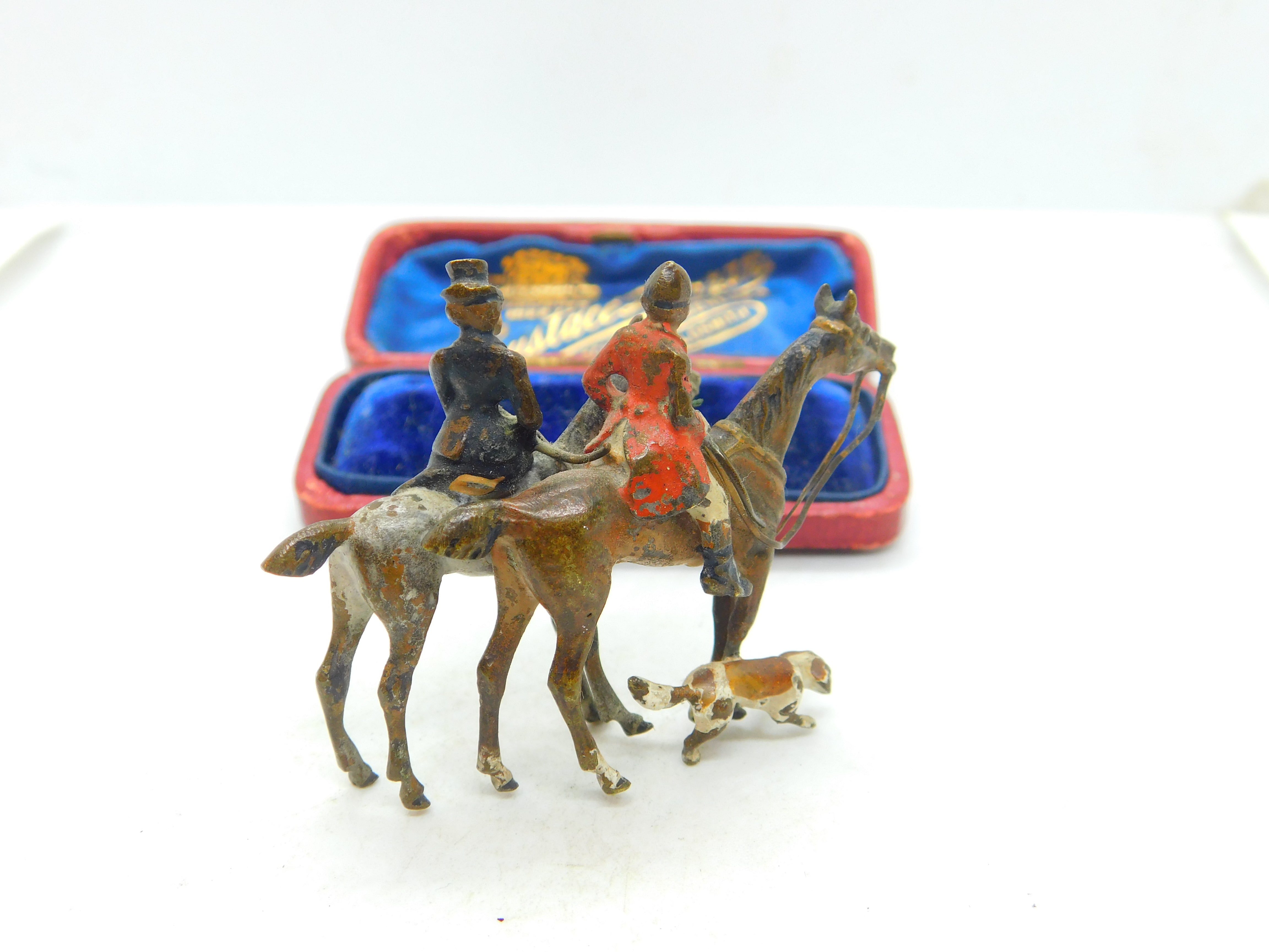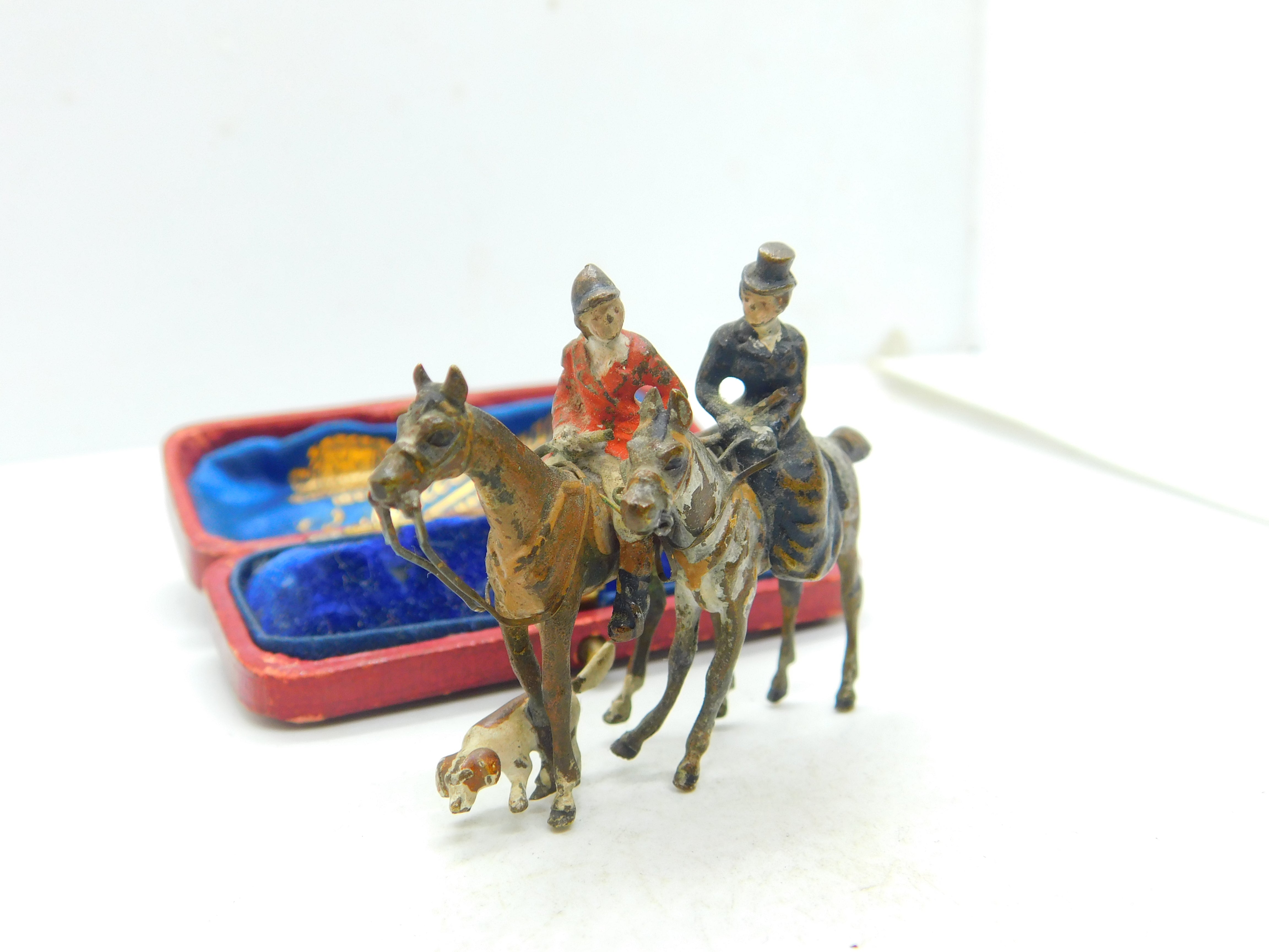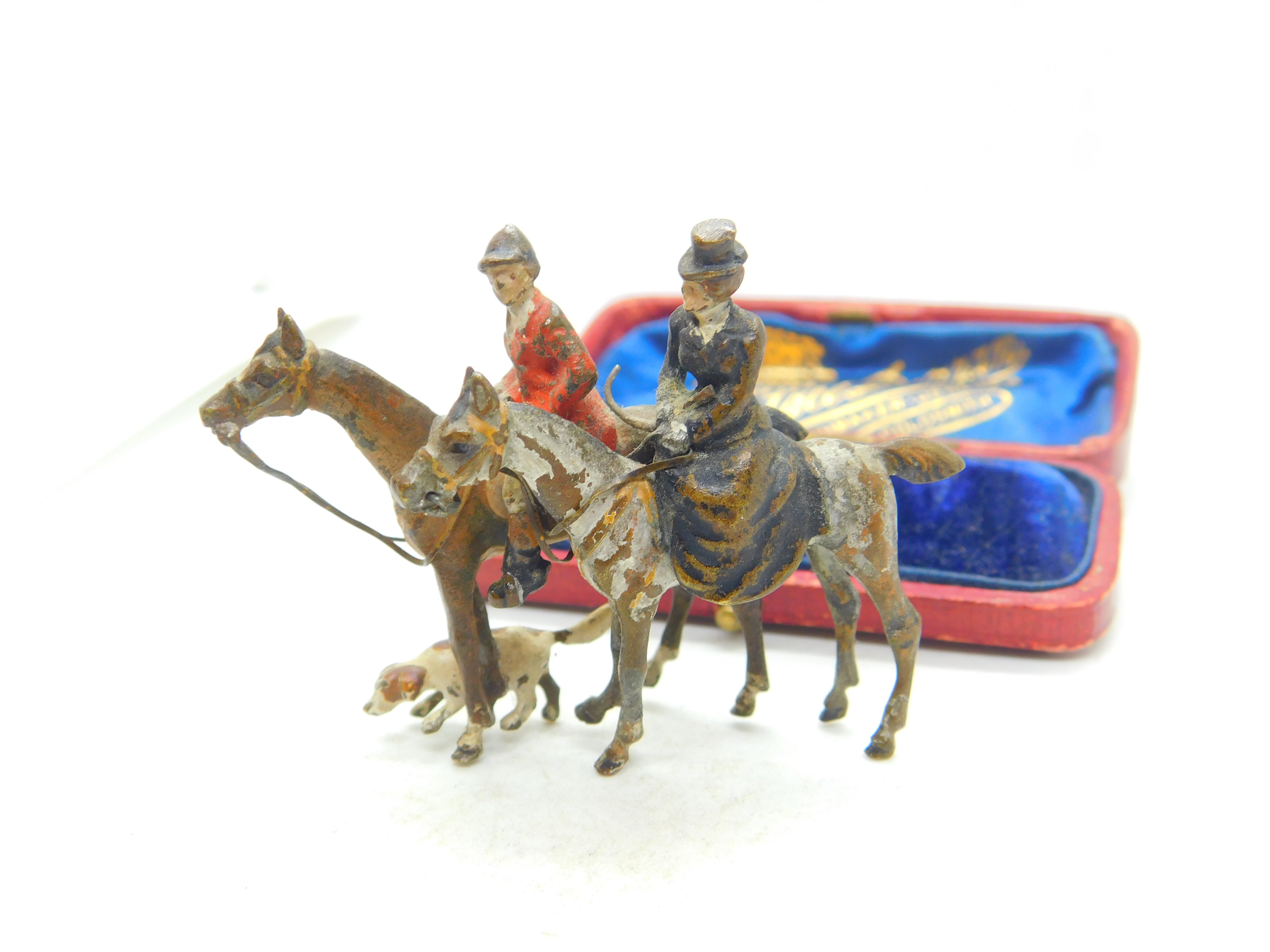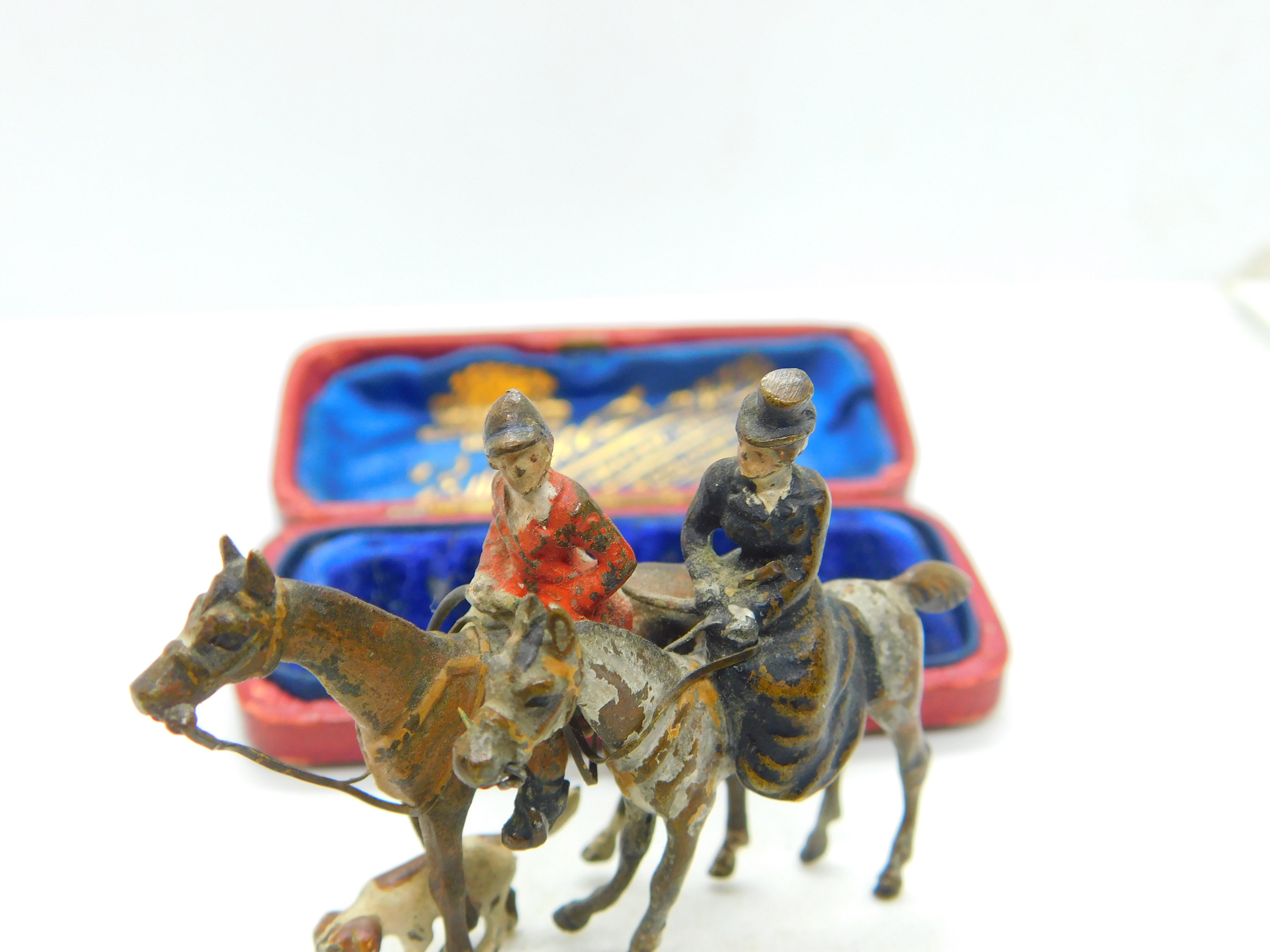 Details: A fantastic and wonderfully designed antique Victorian small cold painted bronze sculpture depicting a hunting scene with a master, a lady riding side saddle accompanied by a little hound c1880. This is a wonderful item that would make a perfect gift or addition to any collection. The BOX pictured is for PRESENTATION ONLY and is NOT included in the listings but used to frame the pictures unless specifically stated otherwise.