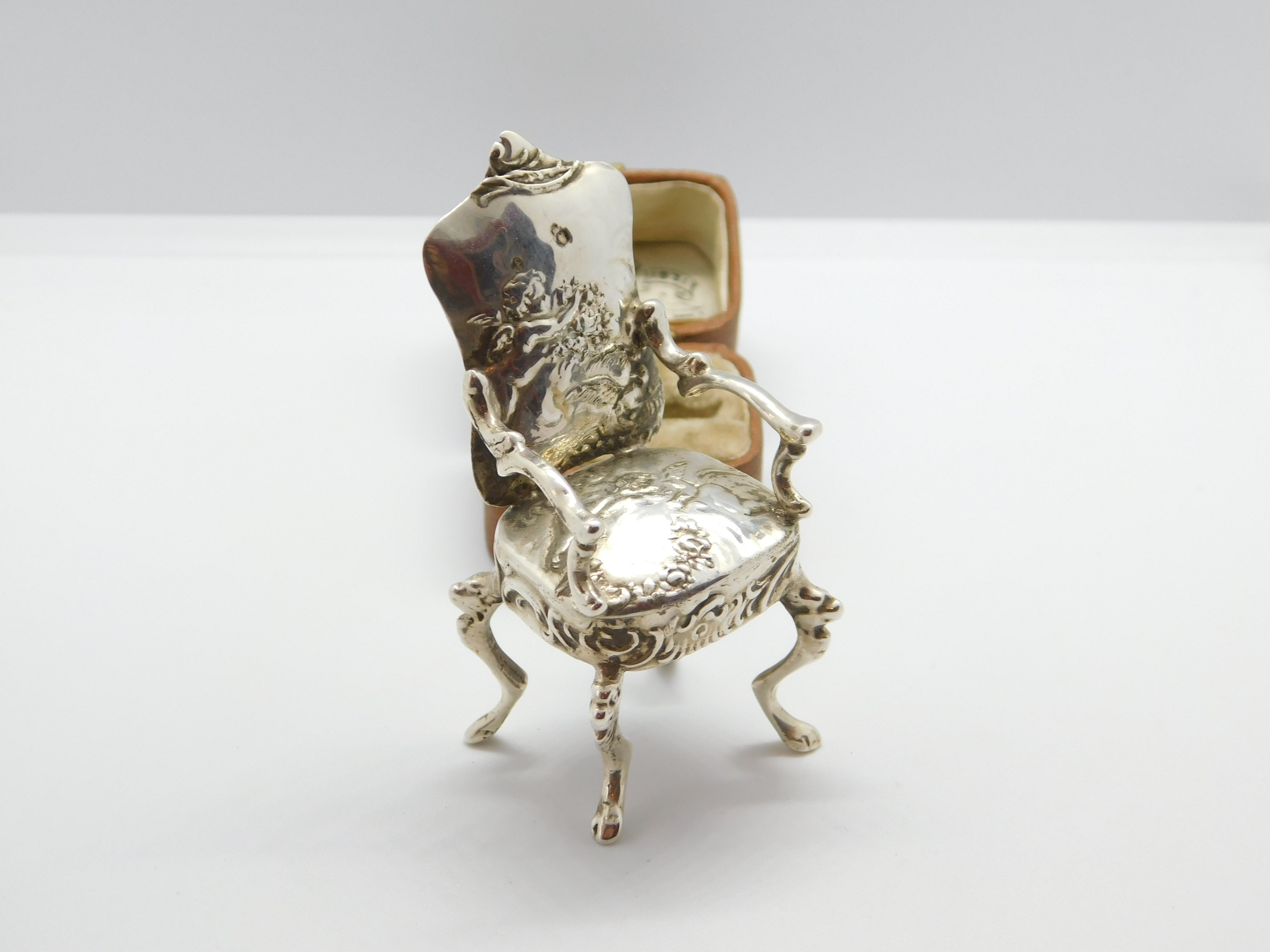 Details: A fantastic and wonderfully designed antique Victorian Dutch sterling silver dolls house miniature chair with ornate detailing throughout faintly hallmarked and tested c1900. This is a wonderful item that would make a perfect gift or addition to any collection. The BOX pictured is for PRESENTATION ONLY and is NOT included in the listings but used to frame the pictures unless specifically stated otherwise.