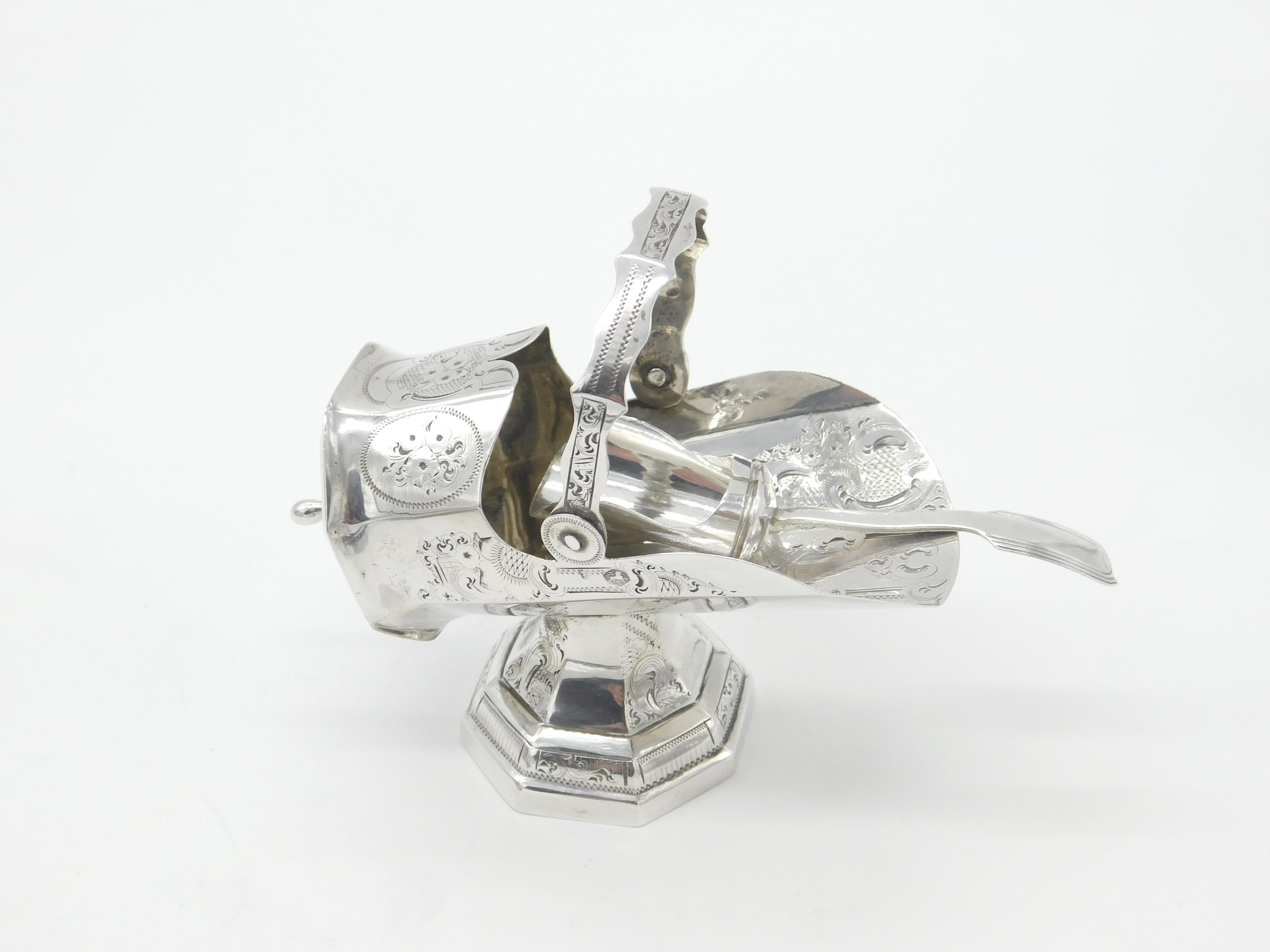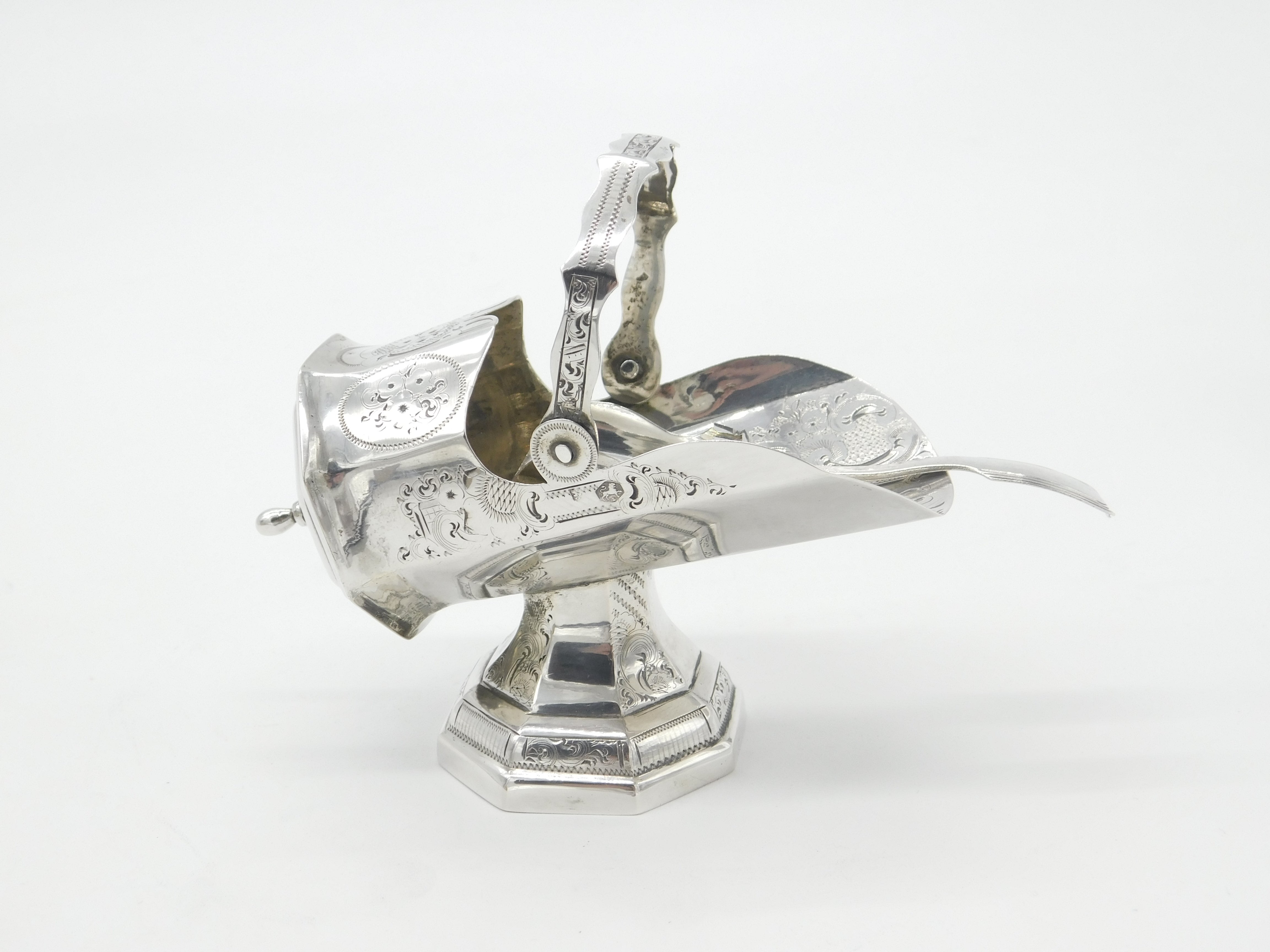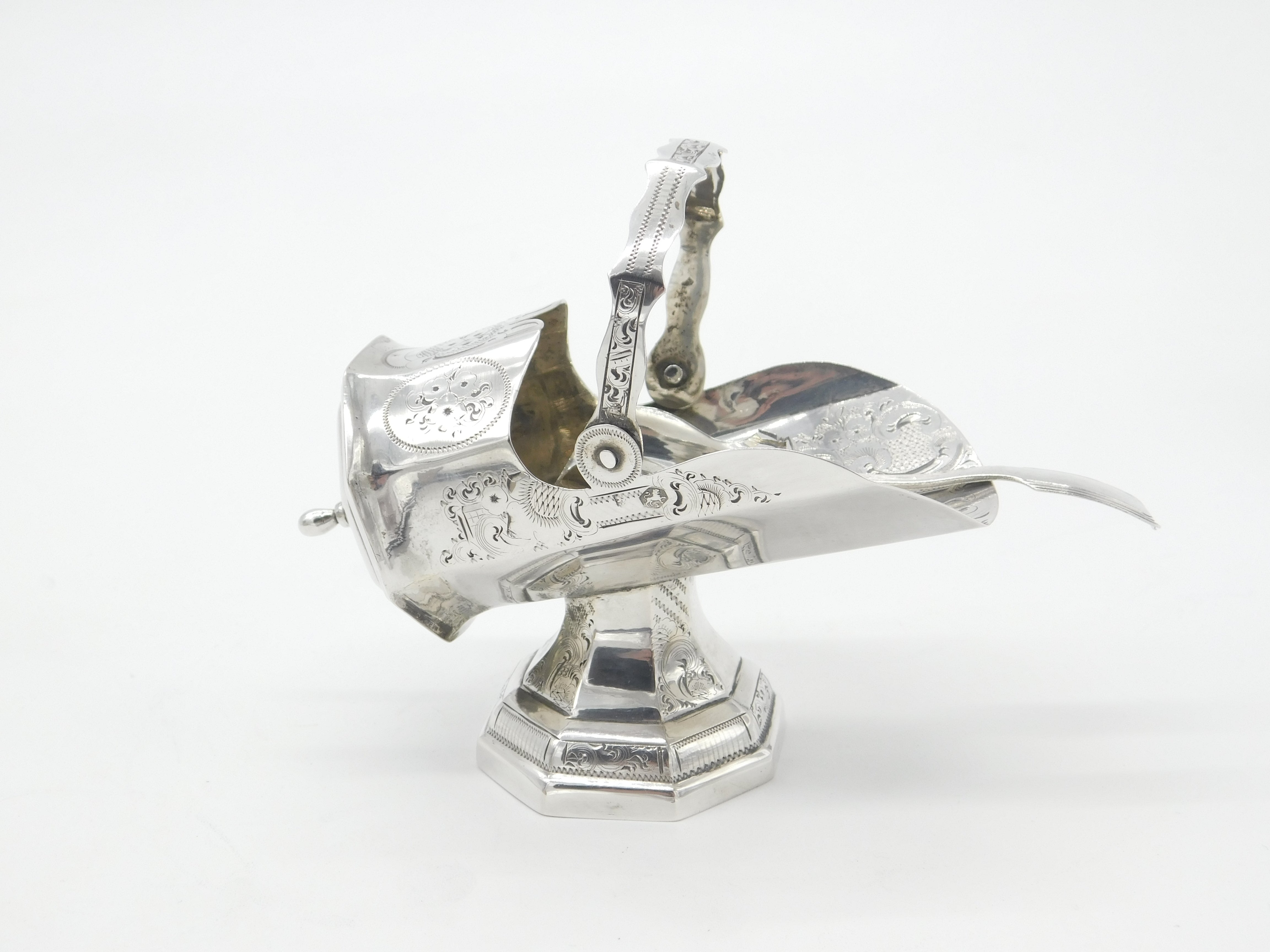 Details: A fantastic and wonderfully designed antique Victorian Dutch sterling silver novelty sugar scuttle with lovely floral patterns throughout including a matched spoon hallmarked throughout with Dutch hallmarks c1890. Weighted to the base. This is a wonderful item that would make a perfect gift or addition to any collection. The BOX pictured is for PRESENTATION ONLY and is NOT included in the listings but used to frame the pictures unless specifically stated otherwise.
