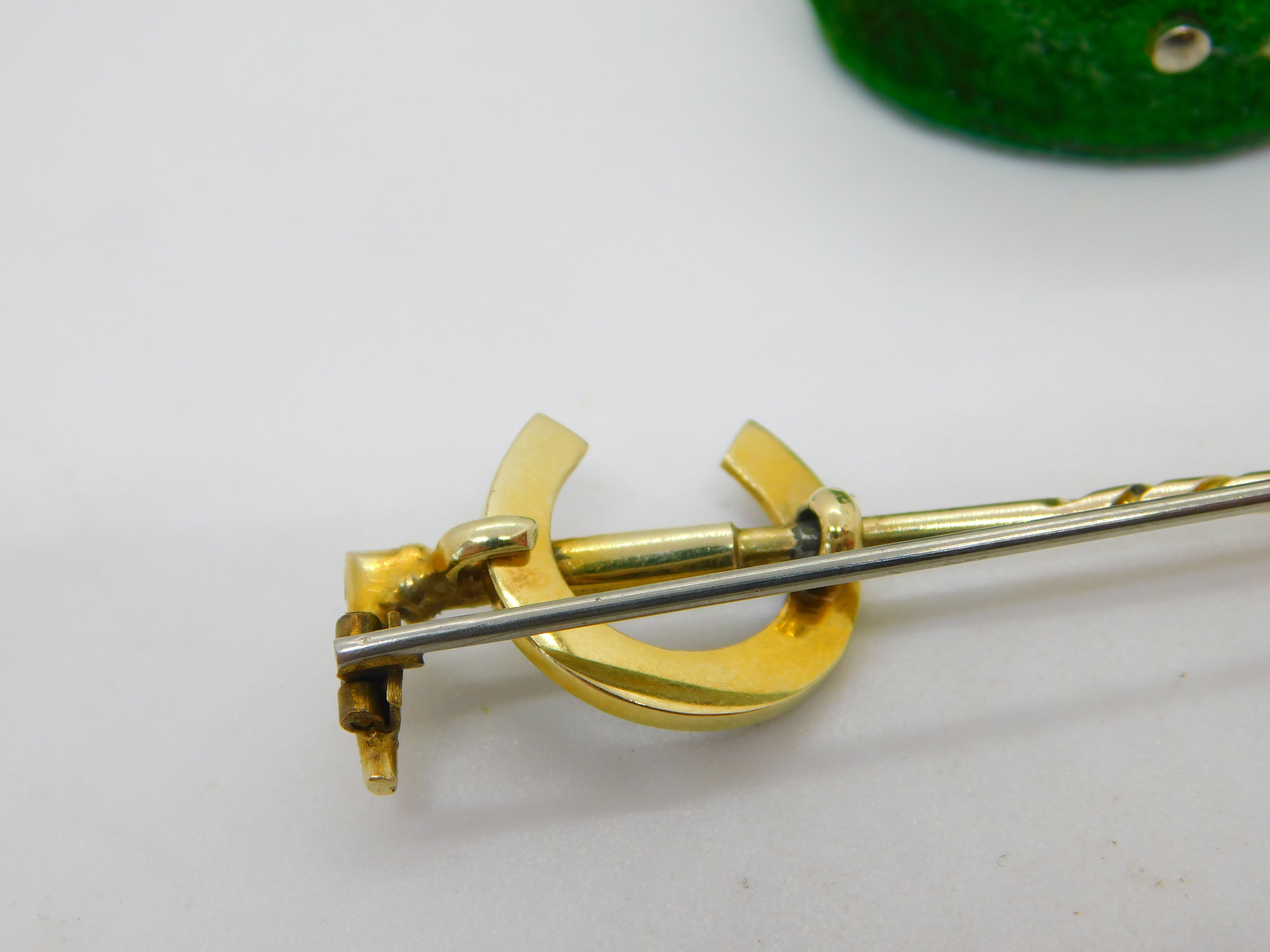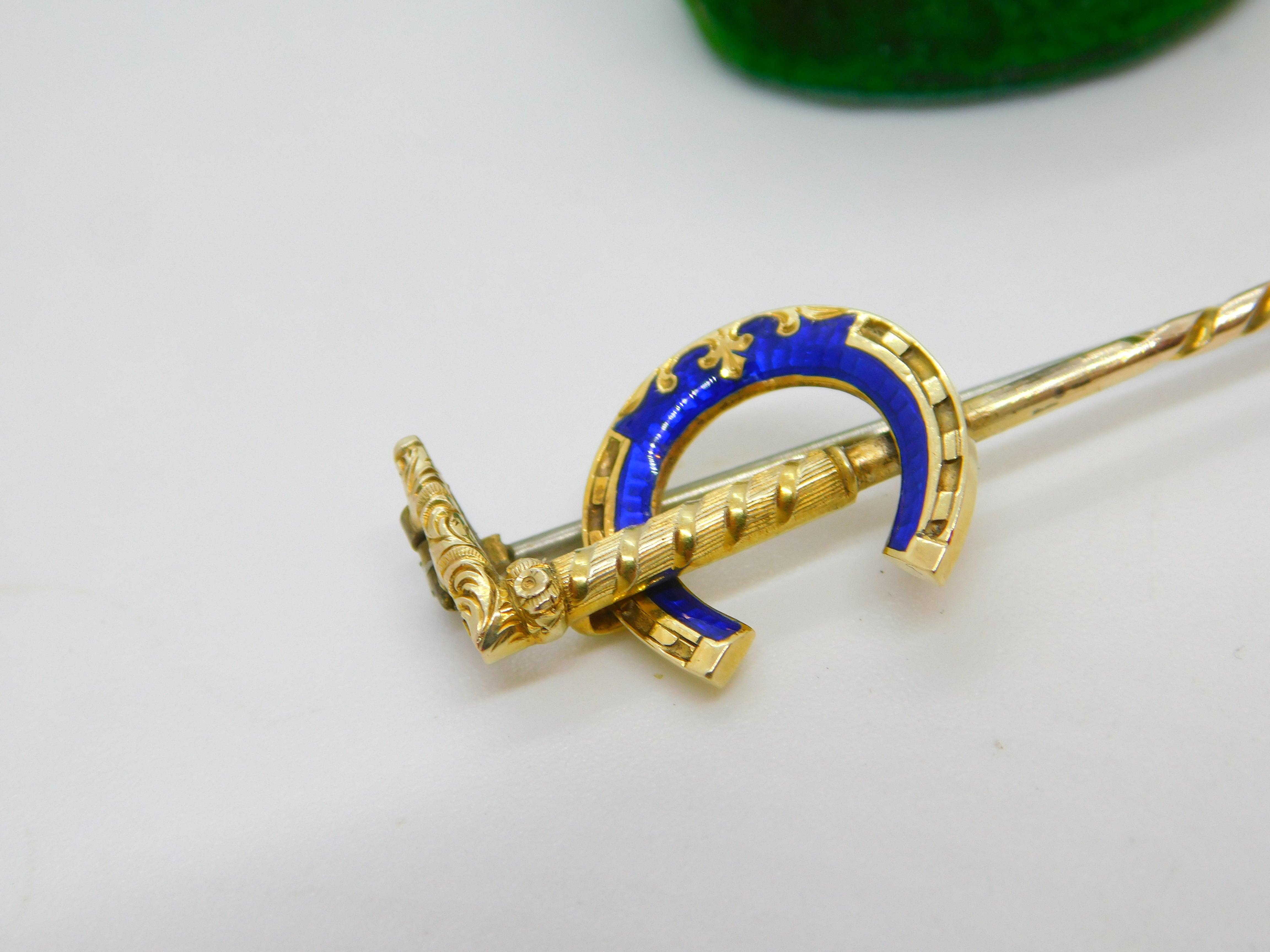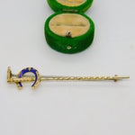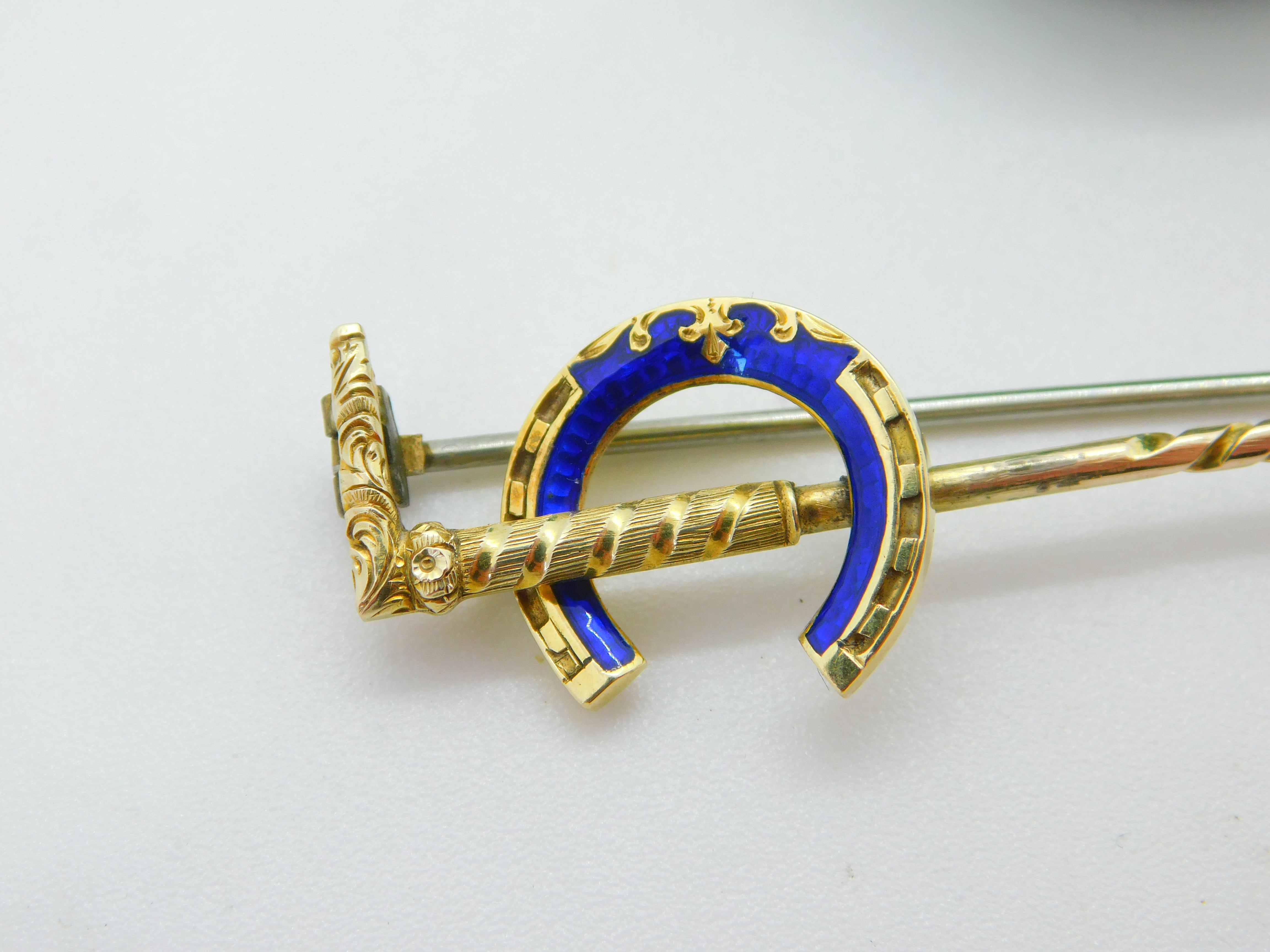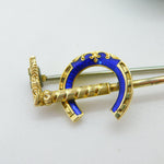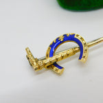 Details: A fantastic and wonderfully designed antique Victorian french 18ct yellow gold long bar brooch or stock pin in the form of a hunting crop and blue enamel adorned lucky horseshoe c1860. The gold has been XRF tested as it is unmarked. The horseshoe moves around the pin and is not fixed in place please note this. This is a wonderful item that would make a perfect gift or addition to any collection. The BOX pictured is for PRESENTATION ONLY and is NOT included in the listings but used to frame the pictures unless specifically stated otherwise.