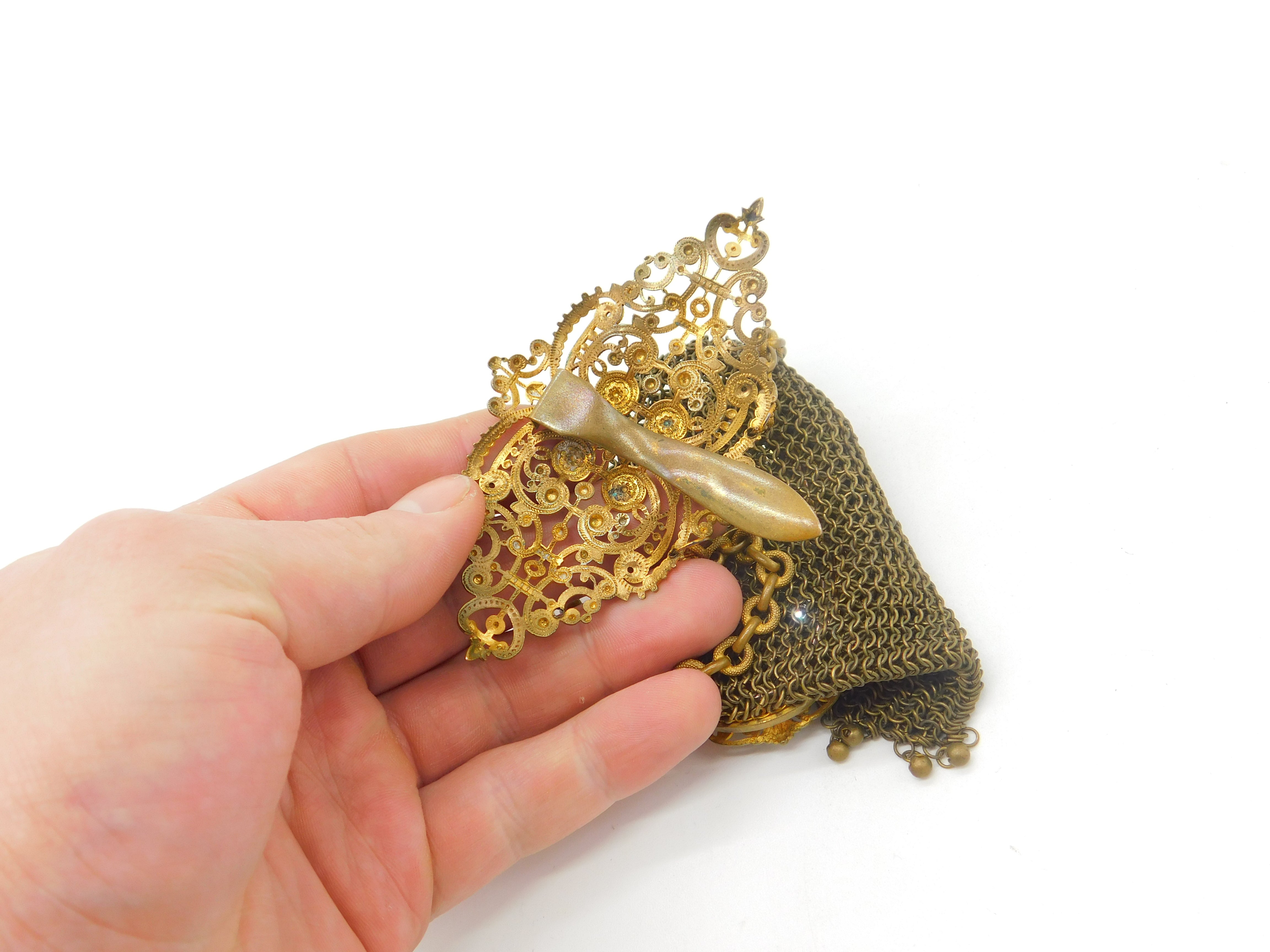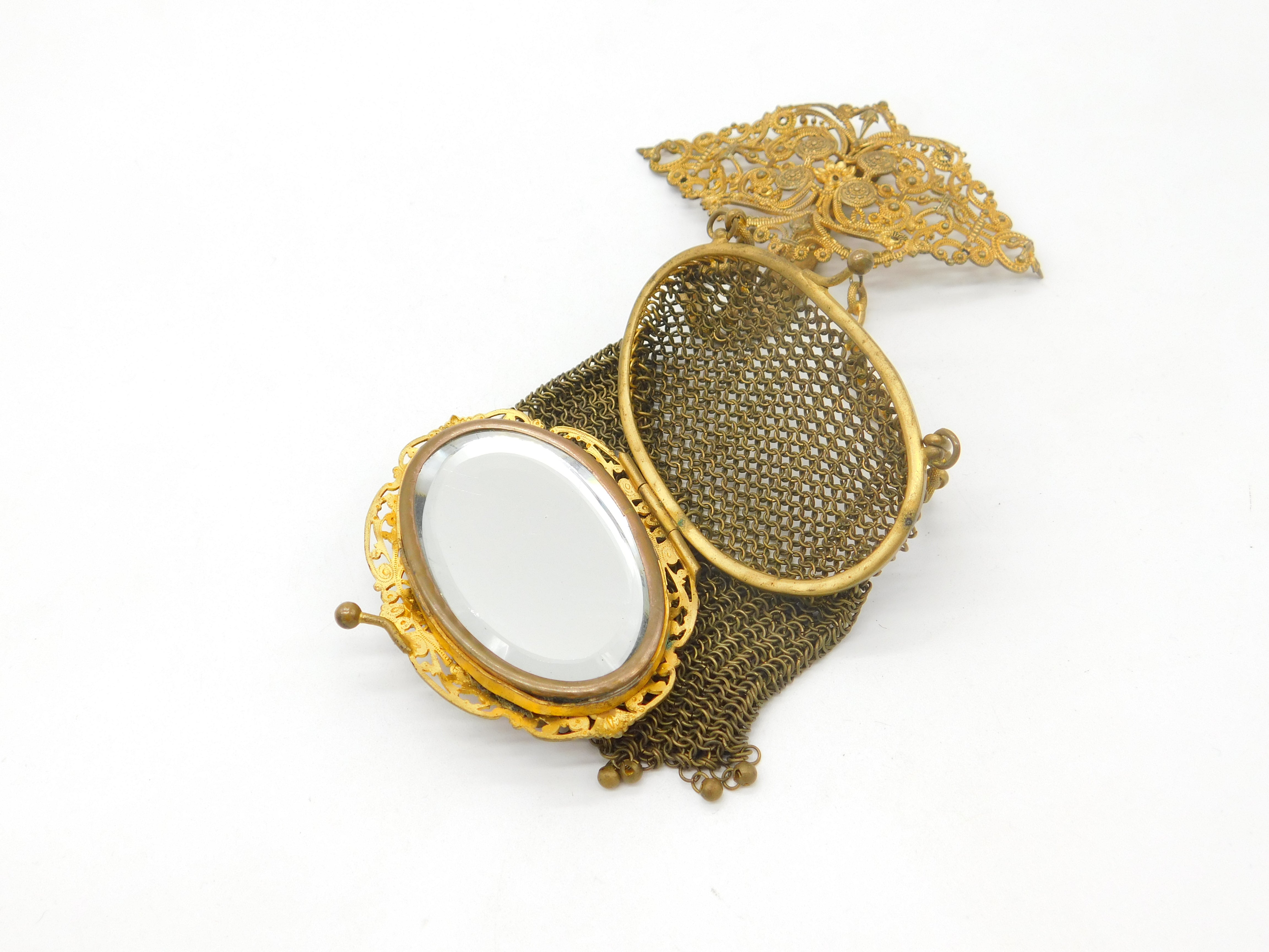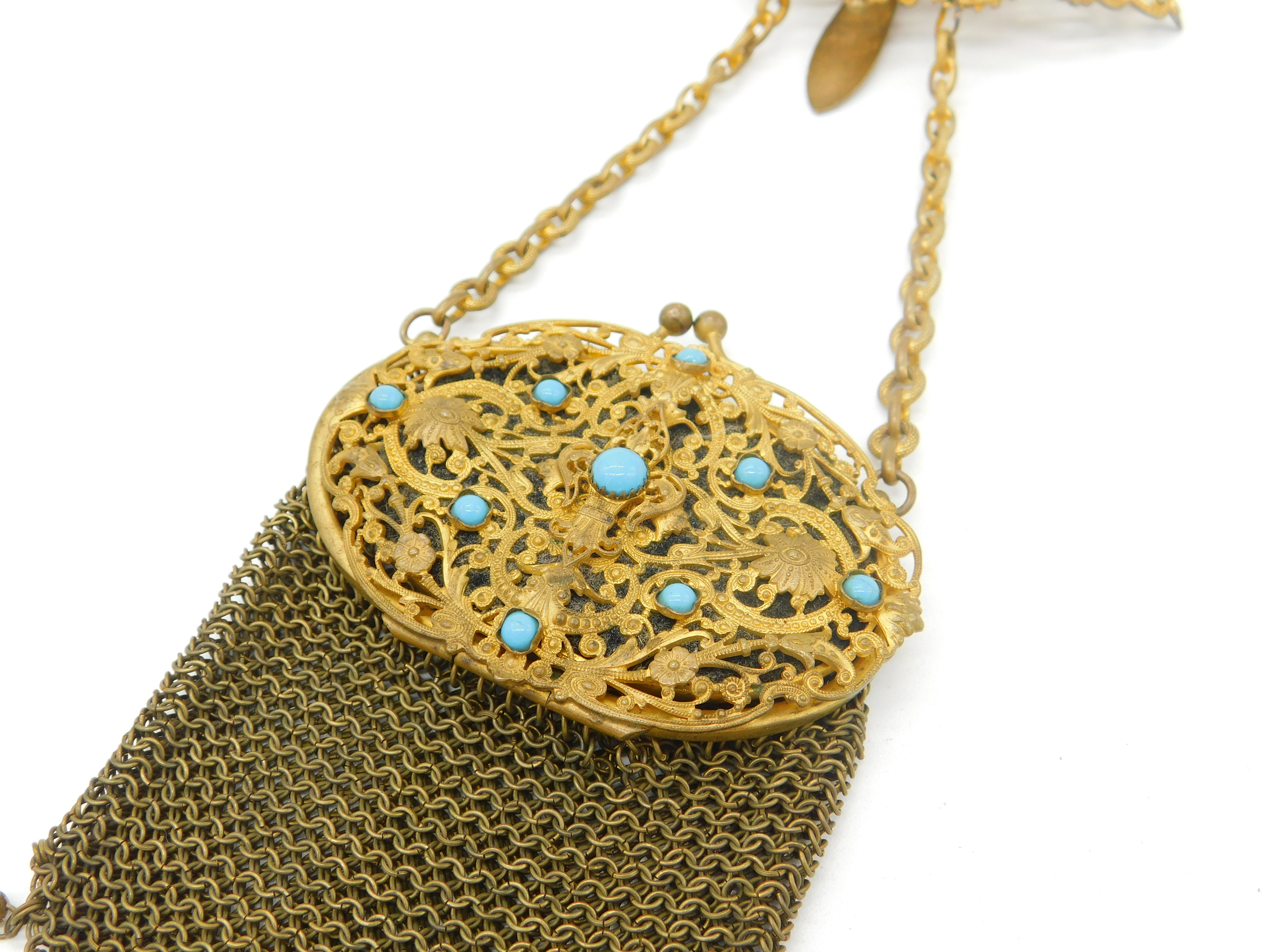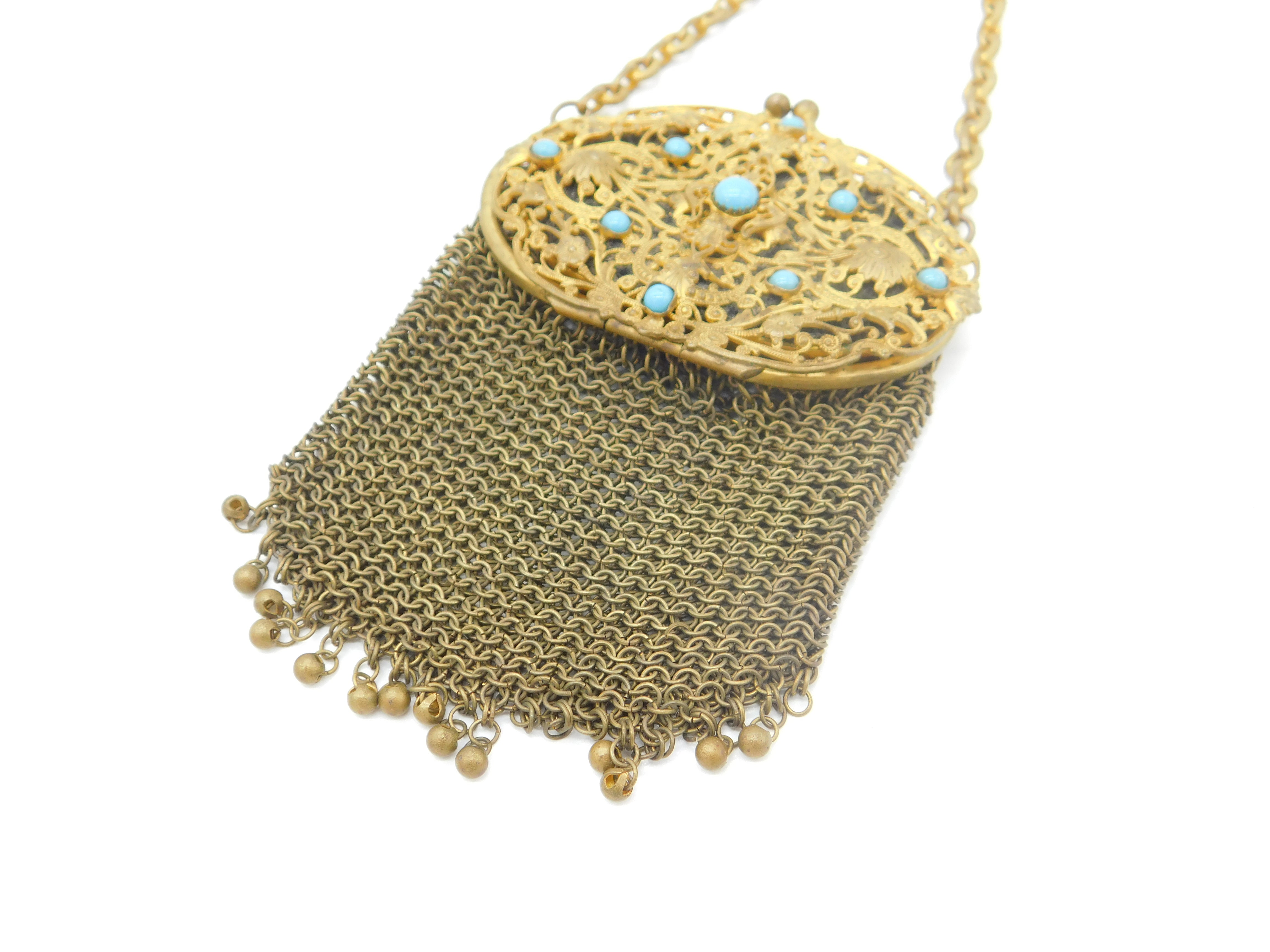 Details: A fantastic and wonderfully designed antique Victorian gilt metal French ladies vanity purse with super art nouveau floral detailing set with cabochon turquoise c1860. The chain mail purse even features a mirror to the interior. This is a wonderful item that would make a perfect gift or addition to any collection. The BOX pictured is for PRESENTATION ONLY and is NOT included in the listings but used to frame the pictures unless specifically stated otherwise.