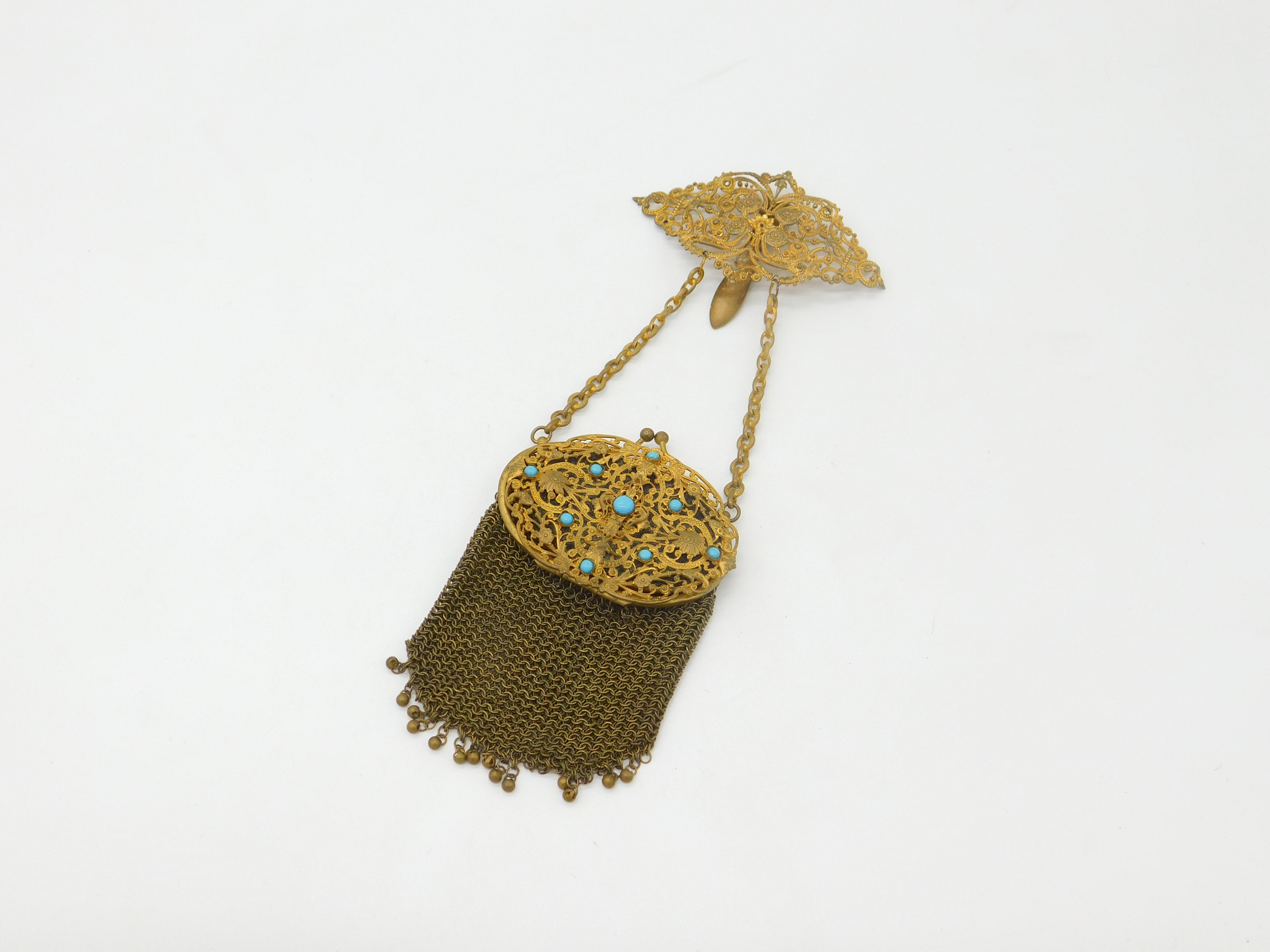 Victorian French Gilt Metal & Cabochon Turquoise Ladies Vanity Purse c1860