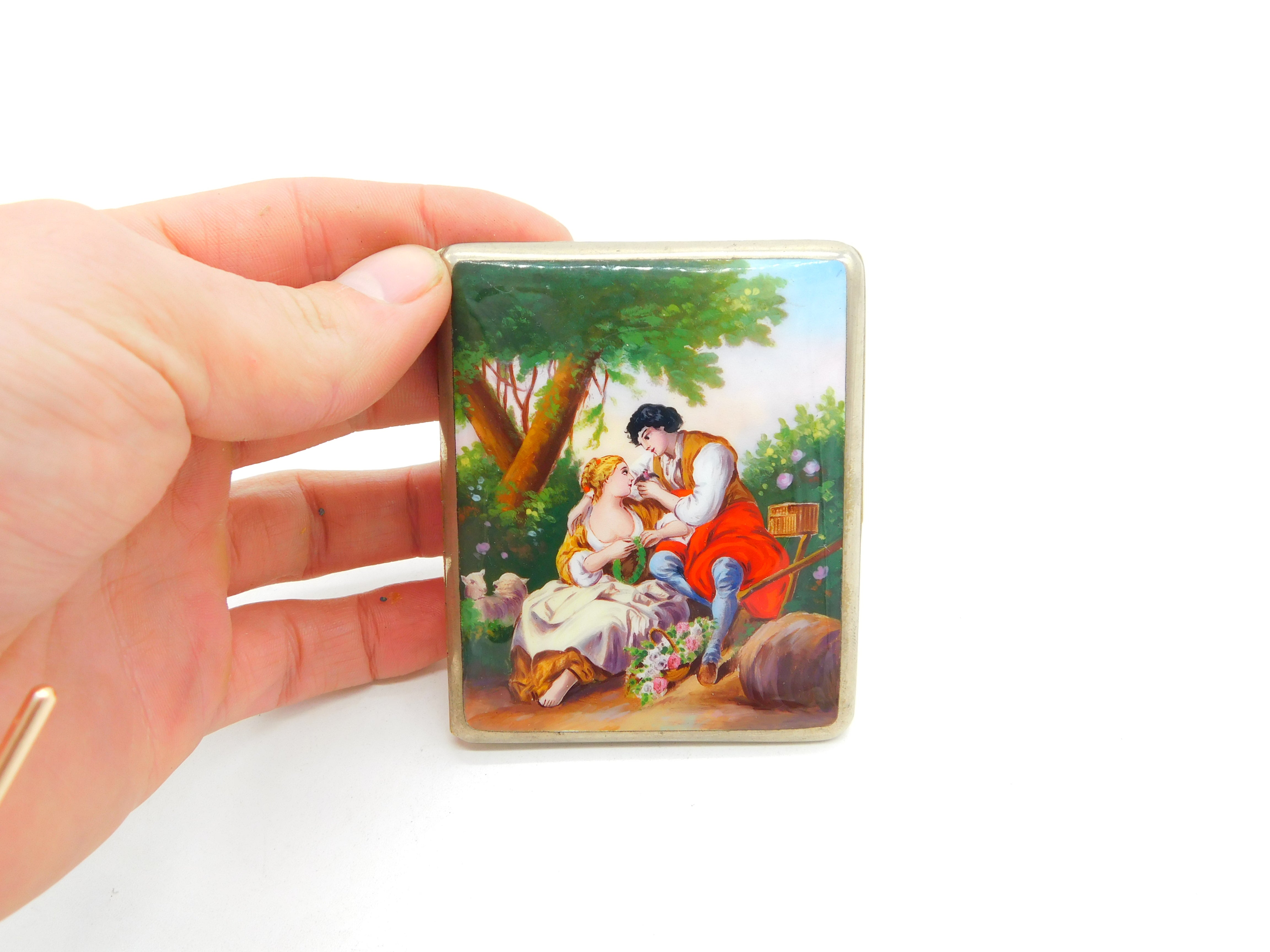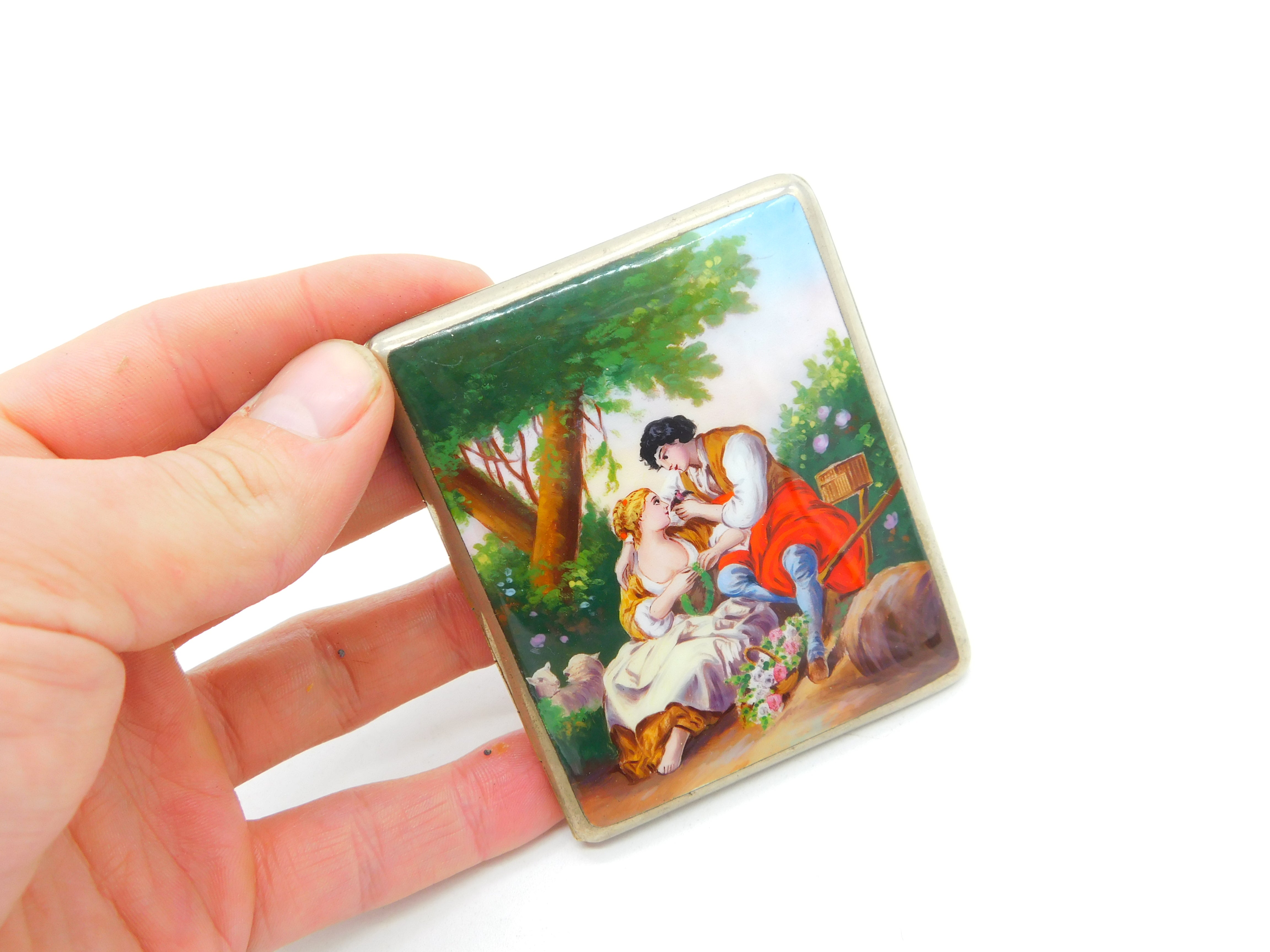 Victorian Gold Cased Enamel Romantic Regency Scene Cigarette Case Antique