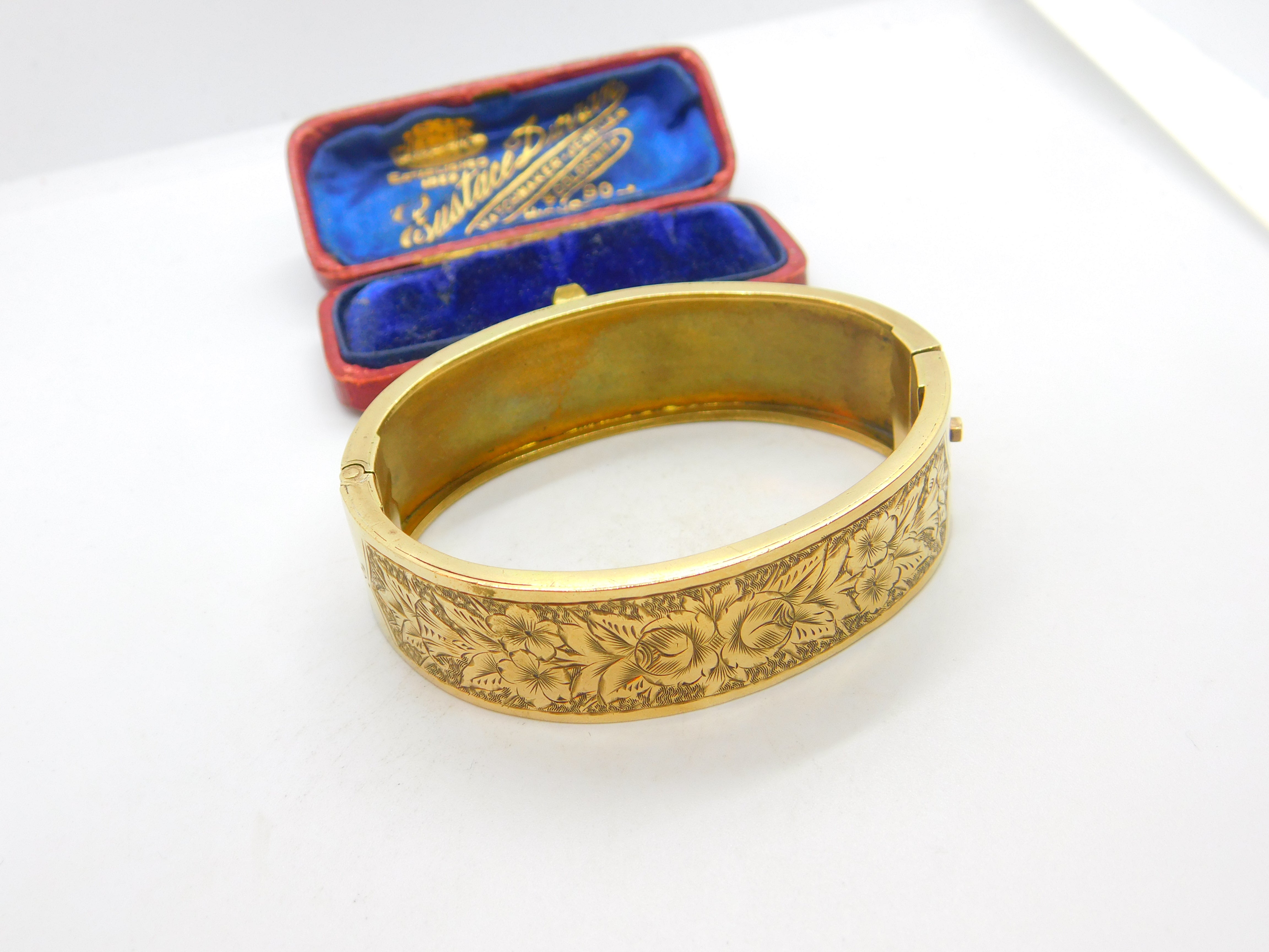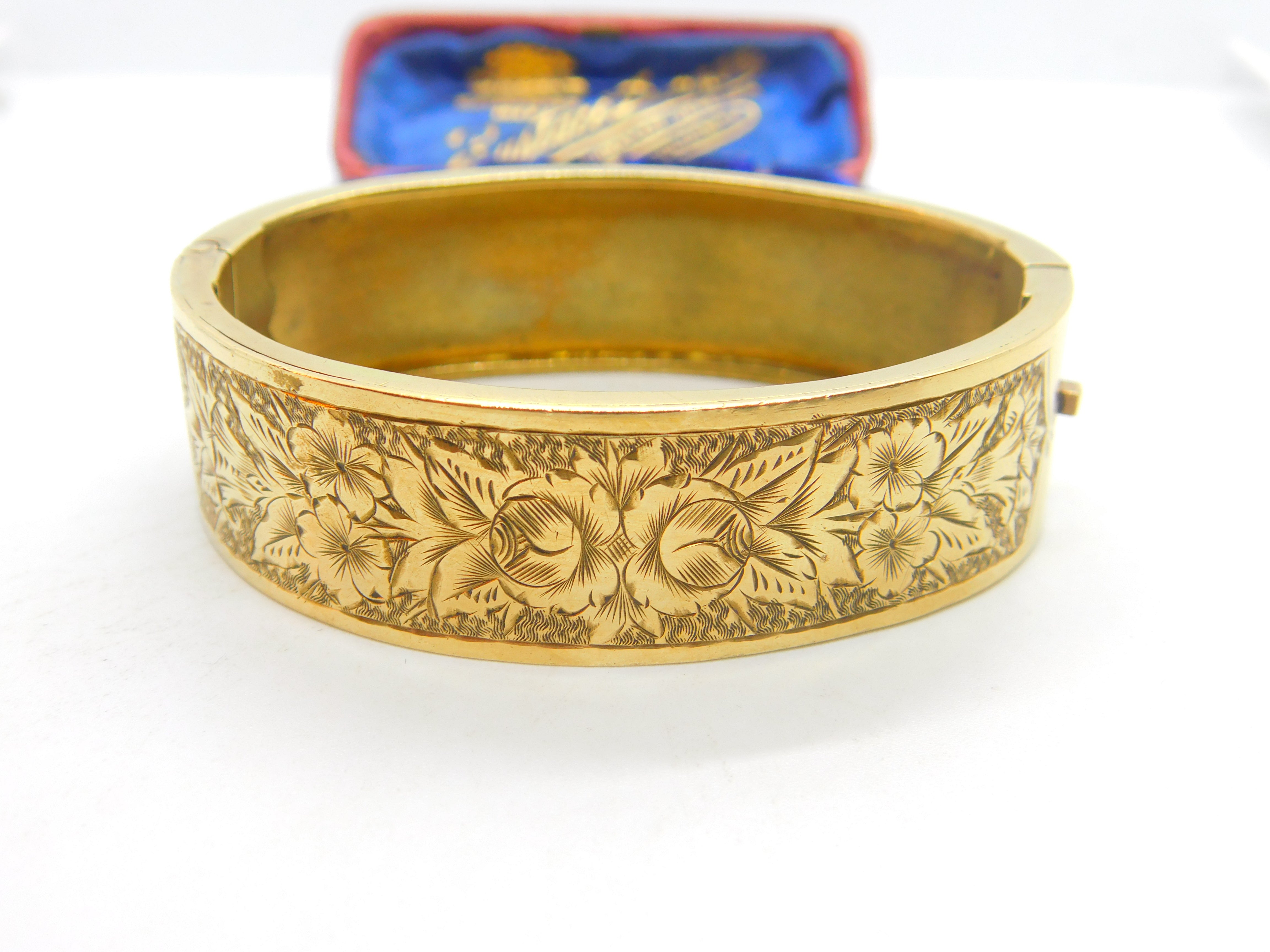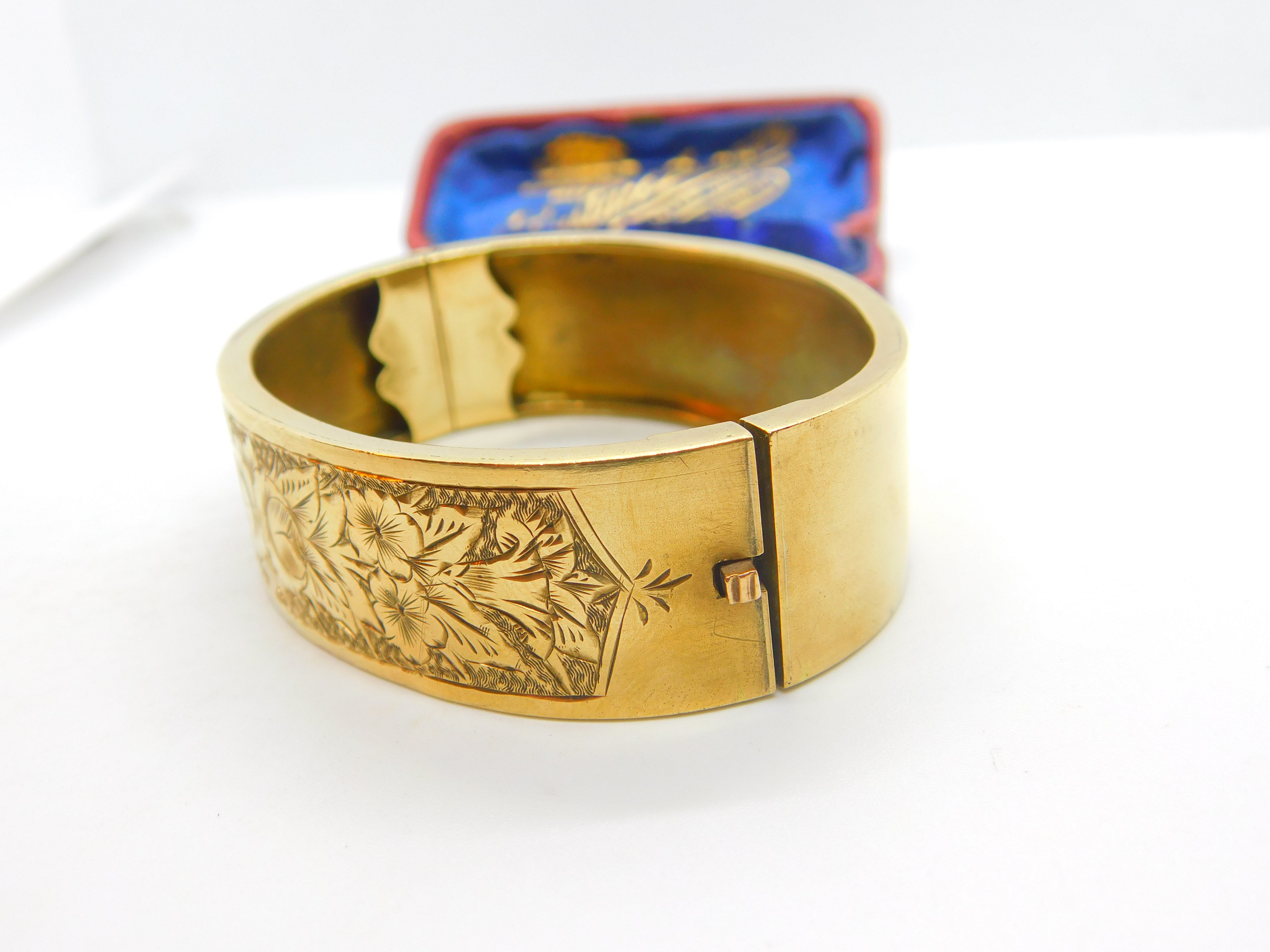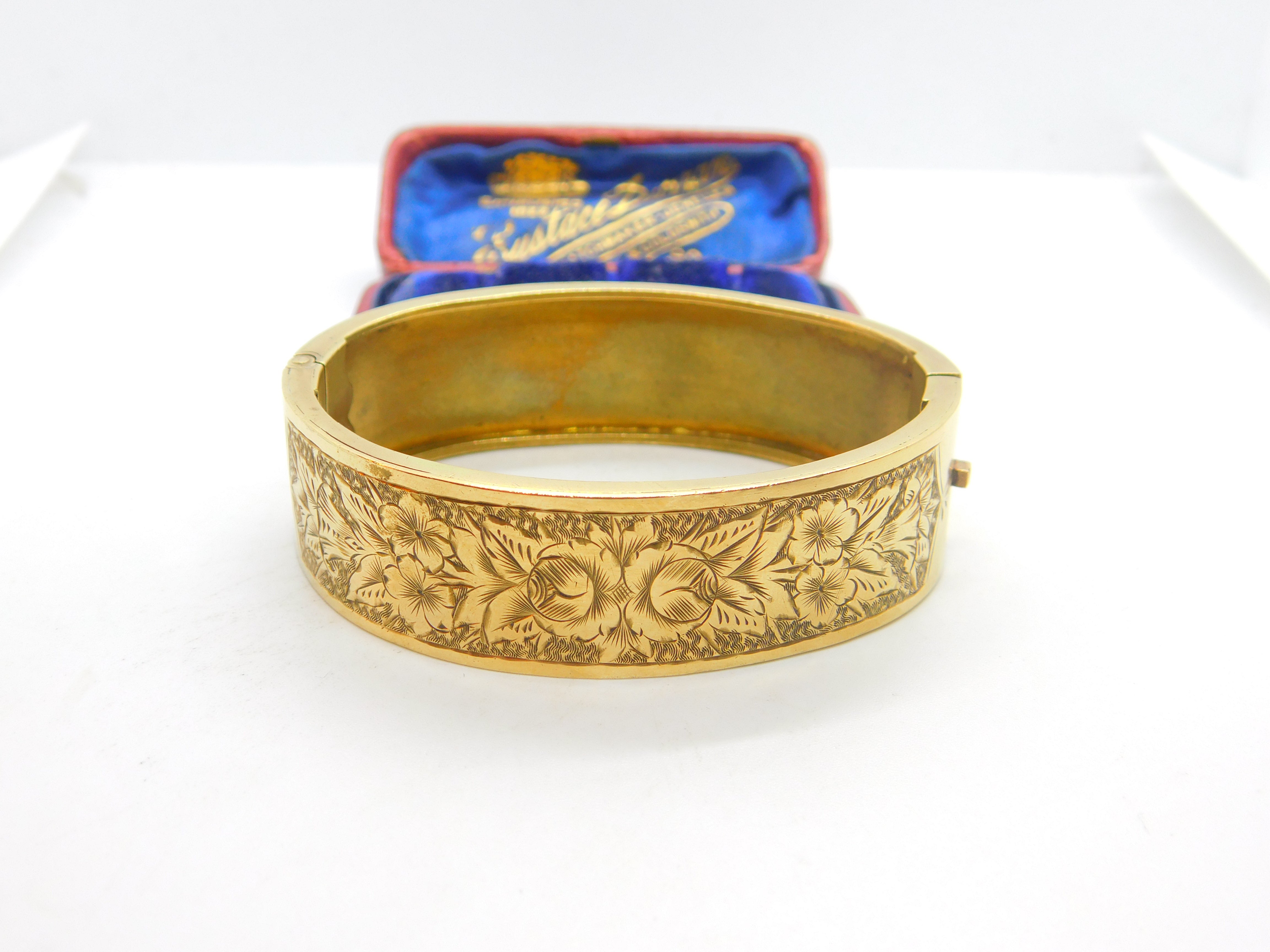 Details: A fantastic and wonderfully designed antique Victorian aesthetic movement gold plated floral bangle bracelet with lovely detail c1880. This is a wonderful item that would make a perfect gift or addition to any collection. The BOX pictured is for PRESENTATION ONLY and is NOT included in the listings but used to frame the pictures unless specifically stated otherwise.