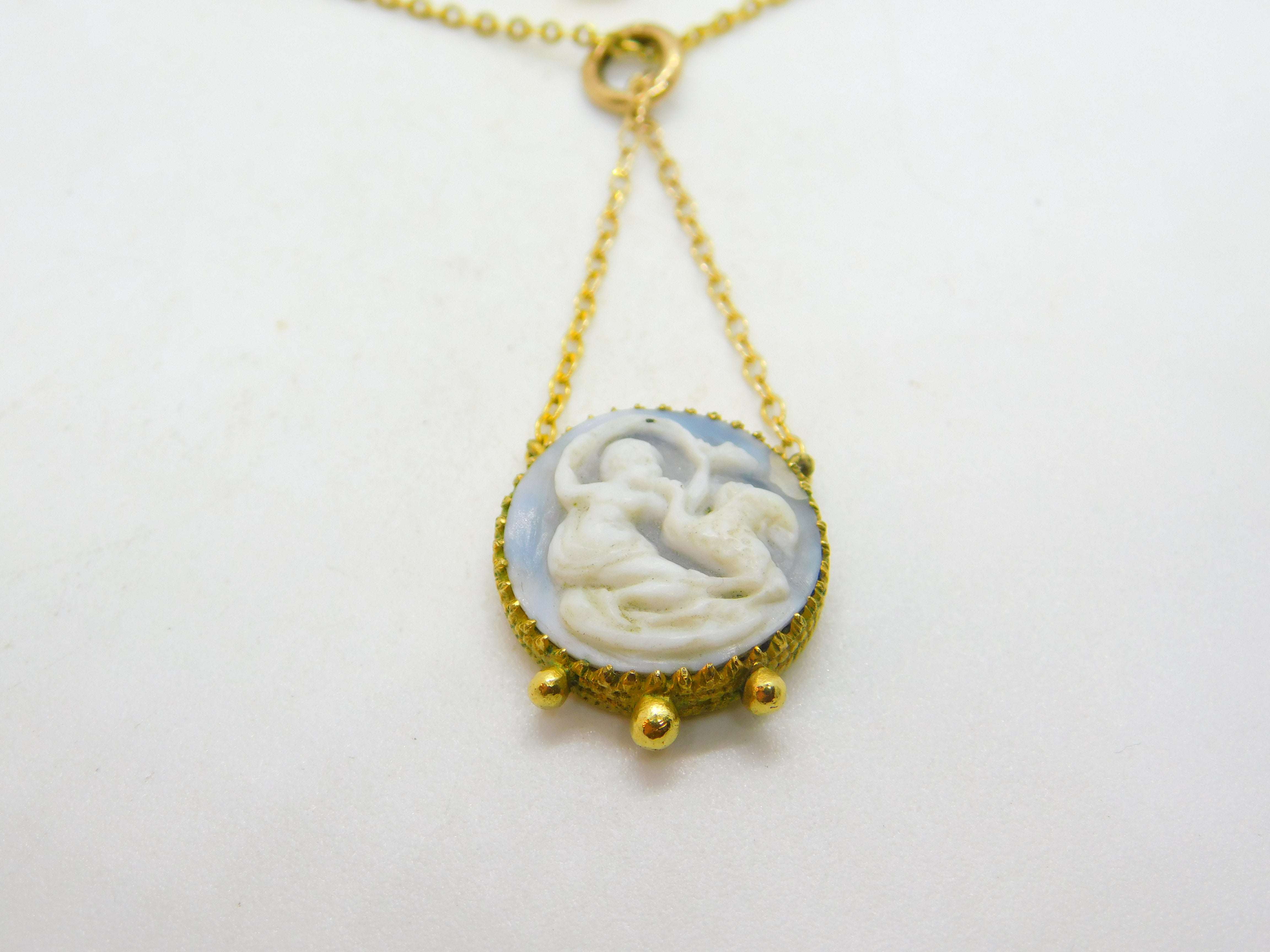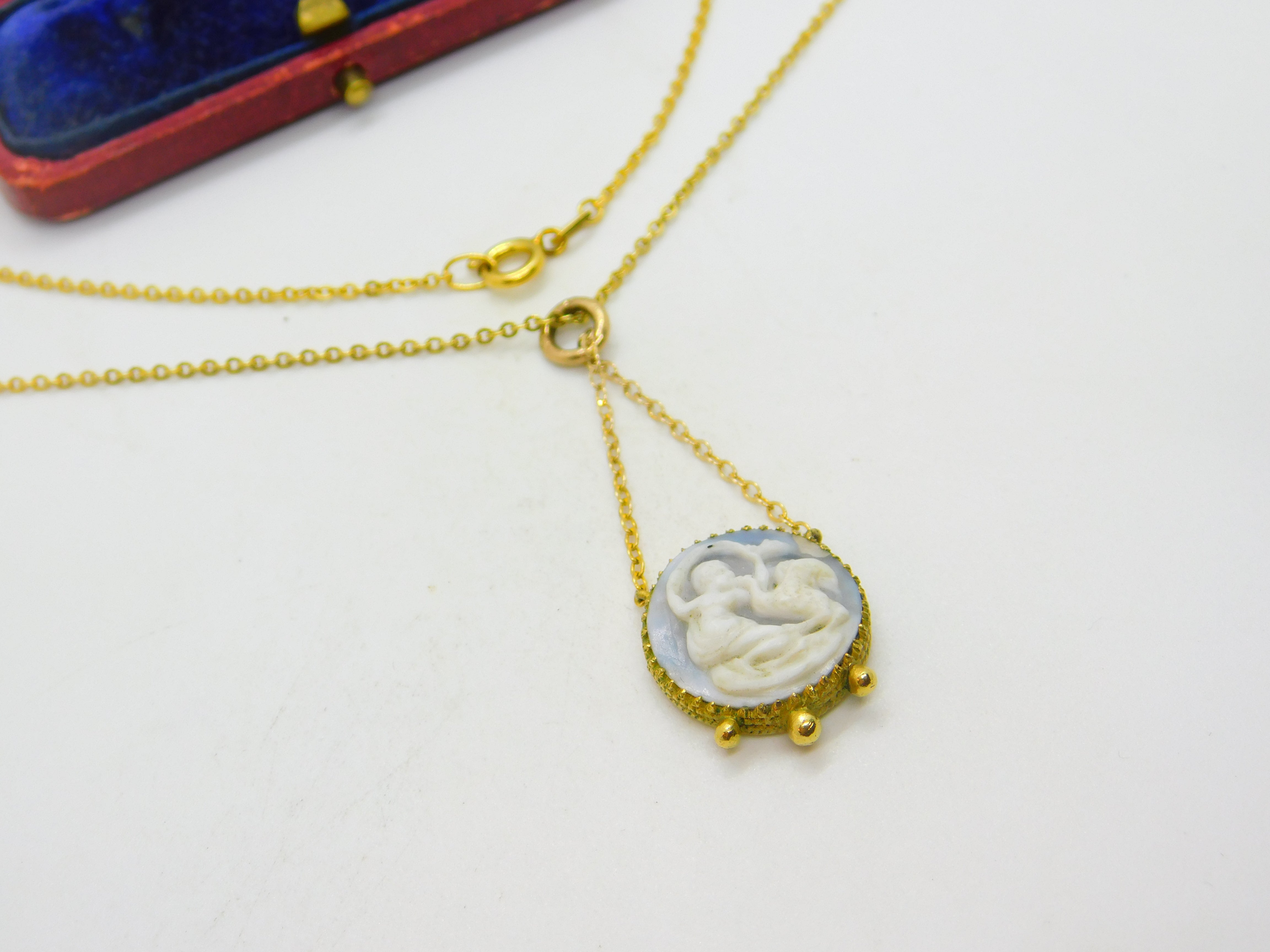 Details: A fantastic and wonderfully designed antique Victorian gold plated carved classical cameo pendant necklace with superb detailing c1850. The chain is slightly more modern but also gold plated. This is a wonderful item that would make a perfect gift or addition to any collection. The BOX pictured is for PRESENTATION ONLY and is NOT included in the listings but used to frame the pictures unless specifically stated otherwise.
