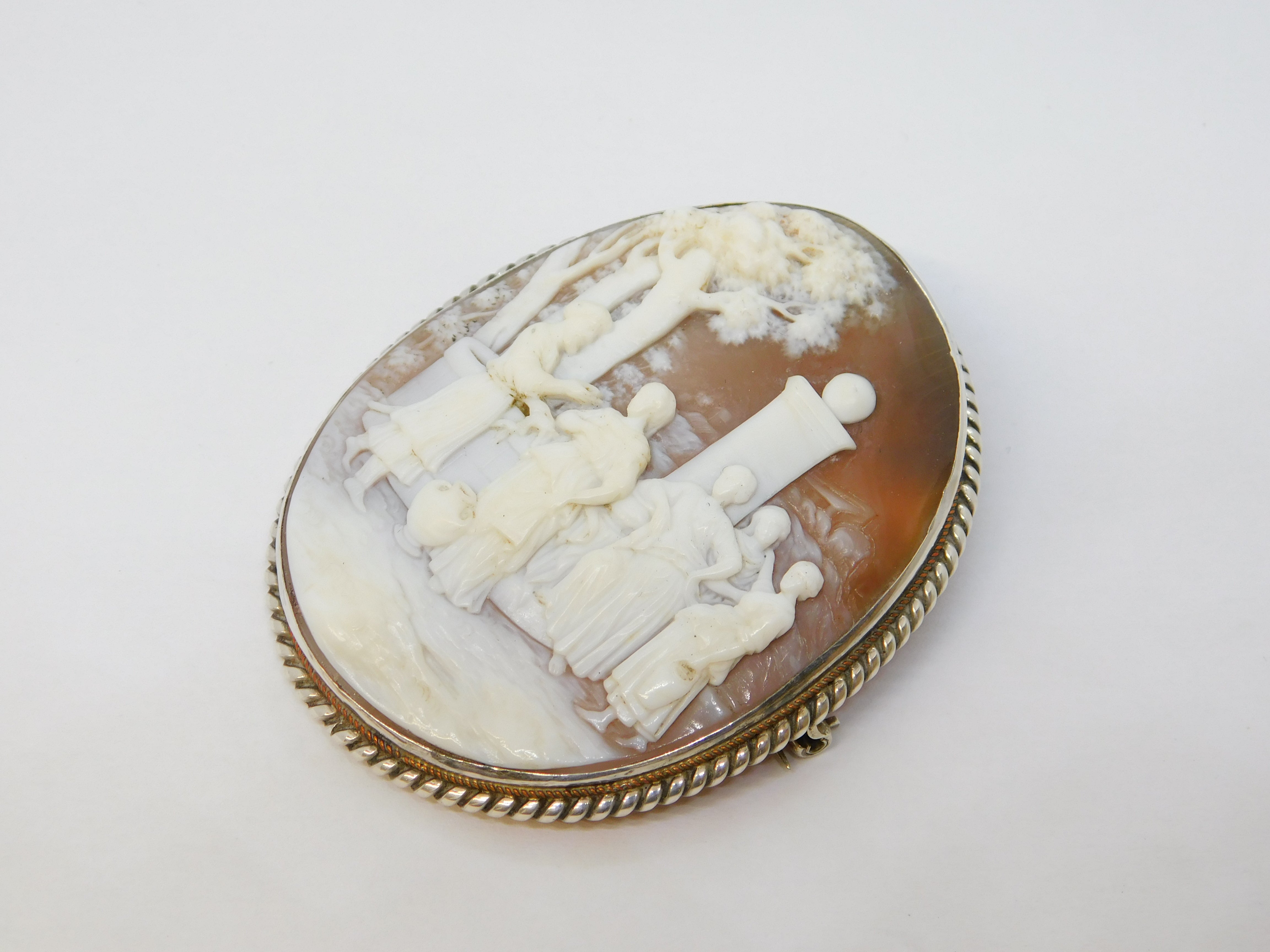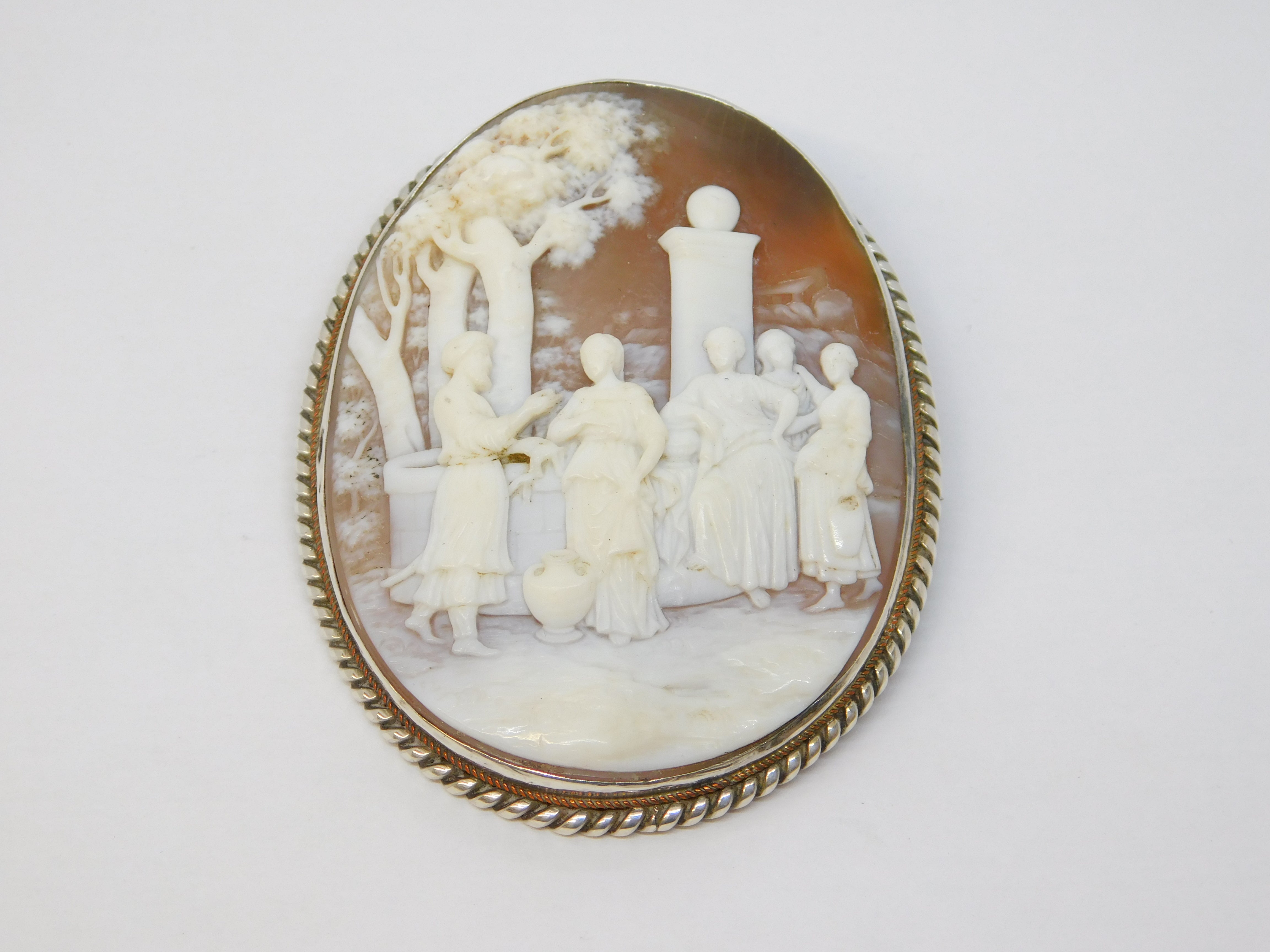 Details: A fantastic and wonderfully designed antique mid-Victorian large sterling silver mounted brooch pin with a superb carved shell cameo depicting a classical Epicurean scene with male figure in conversation with four female friends c1860, the silver has been XRF tested. This is a wonderful item that would make a perfect gift or addition to any collection. The BOX pictured is for PRESENTATION ONLY and is NOT included in the listings but used to frame the pictures unless specifically stated otherwise.