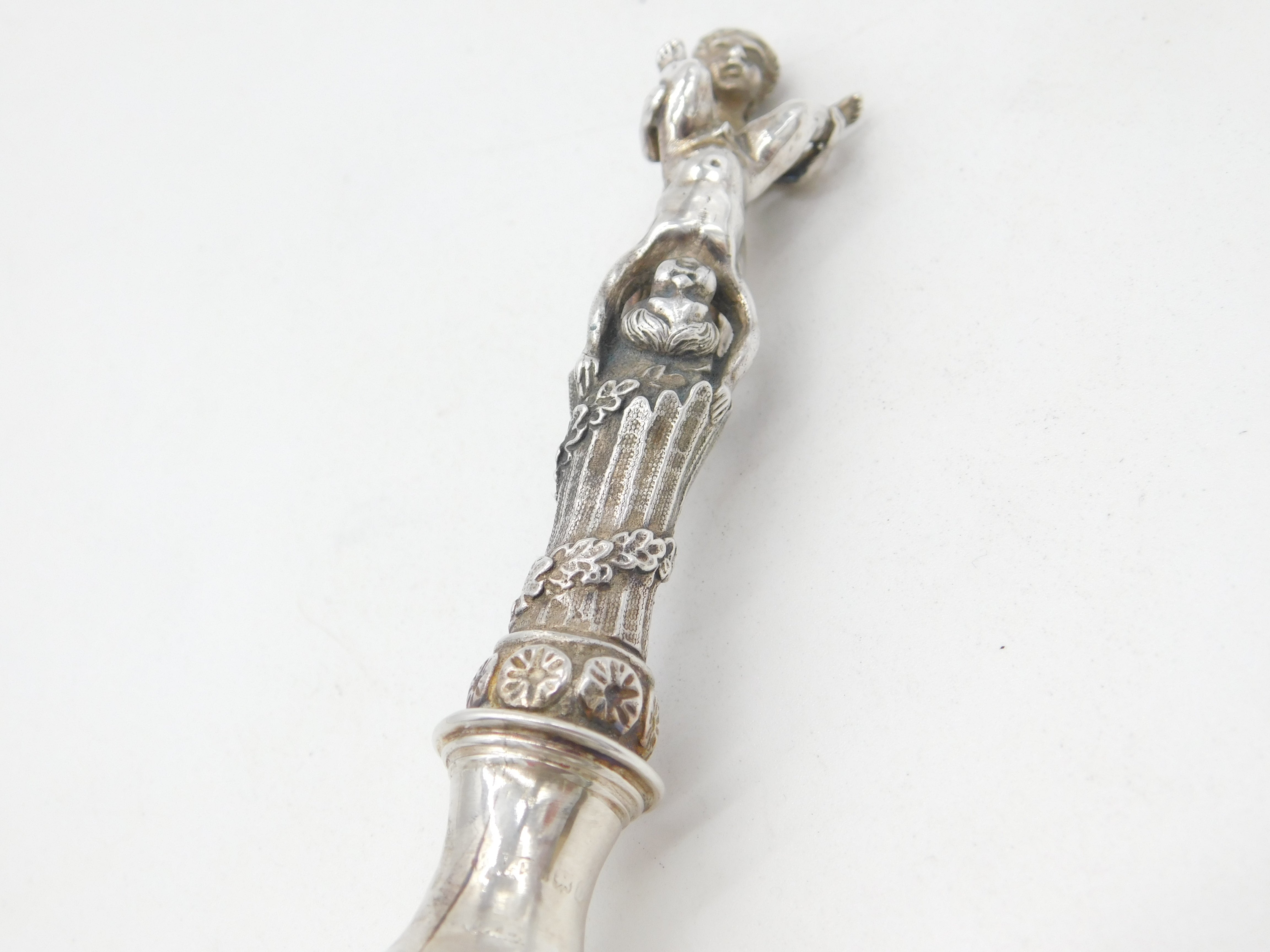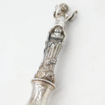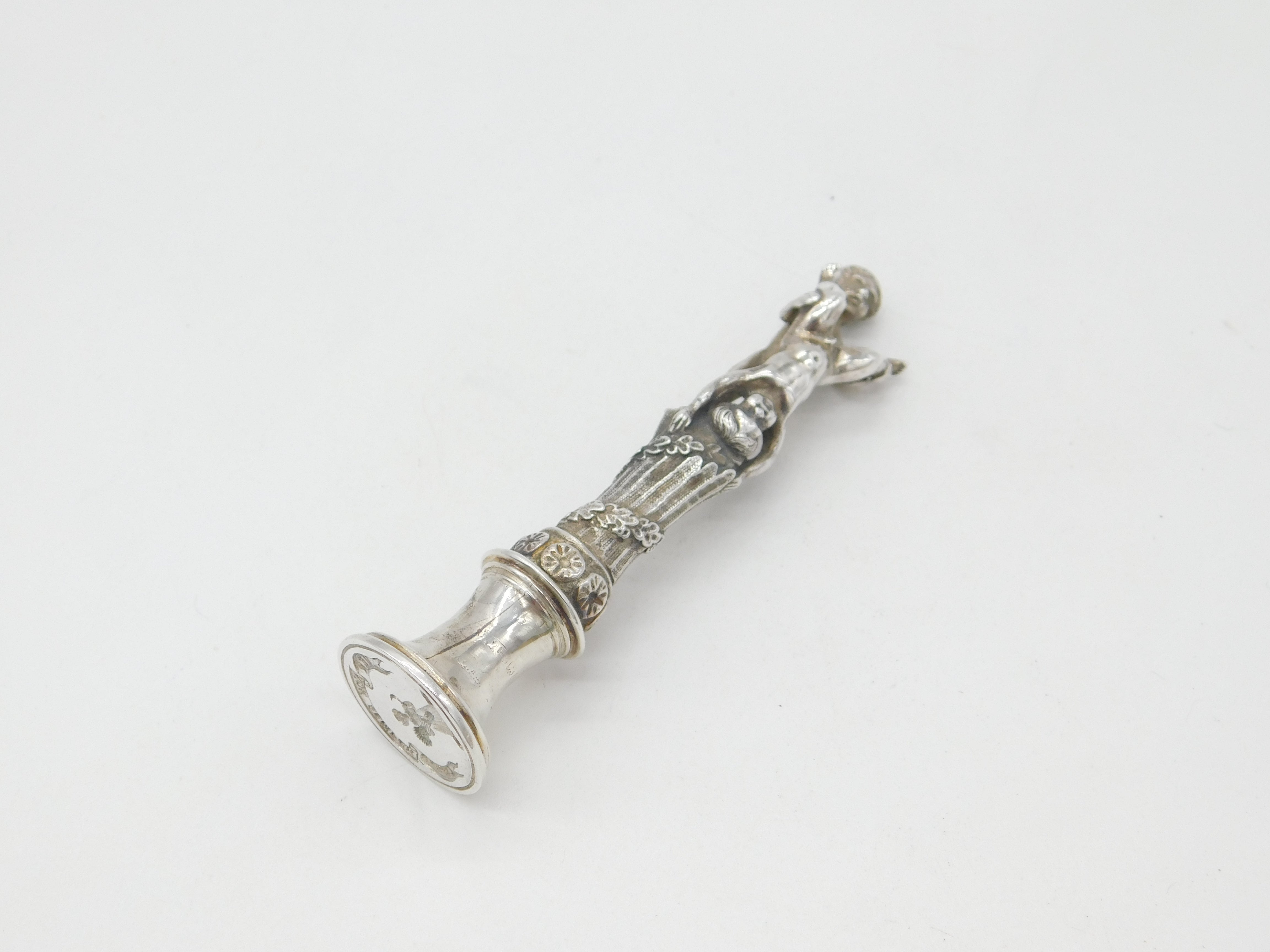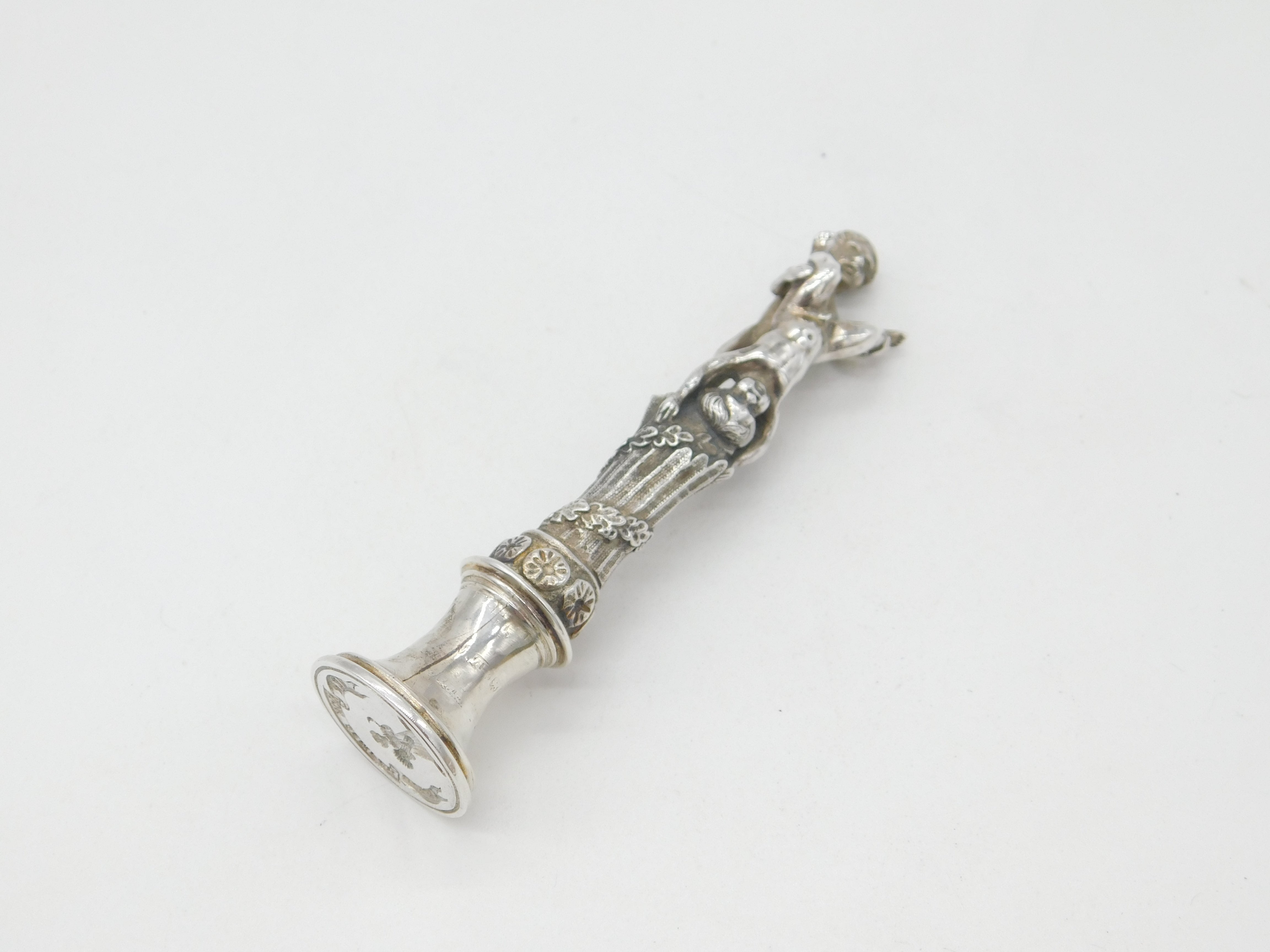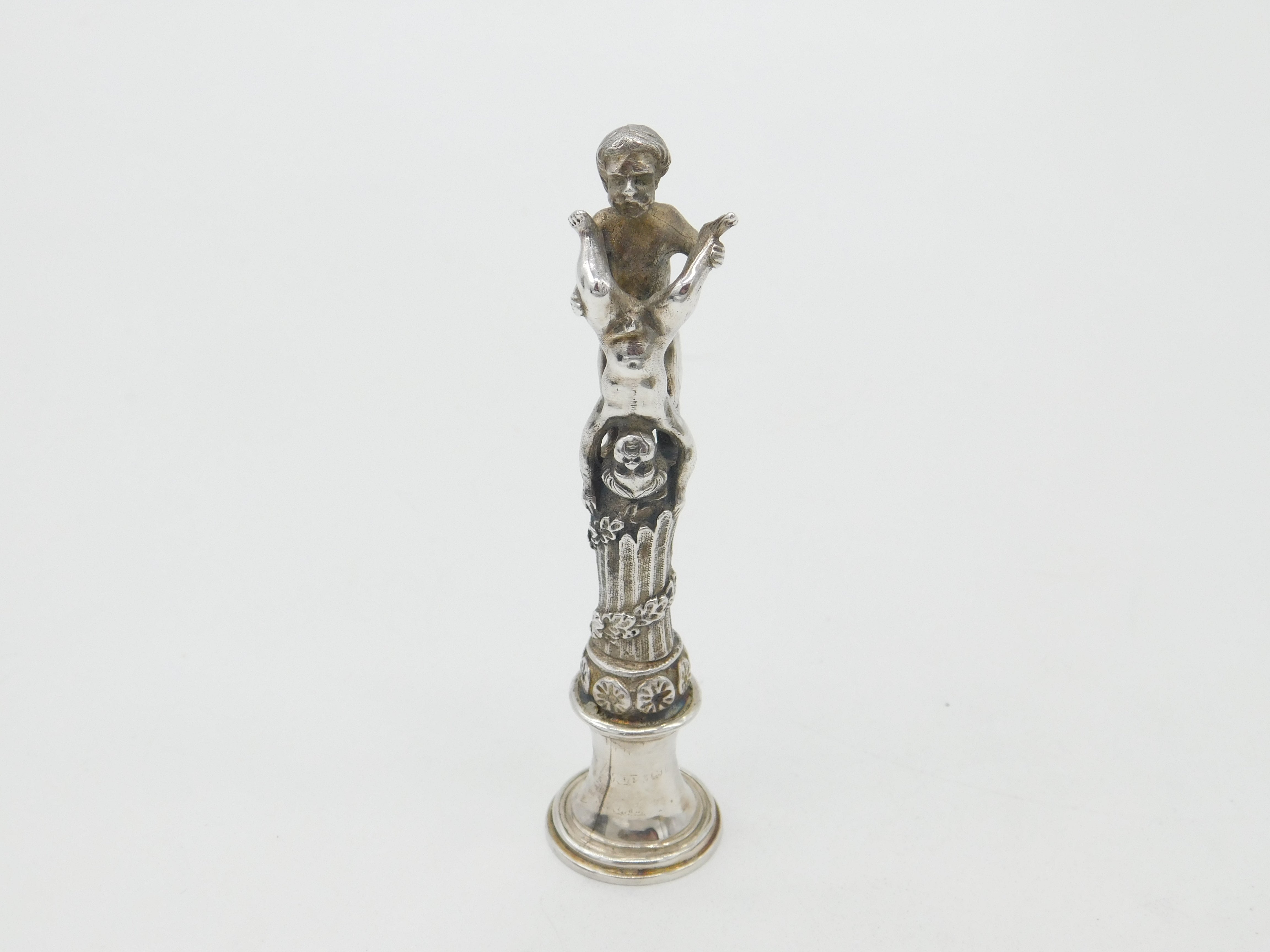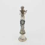 Details: A fantastic and wonderfully designed antique Victorian large sterling silver desk seal with superb detail showing naked classical figures upside down holding one another with vines and flowers. The item is hallmarked faintly Birmingham 1894 around the bottom edge and bears a stunning crest to the base - the words in Latin "Ver Non Semper Viret" believed to be the Vernon wax seal translating as Vernon with forever flourish. A simply superb seal. This is a wonderful item that would make a perfect gift or addition to any collection. The BOX pictured is for PRESENTATION ONLY and is NOT included in the listings but used to frame the pictures unless specifically stated otherwise.