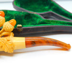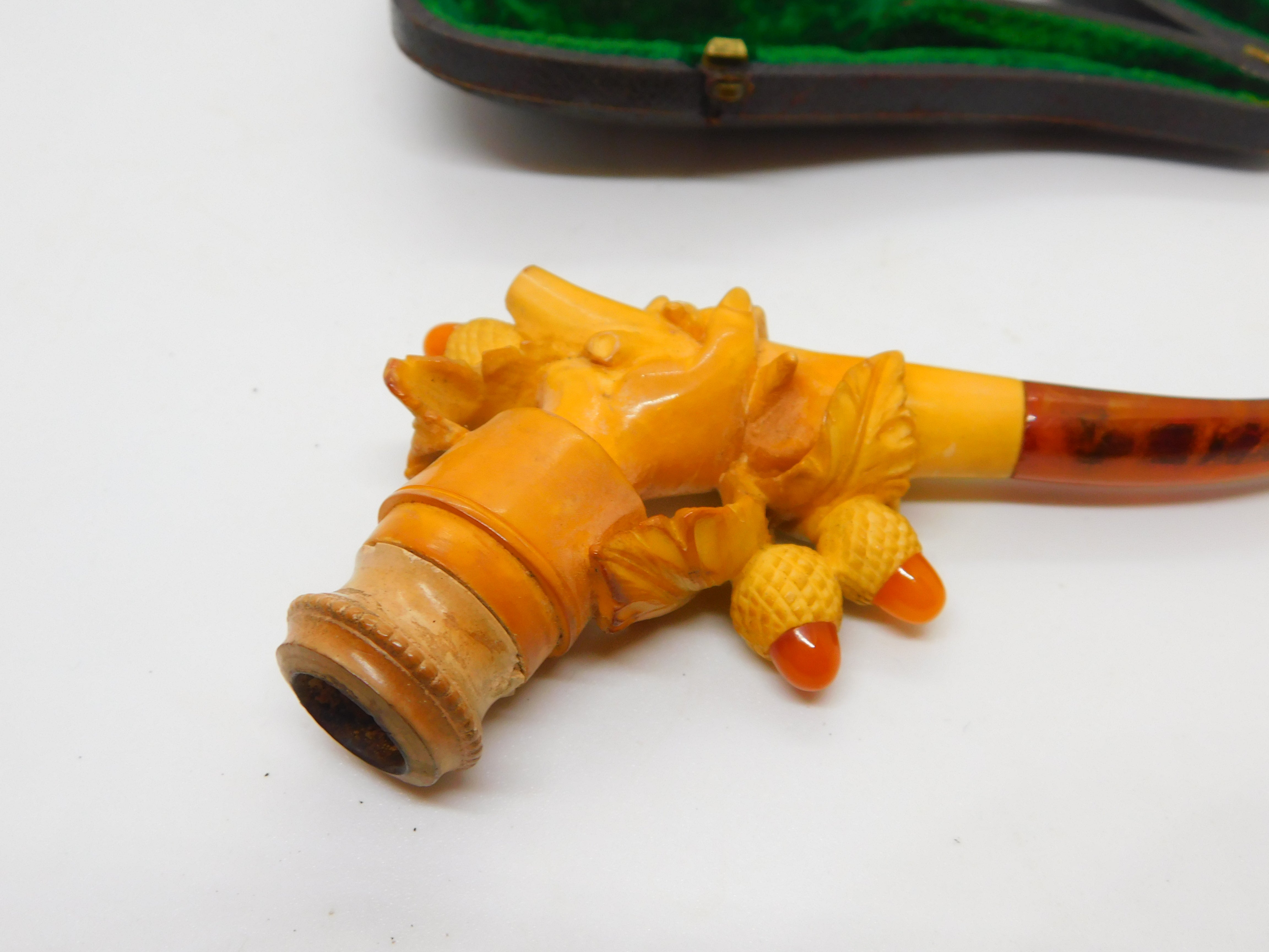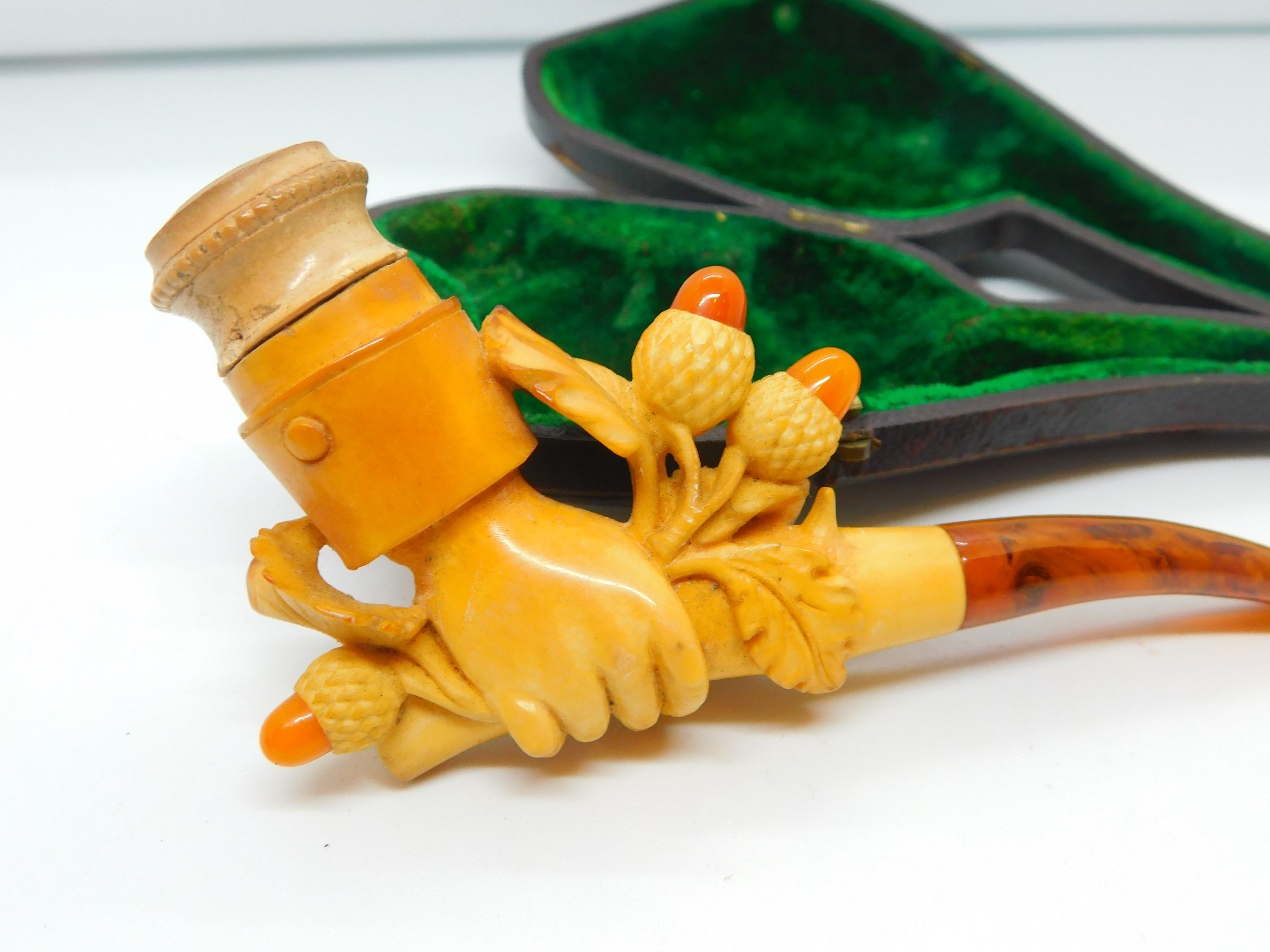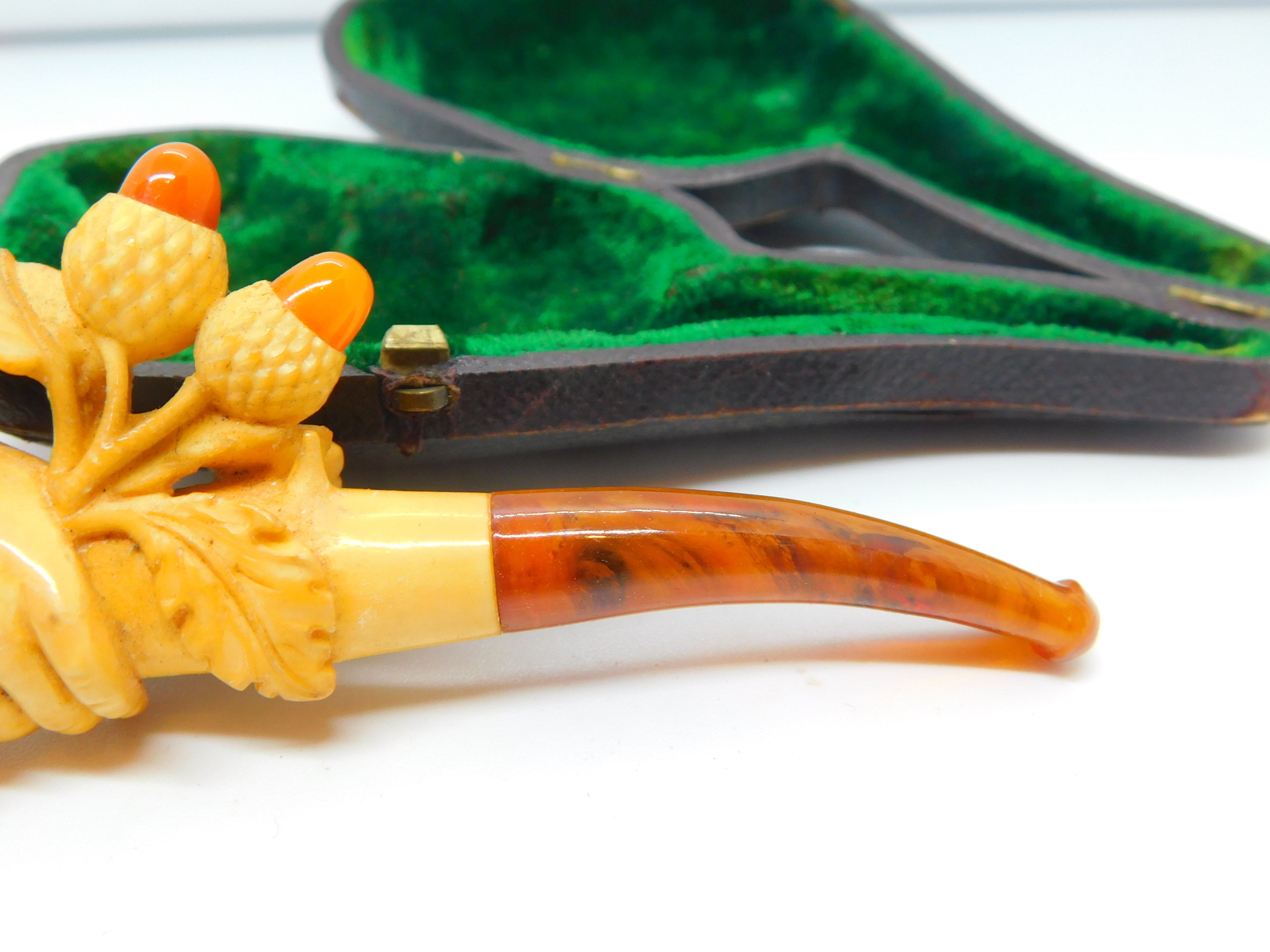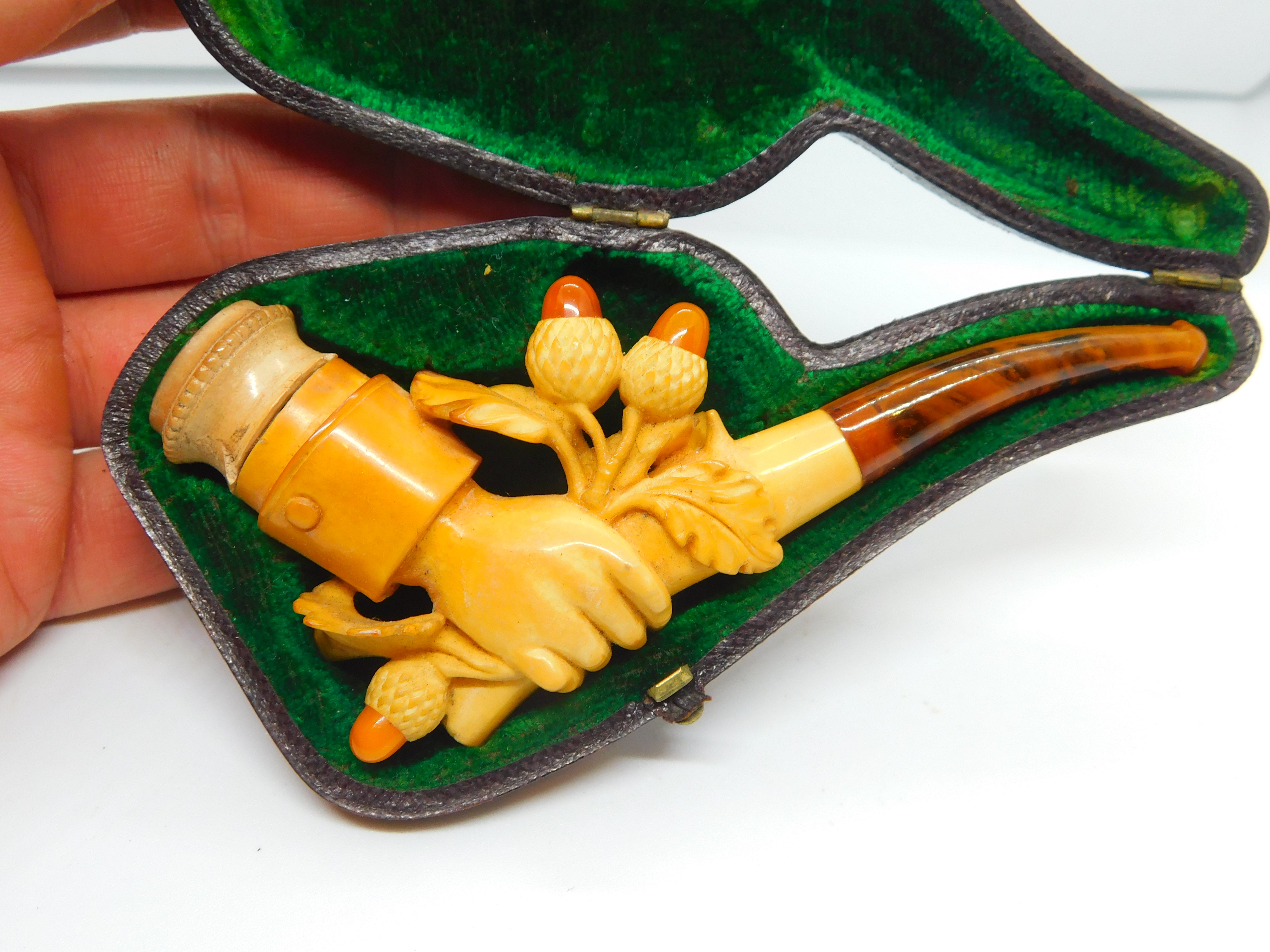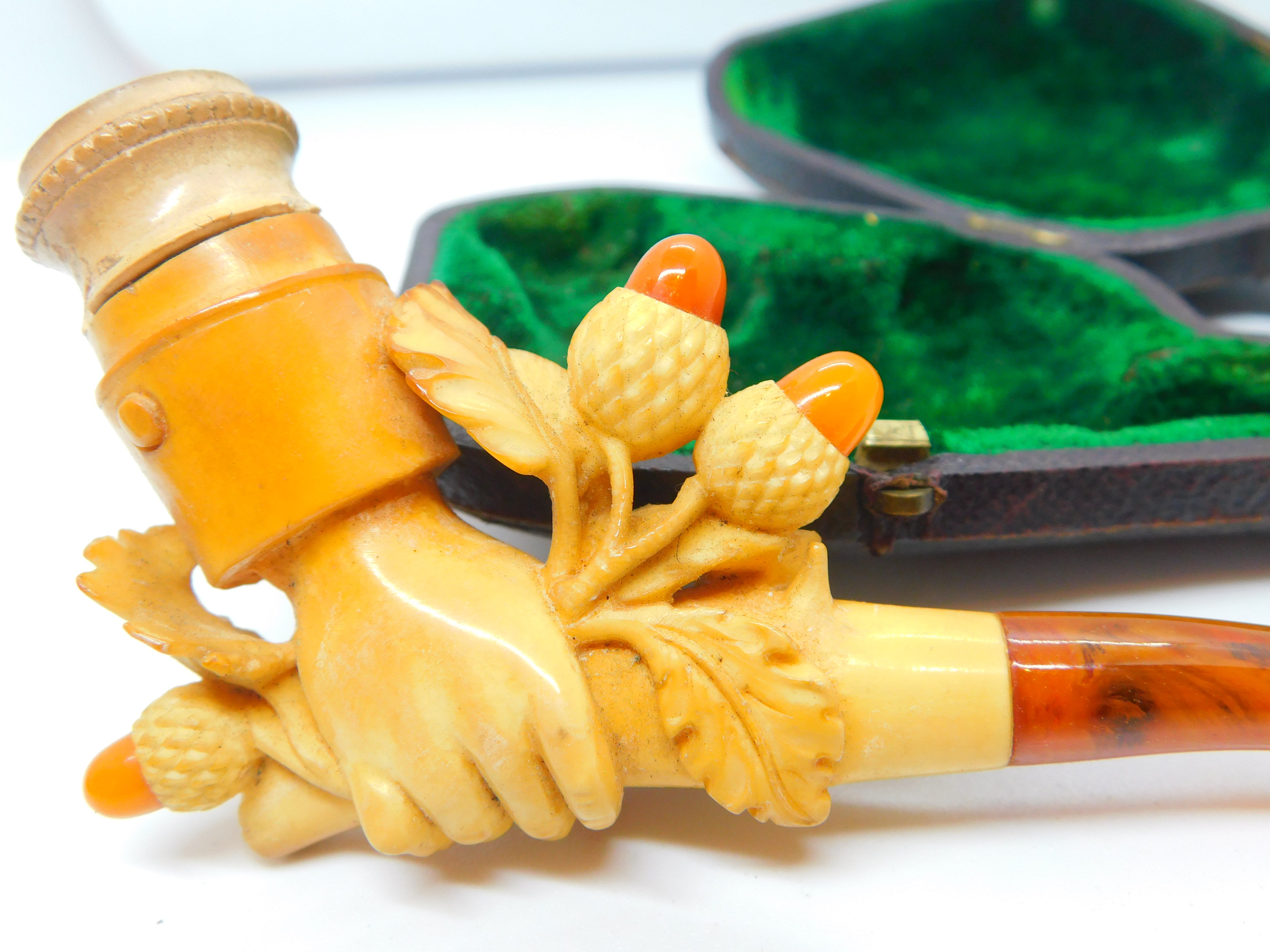 Details: A fantastic and wonderfully designed antique Victorian boxed meerschaum & block amber novelty smoking pipe in the from of a hand holding a bunch of lucky acorns c1860. Small chip to the meerschaum. This is a wonderful item that would make a perfect gift or addition to any collection.