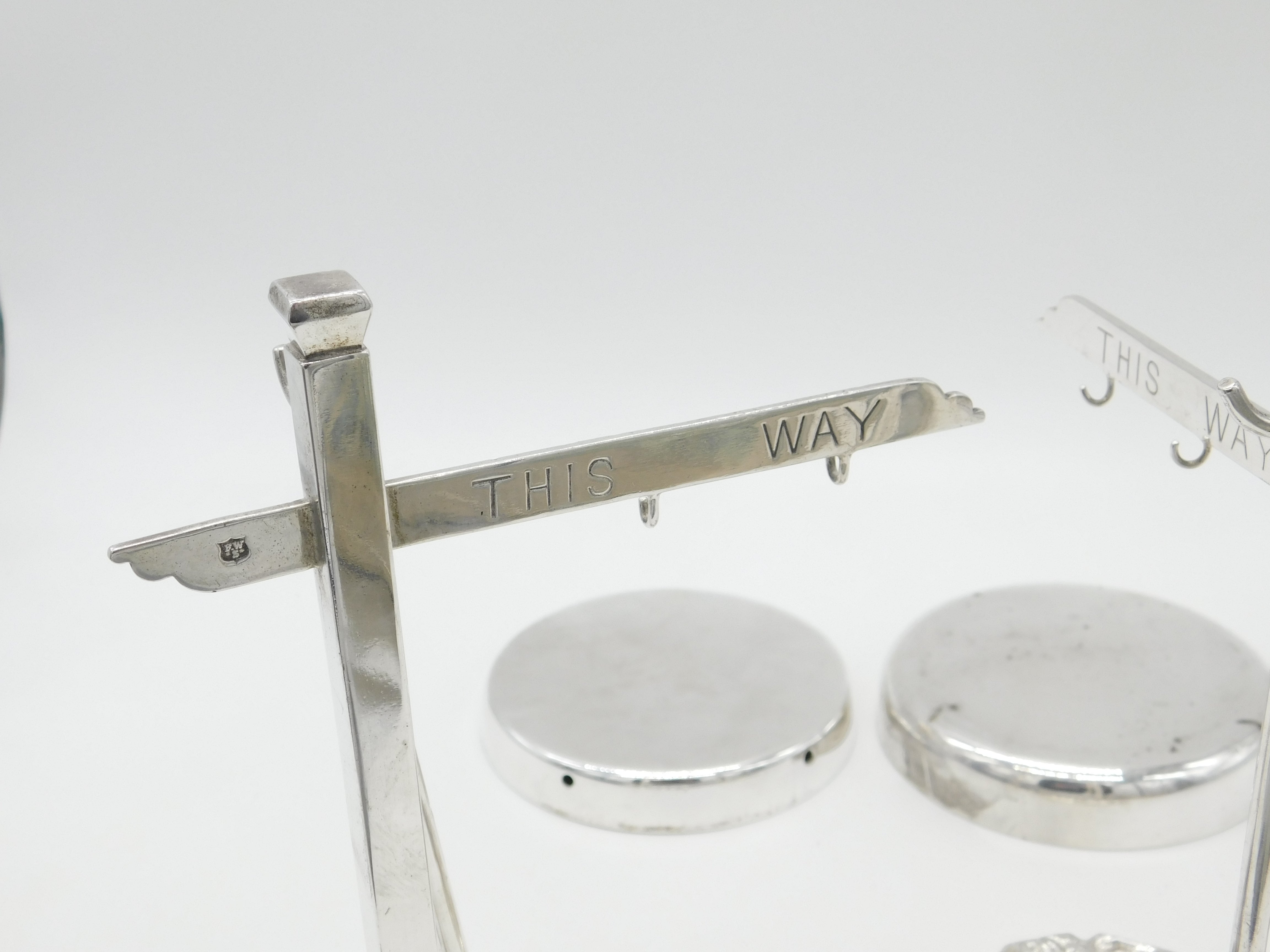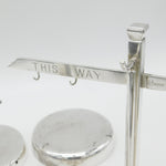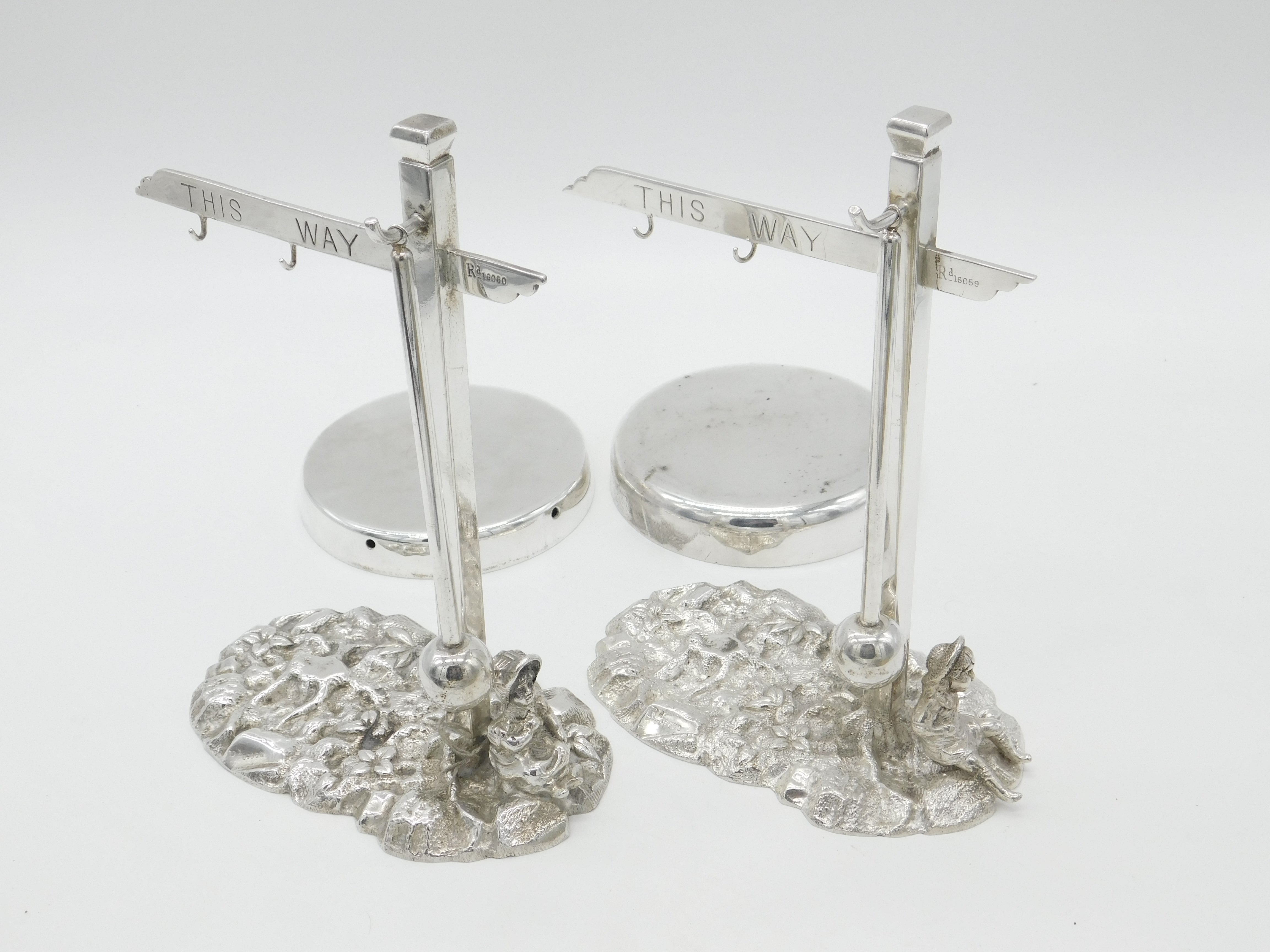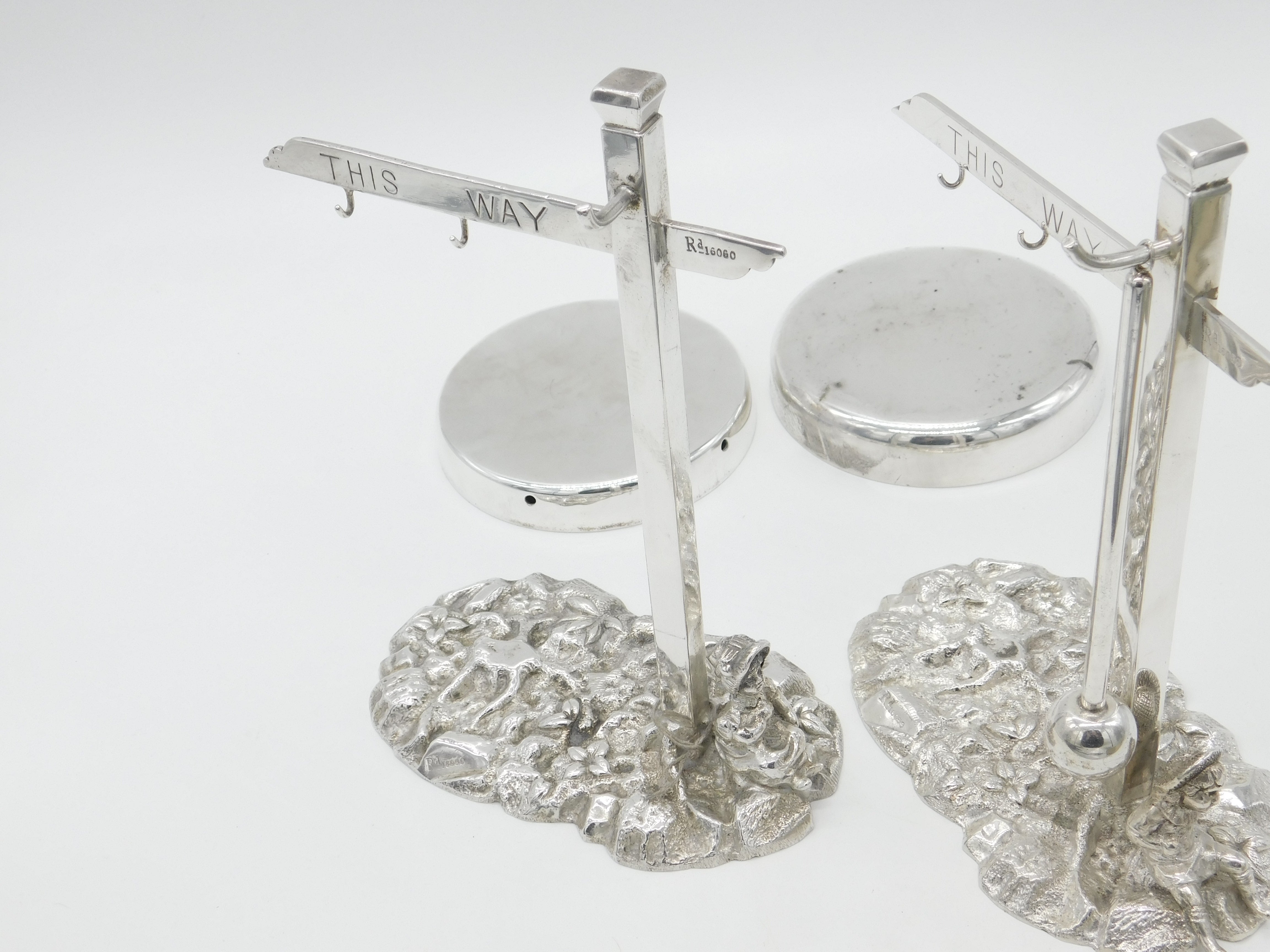 Details: A fantastic and wonderfully designed pair of antique Victorian silver plated dinner gongs taking the form of the popular Victorian nursery rhyme about Little Bo-Peep both showing children sitting at the base of a 'This Way' signpost marked in multiple plated with patent mark in multiple places by Benetfink & Co. c1890. The gongs need a little work to be hung from the signpost as the holes are in the wrong place but generally such a unique example! This is a wonderful item that would make a perfect gift or addition to any collection. The BOX pictured is for PRESENTATION ONLY and is NOT included in the listings but used to frame the pictures unless specifically stated otherwise.
