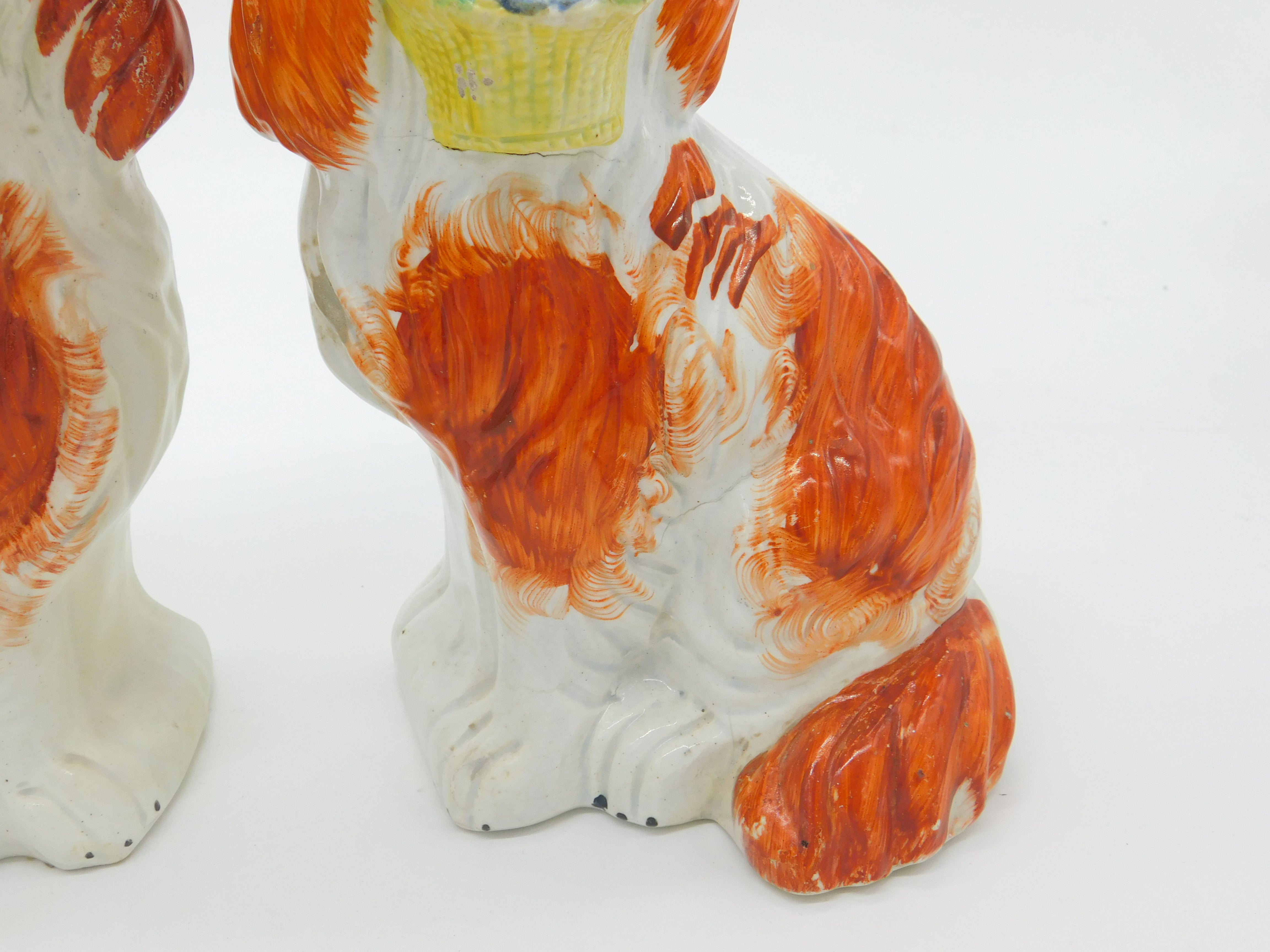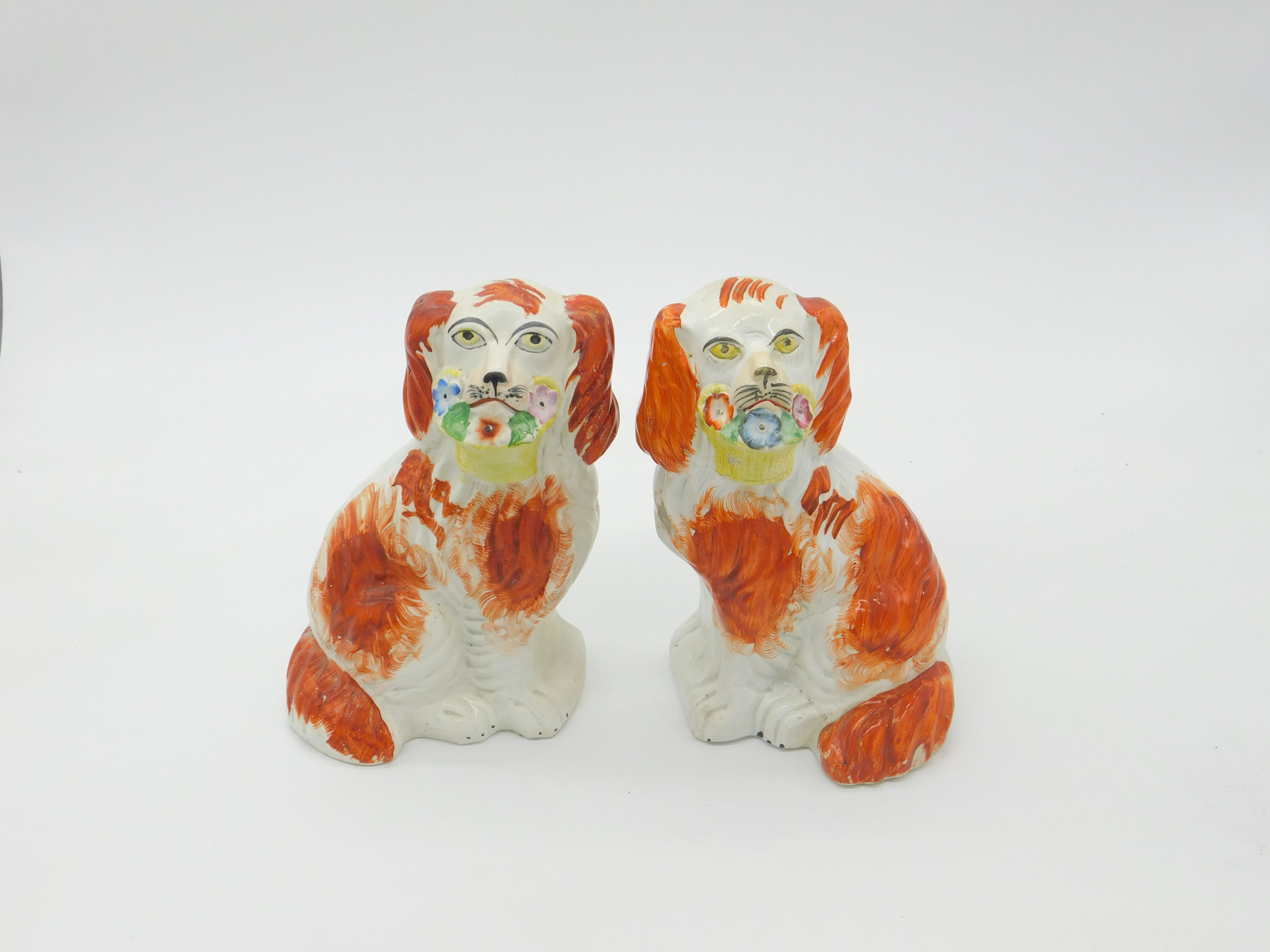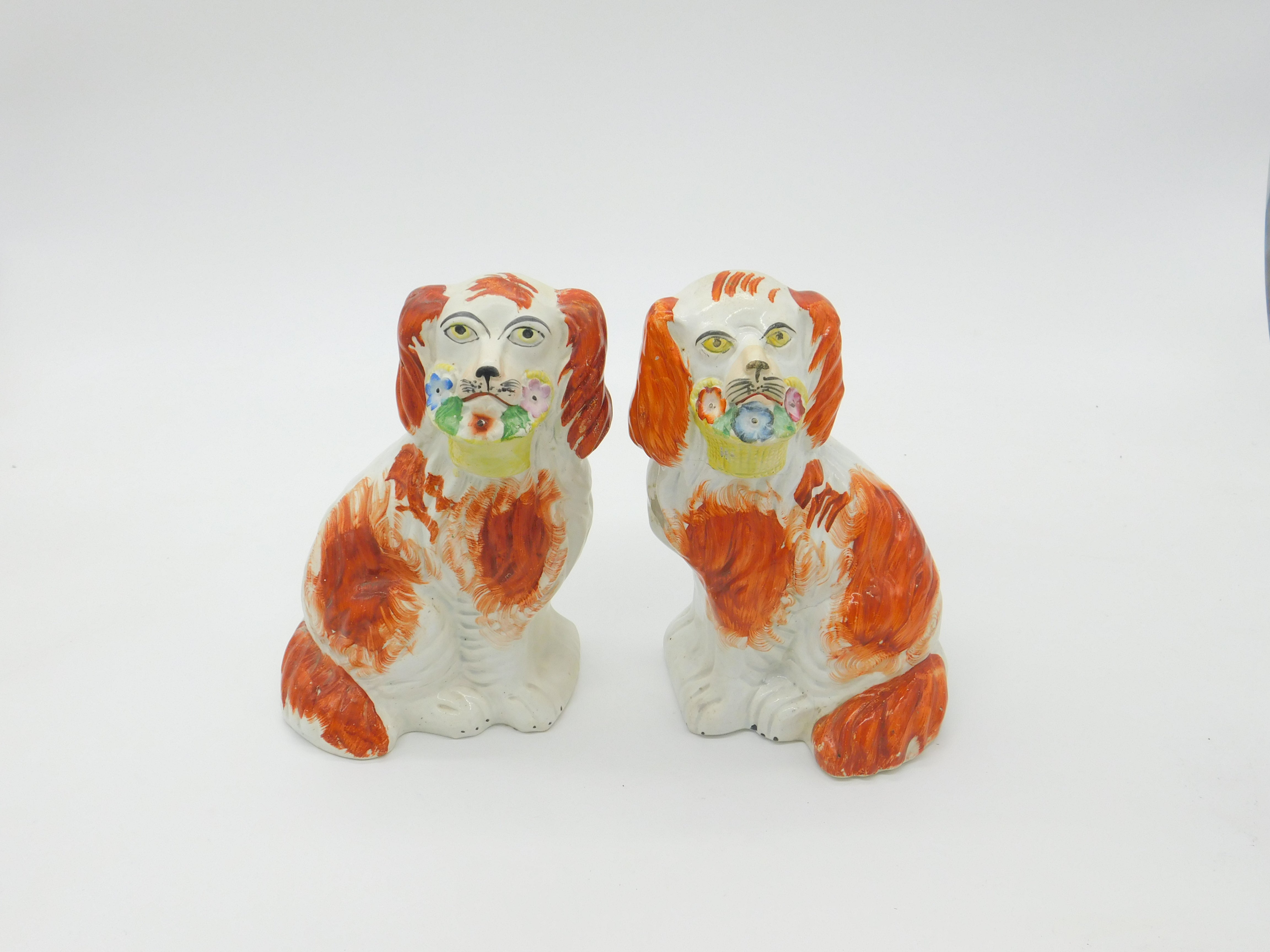 Victorian Pair of Staffordshire Pottery Spaniels Flower Baskets Antique c1860