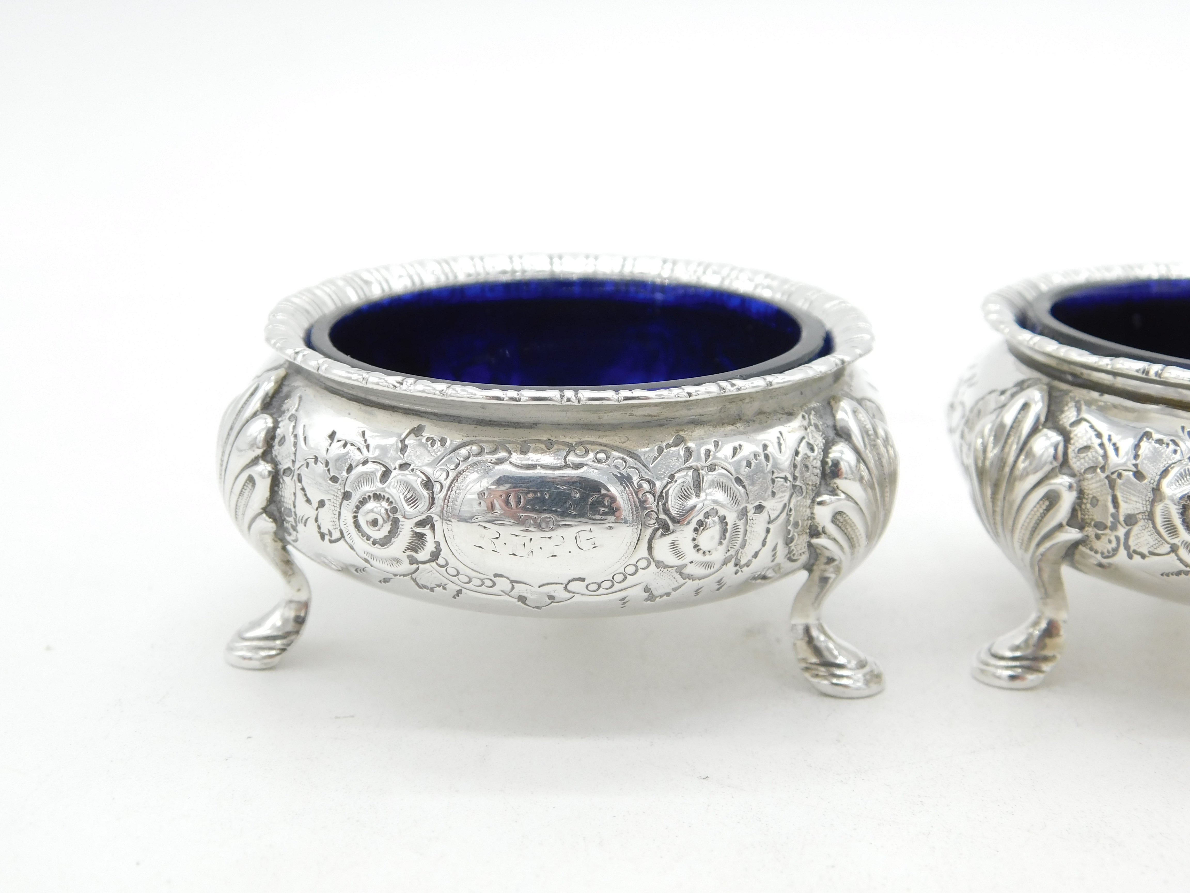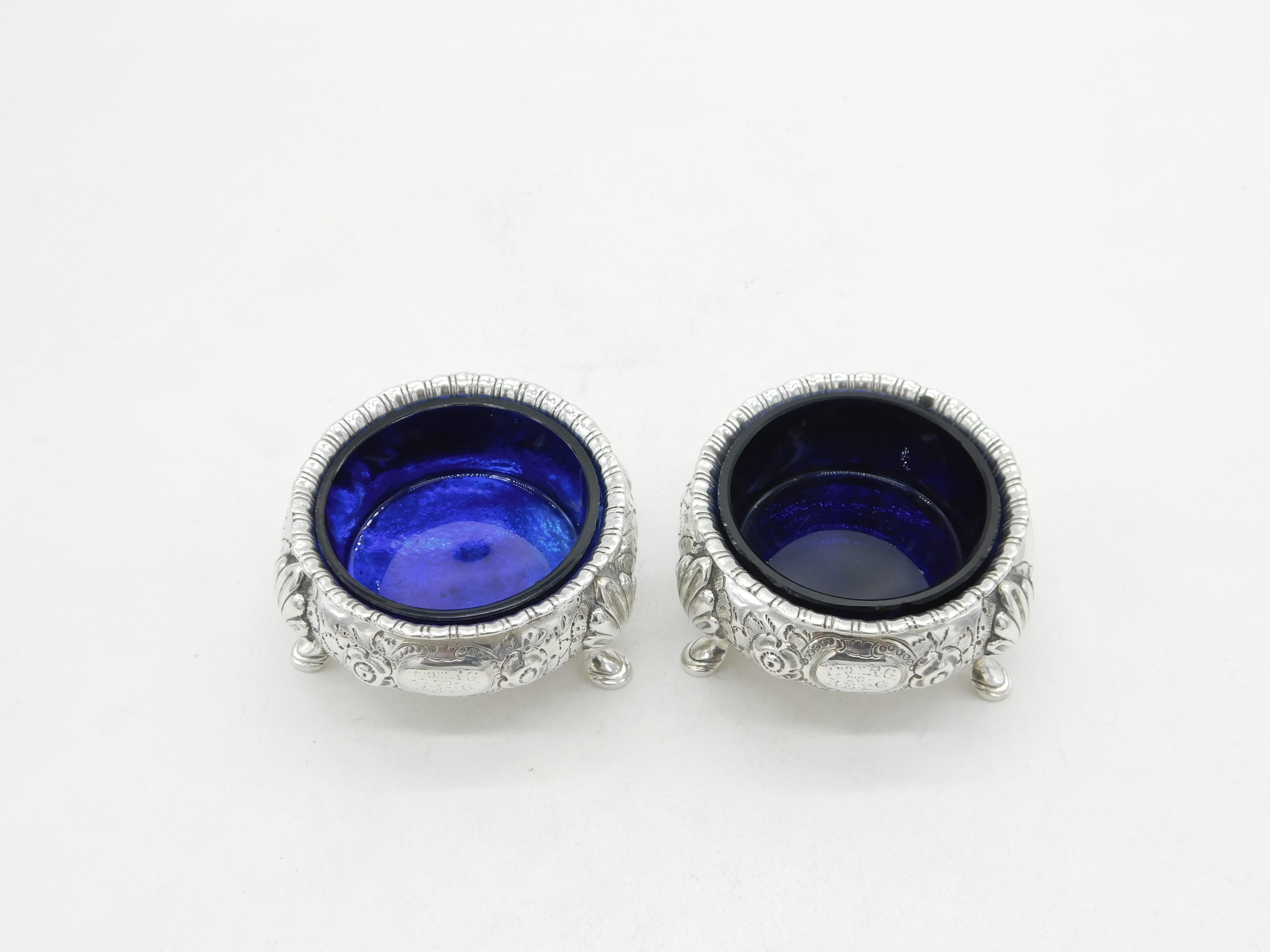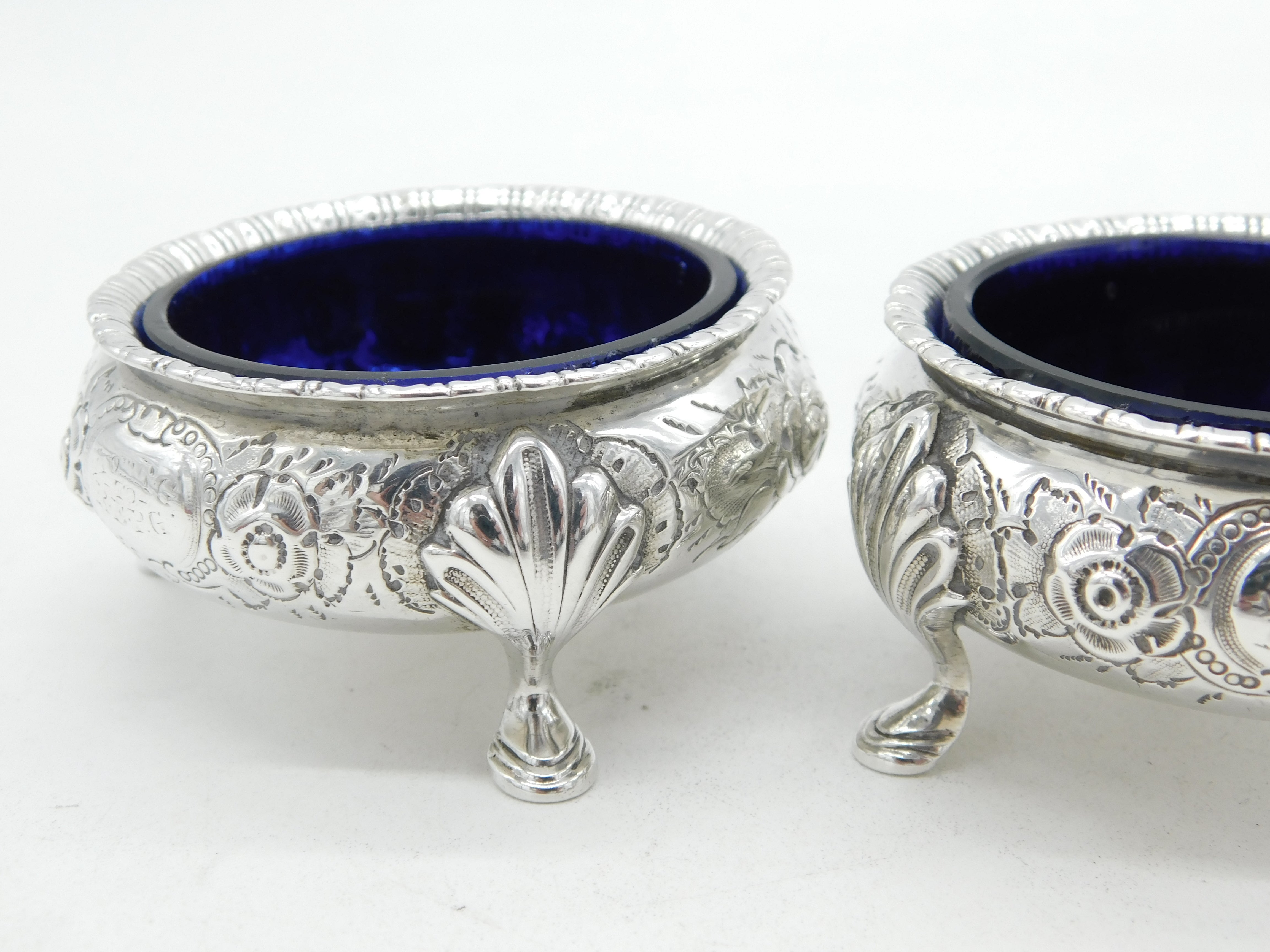 Details: A fantastic and wonderfully designed antique Victorian pair of sterling silver floral embossed salt cellars set with blue glass liners hallmarked Sheffield 1870 by Martin, Hall & Co. This is a wonderful item that would make a perfect gift or addition to any collection.