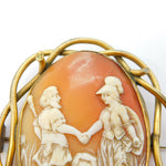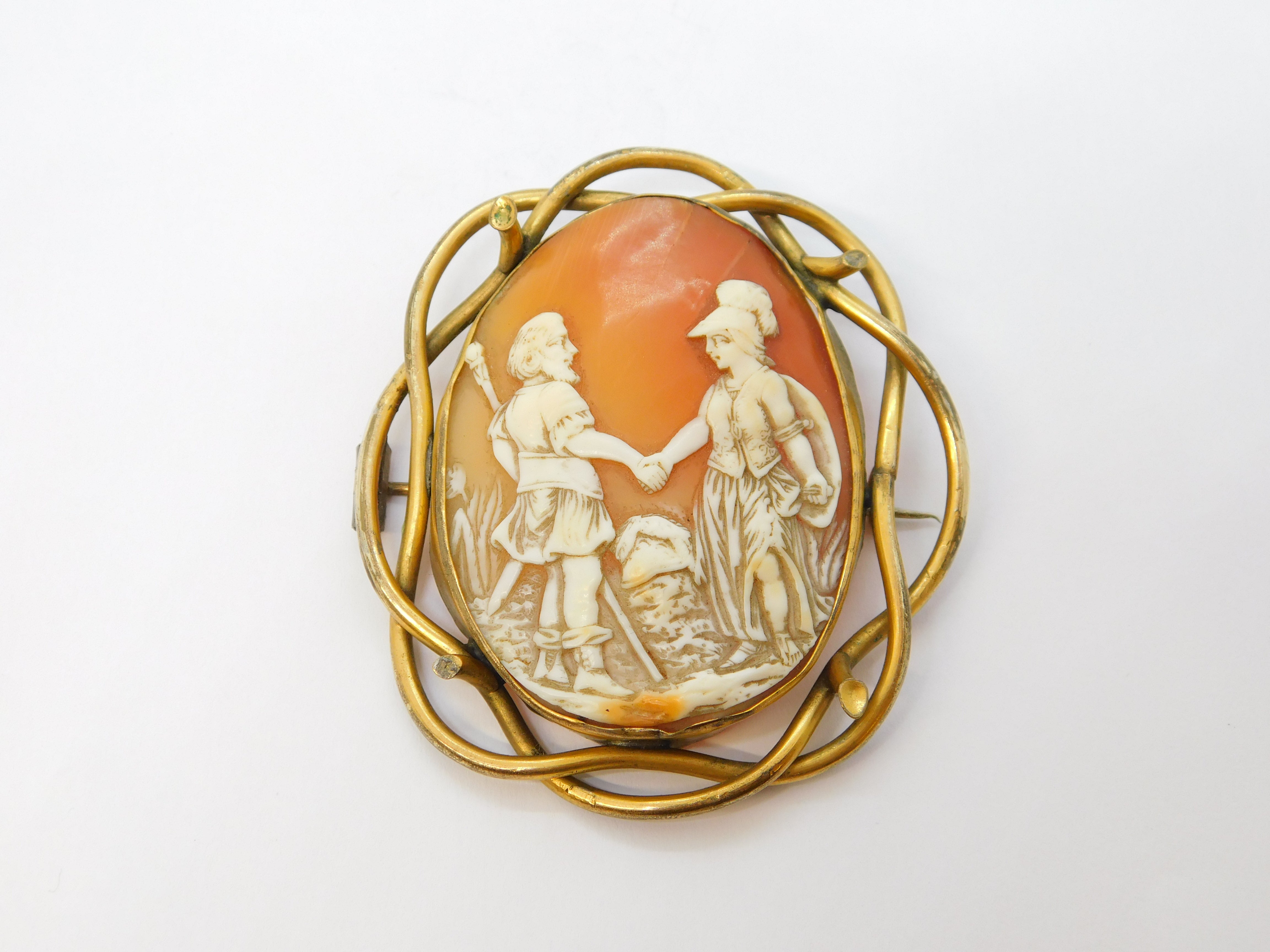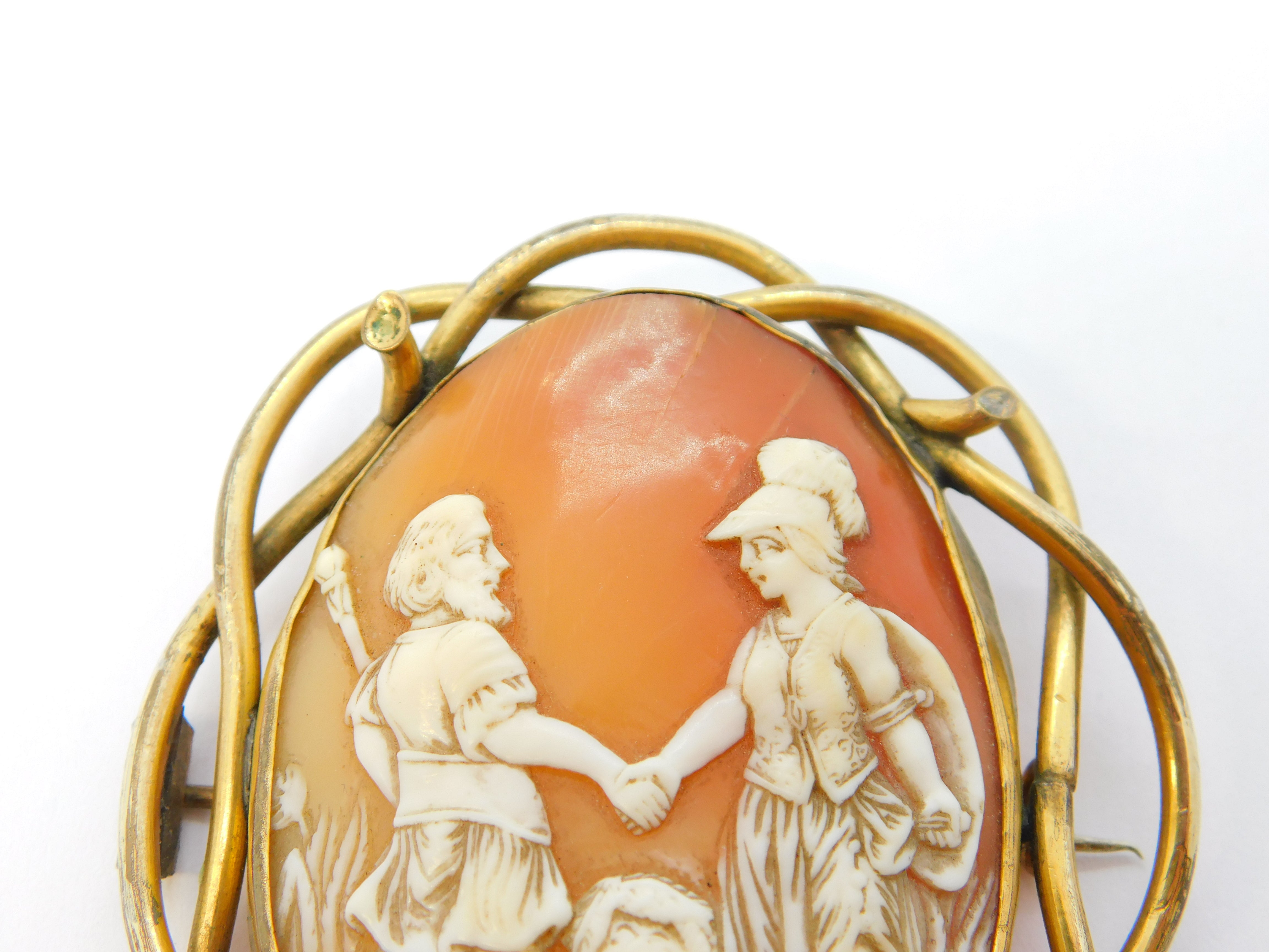 Details: A fantastic and wonderfully designed antique Victorian pinchbeck mounted large carved shell cameo depicting a soldier shaking the hand of a classical god c1880, a wonderful unusual carving. This is a wonderful item that would make a perfect gift or addition to any collection. We are more than happy to provide XRF reports for items upon request.