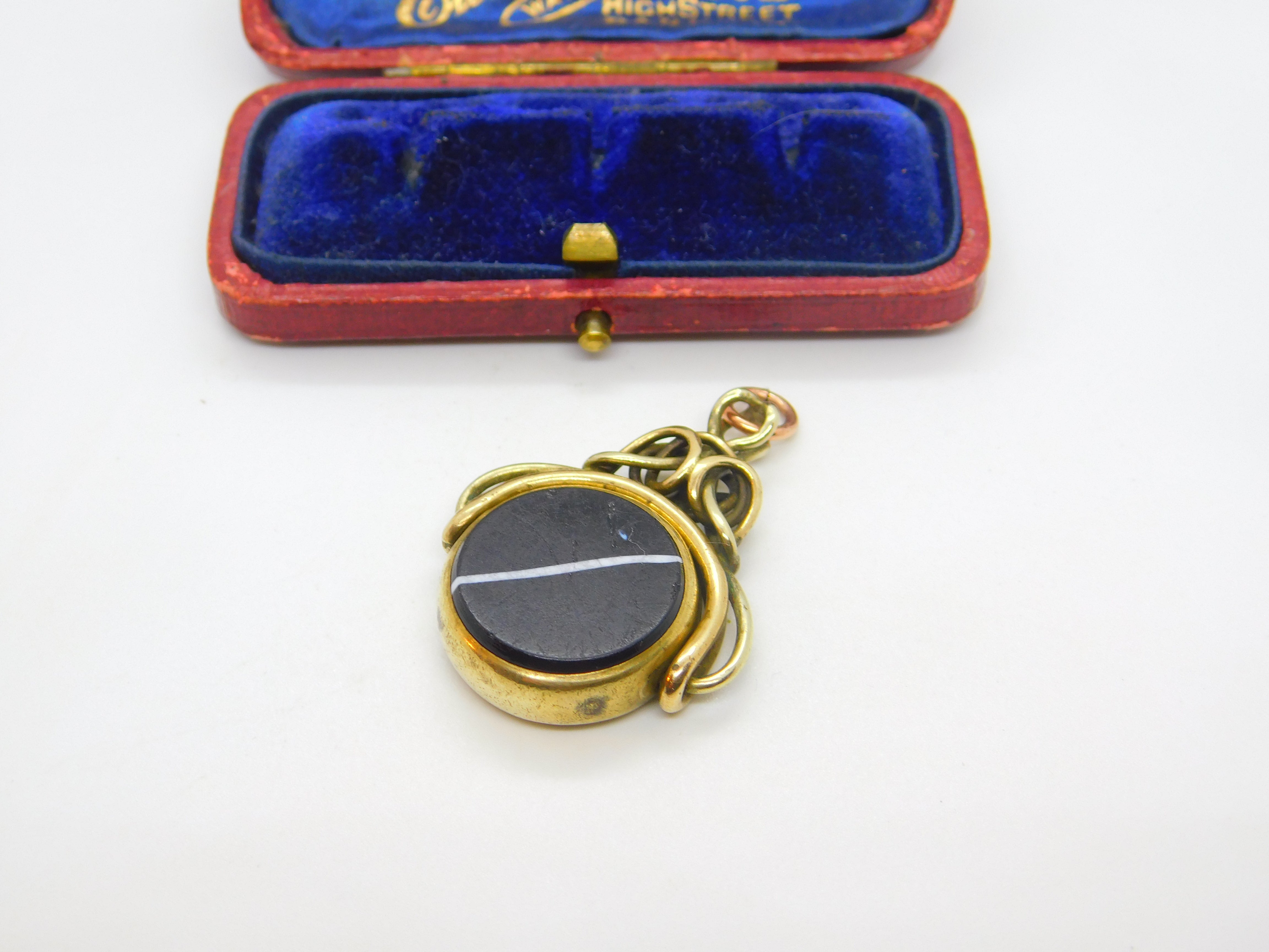 Details: A fantastic and wonderfully designed Victorian rolled gold spinning fob pendant set with banded agate and sardonyx c1850. This is a wonderful item that would make a perfect gift or addition to any collection. The BOX pictured is for PRESENTATION ONLY and is NOT included in the listings but used to frame the pictures unless specifically stated otherwise.
