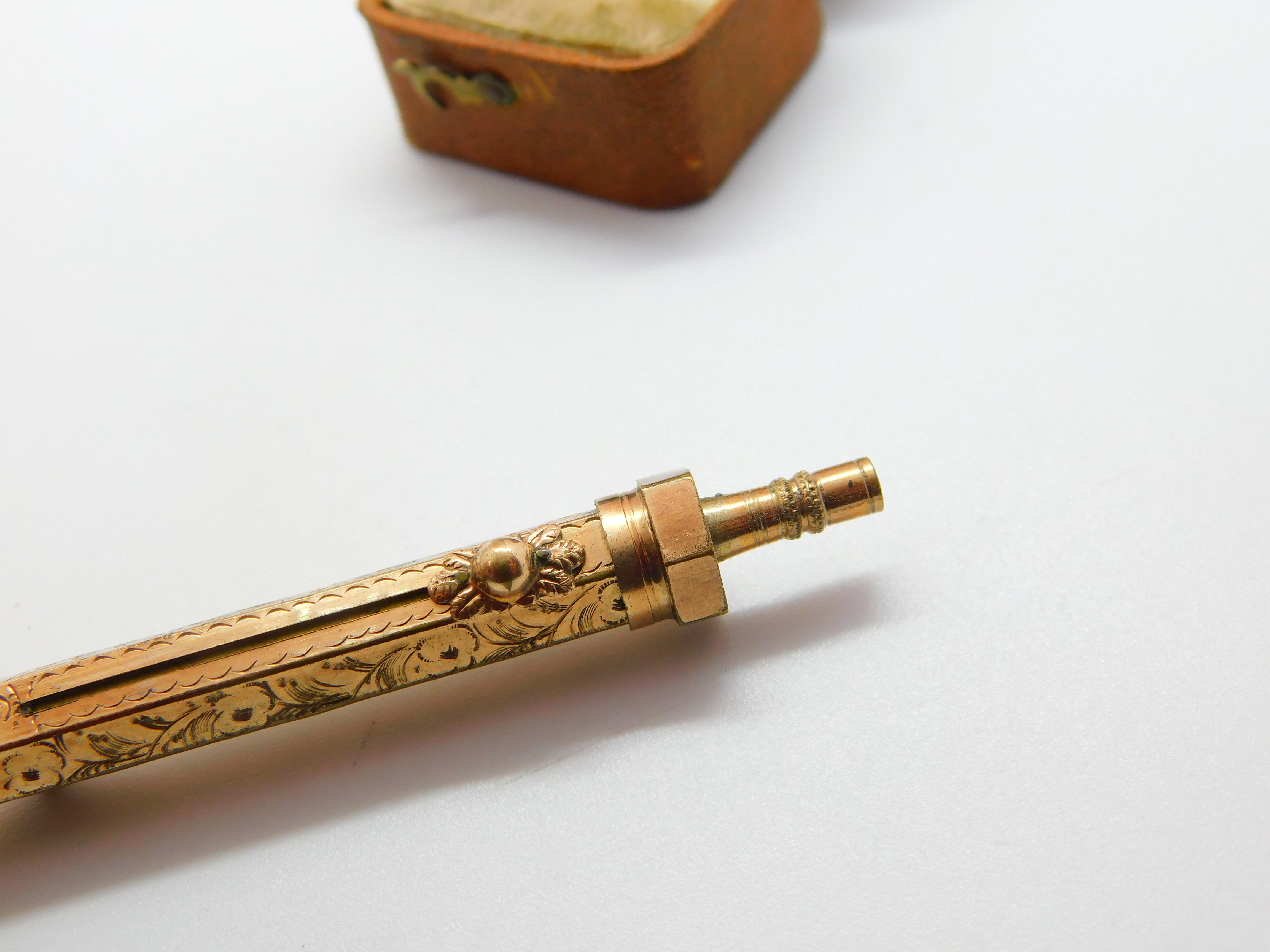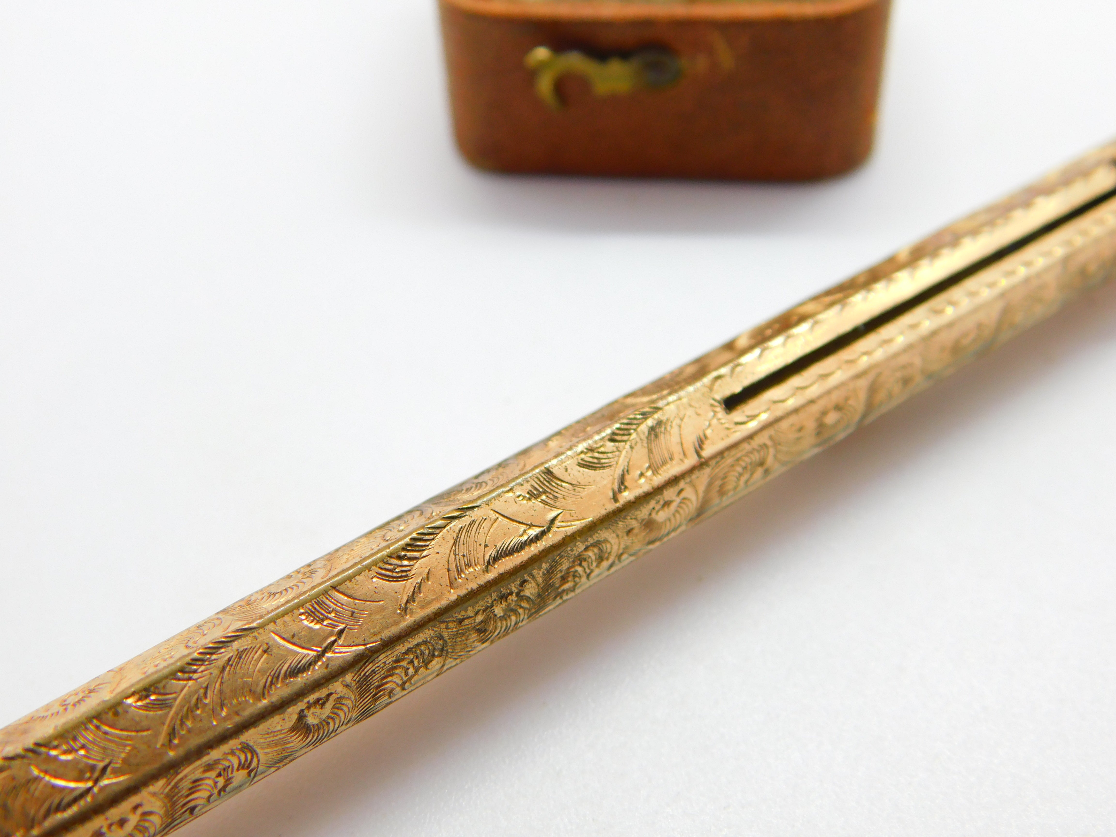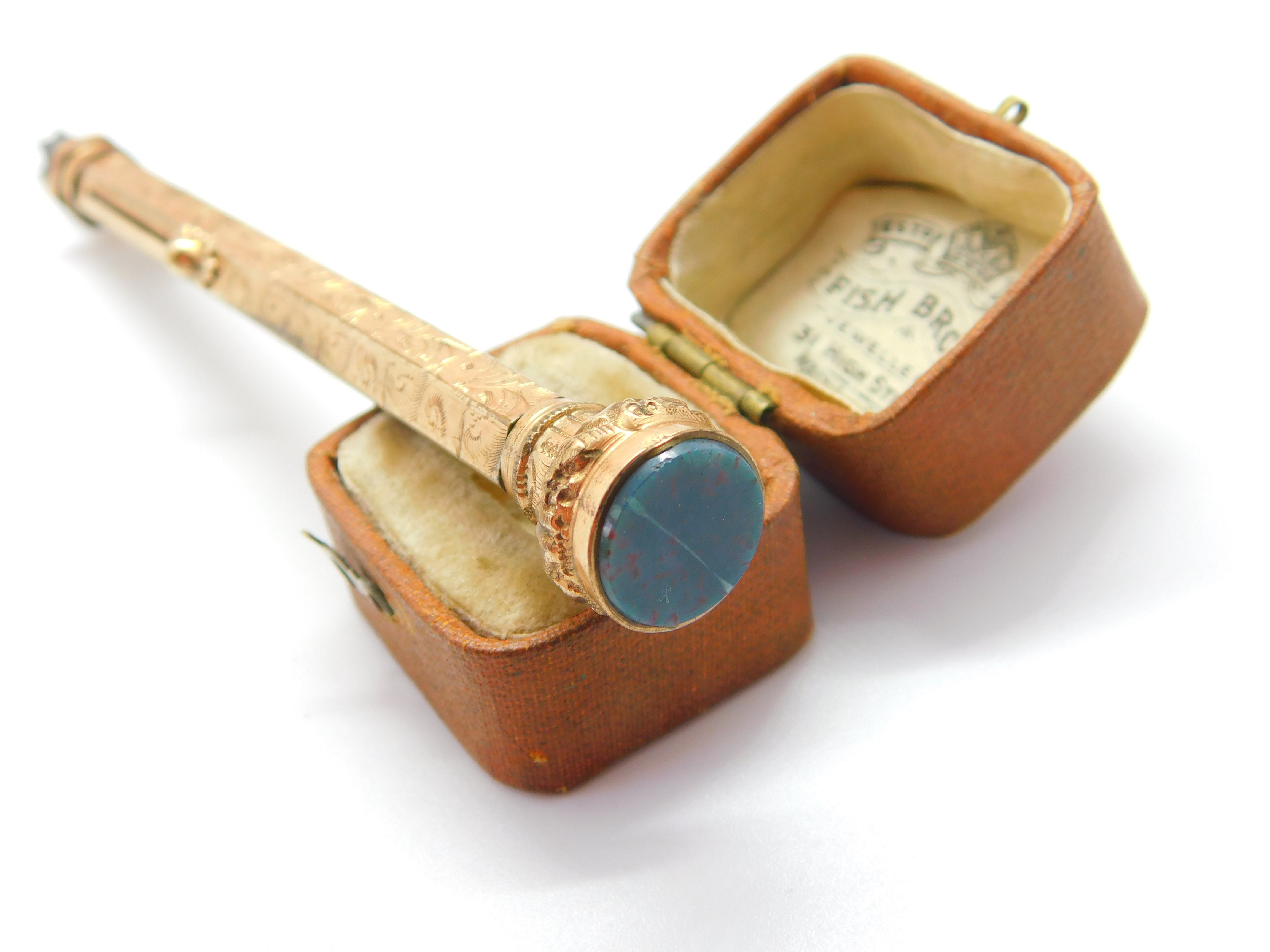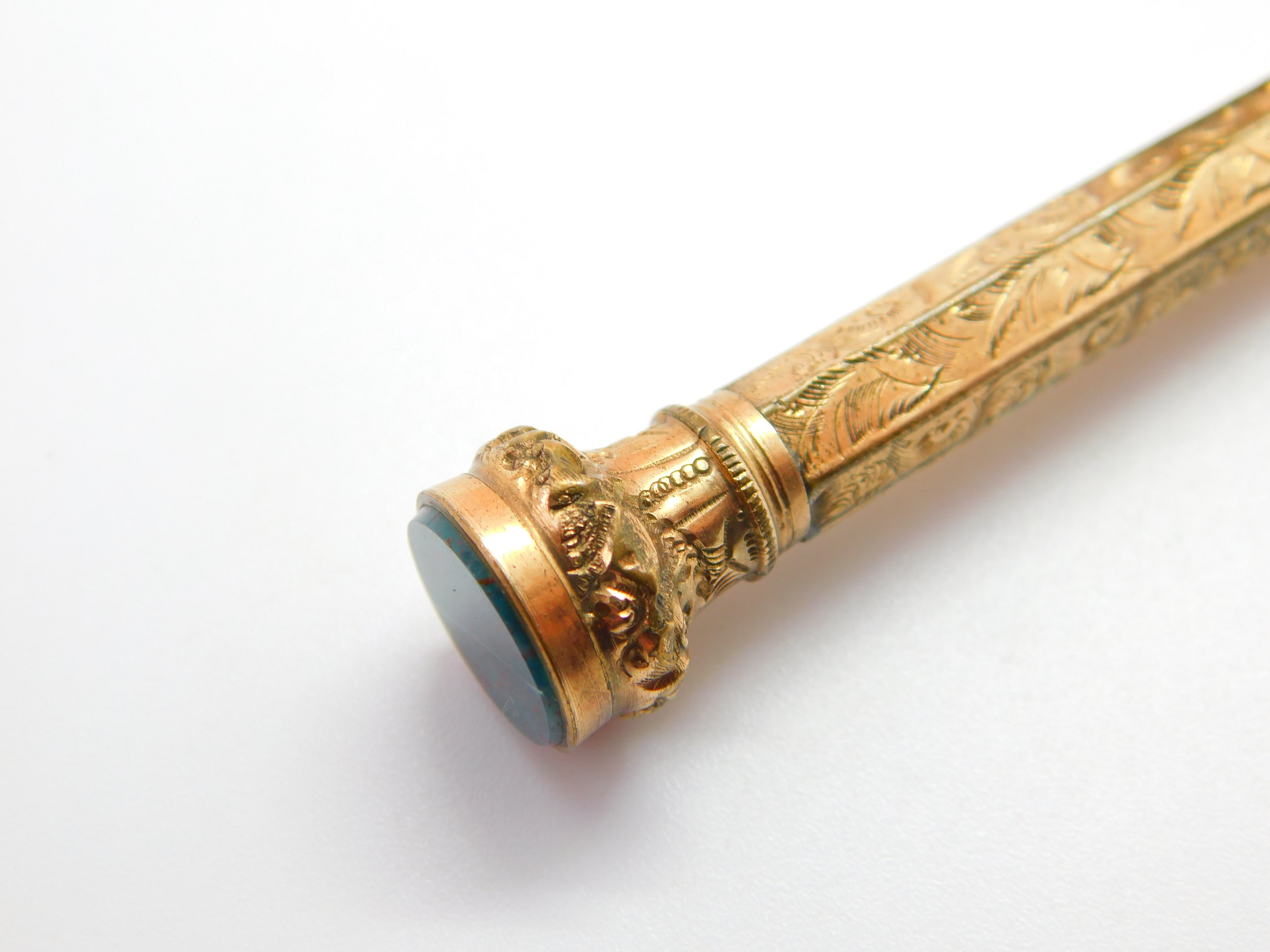 Details: A fantastic and wonderfully designed antique Victorian rolled gold propelling pencil and fountain pen in one with charming floral detailing throughout set with a bloodstone to the terminal c1880. Nice condition for a very scarce example. This is a wonderful item that would make a perfect gift or addition to any collection. The BOX pictured is for PRESENTATION ONLY and is NOT included in the listings but used to frame the pictures unless specifically stated otherwise.