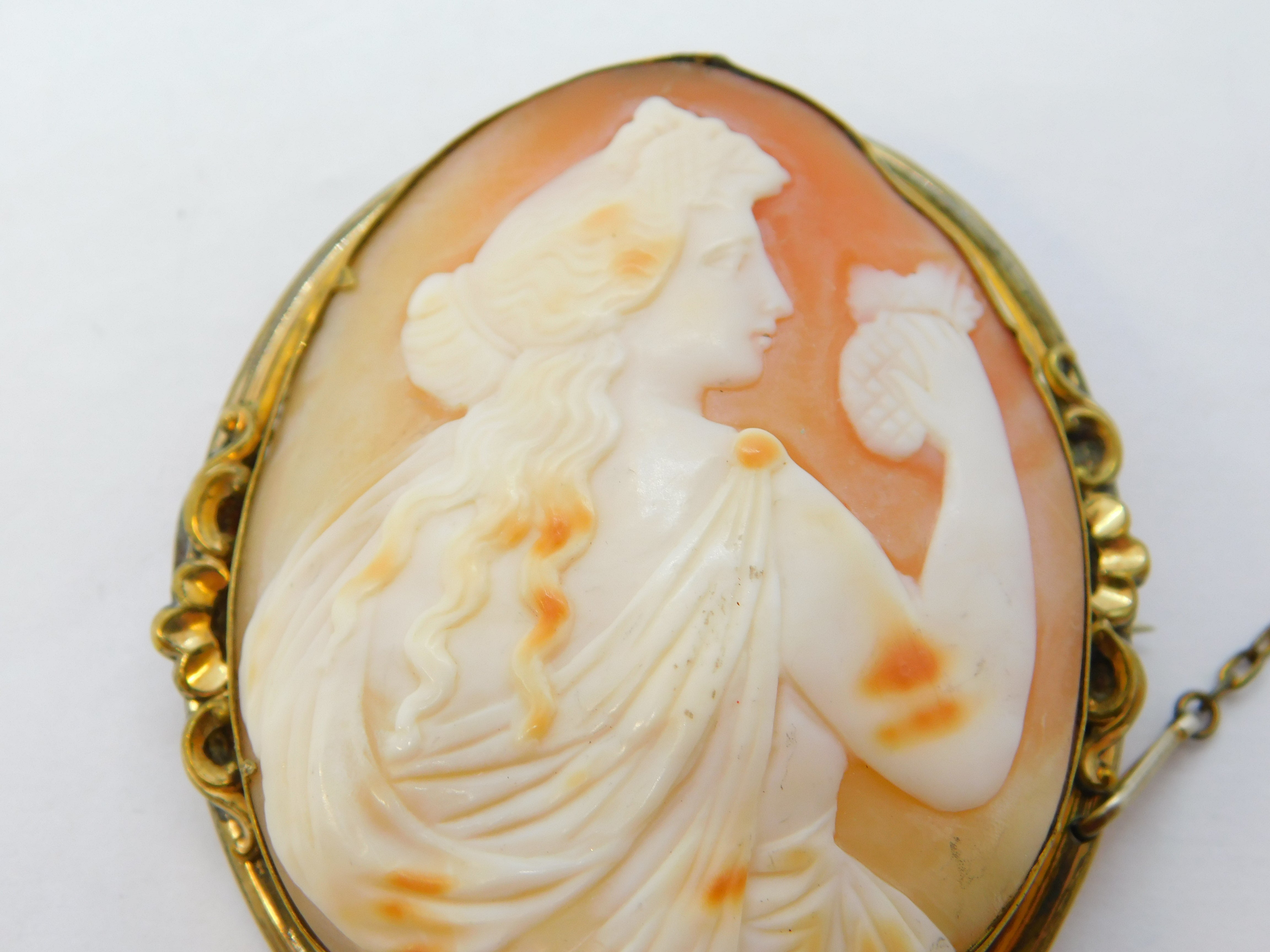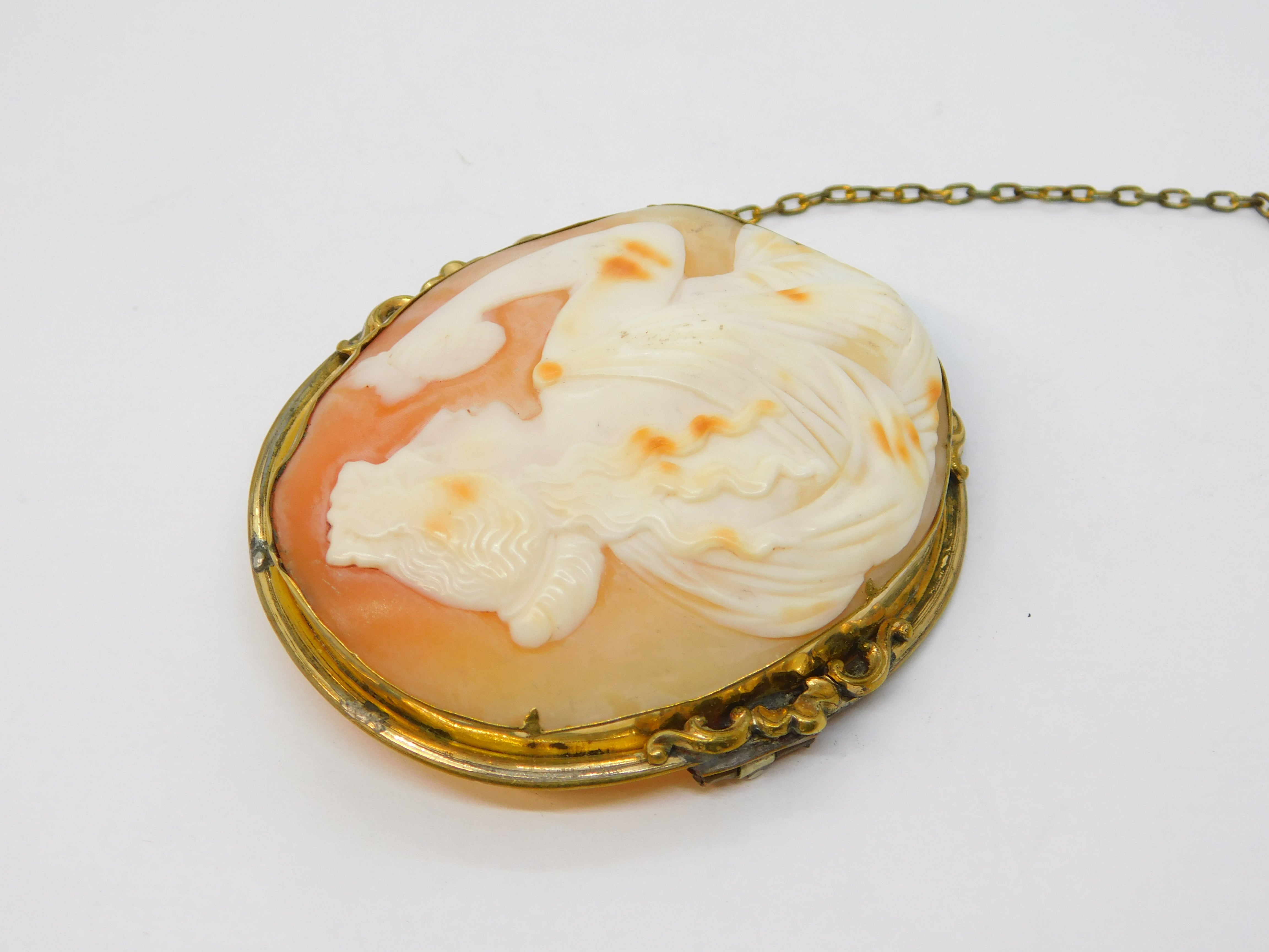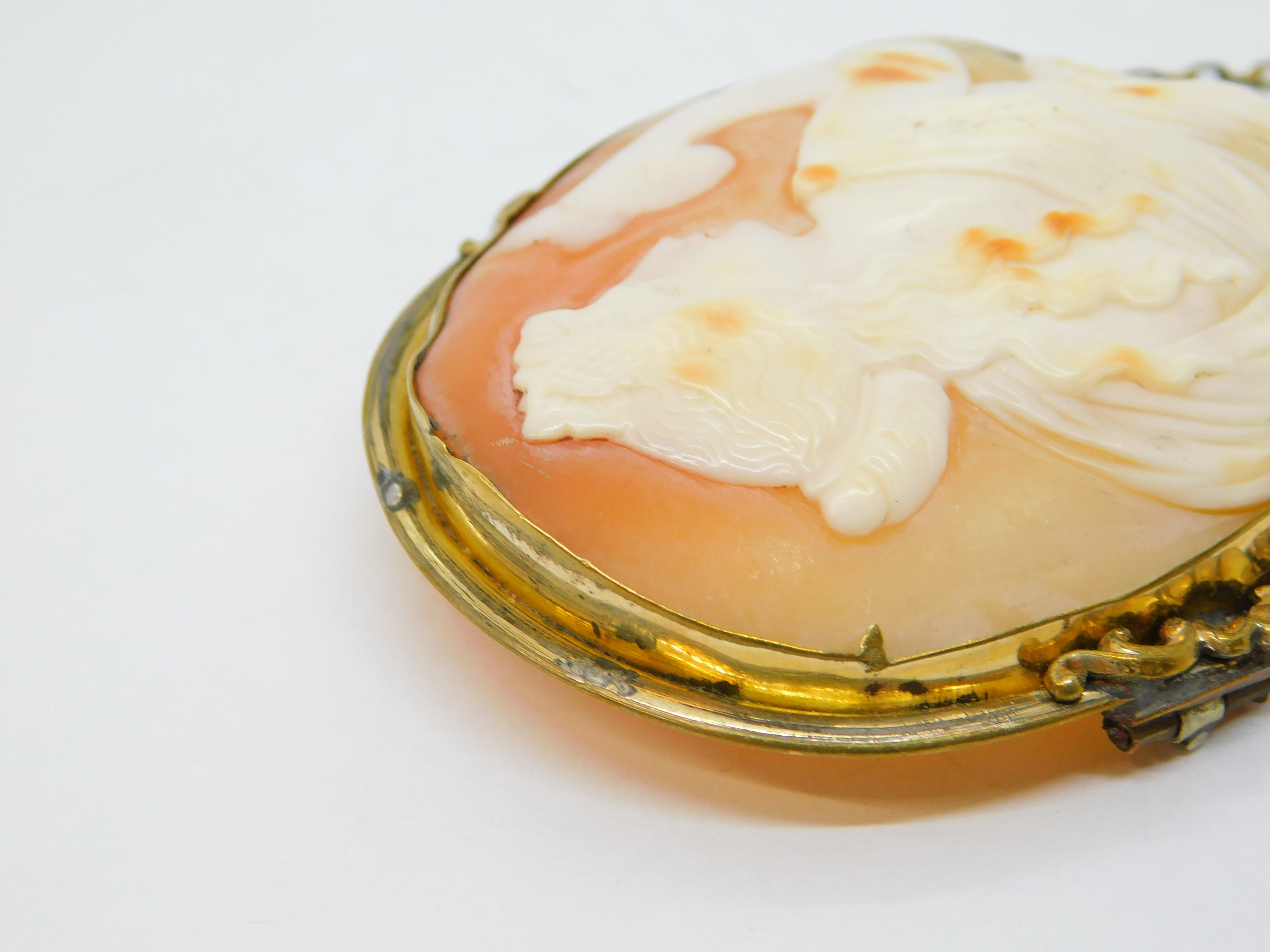Details: A fantastic and wonderfully designed antique Victorian rolled gold mounted large shell cameo brooch pin depicting the goddess Athena c1860, wonderful cameo in nice order. This is a wonderful item that would make a perfect gift or addition to any collection.
