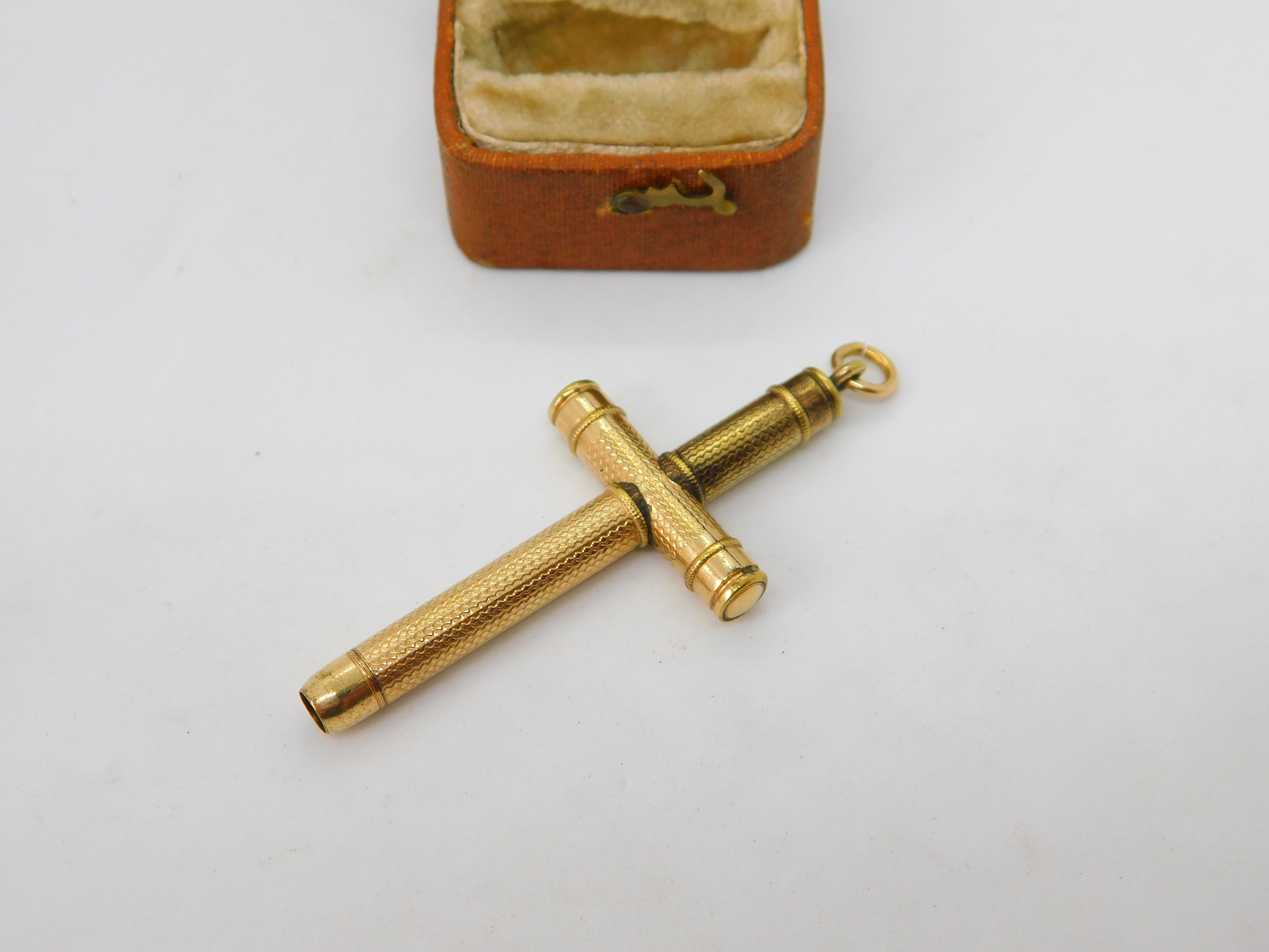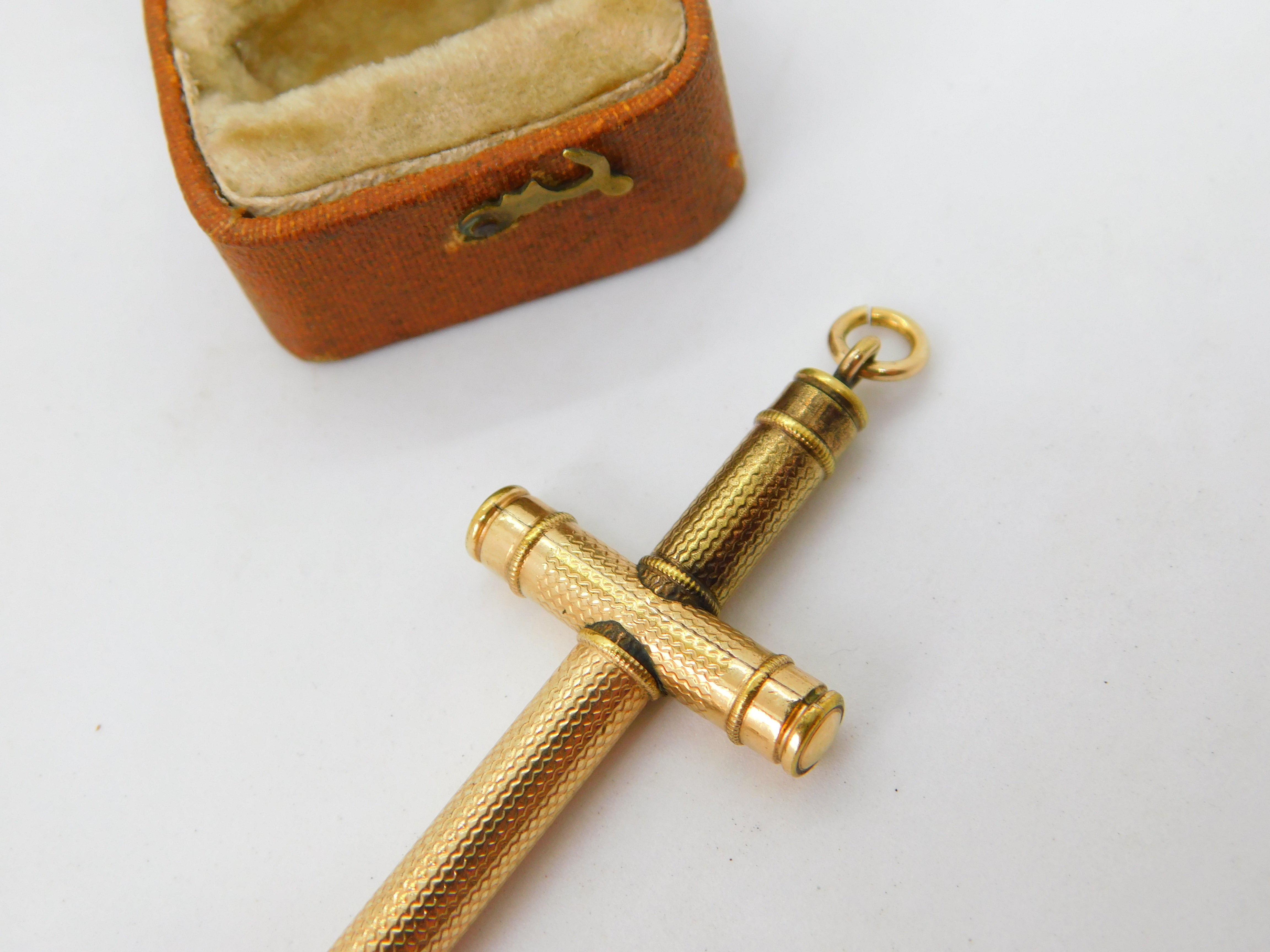 Details: A fantastic and wonderfully designed antique Victorian rolled gold propelling pencil fob pendant in the form of a sword with superb detailing and nicely functional mechanism c1880. This is a wonderful item that would make a perfect gift or addition to any collection. The BOX pictured is for PRESENTATION ONLY and is NOT included in the listings but used to frame the pictures unless specifically stated otherwise.