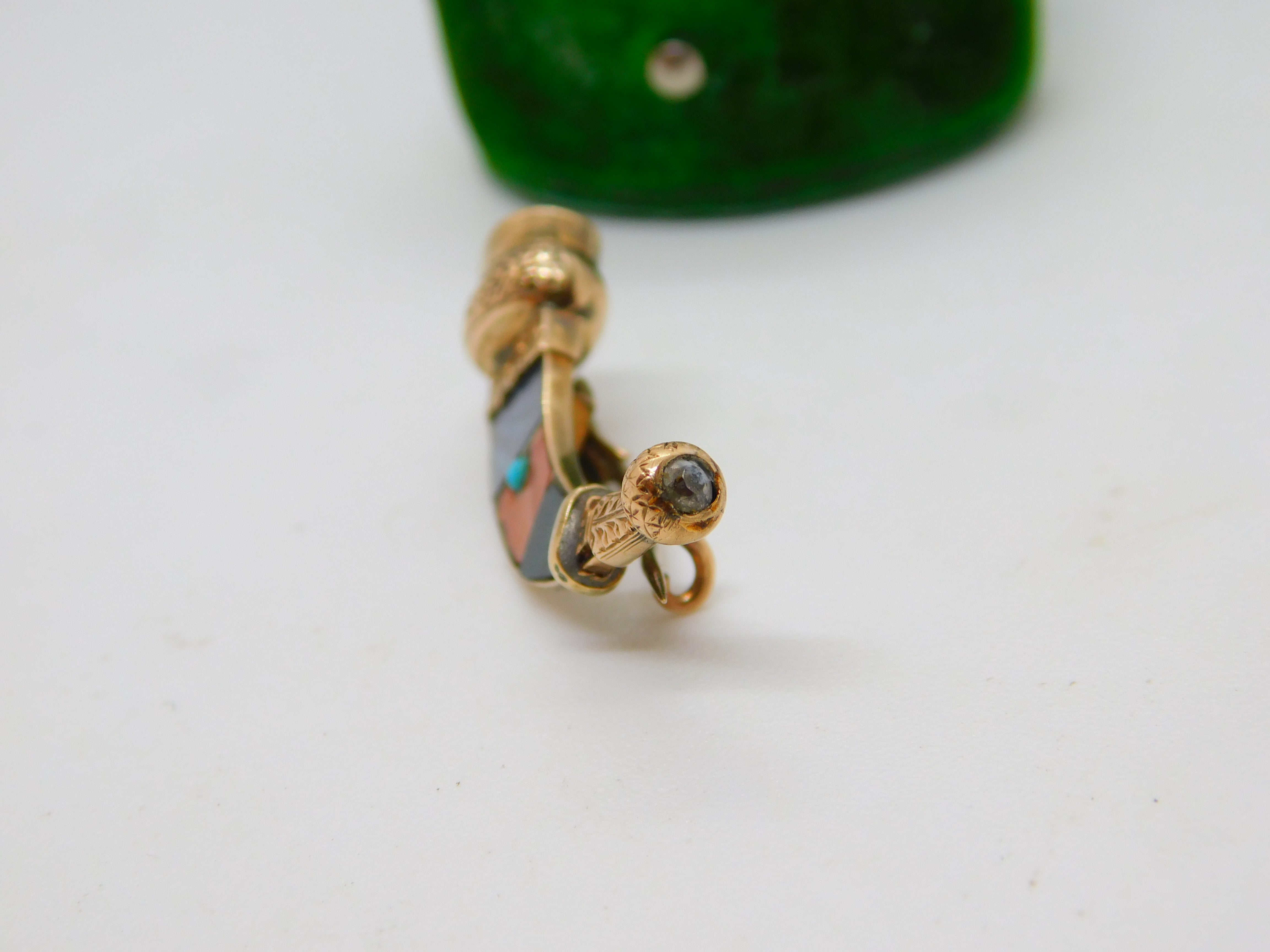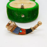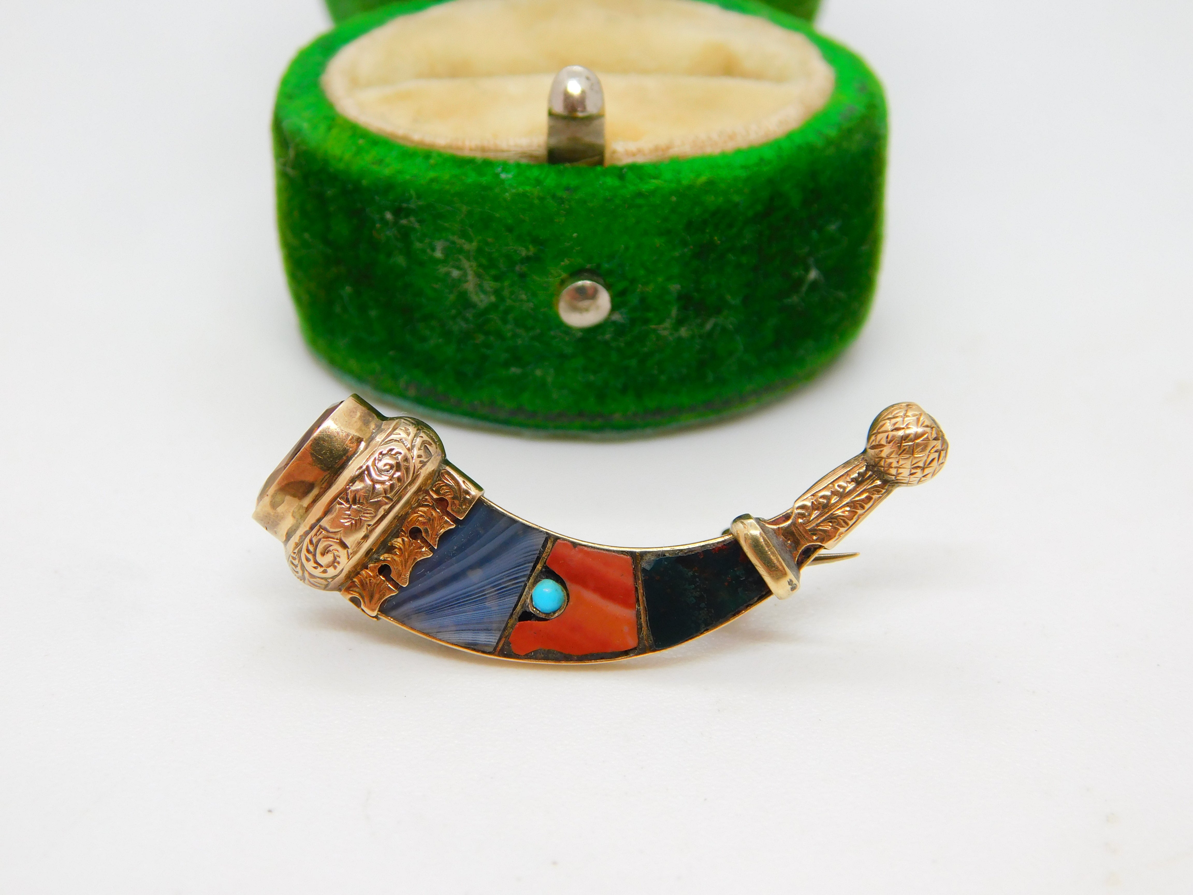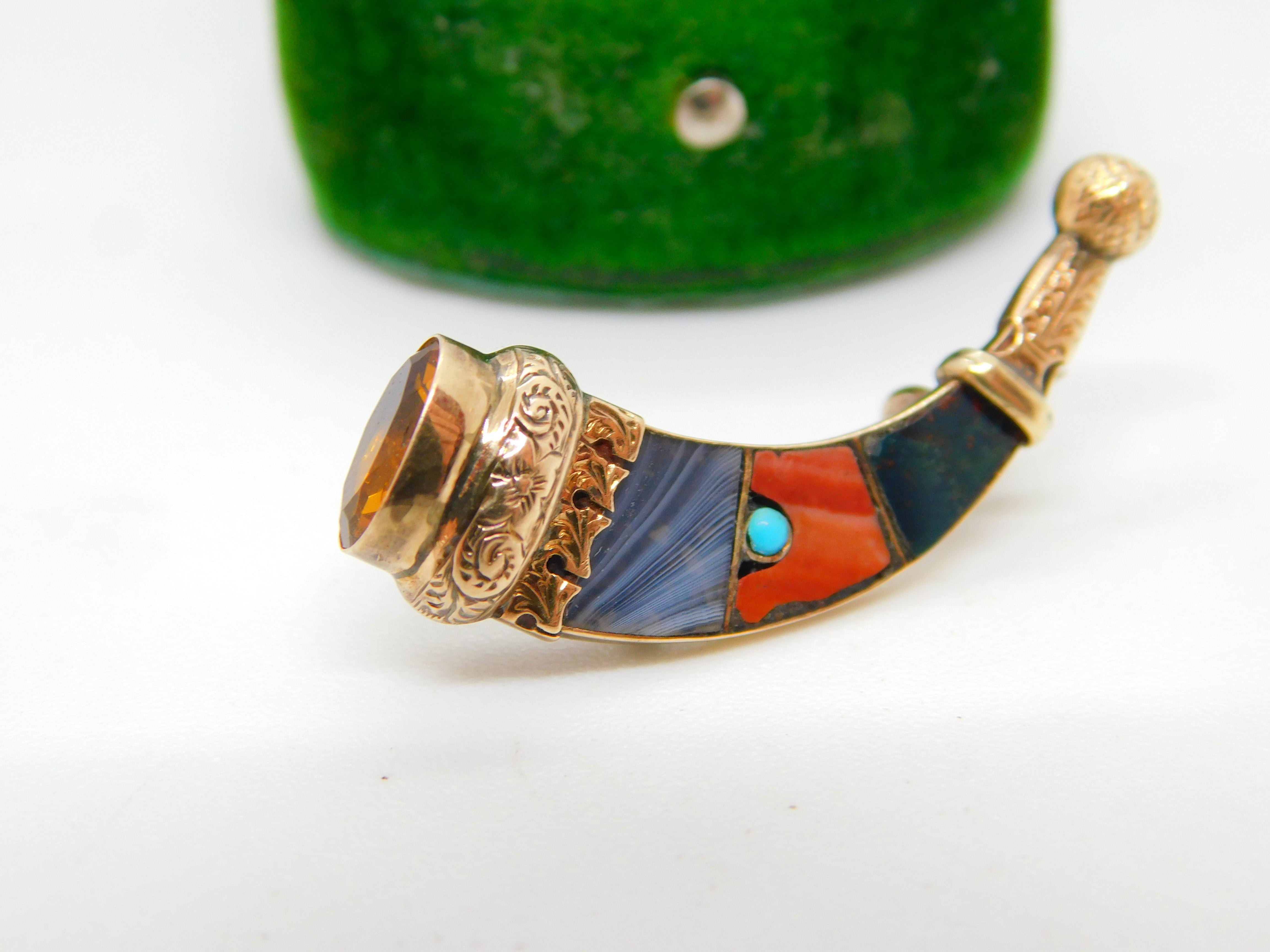 Details: A fantastic and wonderfully designed antique Victorian scottish 9ct yellow gold sword from dress brooch set with citrine, montrose agate, red agate, turquoise, bloodstone and even an old-cut diamond to the tip c1840, the gold has been XRF tested as it is unmarked. The diamond has been tested. This is a wonderful item that would make a perfect gift or addition to any collection. The BOX pictured is for PRESENTATION ONLY and is NOT included in the listings but used to frame the pictures unless specifically stated otherwise.