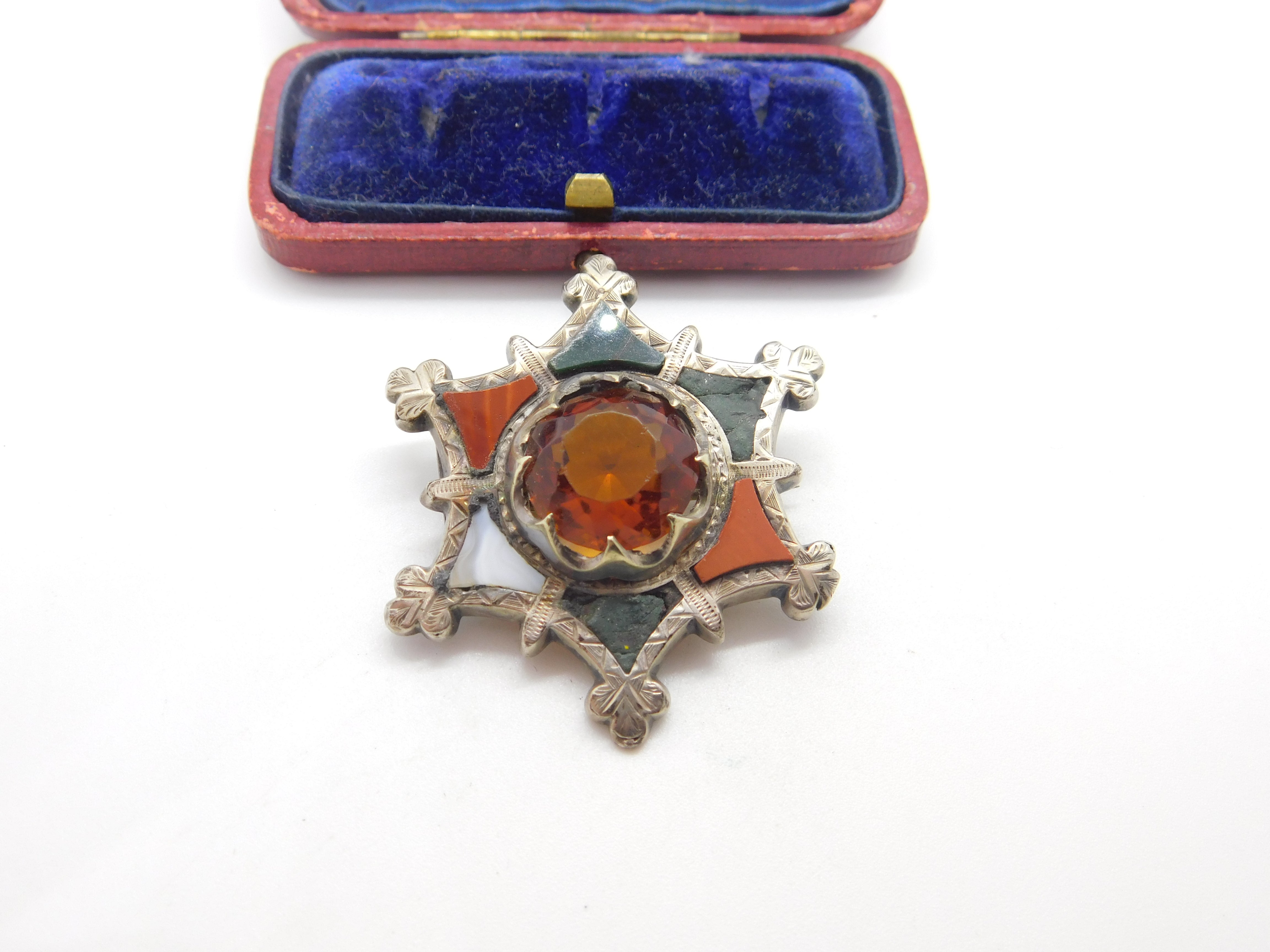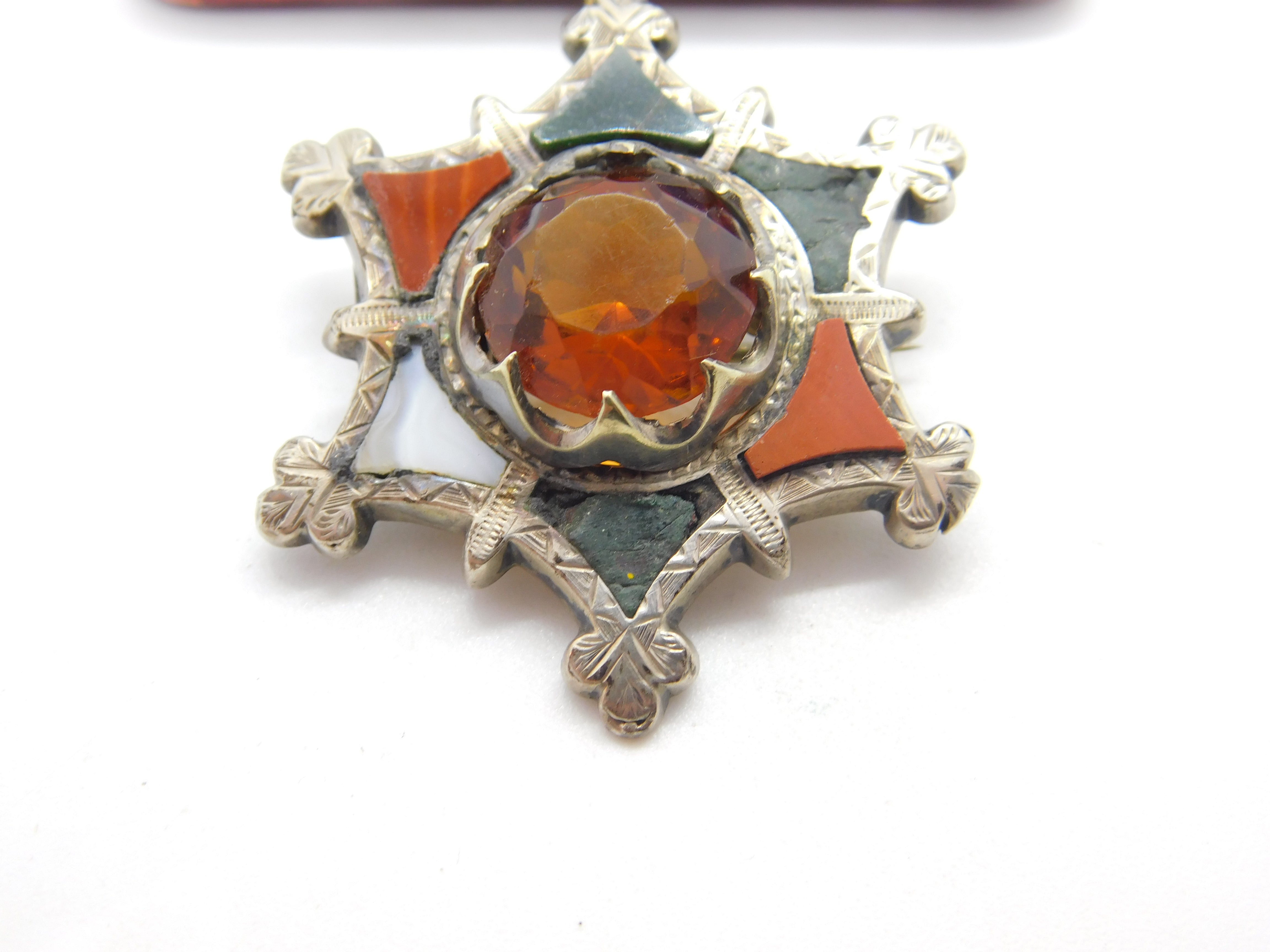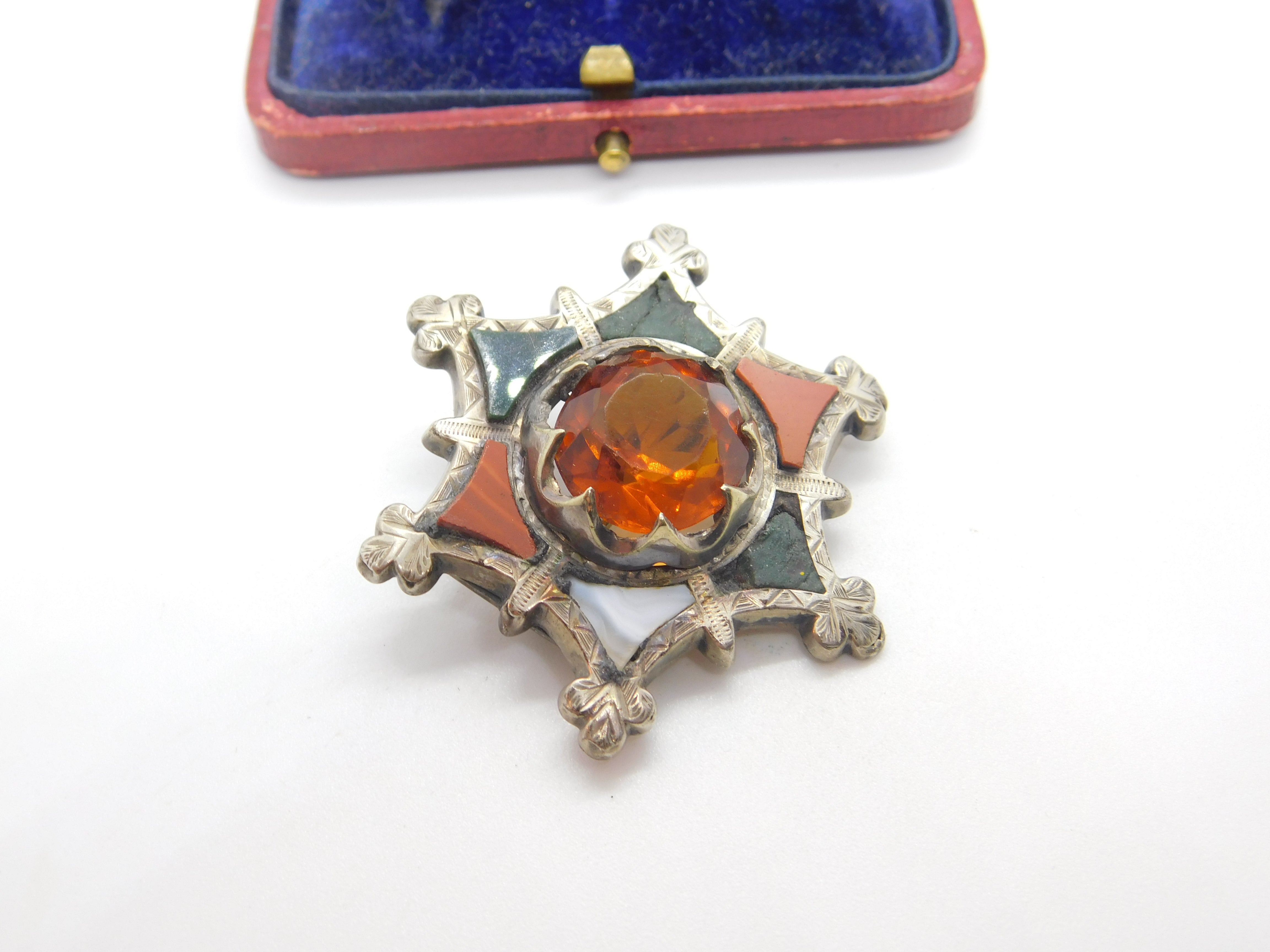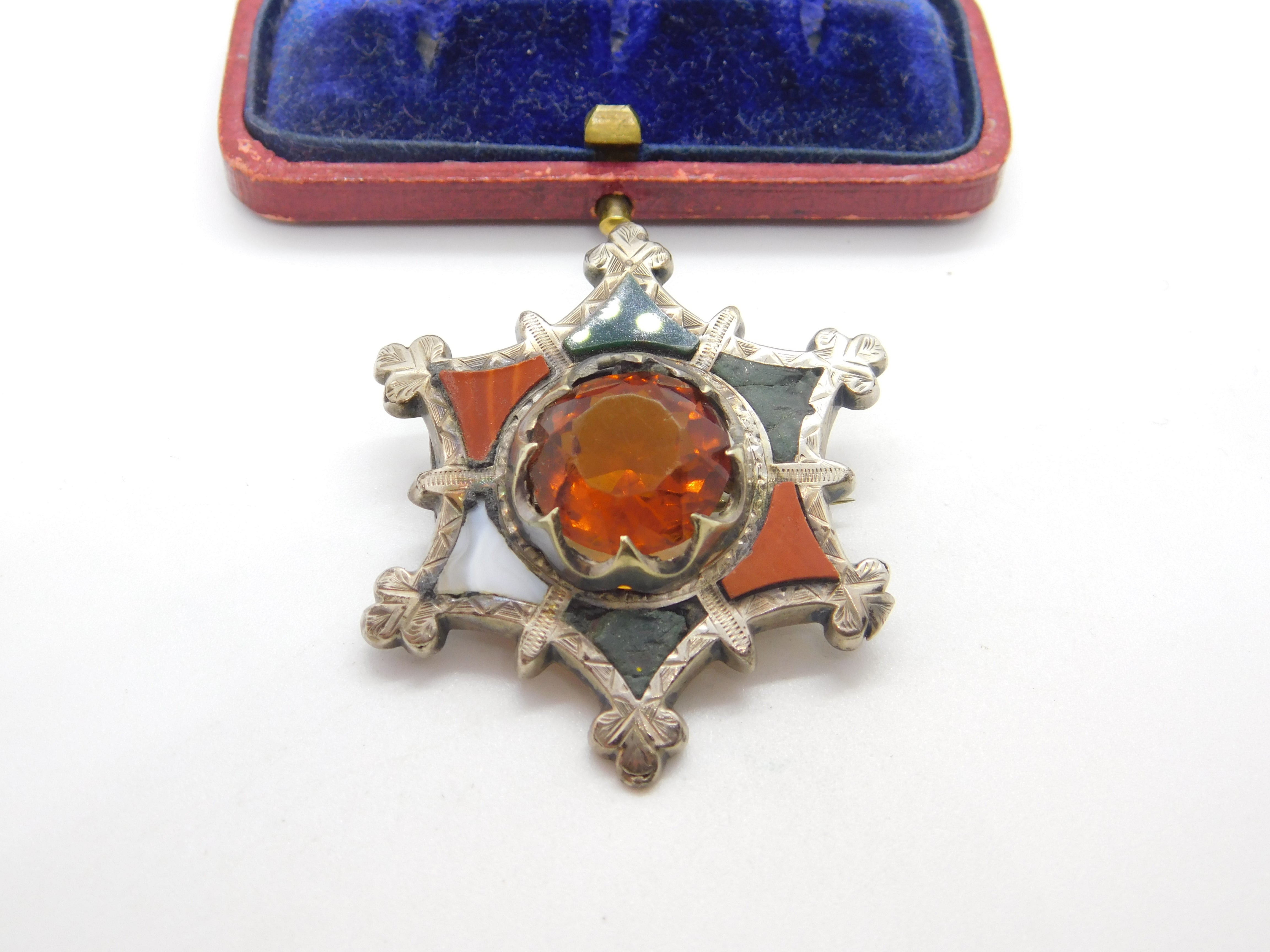 Details: A fantastic and wonderfully designed antique Victorian Scottish sterling silver star form brooch with lovely design set with montrose agate, bloodstone & citrine c1860. Some of the agate is damaged but a lovely brooch nonetheless. This is a wonderful item that would make a perfect gift or addition to any collection. The BOX pictured is for PRESENTATION ONLY and is NOT included in the listings but used to frame the pictures unless specifically stated otherwise.