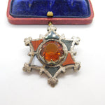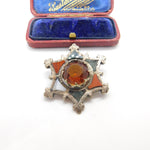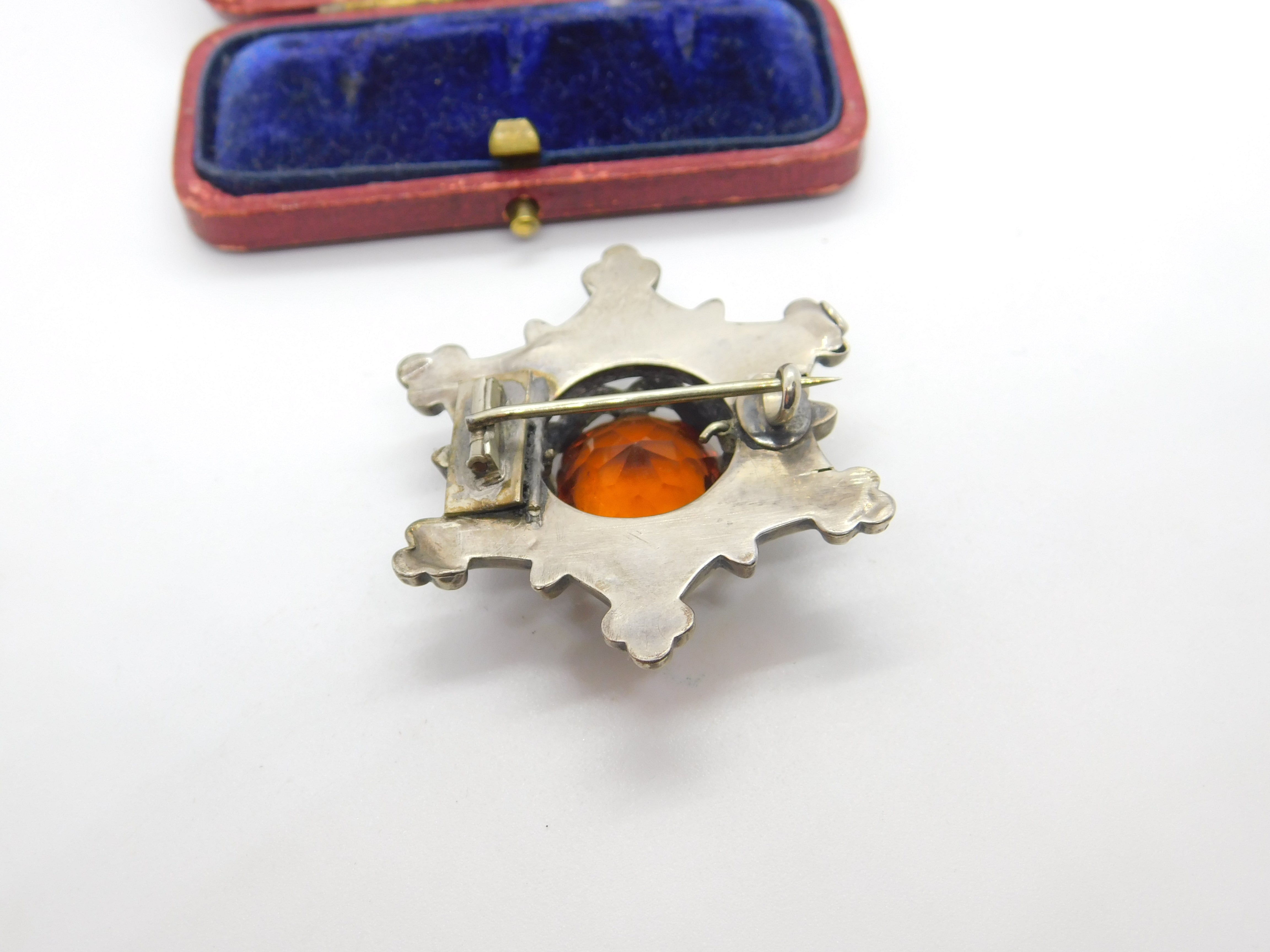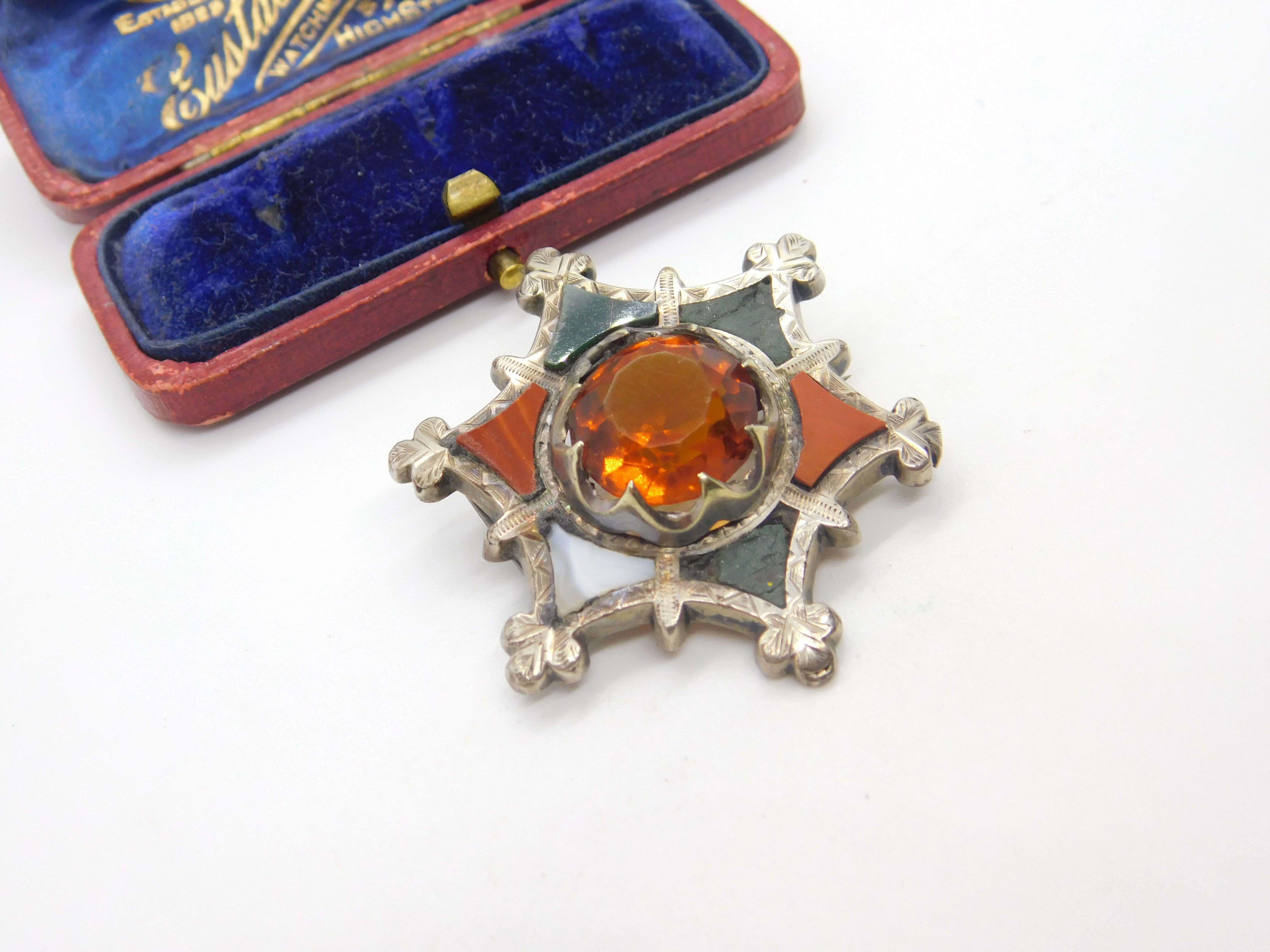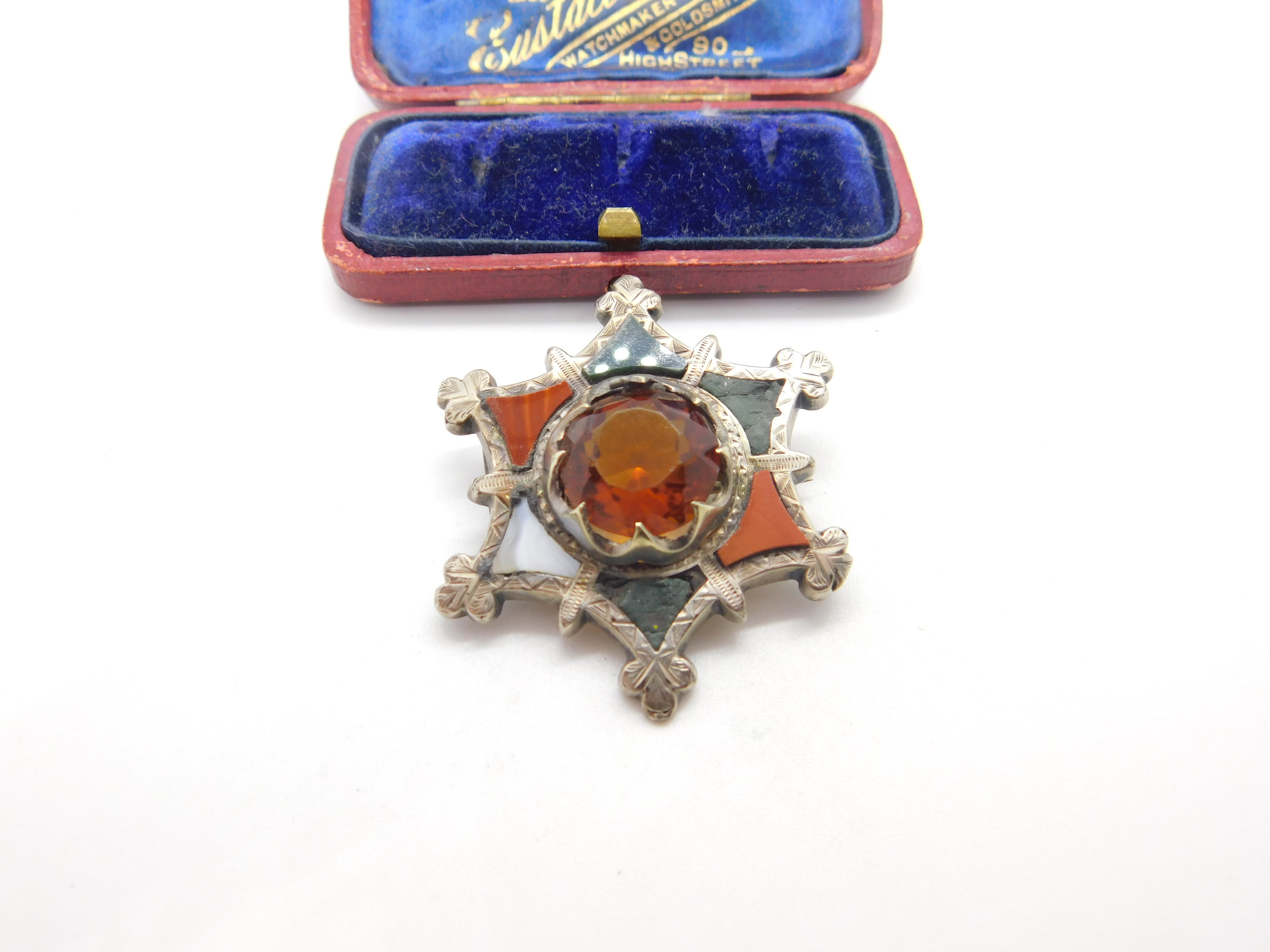 Details: A fantastic and wonderfully designed antique Victorian Scottish sterling silver star form brooch with lovely design set with montrose agate, bloodstone & citrine c1860. Some of the agate is damaged but a lovely brooch nonetheless. This is a wonderful item that would make a perfect gift or addition to any collection. The BOX pictured is for PRESENTATION ONLY and is NOT included in the listings but used to frame the pictures unless specifically stated otherwise.
