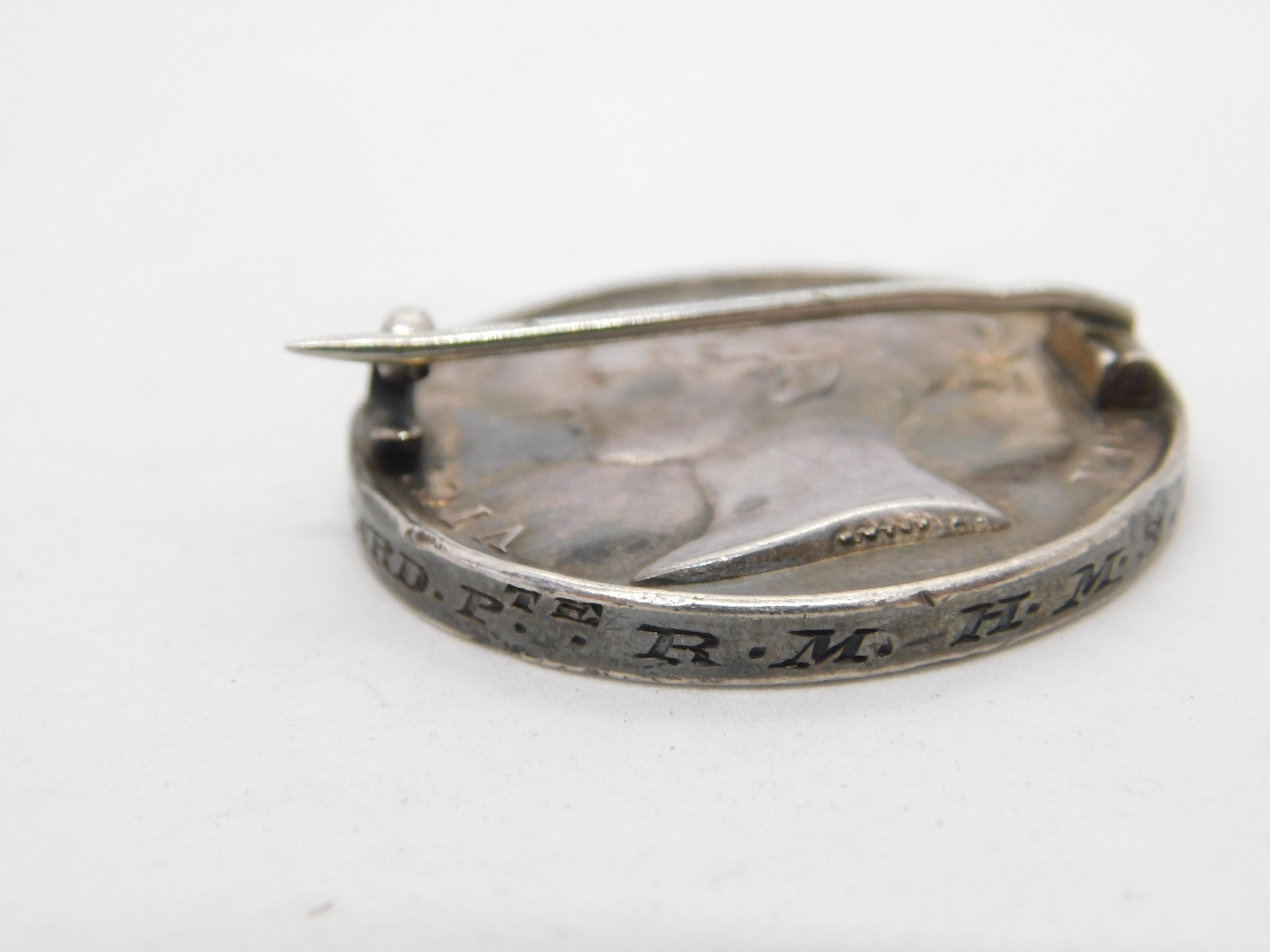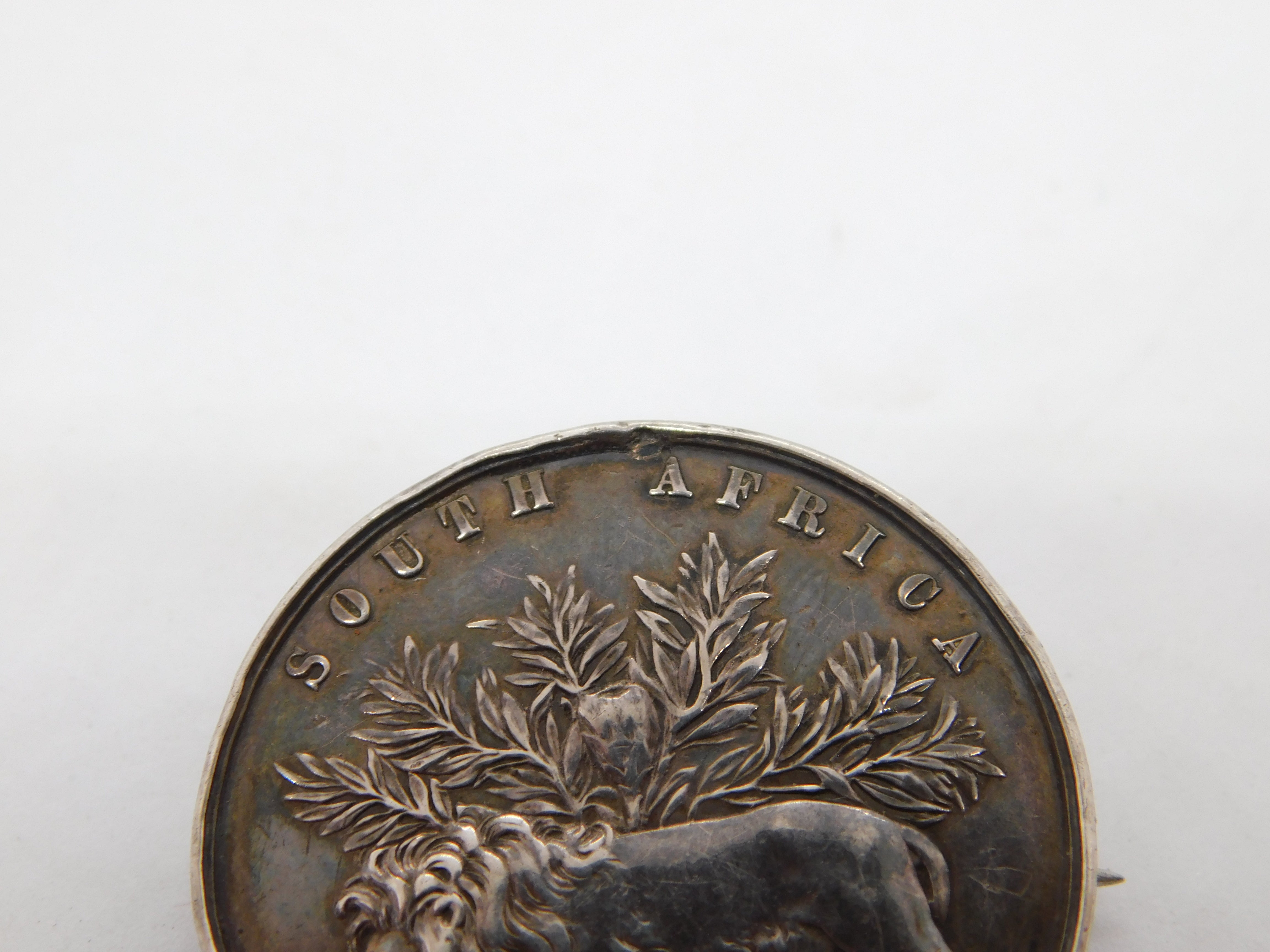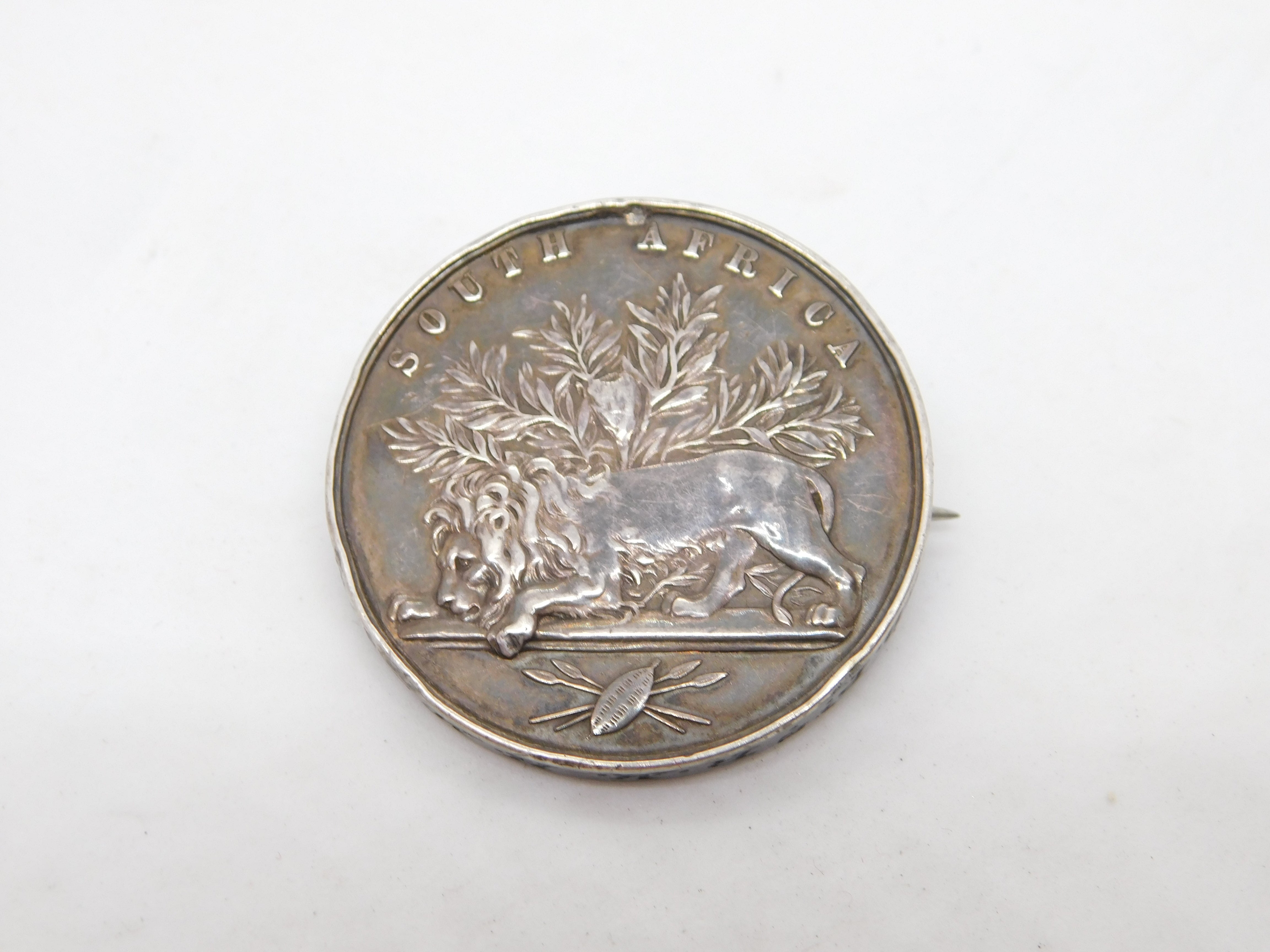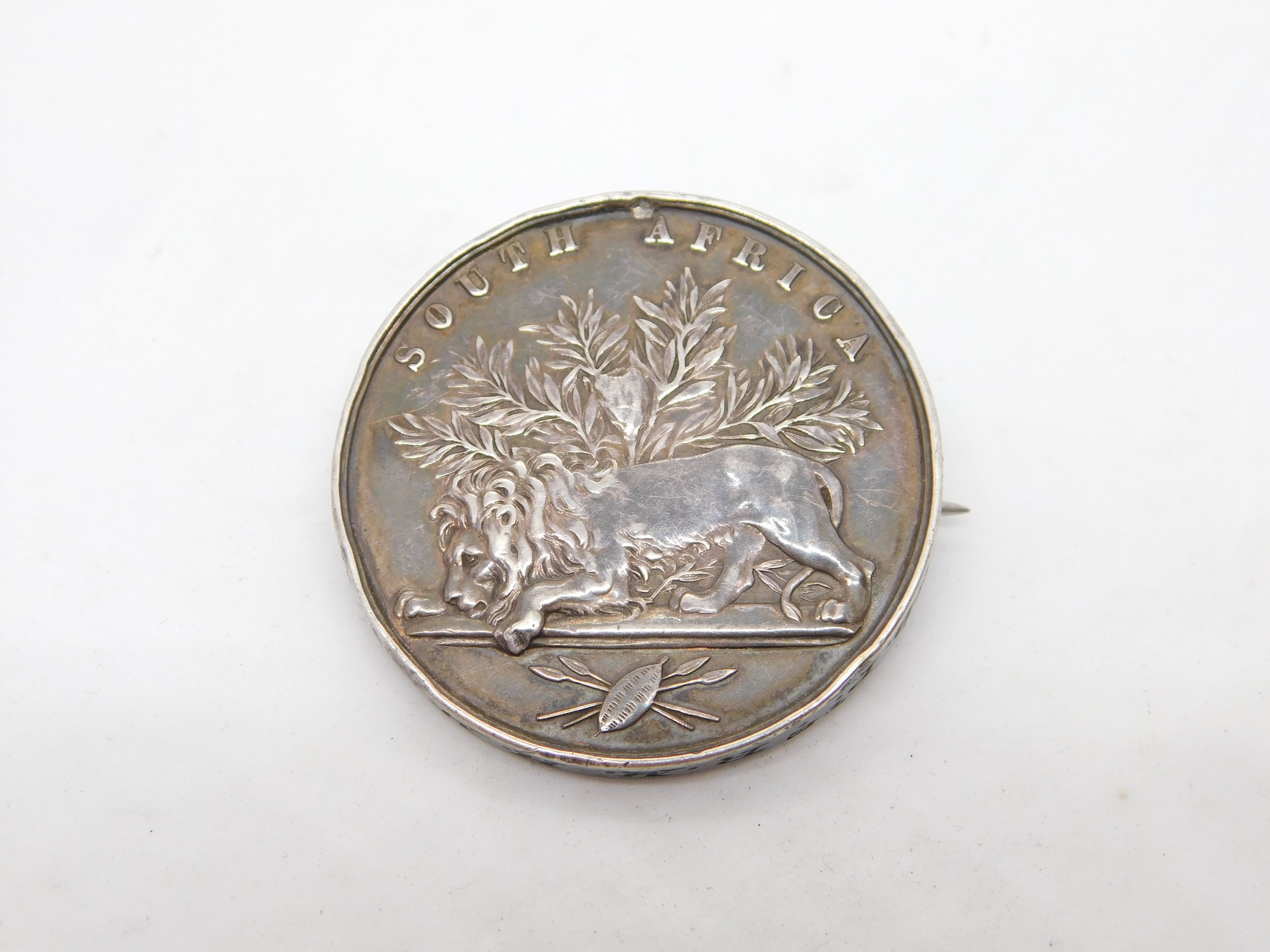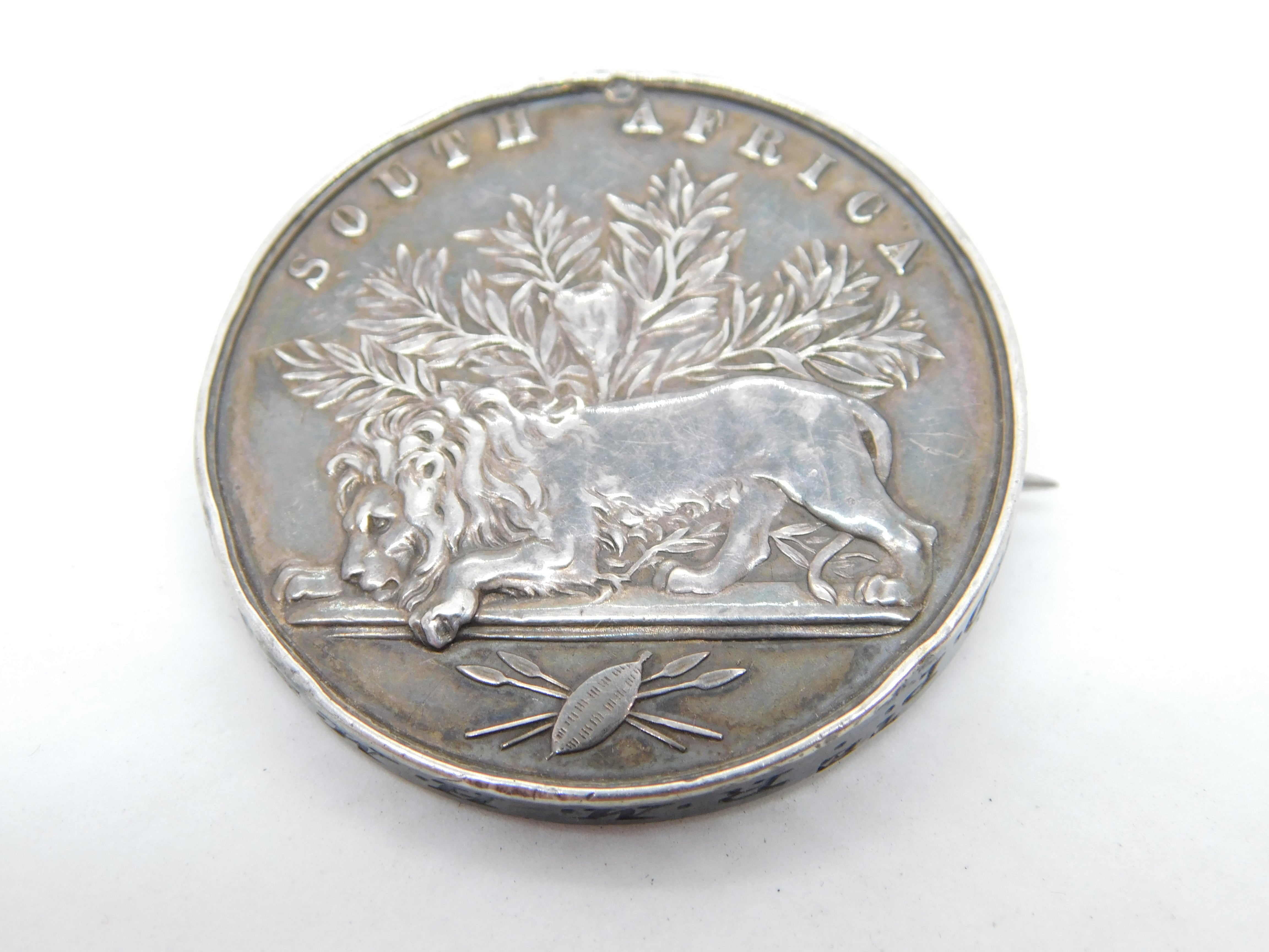 Details: A fantastic and wonderfully designed antique Victorian sterling silver British Army South Africa Medal (1880) or otherwise known as the Zulu War medal issued to Private Thomas Hayward of the Royal Marine Light Infantry who served upon the HMS Orontes during the Zulu war made famous for its role in transporting the body of Prince Imperial Louis-Napoleon back to England following his death in the war.  The medal has been later converted into a brooch. This is a wonderful item that would make a perfect gift or addition to any collection. The BOX pictured is for PRESENTATION ONLY and is NOT included in the listings but used to frame the pictures unless specifically stated otherwise.