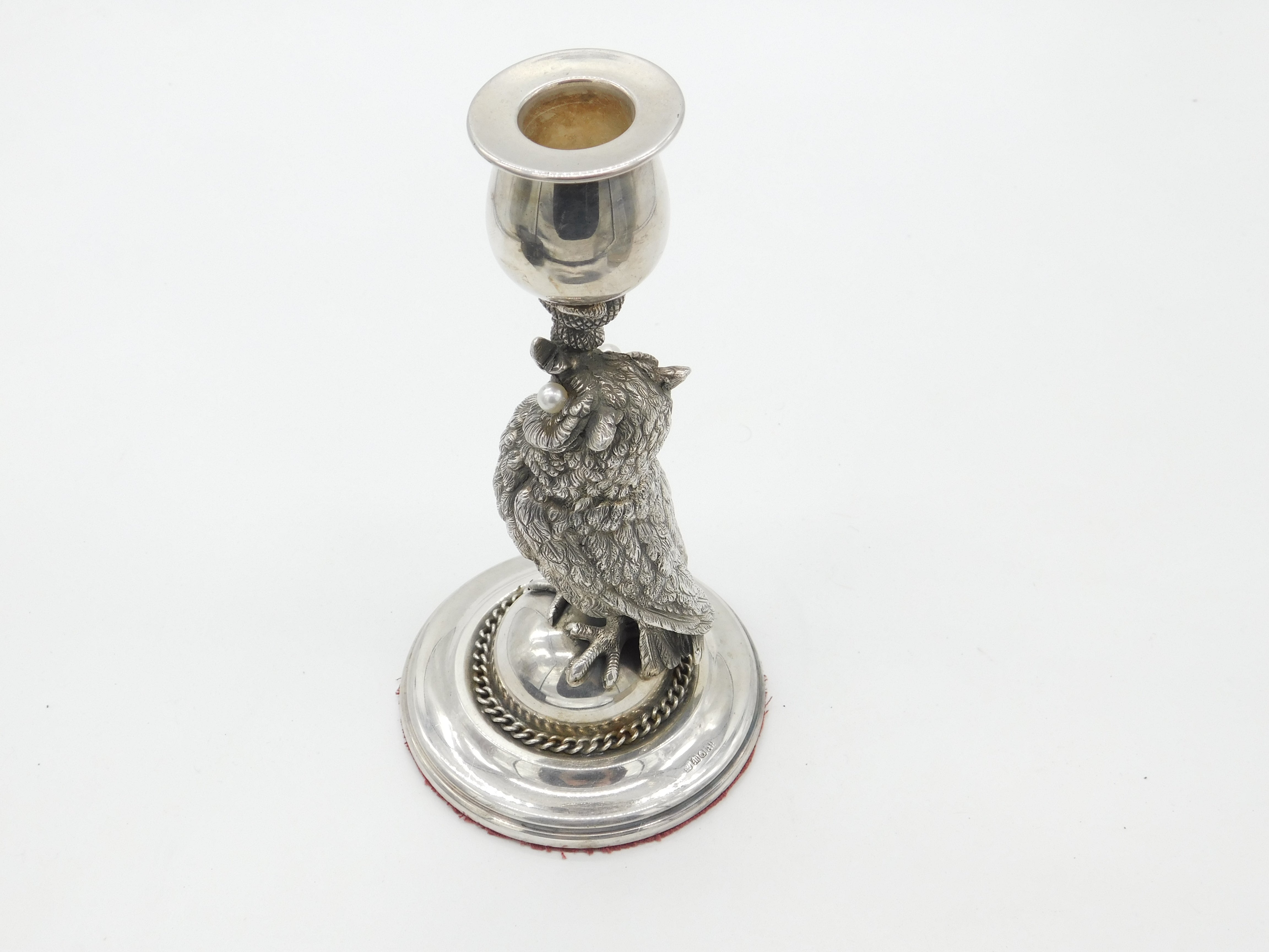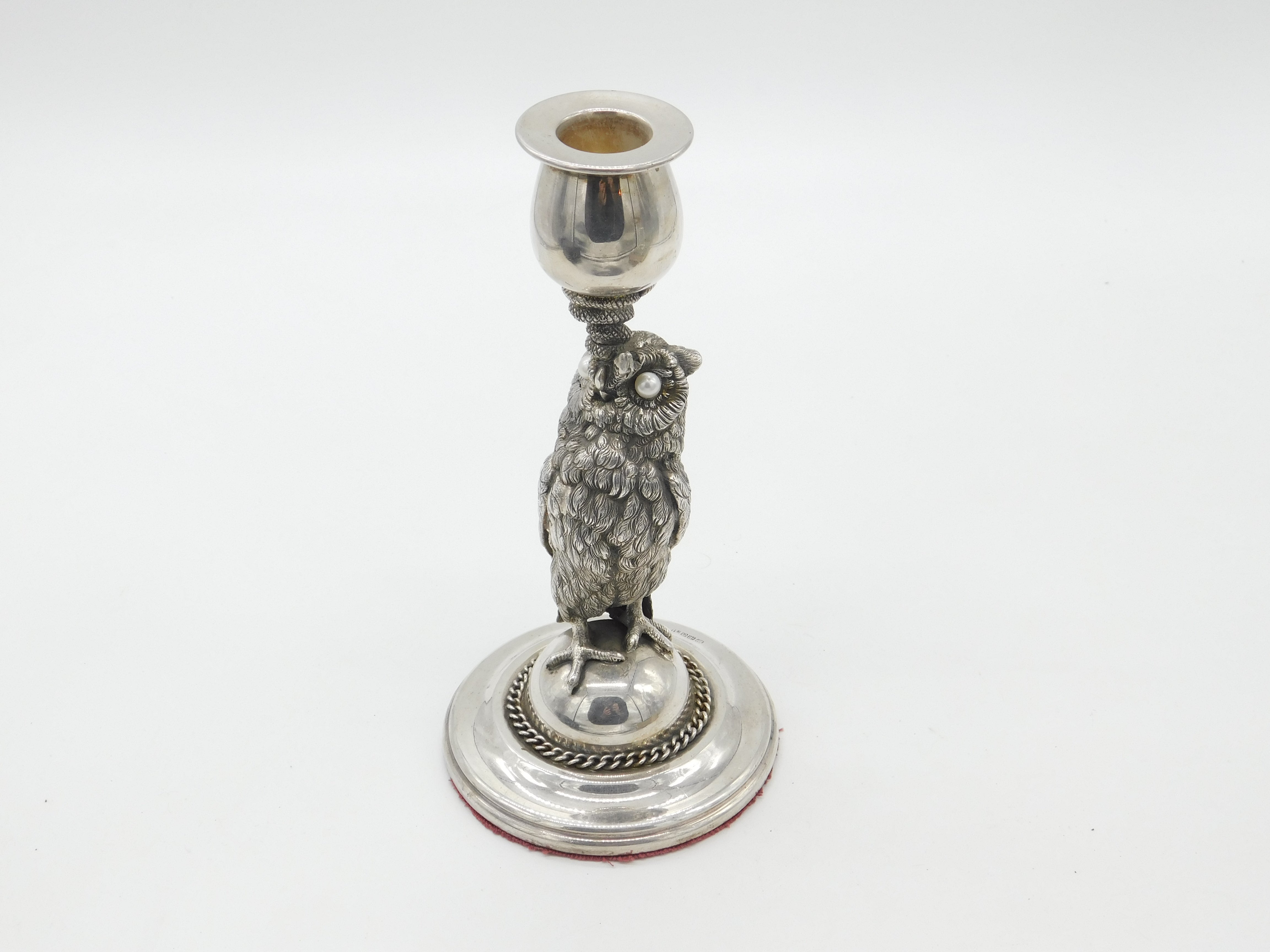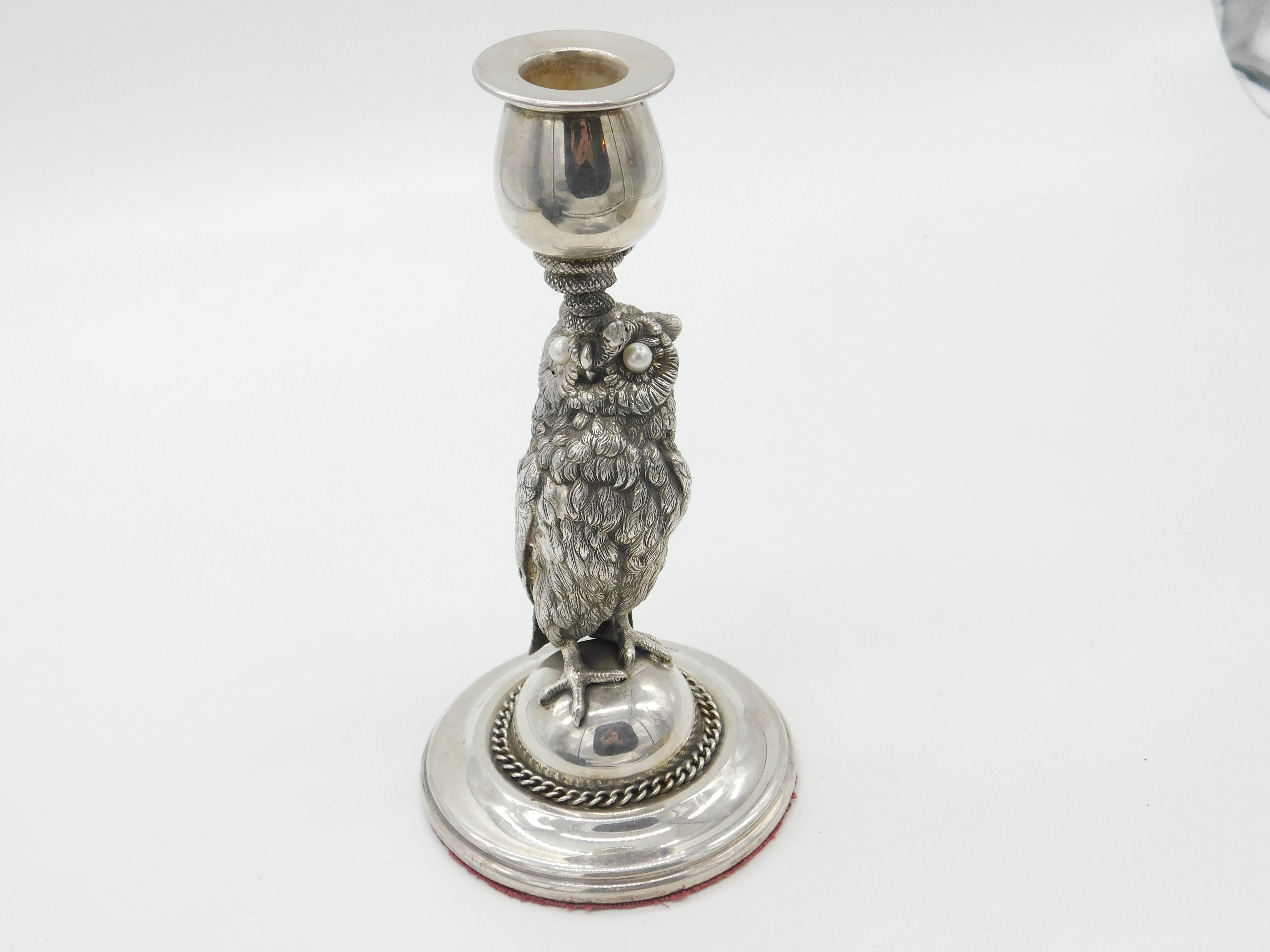 Details: A fantastic and wonderfully designed antique Victorian silver plated candlestick with super owl stem with serpent snake wrapped around marked with makers mark to the edge c1890. Weighted at the base and pearls for the eyes which may have been later added. This is a wonderful item that would make a perfect gift or addition to any collection. The BOX pictured is for PRESENTATION ONLY and is NOT included in the listings but used to frame the pictures unless specifically stated otherwise.