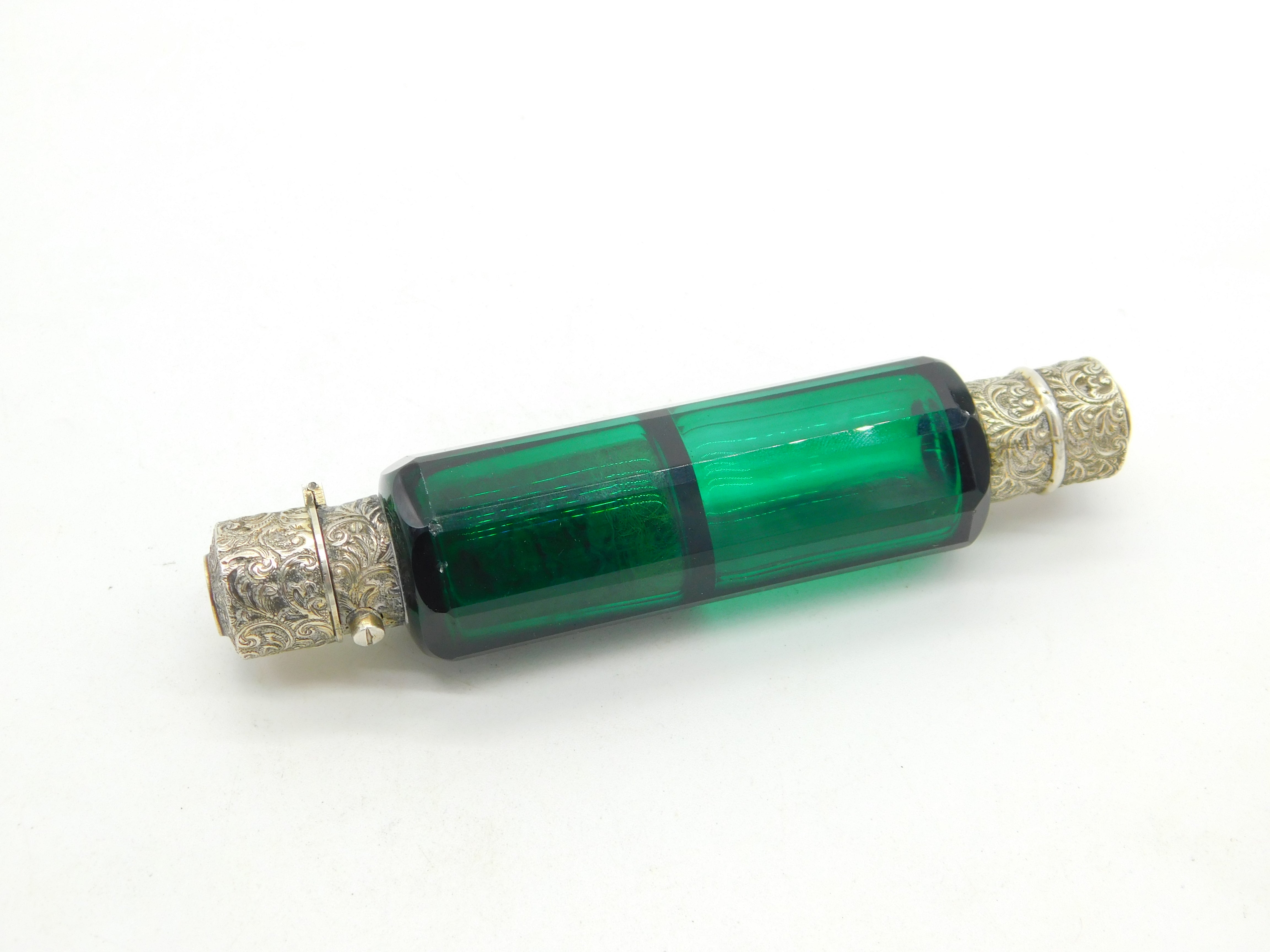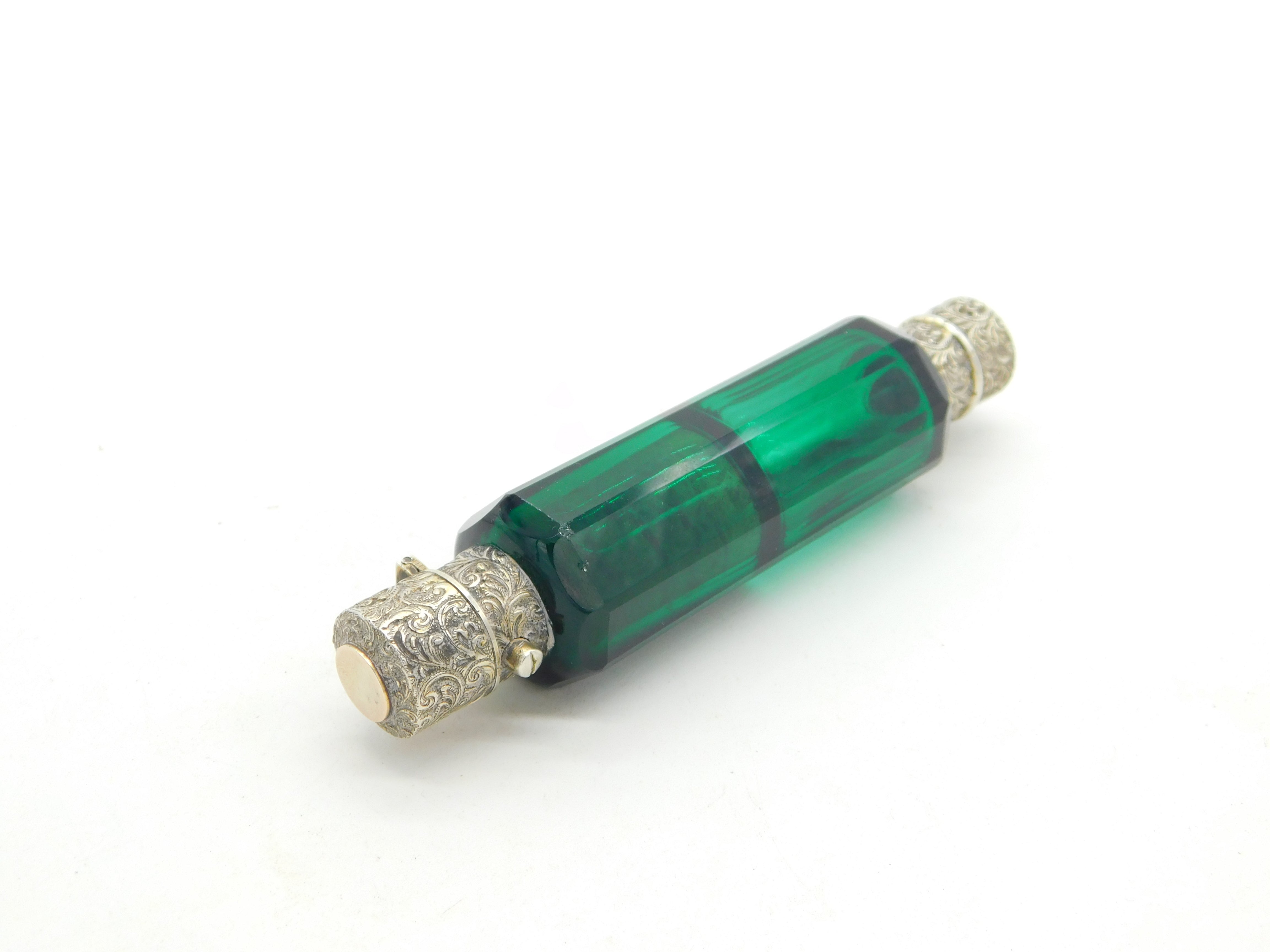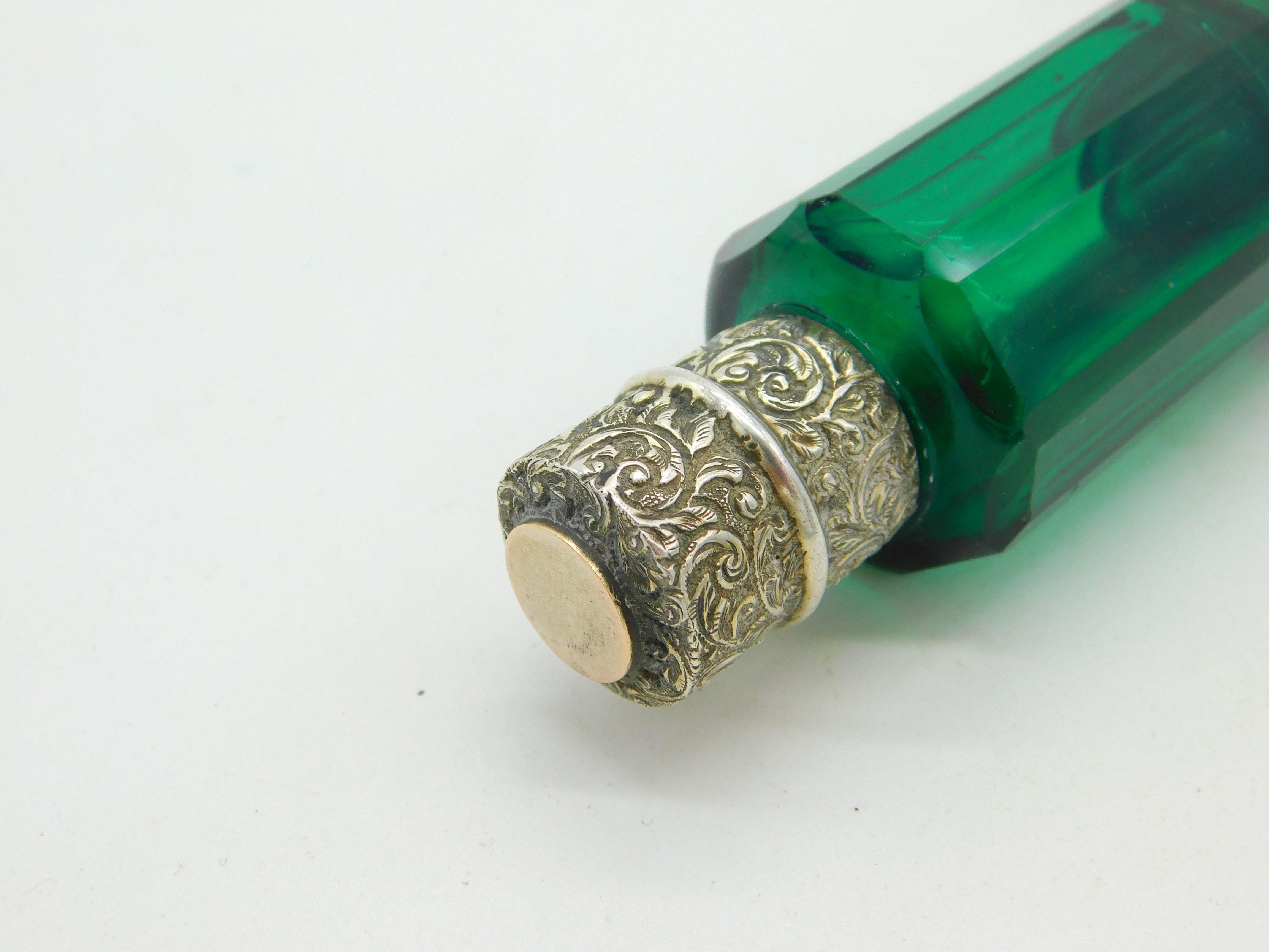 Details: A fantastic and wonderfully designed antique Victorian sterling silver double ended scent bottle with 9ct gold tops and green glass c1880. The silver and gold have been XRF tested as this is unmarked. The top has a makers mark possibly Sampson & Morden. A couple of tiny chips to the glass but generally excellent condition. This is a wonderful item that would make a perfect gift or addition to any collection. The BOX pictured is for PRESENTATION ONLY and is NOT included in the listings but used to frame the pictures unless specifically stated otherwise.