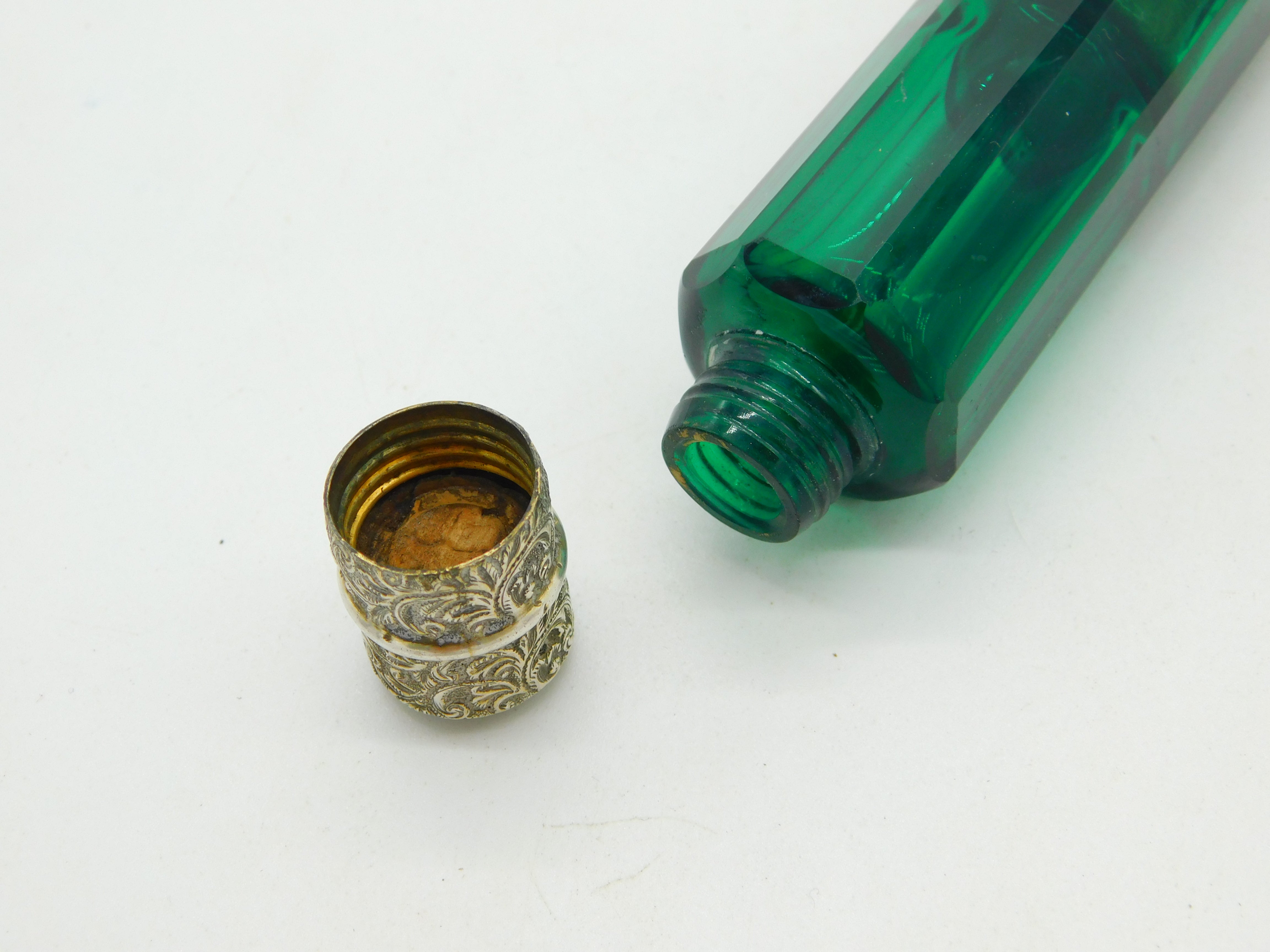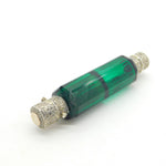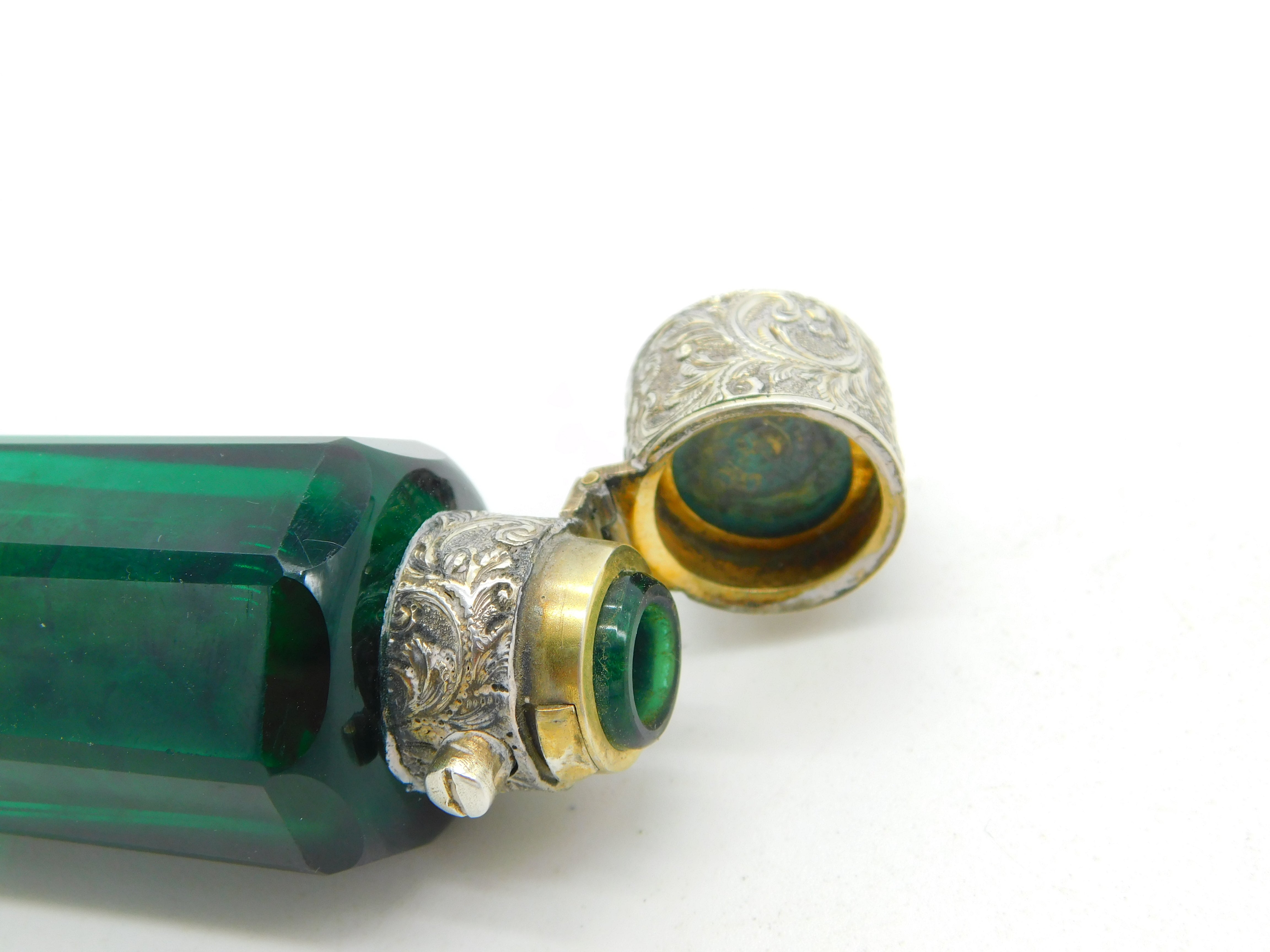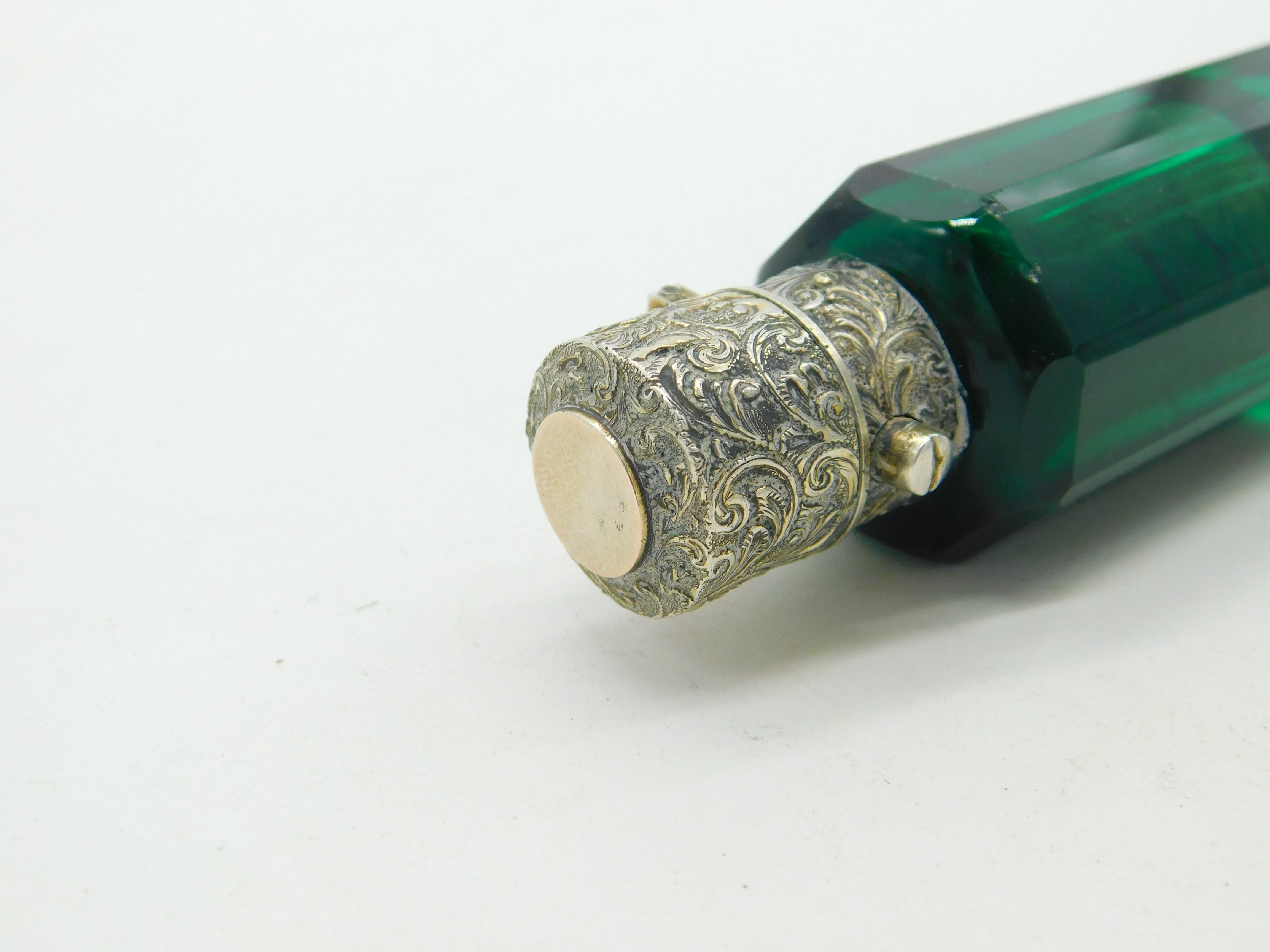 Details: A fantastic and wonderfully designed antique Victorian sterling silver double ended scent bottle with 9ct gold tops and green glass c1880. The silver and gold have been XRF tested as this is unmarked. The top has a makers mark possibly Sampson & Morden. A couple of tiny chips to the glass but generally excellent condition. This is a wonderful item that would make a perfect gift or addition to any collection. The BOX pictured is for PRESENTATION ONLY and is NOT included in the listings but used to frame the pictures unless specifically stated otherwise.