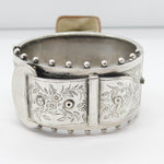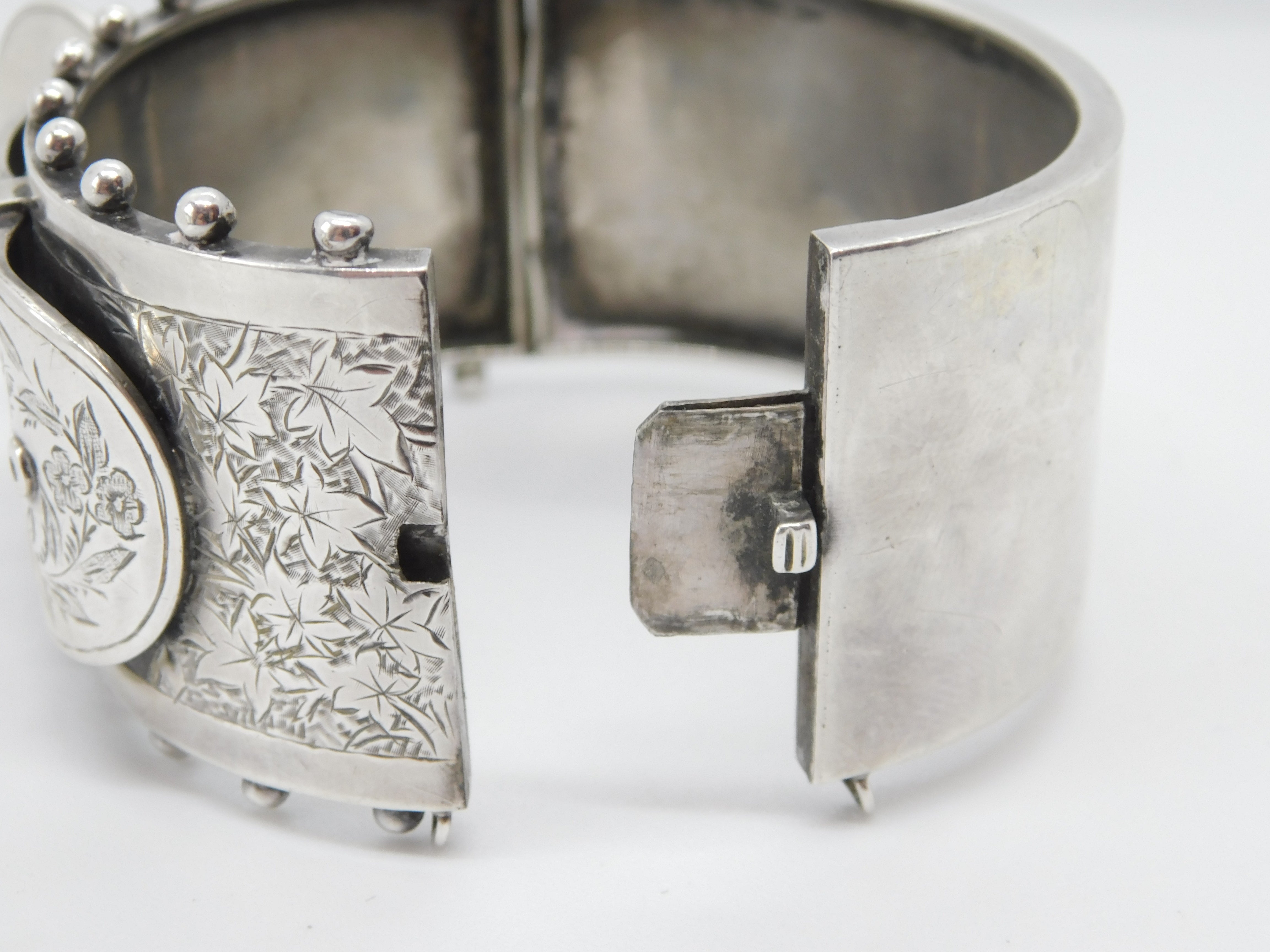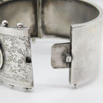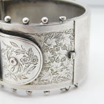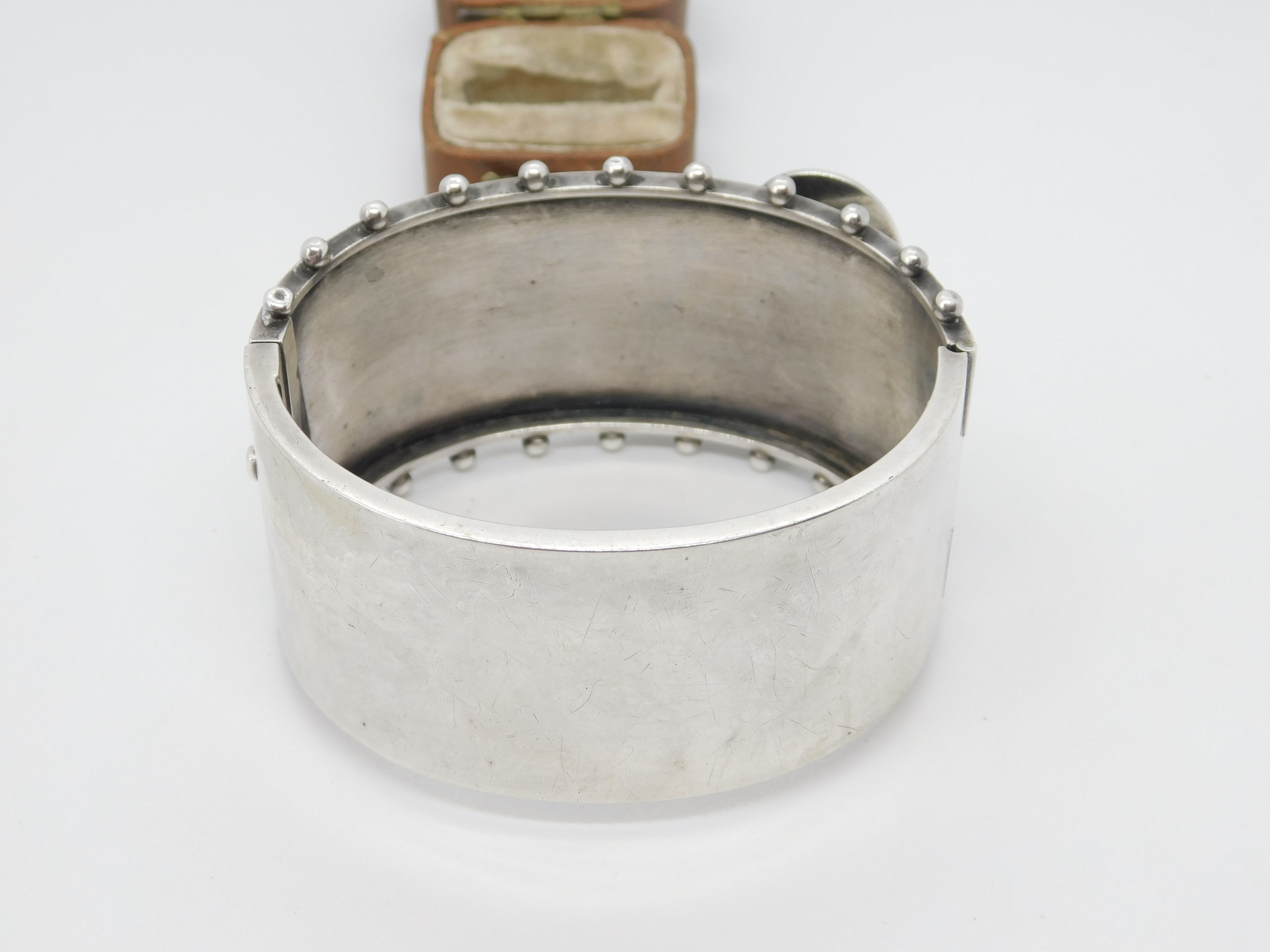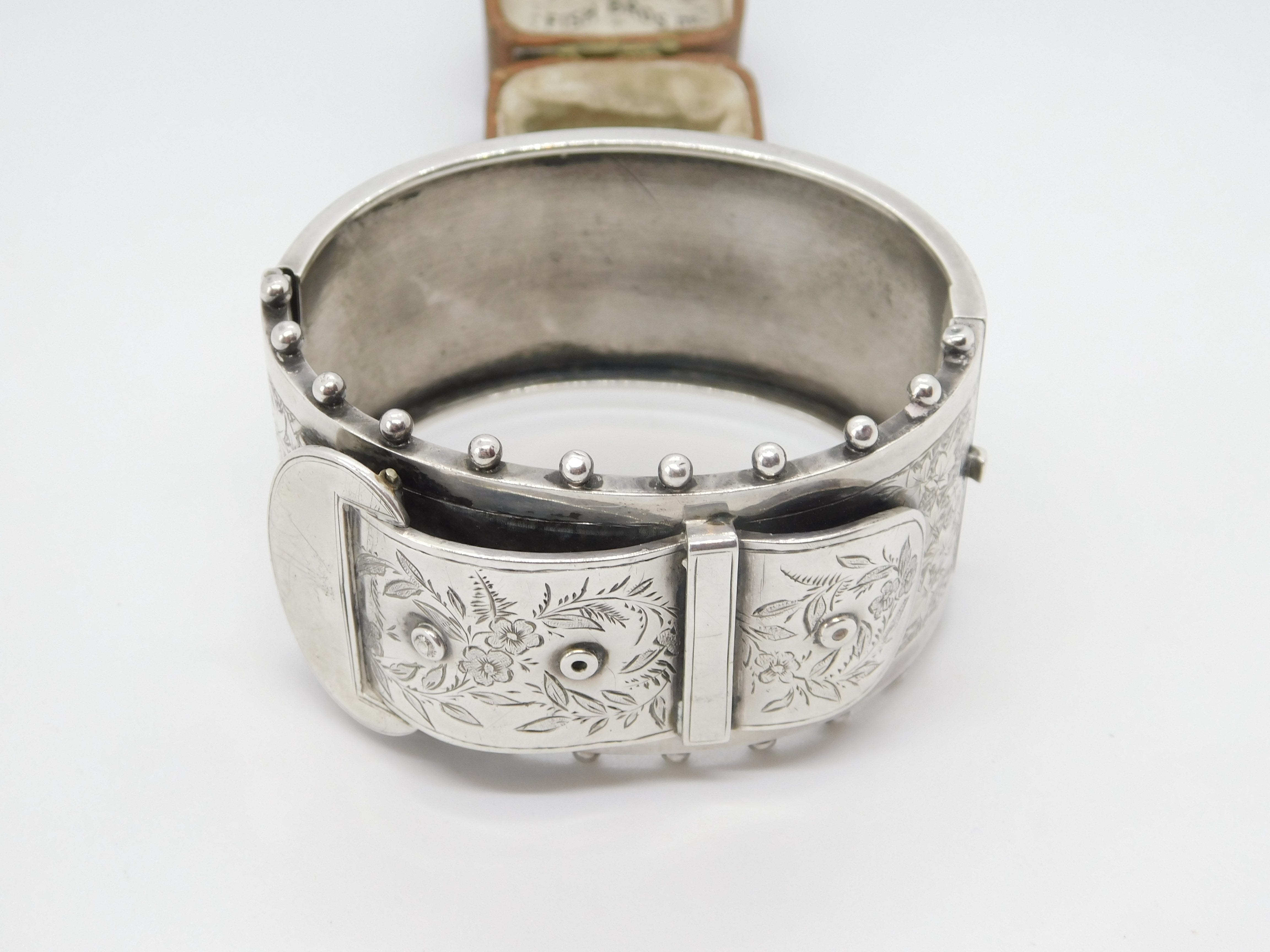 Details: A fantastic and wonderfully designed antique Victorian aesthetic movement sterling silver large cuff bangle bracelet with buckle detail to the front c1880, the silver has been XRF tested as it is unmarked. This is a wonderful item that would make a perfect gift or addition to any collection. The BOX pictured is for PRESENTATION ONLY and is NOT included in the listings but used to frame the pictures unless specifically stated otherwise.