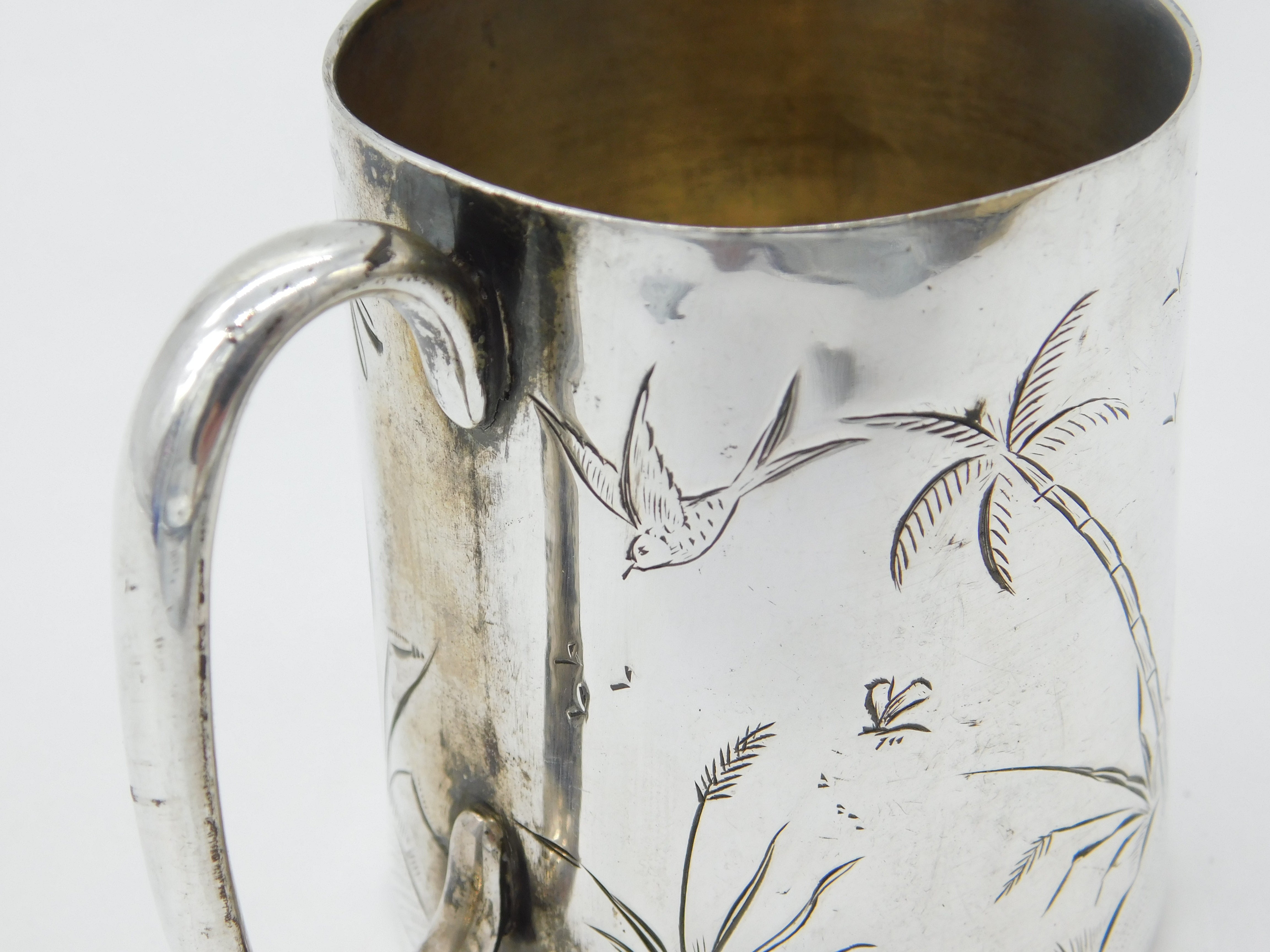 Details: A fantastic and wonderfully designed antique Victorian sterling silver christening mug or tankard with charming aesthetic movement patterns throughout in the form of birds and plants c1860 - the silver has been XRF tested as for some reason we cannot find any marks - almost certainly a handmade commission piece. Minor dings please study pictures. This is a wonderful item that would make a perfect gift or addition to any collection. The BOX pictured is for PRESENTATION ONLY and is NOT included in the listings but used to frame the pictures unless specifically stated otherwise.