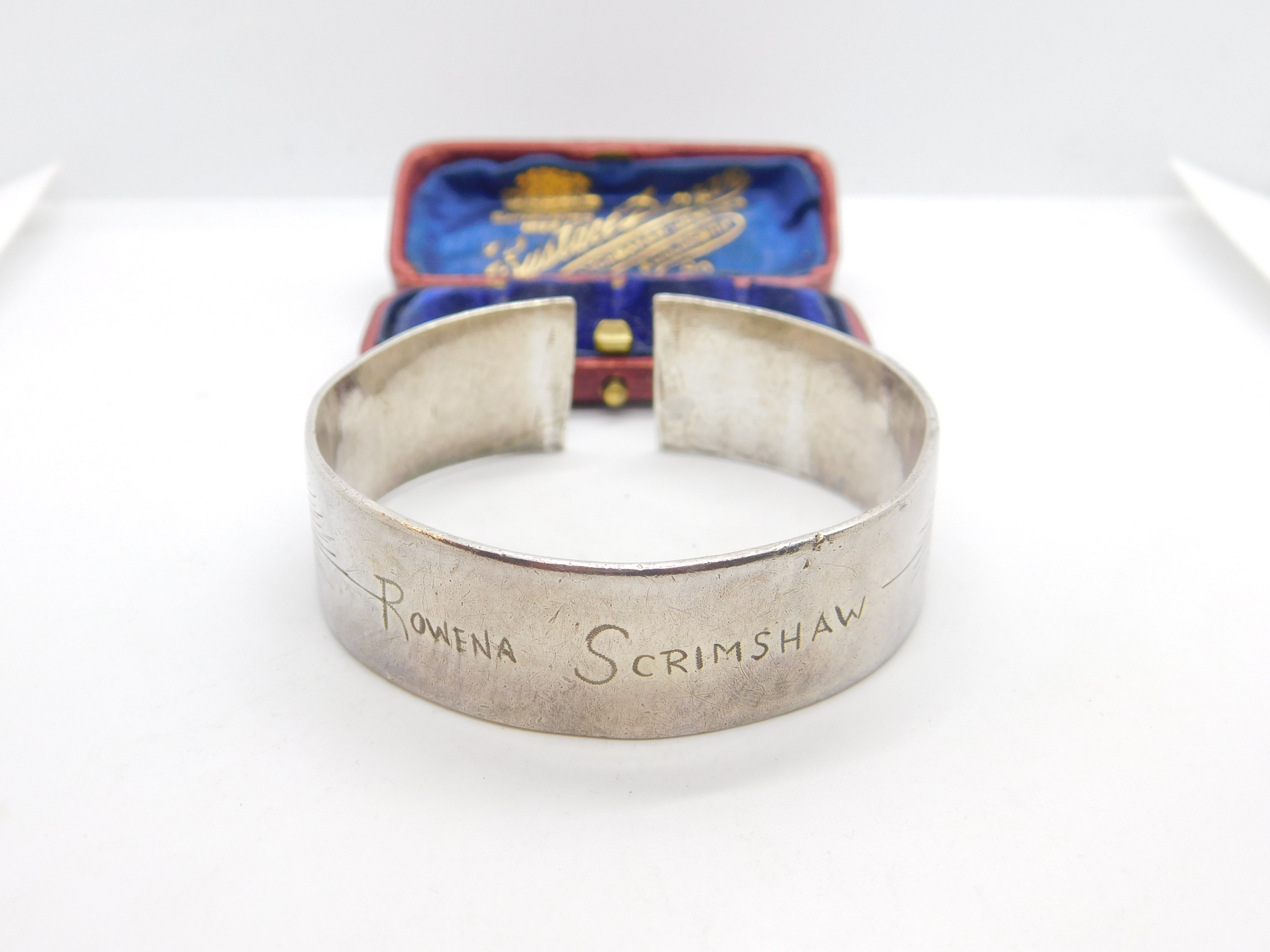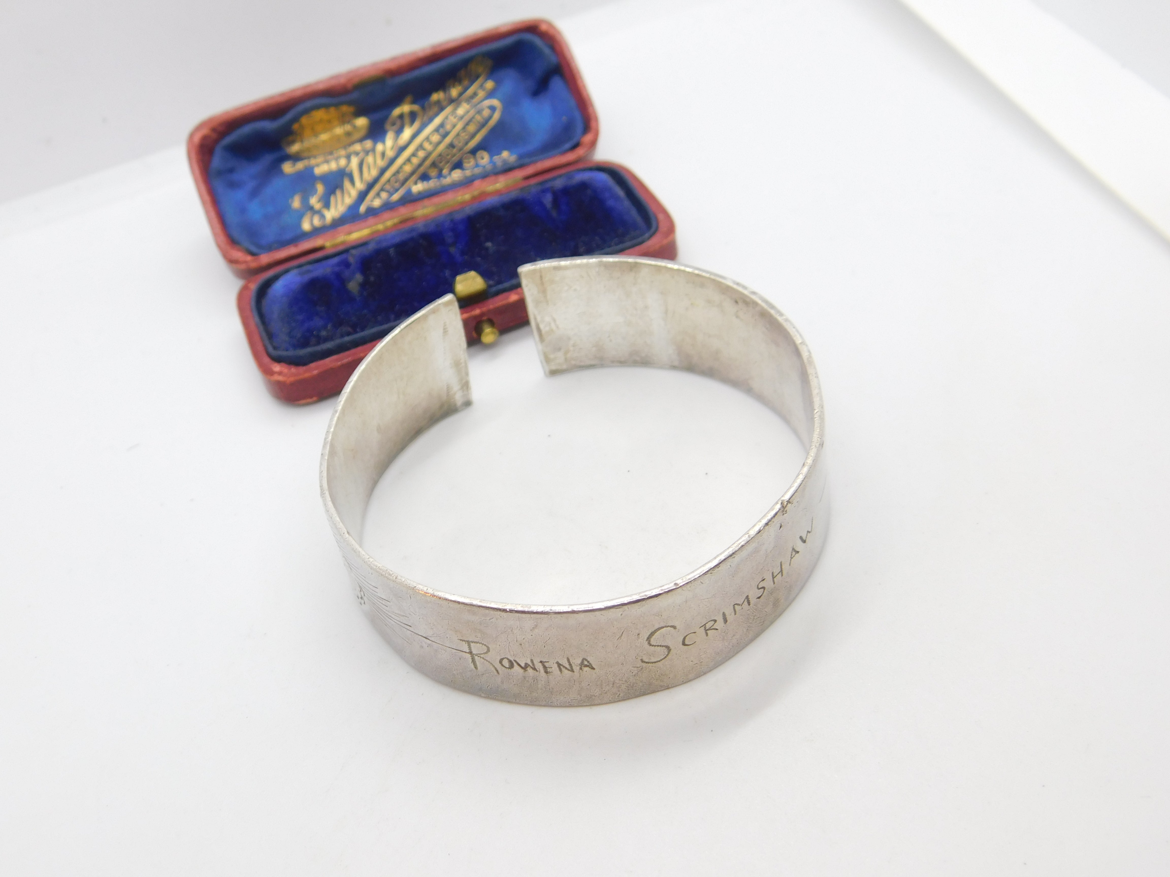 Details: A fantastic and wonderfully designed antique Victorian aesthetic movement heavy cast sweetheart bangle bracelet with Rowena Scrimshaw engraved to the front with floral decoration to the edges c1860 - the silver has been XRF tested. A wonderful early example.  This is a wonderful item that would make a perfect gift or addition to any collection. The BOX pictured is for PRESENTATION ONLY and is NOT included in the listings but used to frame the pictures unless specifically stated otherwise.