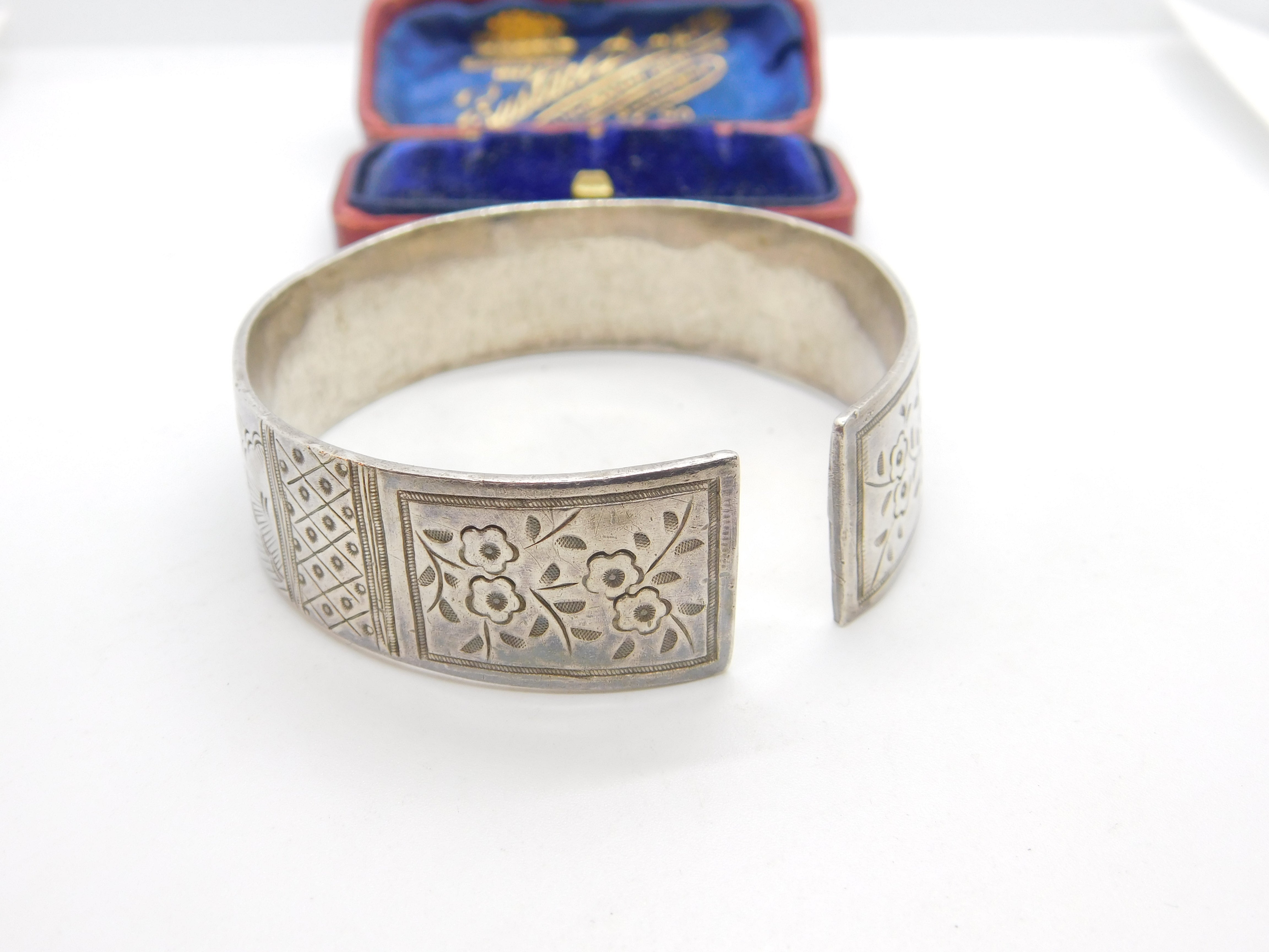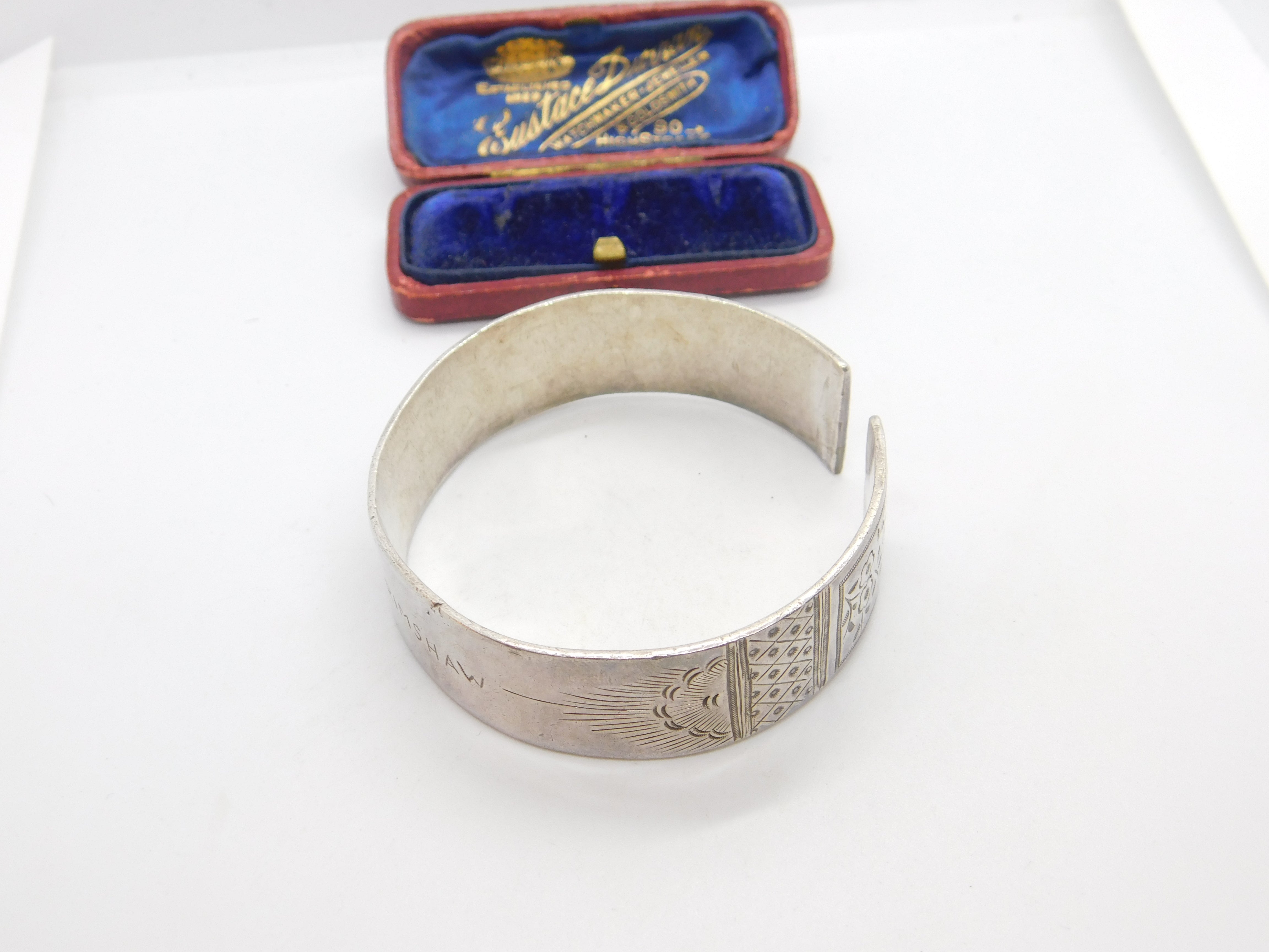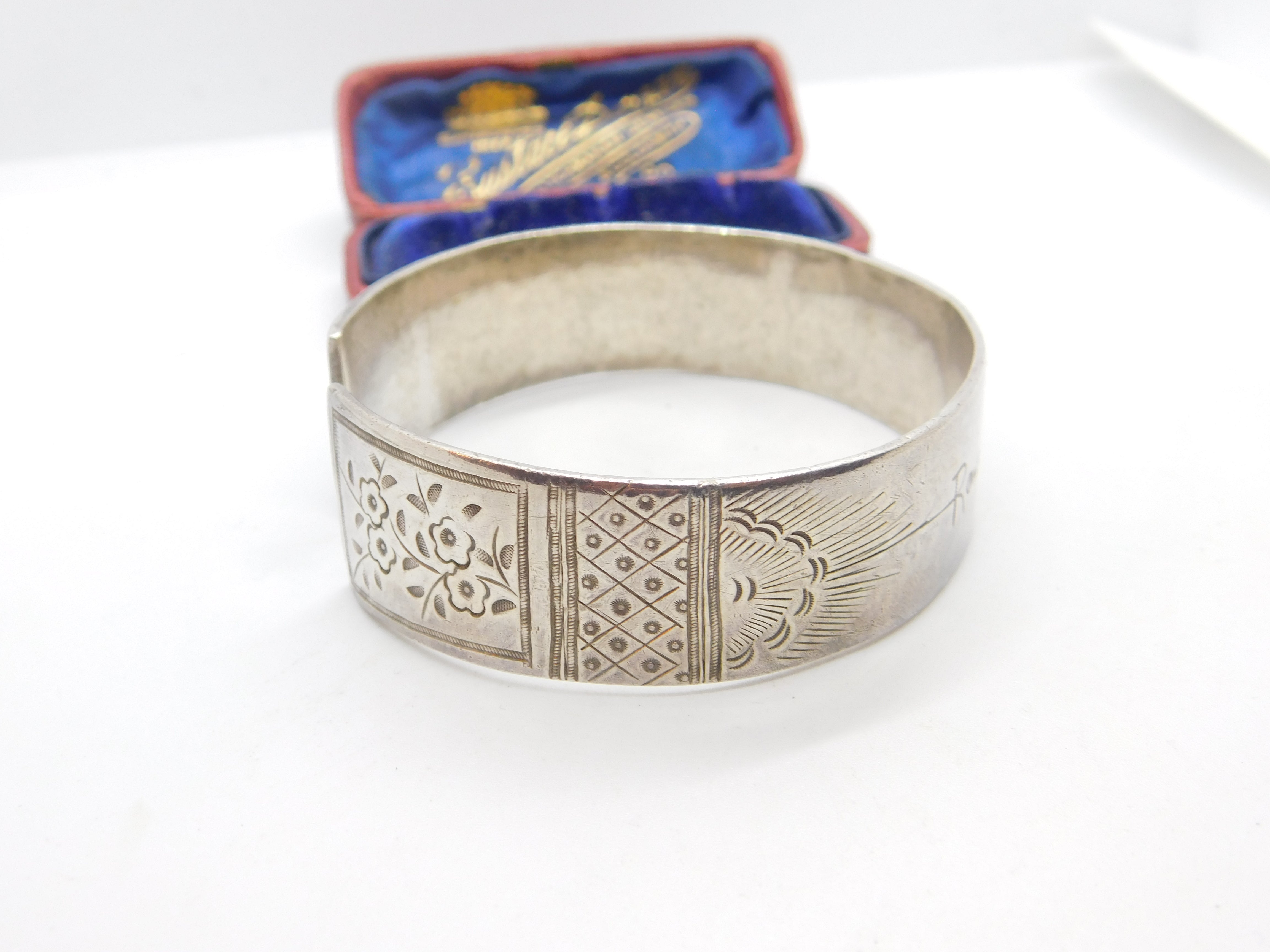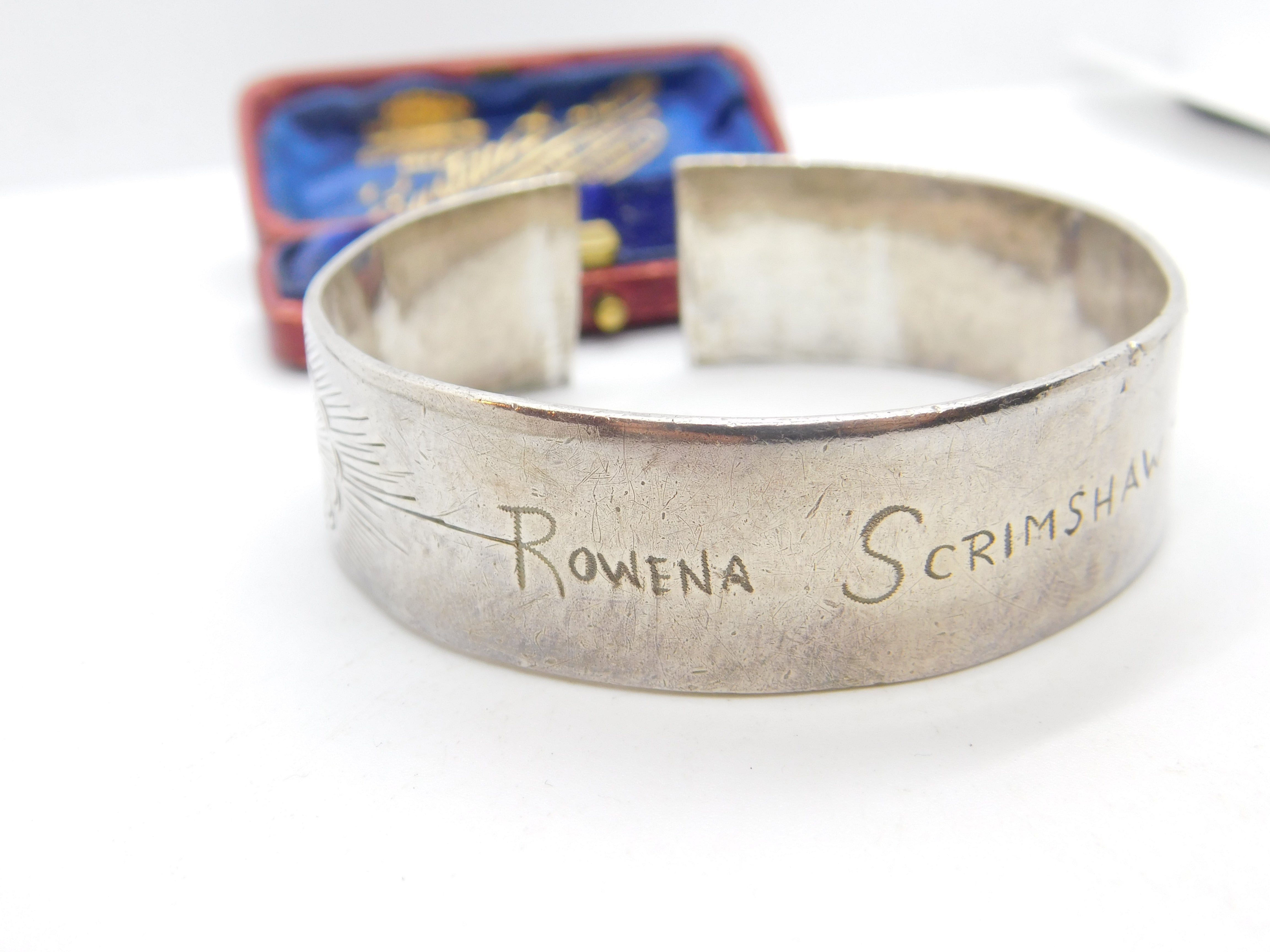 Victorian Sterling Silver Aesthetic 'Rowena Scrimshaw' Sweetheart Bangle c1860