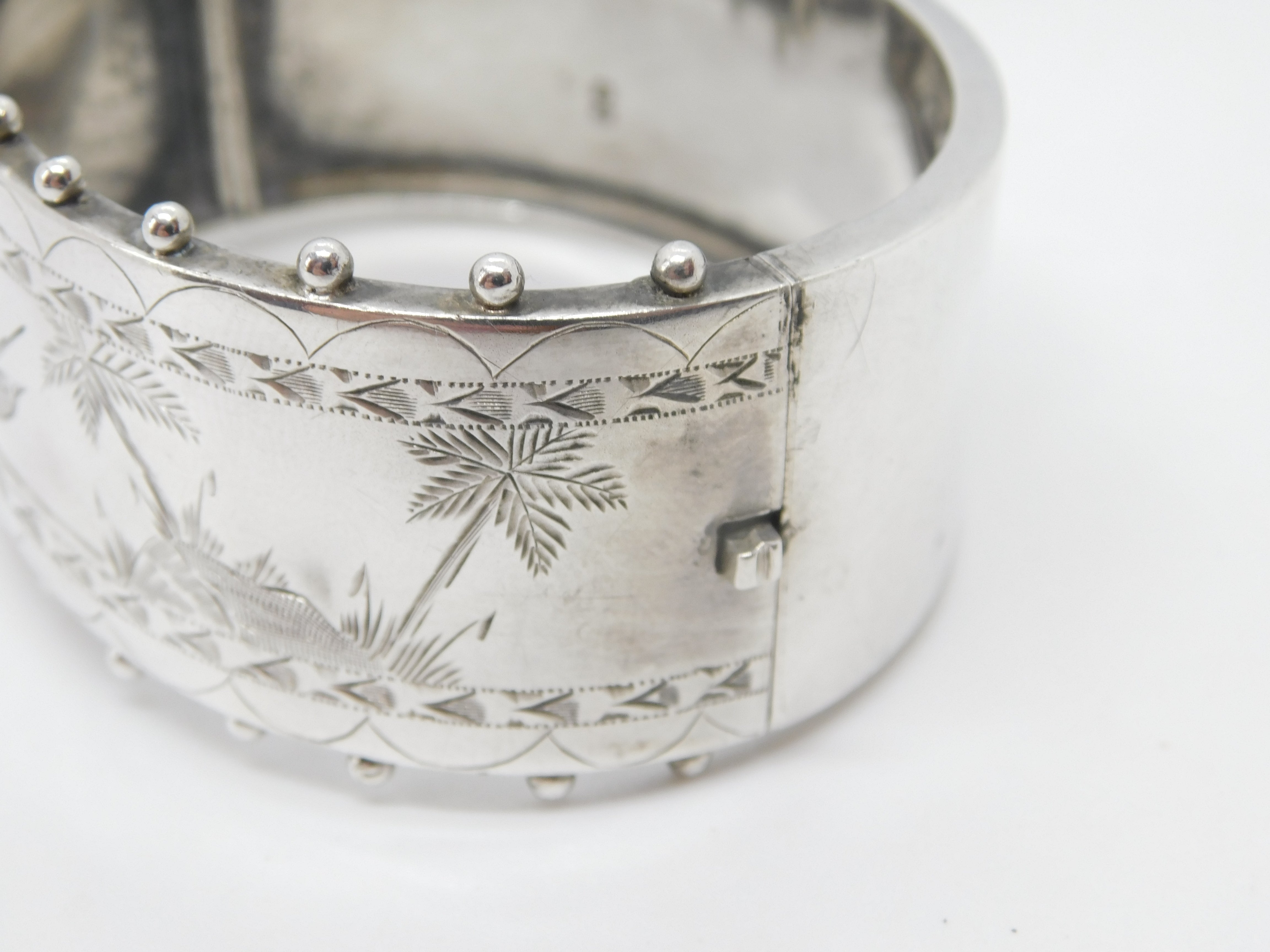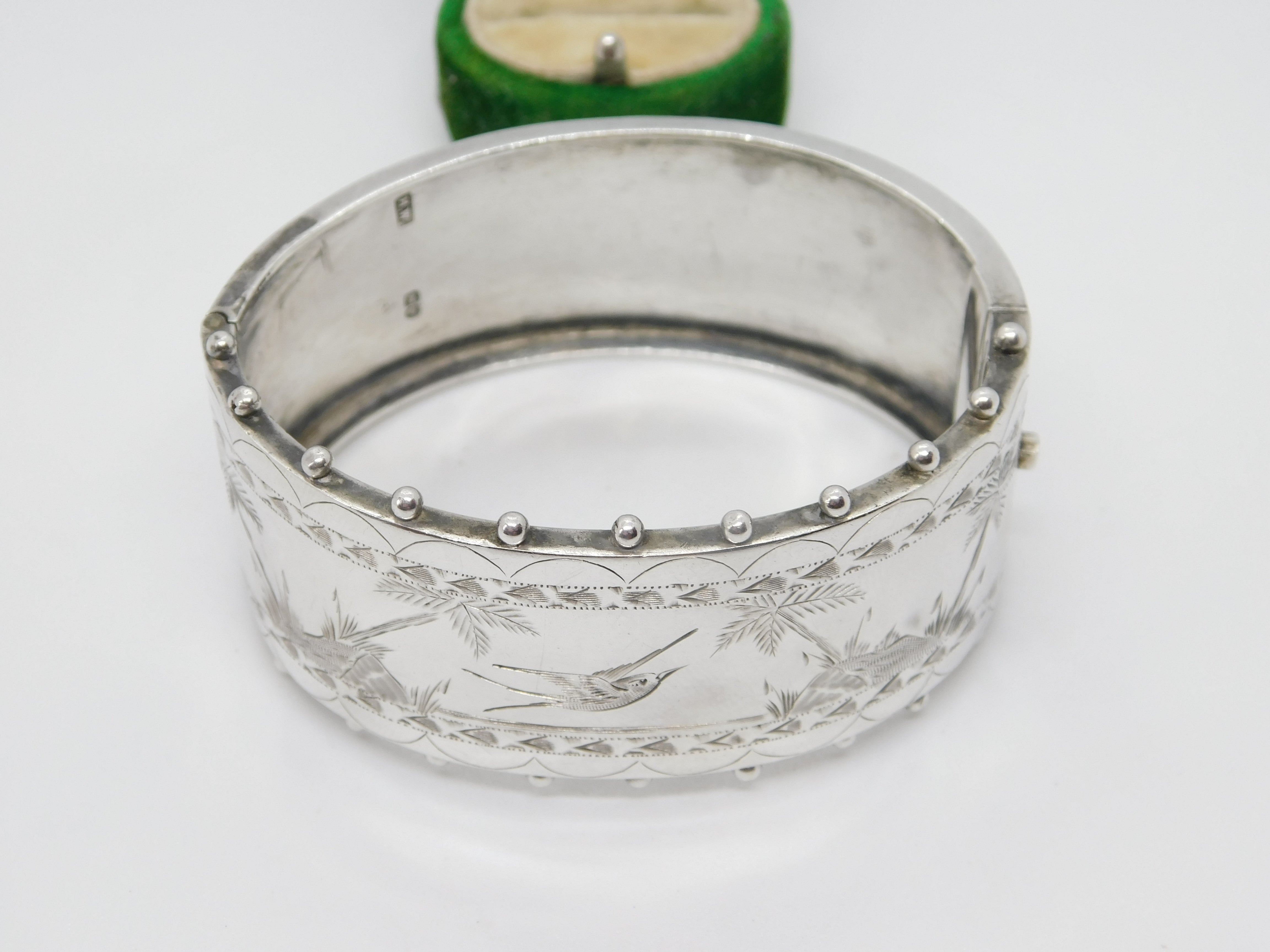 Details: A fantastic and wonderfully designed antique Victorian sterling silver aesthetic movement swallow pattern cuff bangle bracelet hallmarked London 1882 by Lee & Wigfull. Very minor dent to the front but generally a superb bangle. This is a wonderful item that would make a perfect gift or addition to any collection. The BOX pictured is for PRESENTATION ONLY and is NOT included in the listings but used to frame the pictures unless specifically stated otherwise.