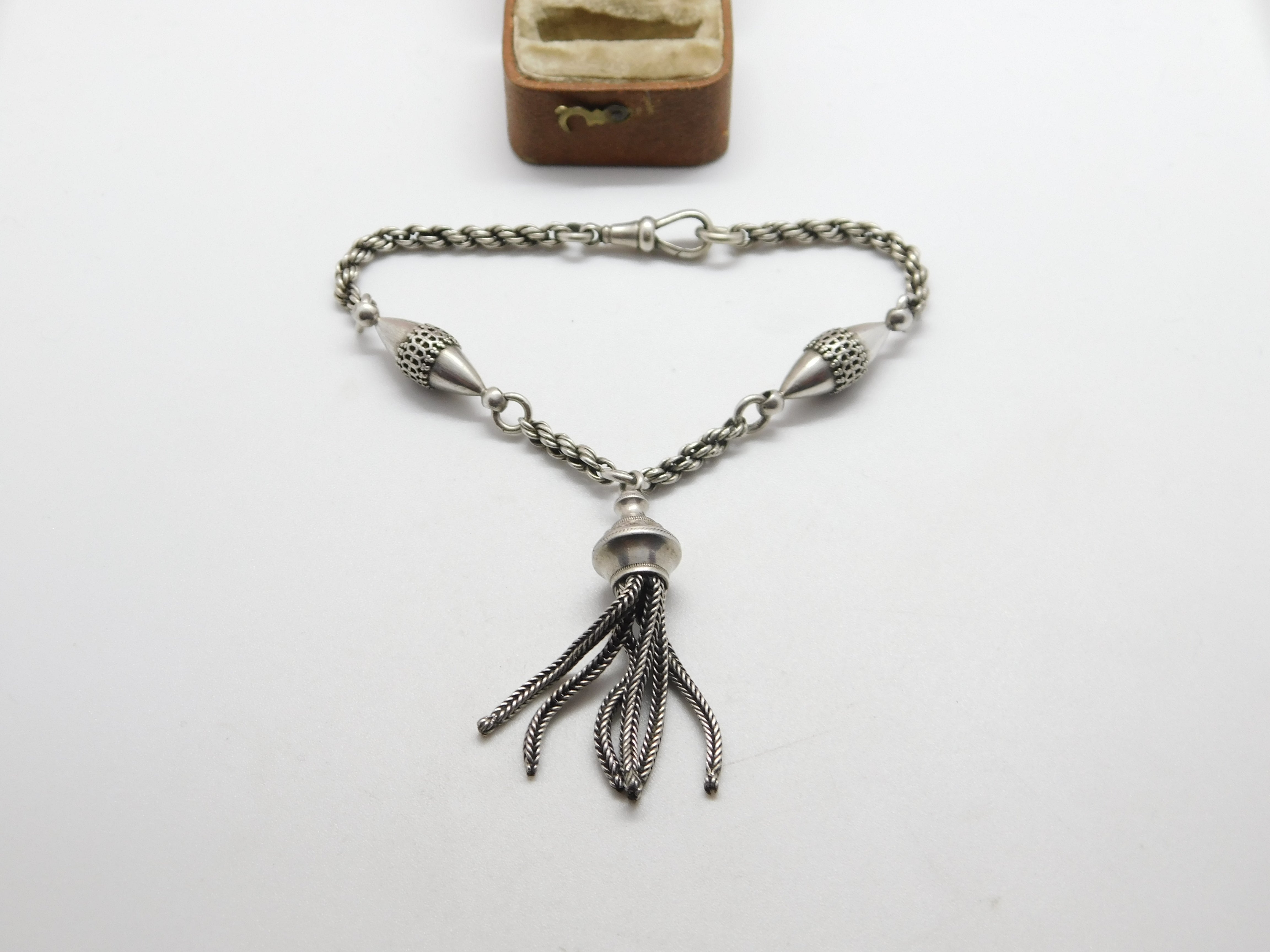 Details: A fantastic and wonderfully designed antique Victorian sterling silver albertina tassel bracelet with lovely detailing c1860, the silver has been XRF tested. This is a wonderful item that would make a perfect gift or addition to any collection. The BOX pictured is for PRESENTATION ONLY and is NOT included in the listings but used to frame the pictures unless specifically stated otherwise.