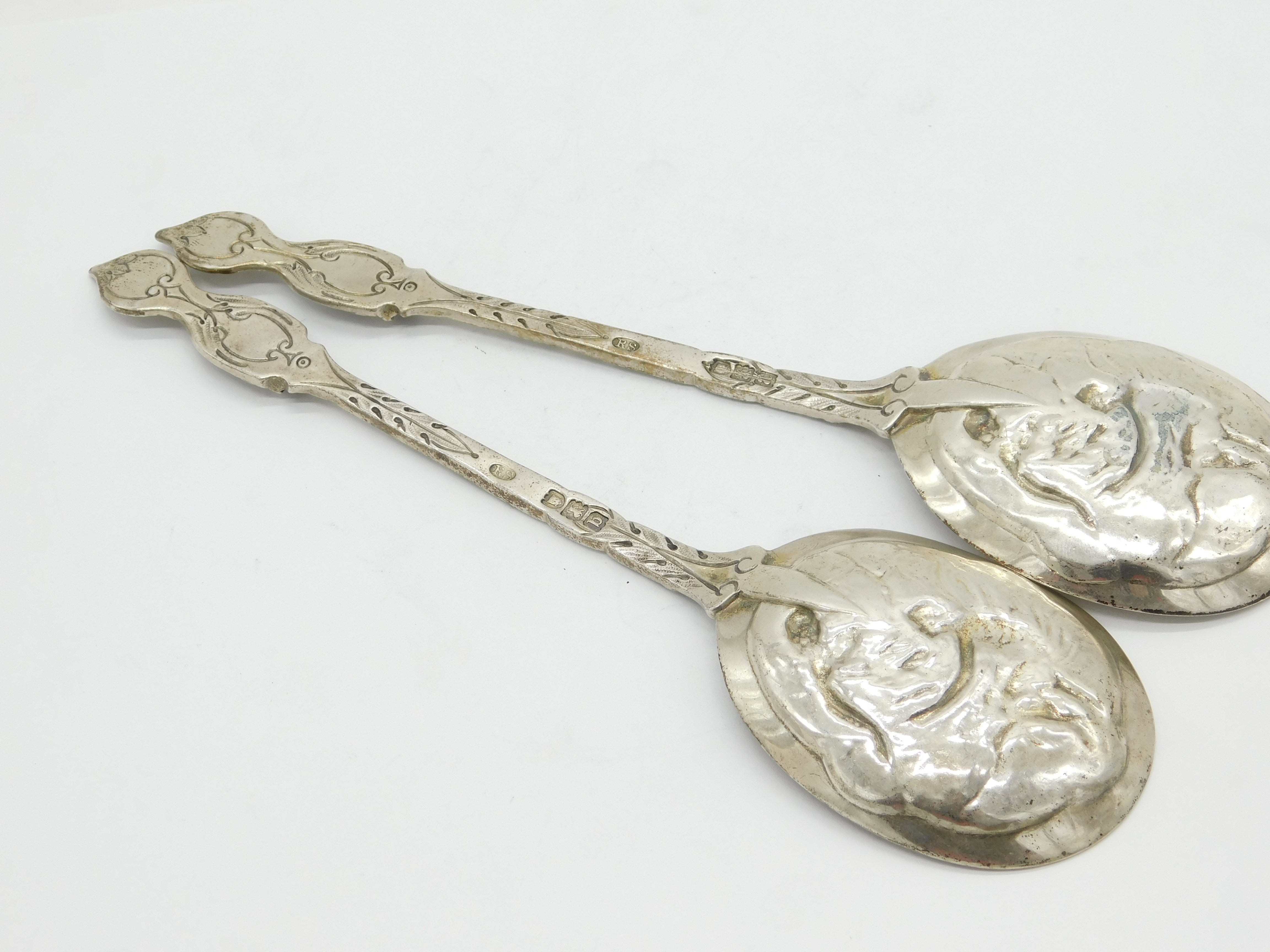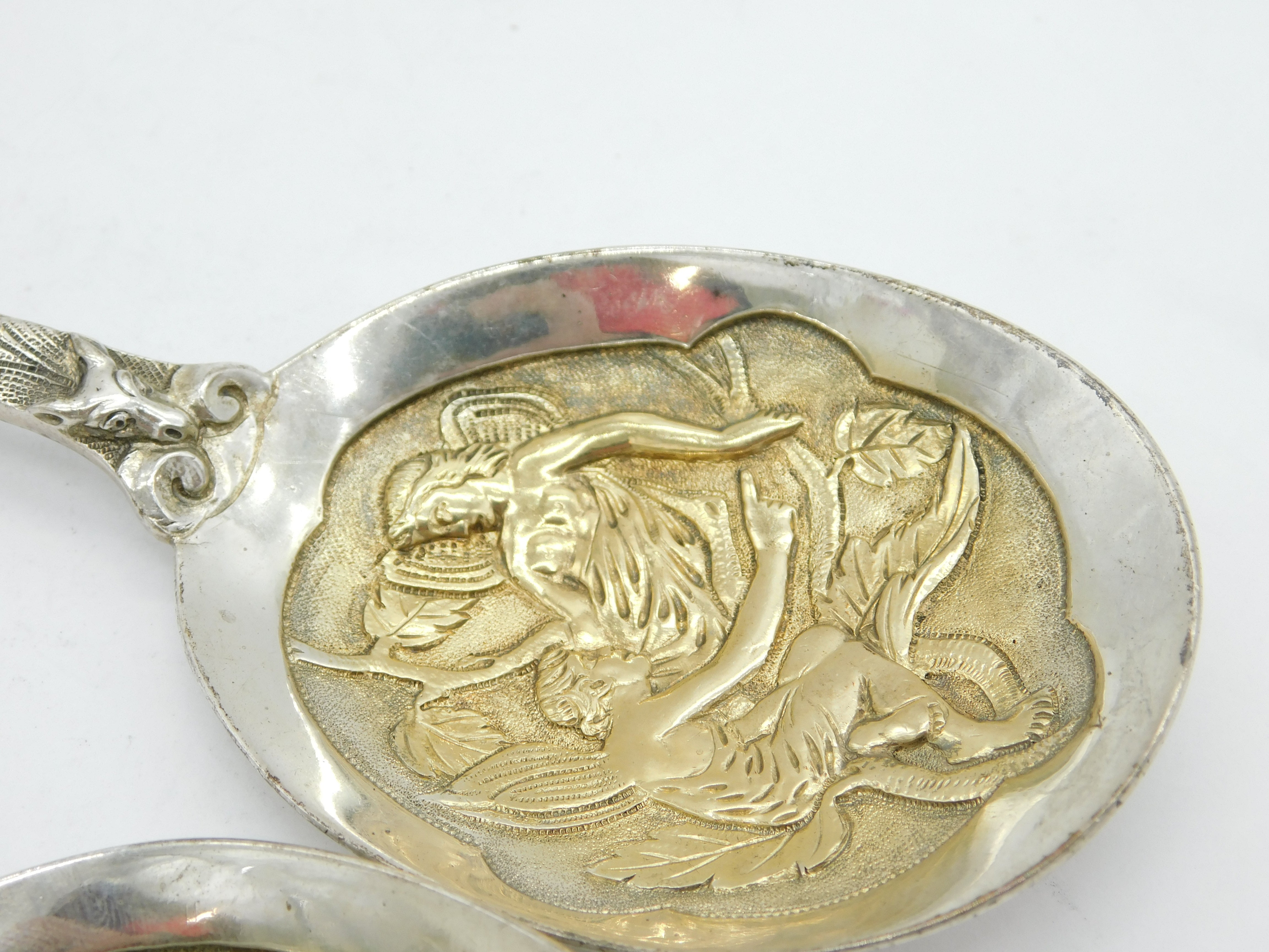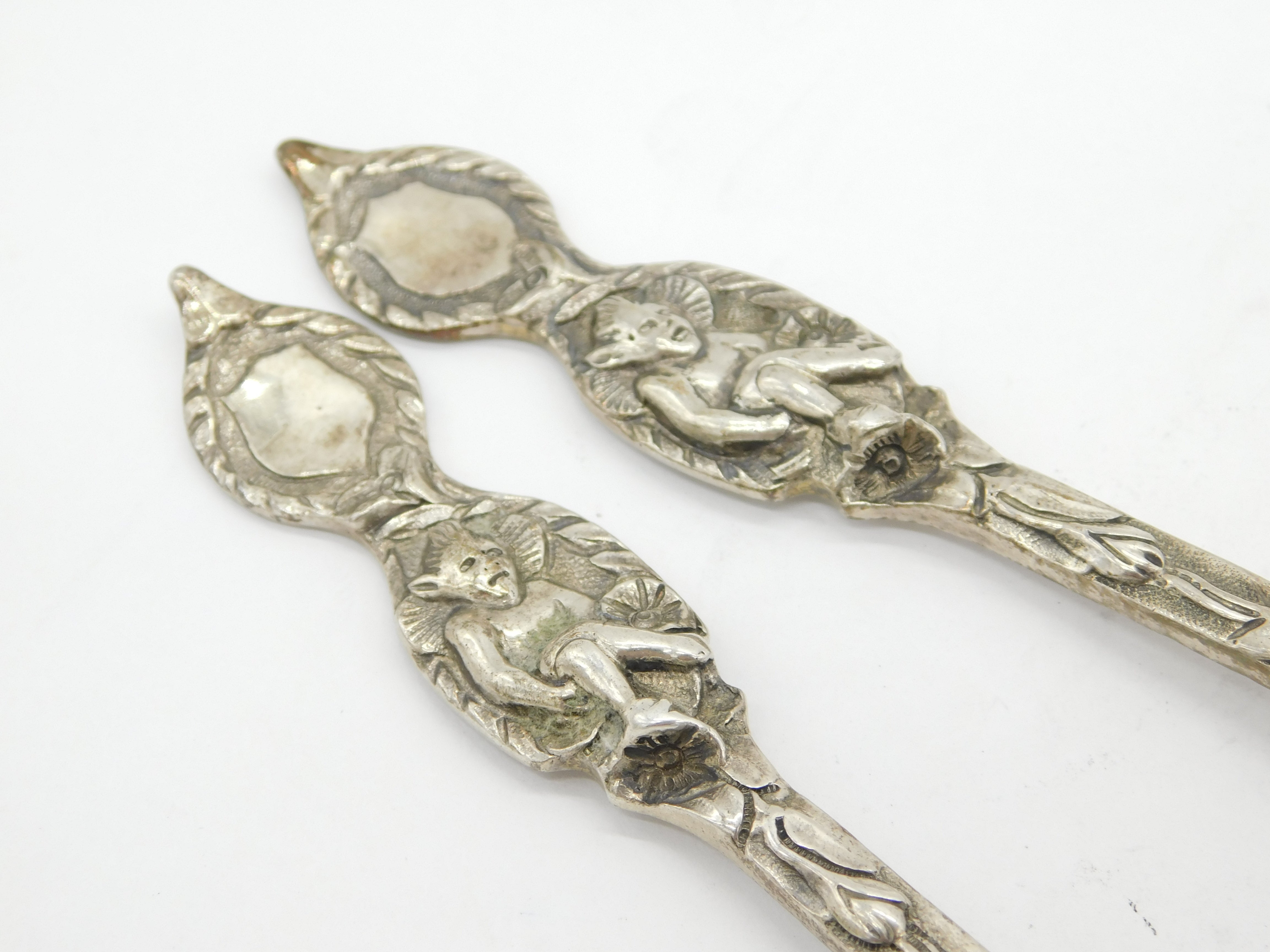 Details: A fantastic and wonderfully designed antique Victorian pair of sterling silver art nouveau ornate fairy & floral pattern decorative spoons with little elves to the terminal, hallmarked London 1897 by Robert Stebbings. This is a wonderful item that would make a perfect gift or addition to any collection. We are more than happy to provide XRF reports for items upon request.
