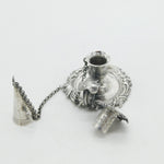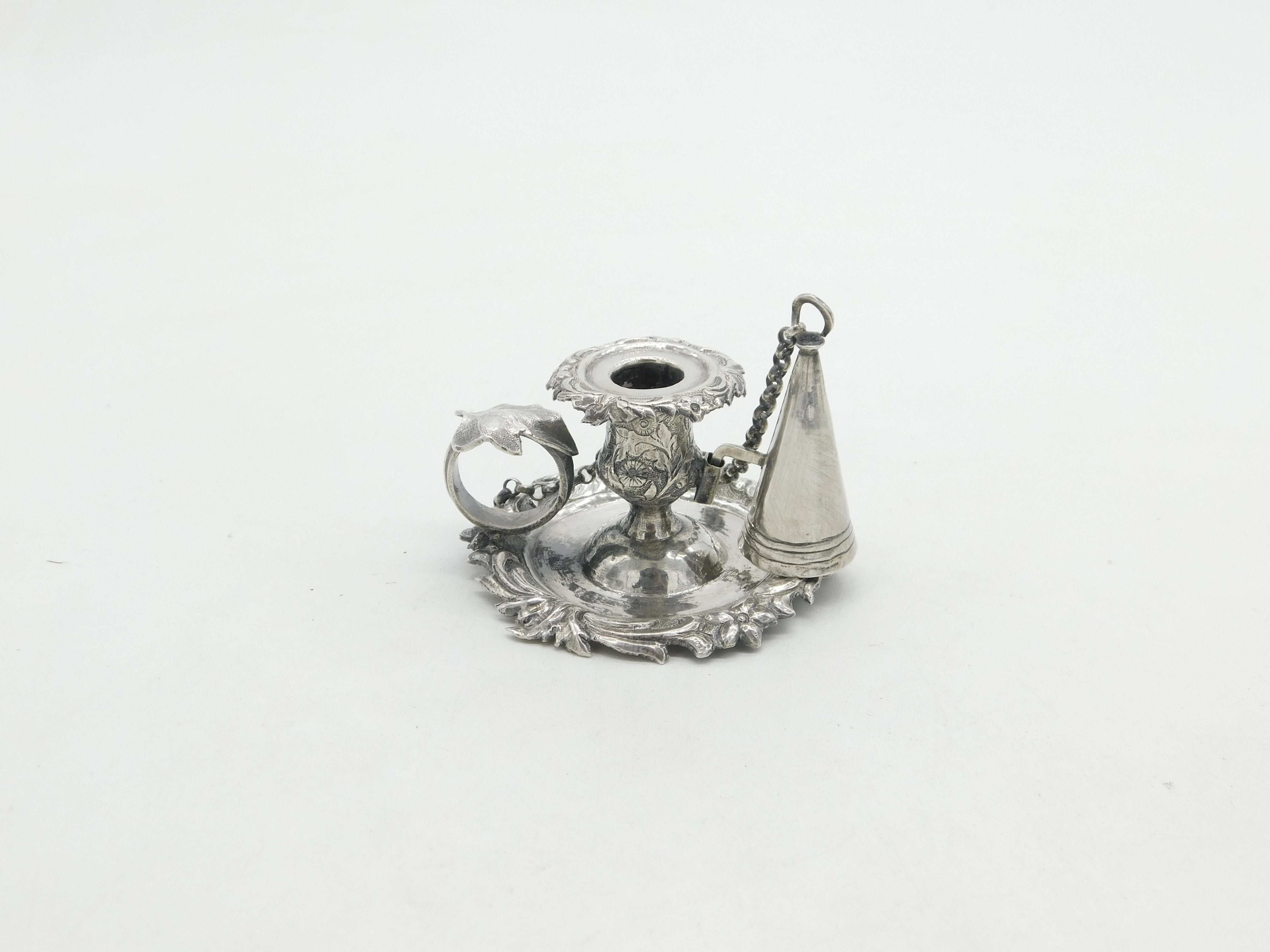 Details: A fantastic and wonderfully designed antique Victorian sterling silver small chamberstick with snuffer and lovely art nouveau leaf patterns throughout c1880, the silver has been XRF tested as we cannot find any marks. This is a wonderful item that would make a perfect gift or addition to any collection. The BOX pictured is for PRESENTATION ONLY and is NOT included in the listings but used to frame the pictures unless specifically stated otherwise.