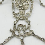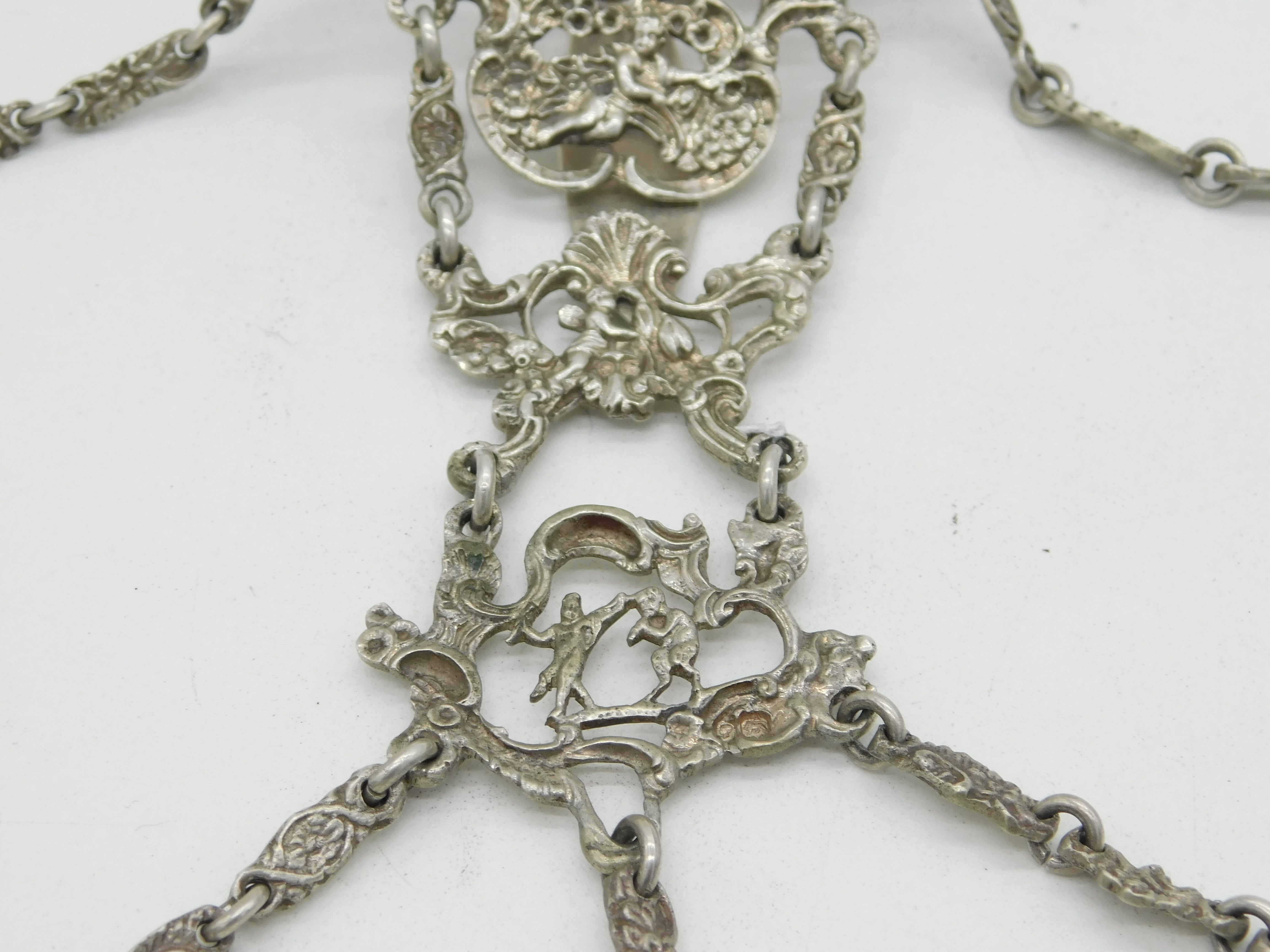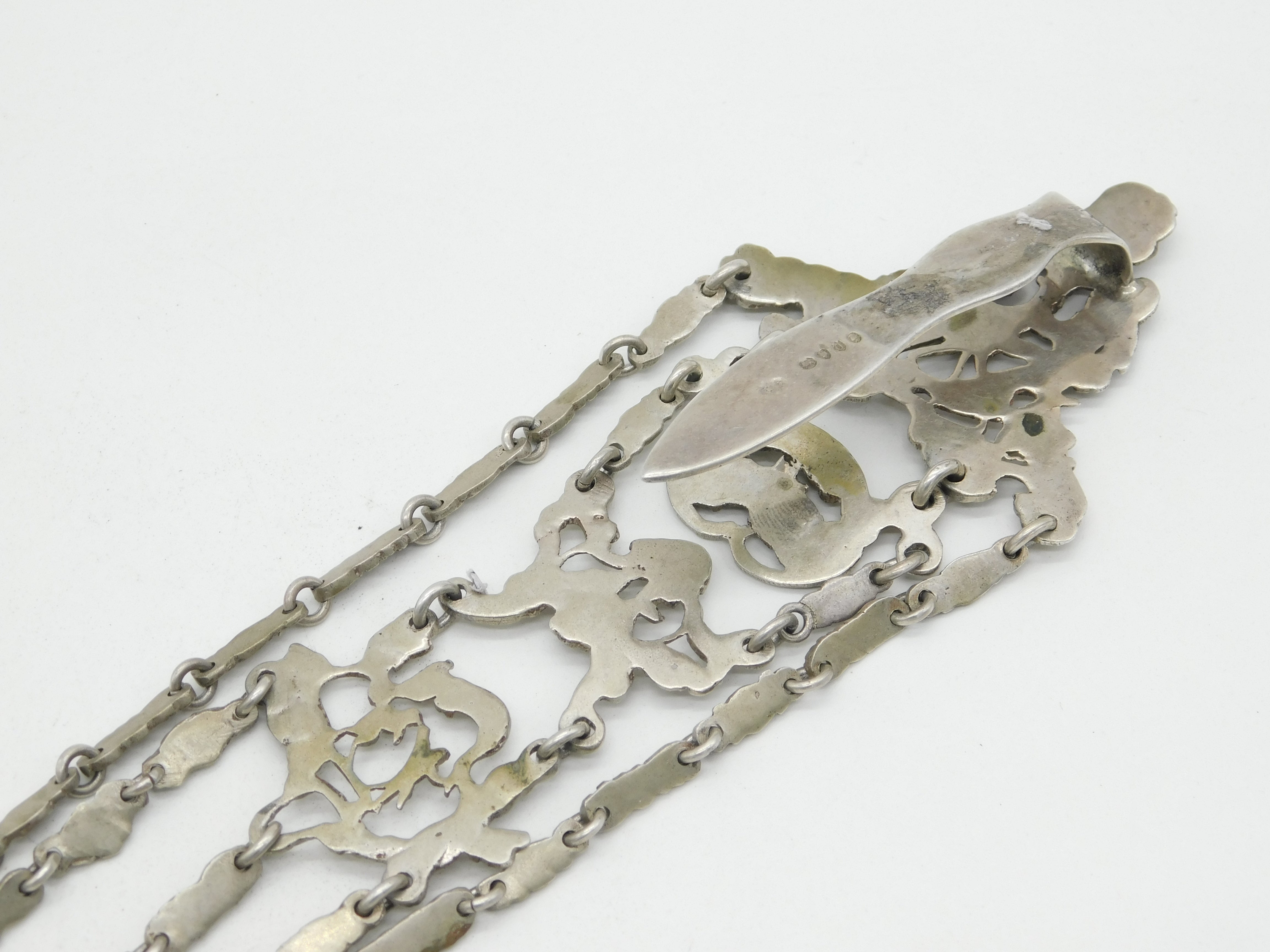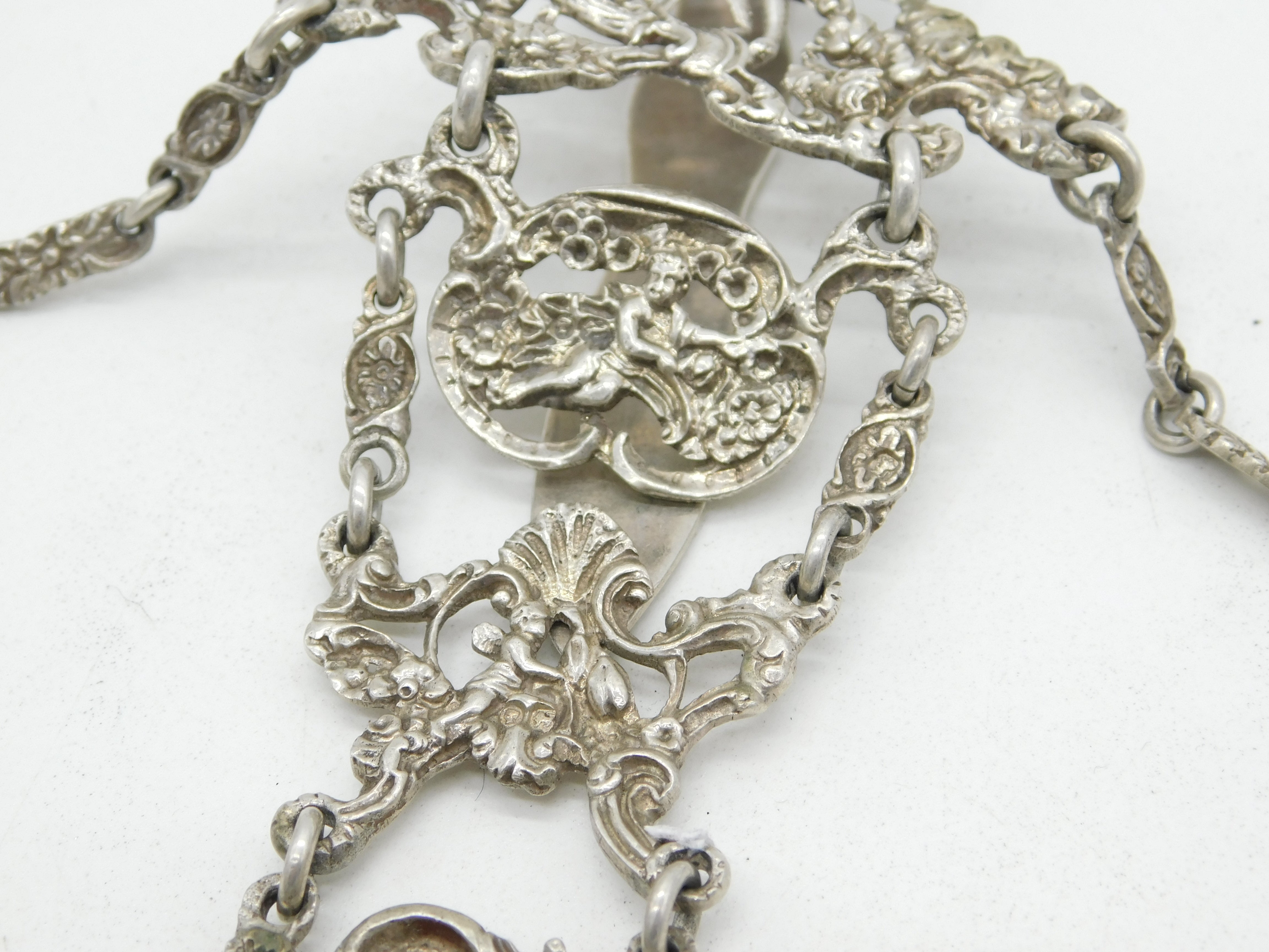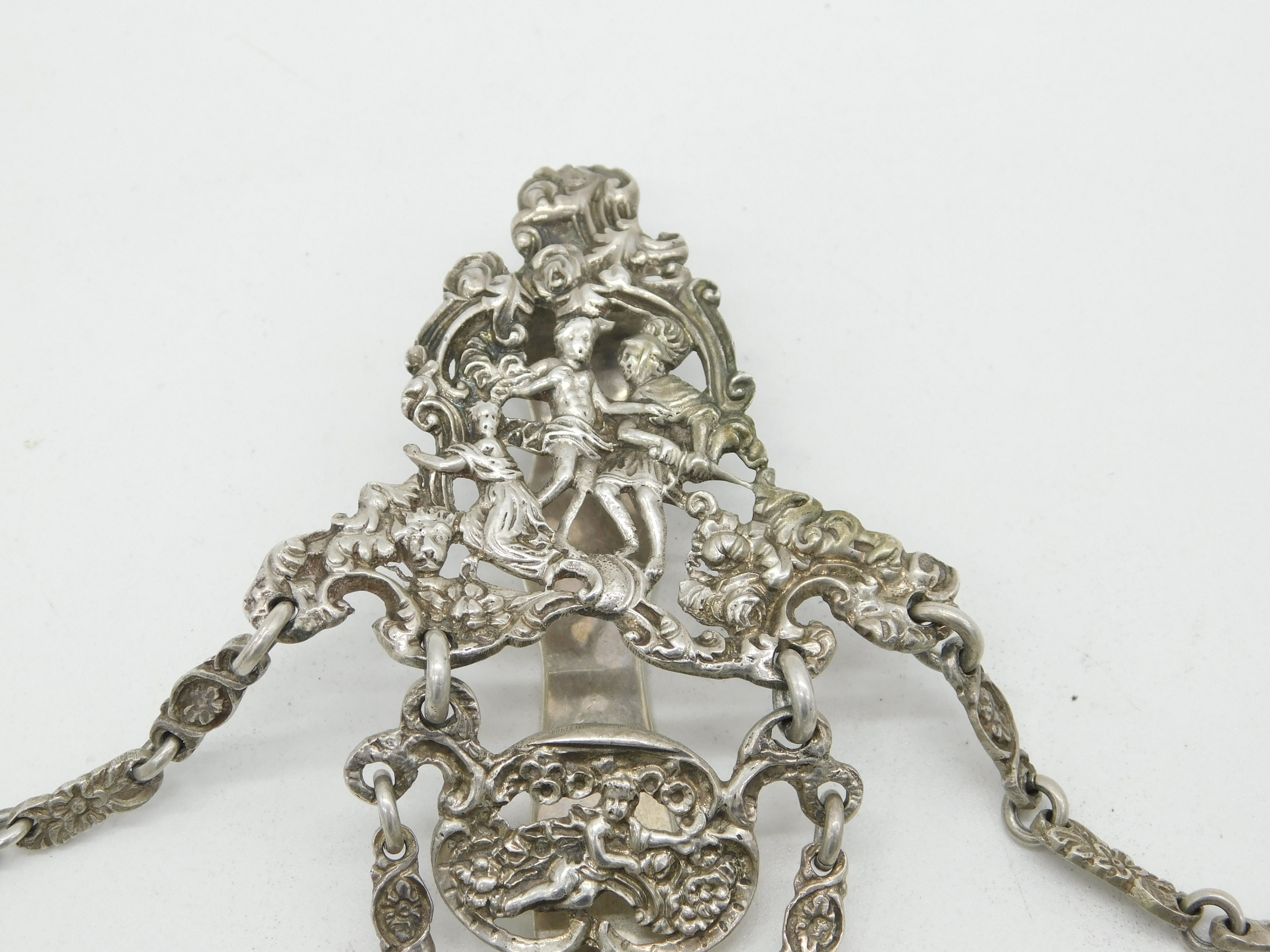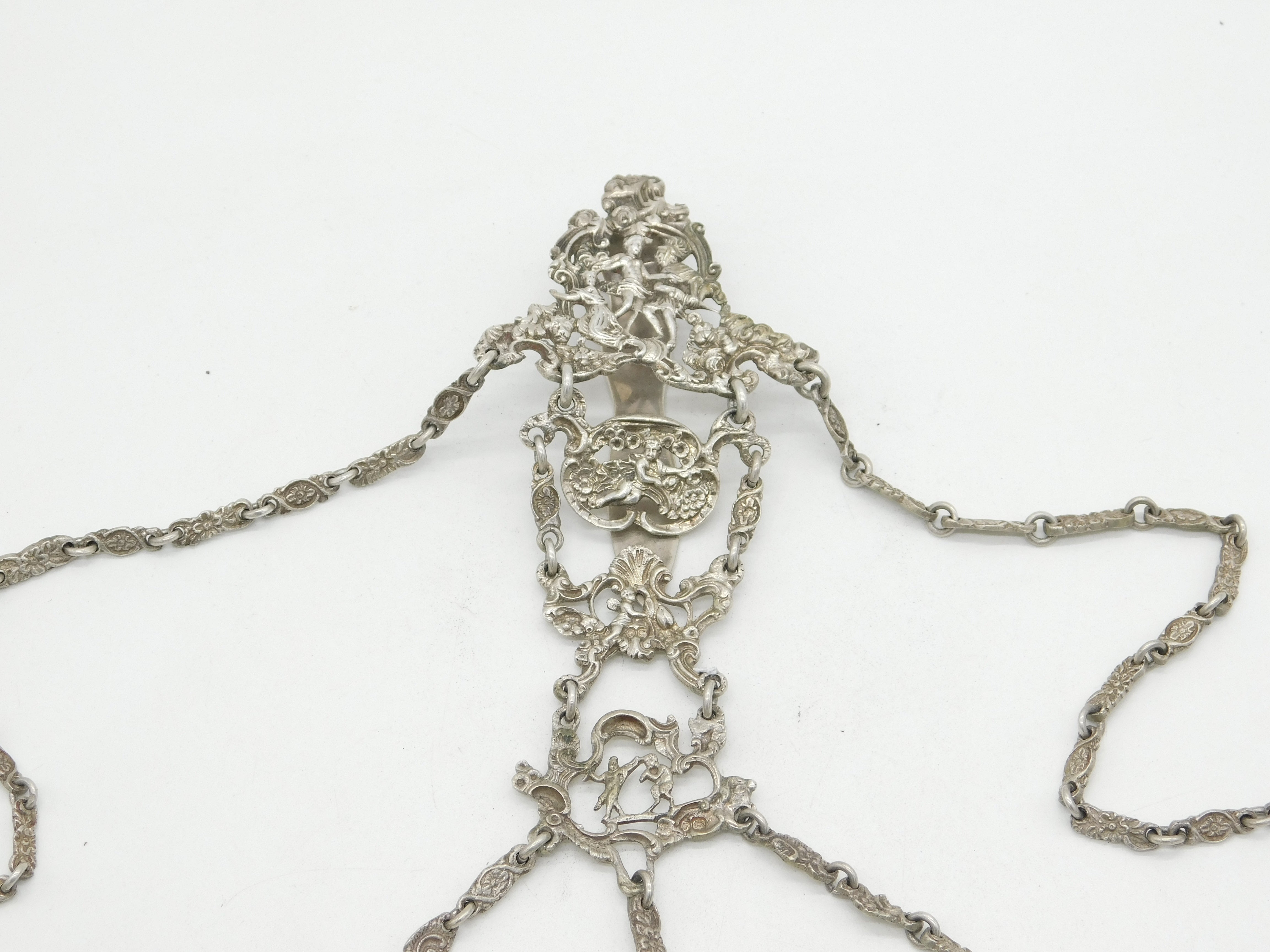 Details: A fantastic and wonderfully designed antique Victorian sterling silver chatelaine with superb decorative art nouveau patterns throughout depicting cherubs, flowers, birds and more. Hallmarked in multiple places London 1889 by William Comyns, wonderful ornate belle epoque style dog clips, all in lovely order. This is a wonderful item that would make a perfect gift or addition to any collection.