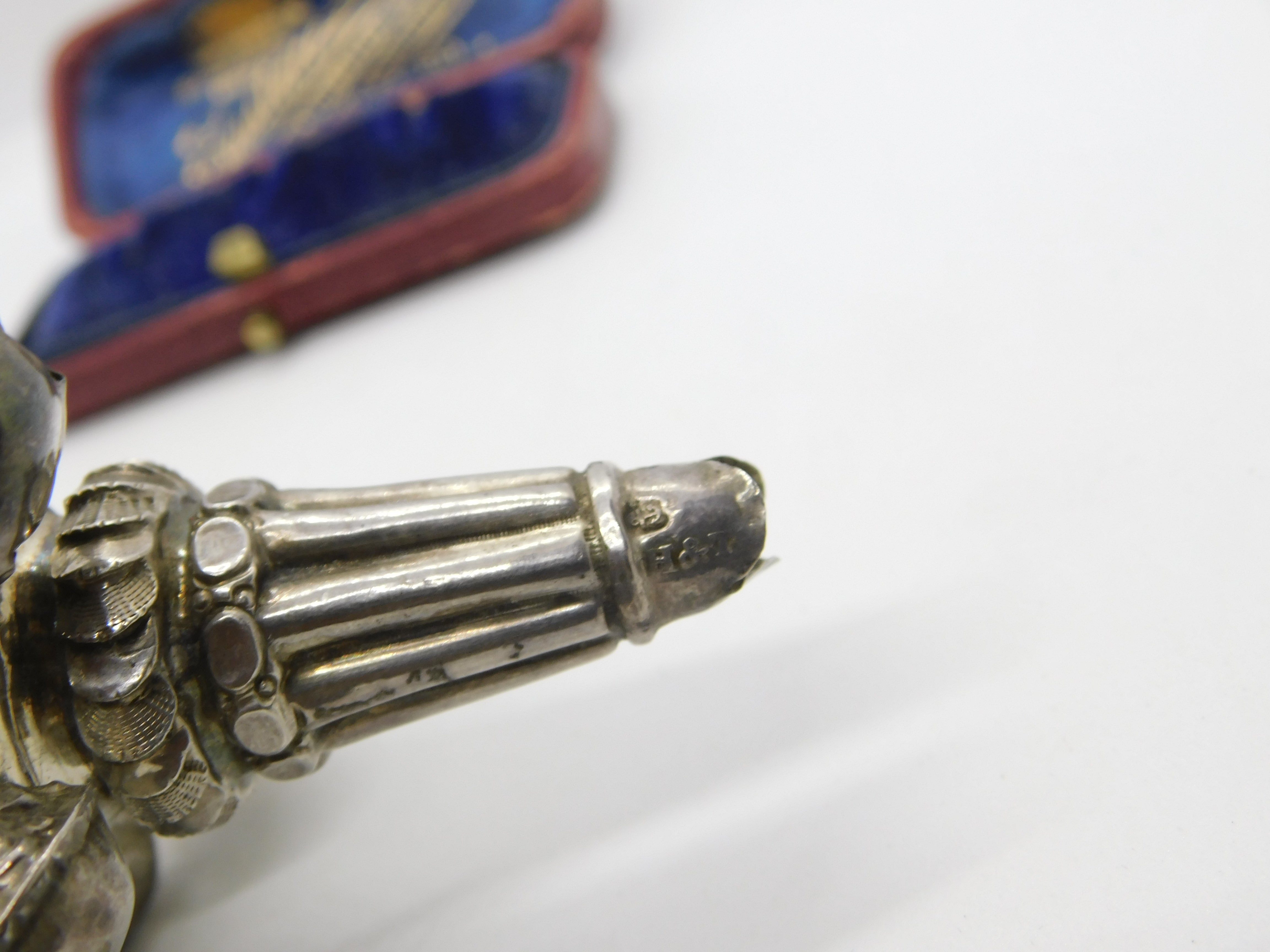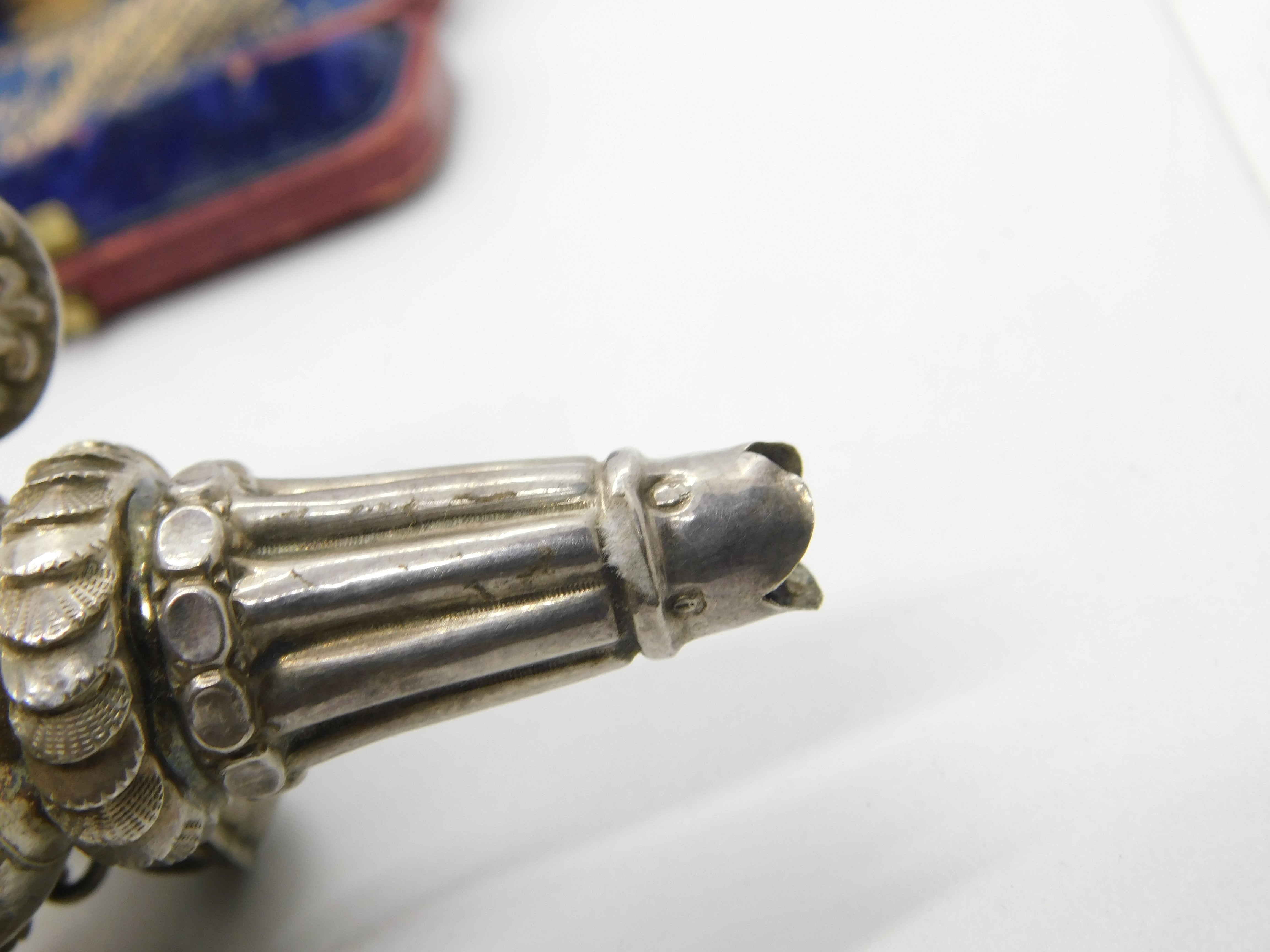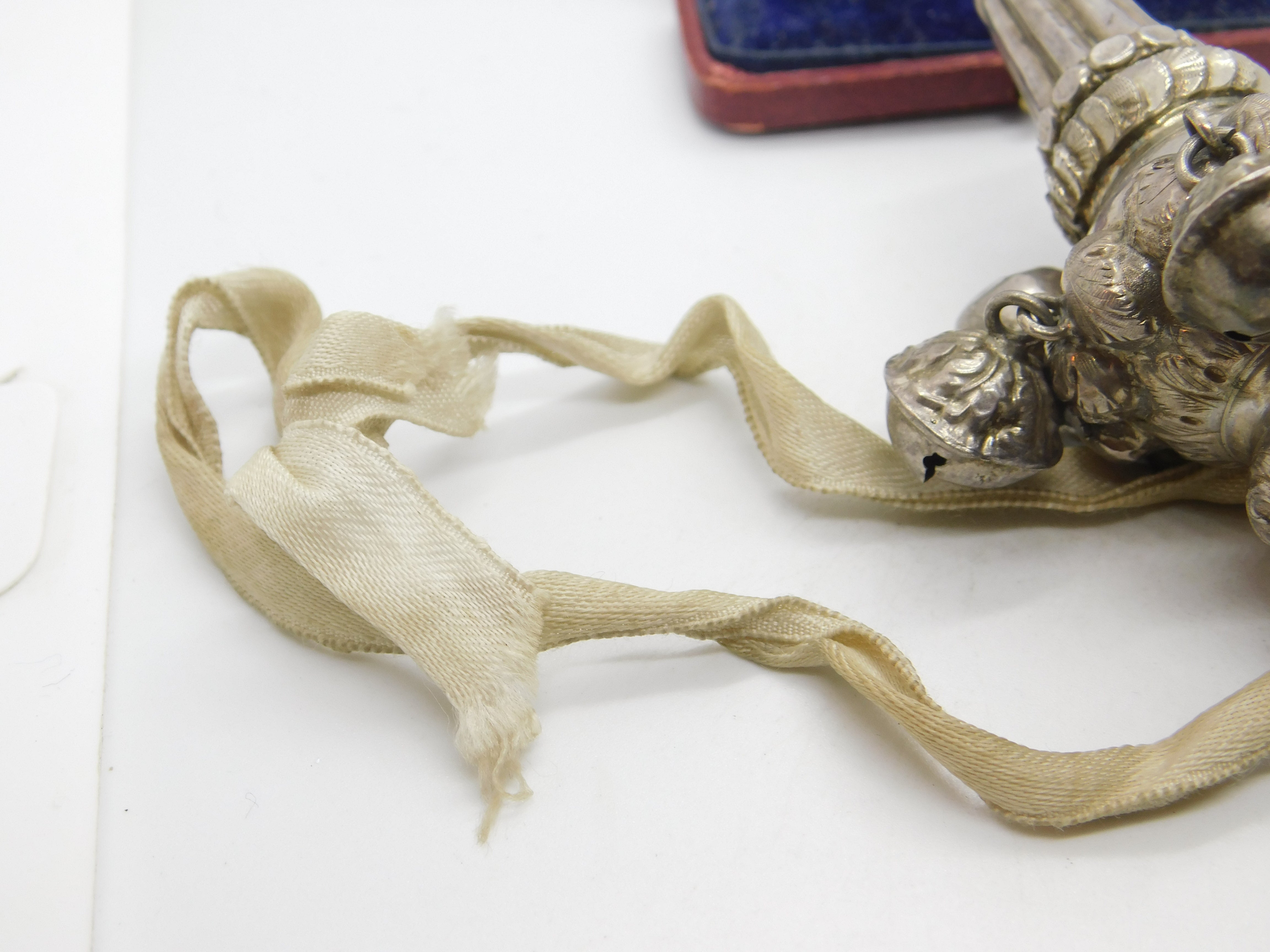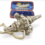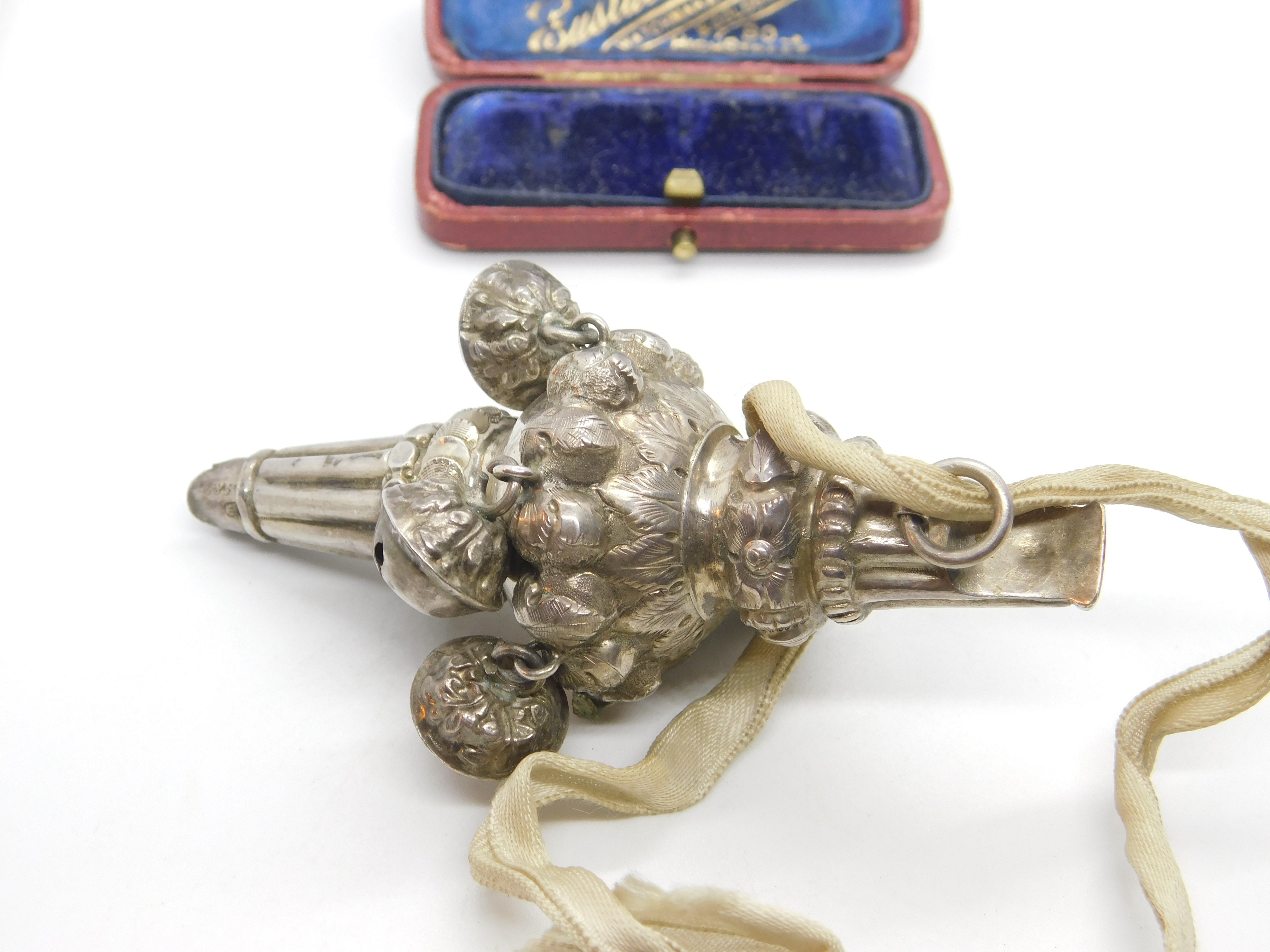 Details: A fantastic and wonderfully designed antique Victorian sterling silver baby rattle, whistle & teether with lovely detailing hallmarked Birmingham, 1865 by Hilliard & Thomason. This is a wonderful item that would make a perfect gift or addition to any collection. The BOX pictured is for PRESENTATION ONLY and is NOT included in the listings but used to frame the pictures unless specifically stated otherwise.